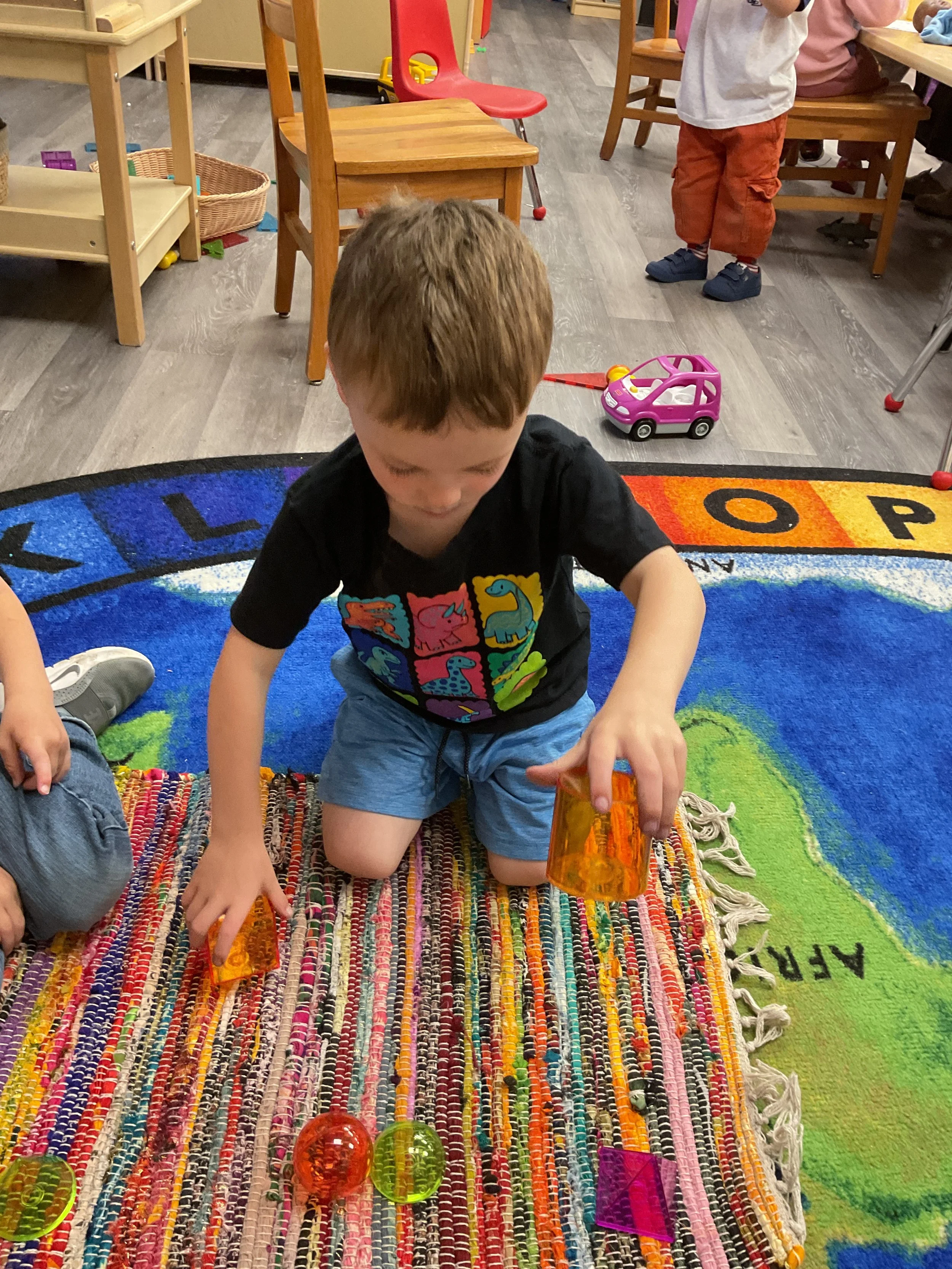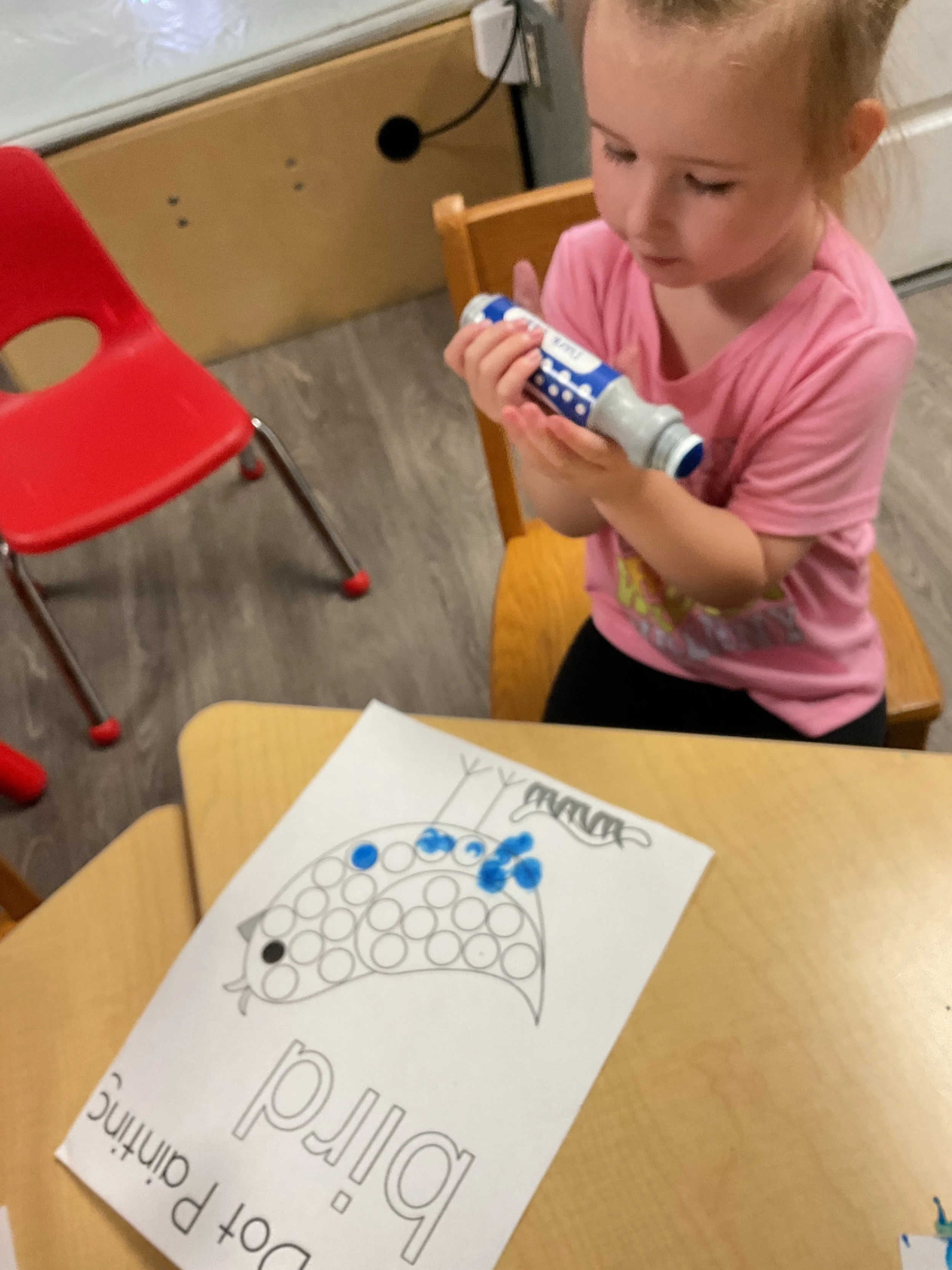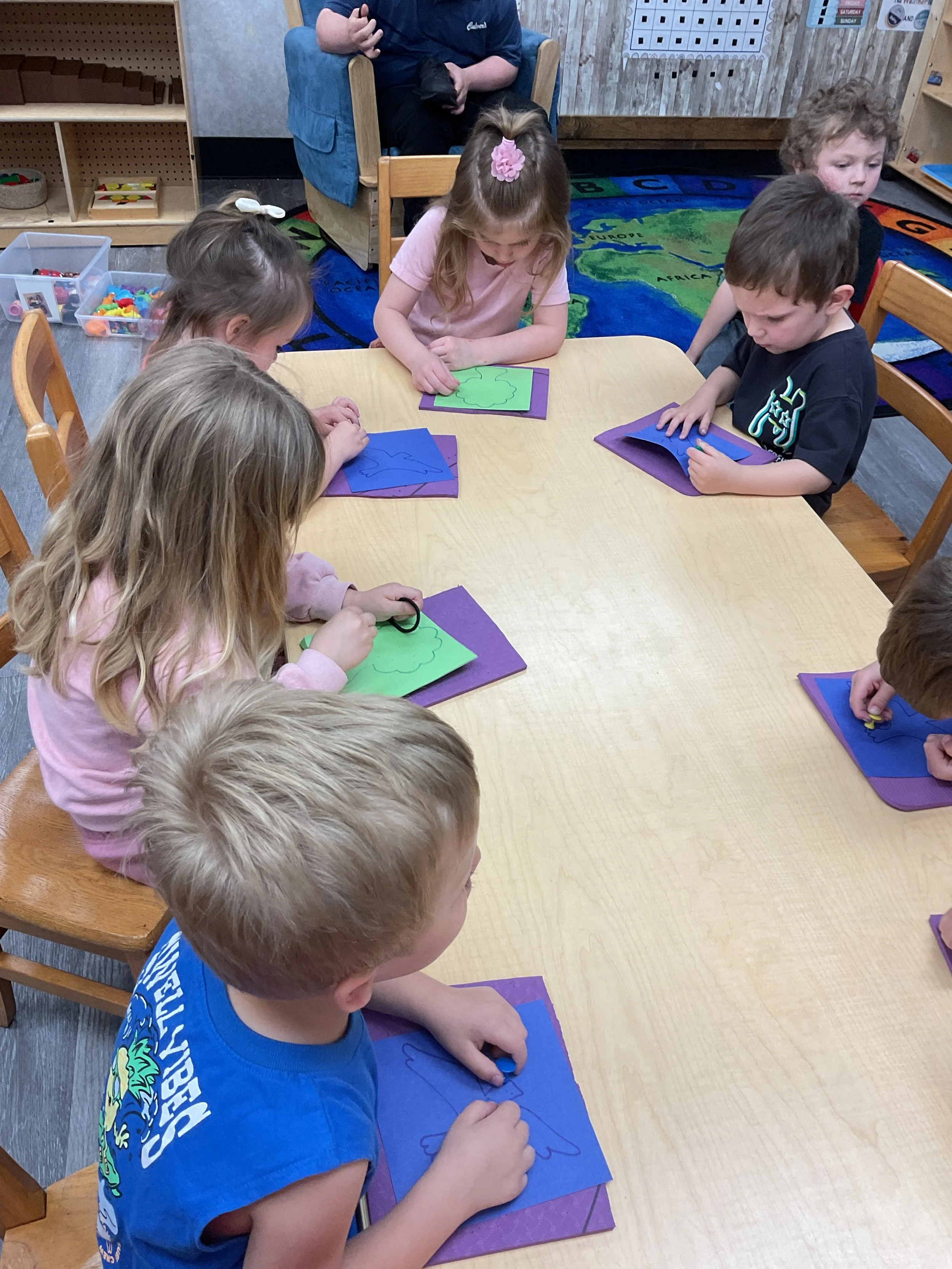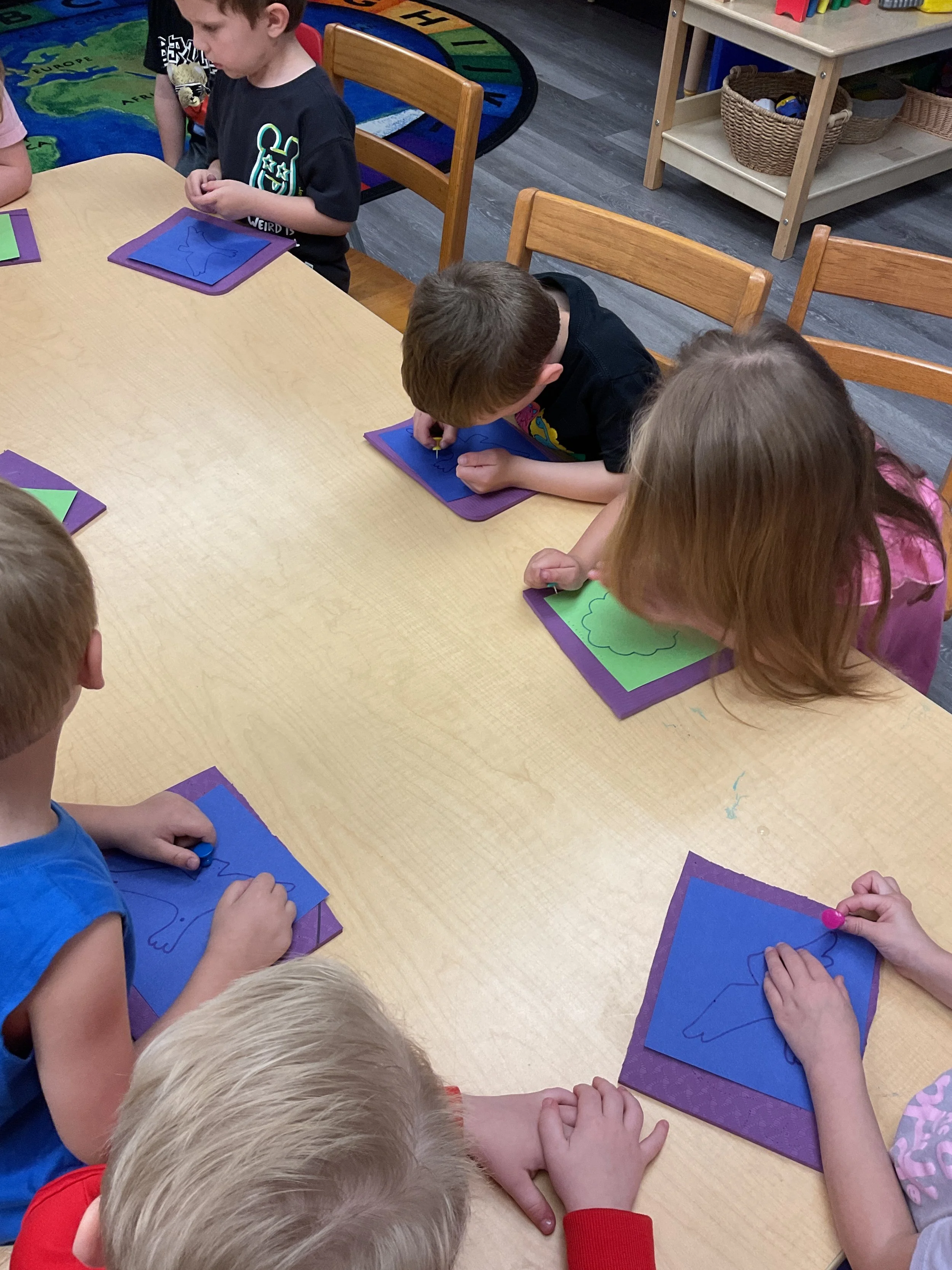 This morning, we read the book Three Hens and a Peacock written by Lester L. Laminack and illustrated by Henry Cole. During our music and movement time, we practiced some yoga poses. Then, during our math and cognition lesson, we worked on naming three dimensional shapes. Next, for our science and sensory lesson, we filled our sensory bin with leaves. Finally, for our literacy and fine motor lesson, we worked on a pin pushing exercise..