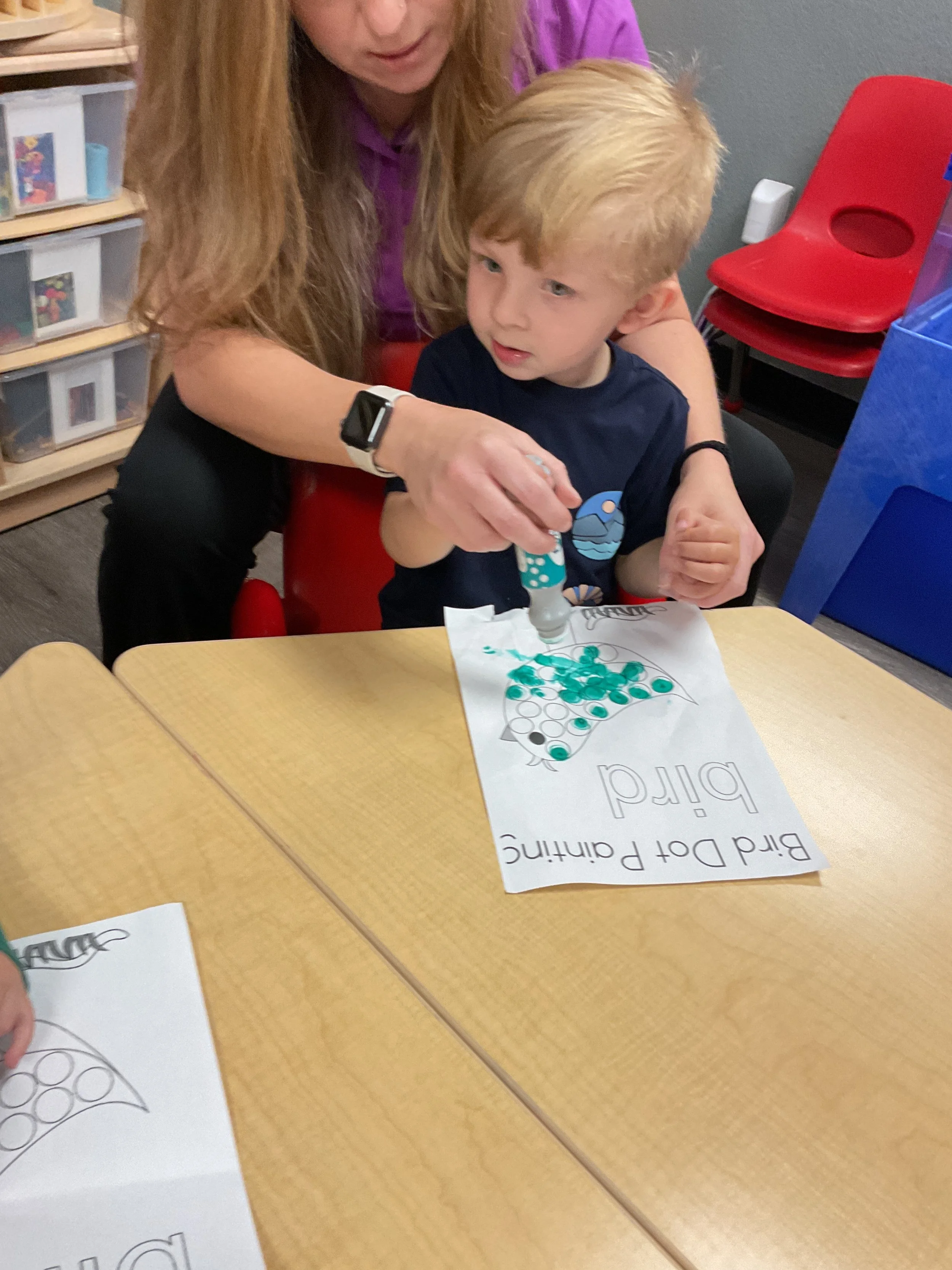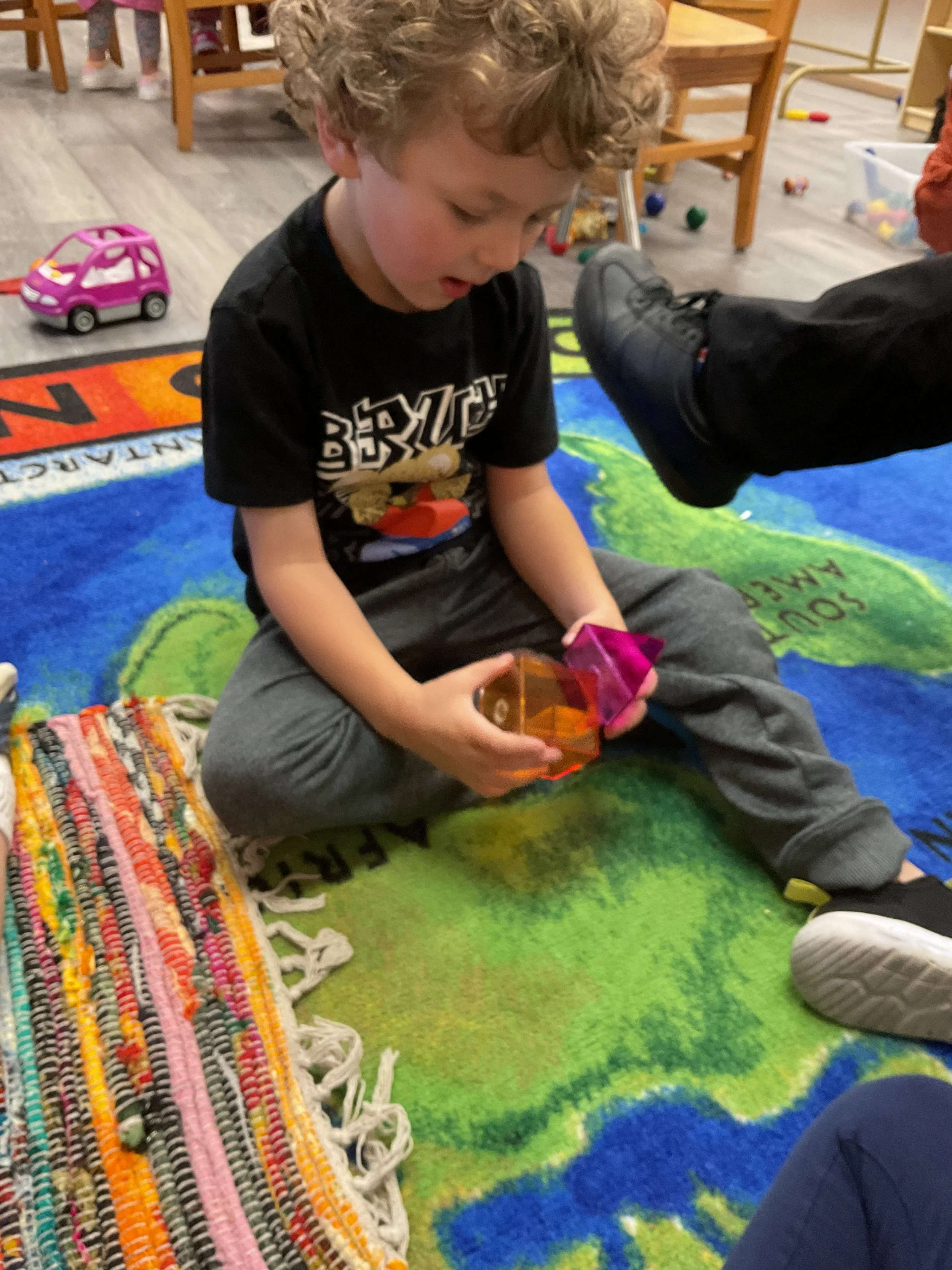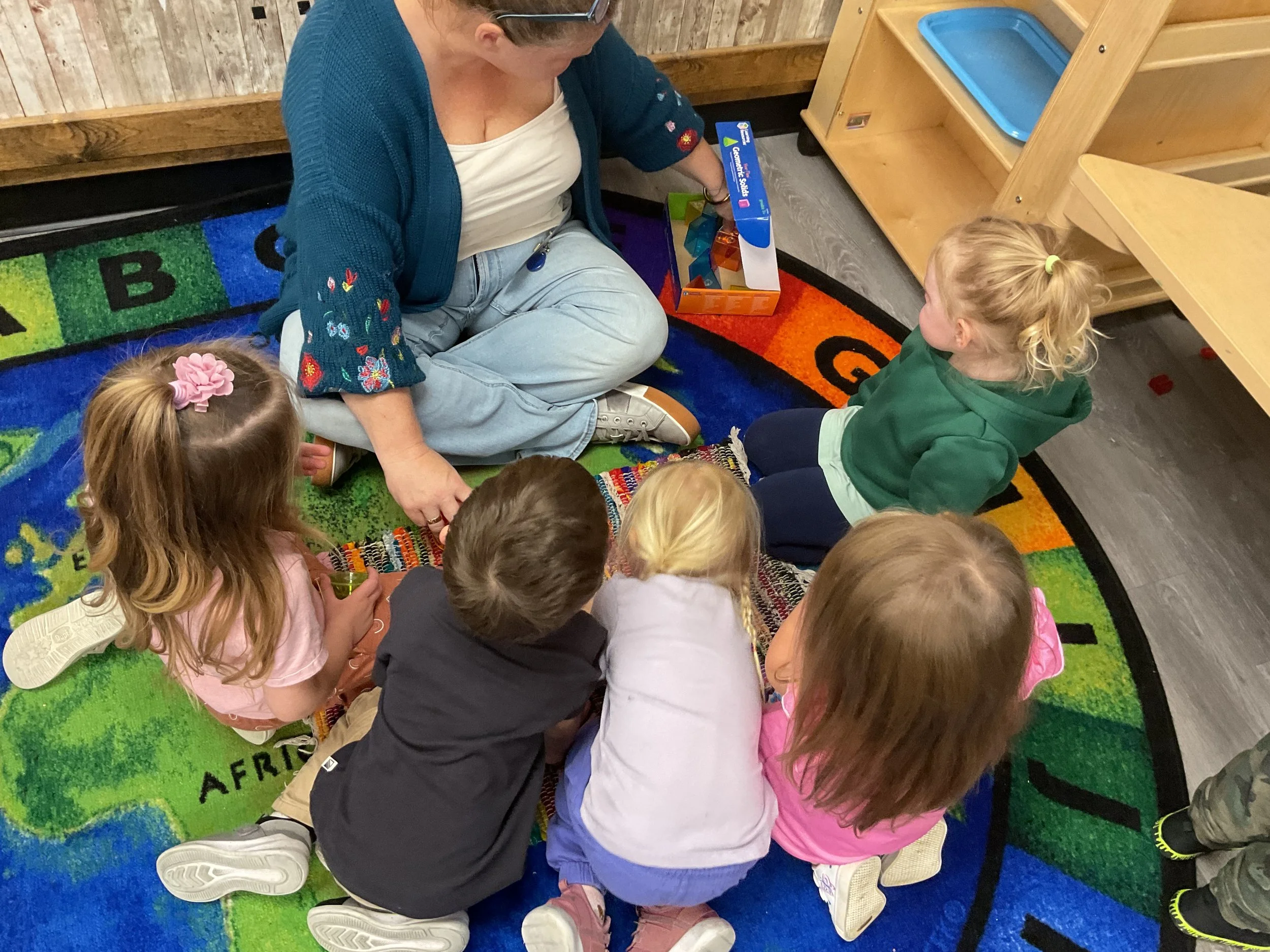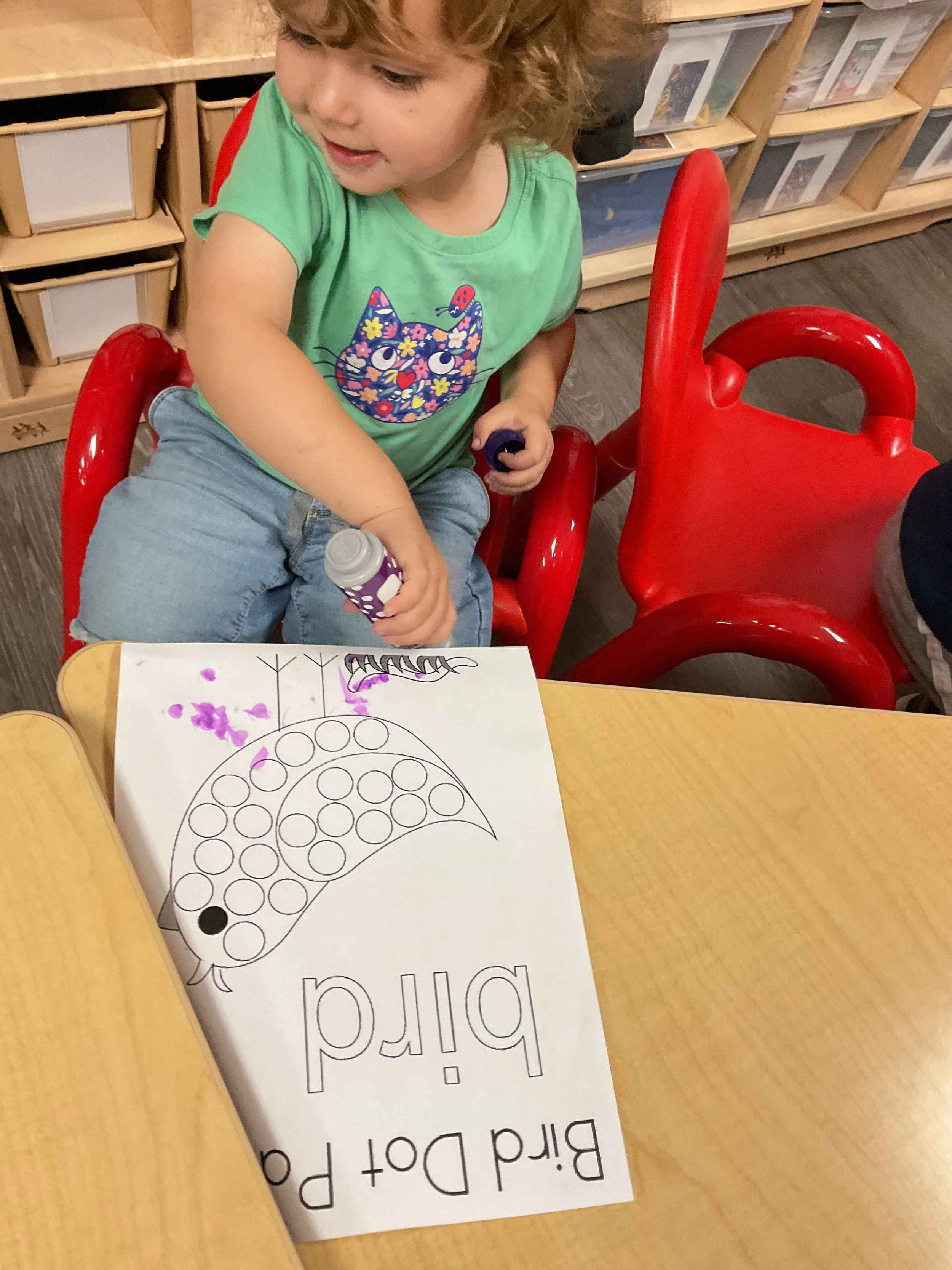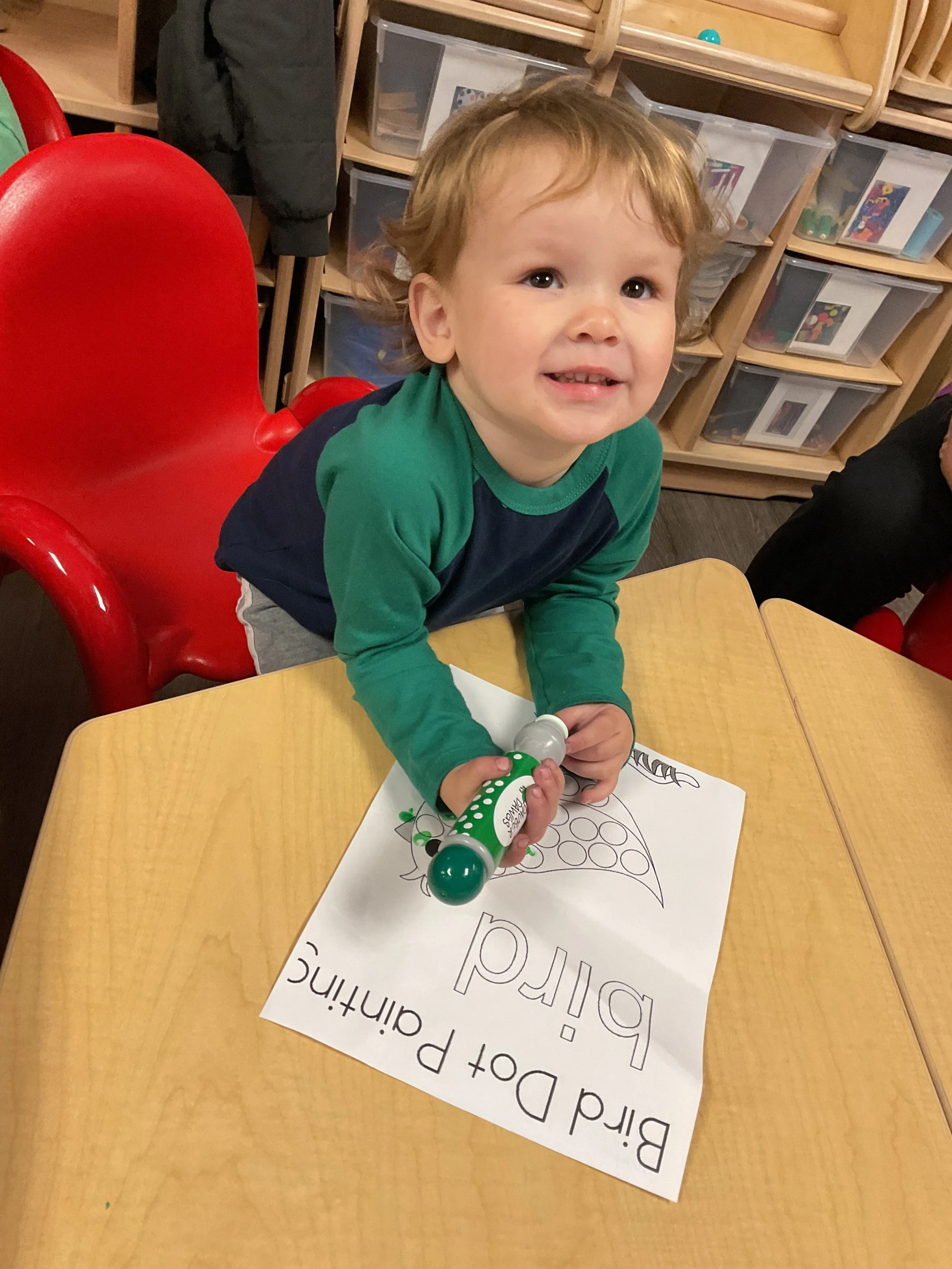This morning, we read the book Three Hens and a Peacock written by Lester L. Laminack and illustrated by Henry Cole. During our music and movement time, we practiced some yoga poses. Then, during our math and cognition lesson, we worked on naming three dimensional shapes. Next, for our science and sensory lesson, we filled our sensory bin with leaves. Finally, for our literacy and fine motor lesson, we worked on a pin pushing exercise..