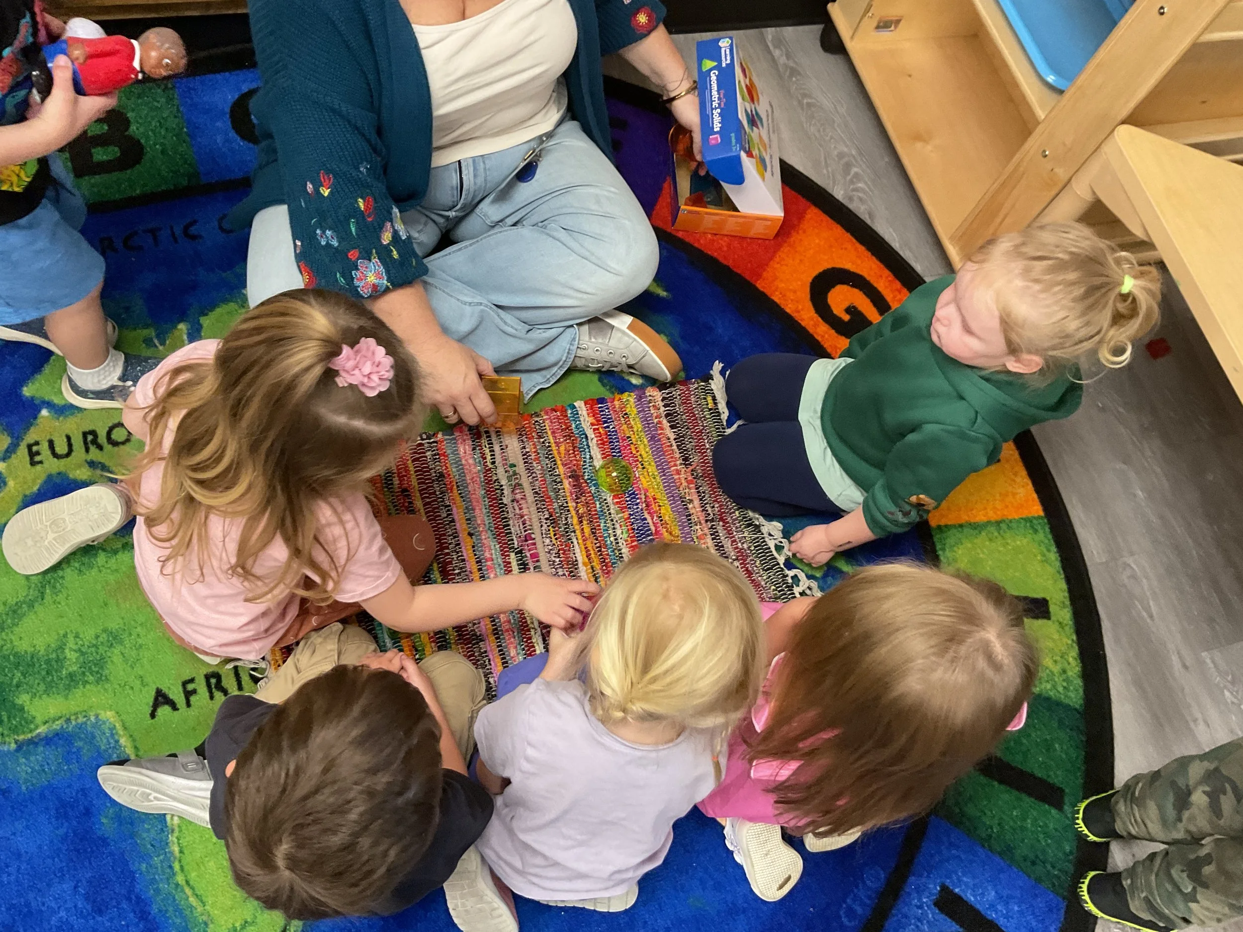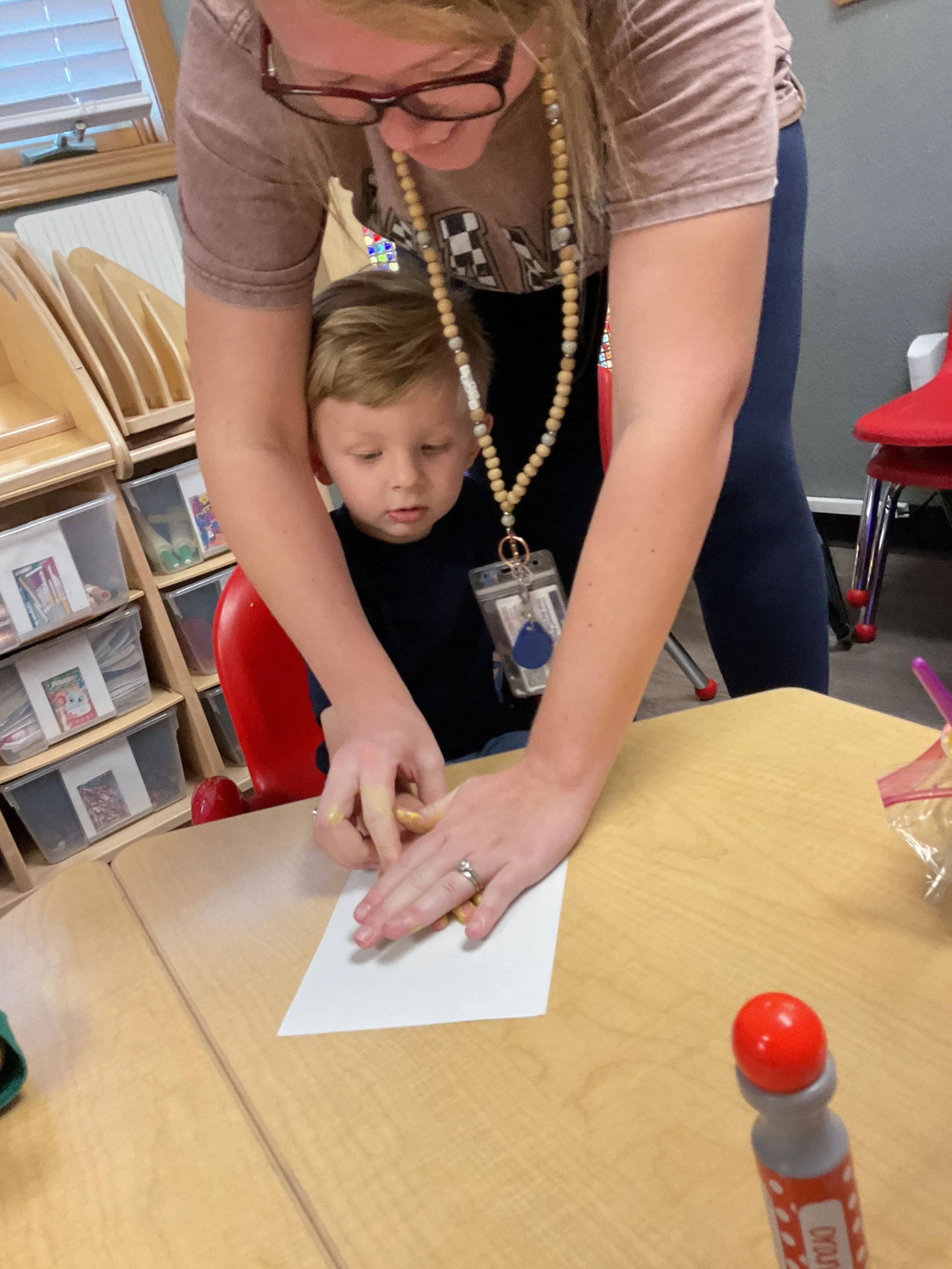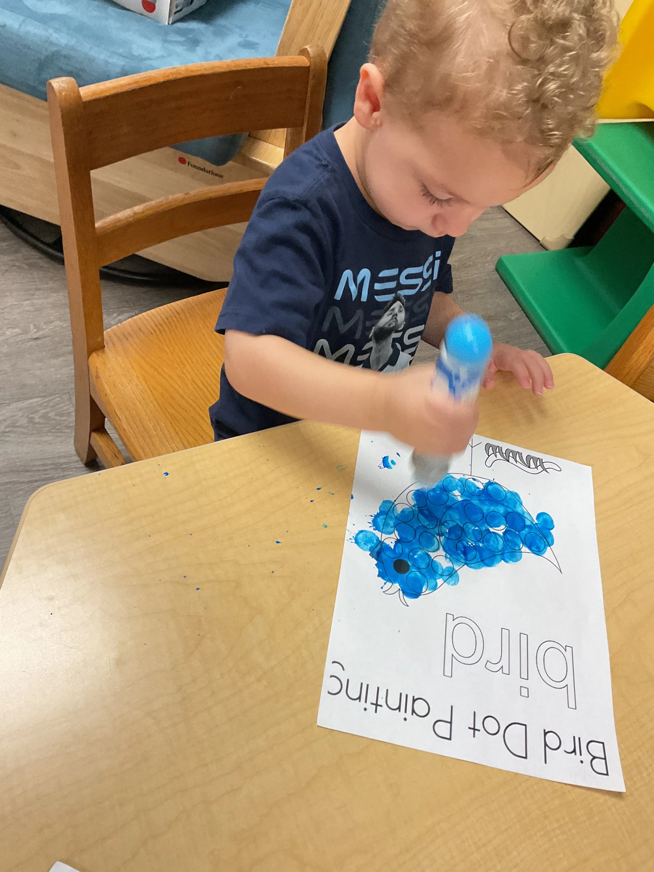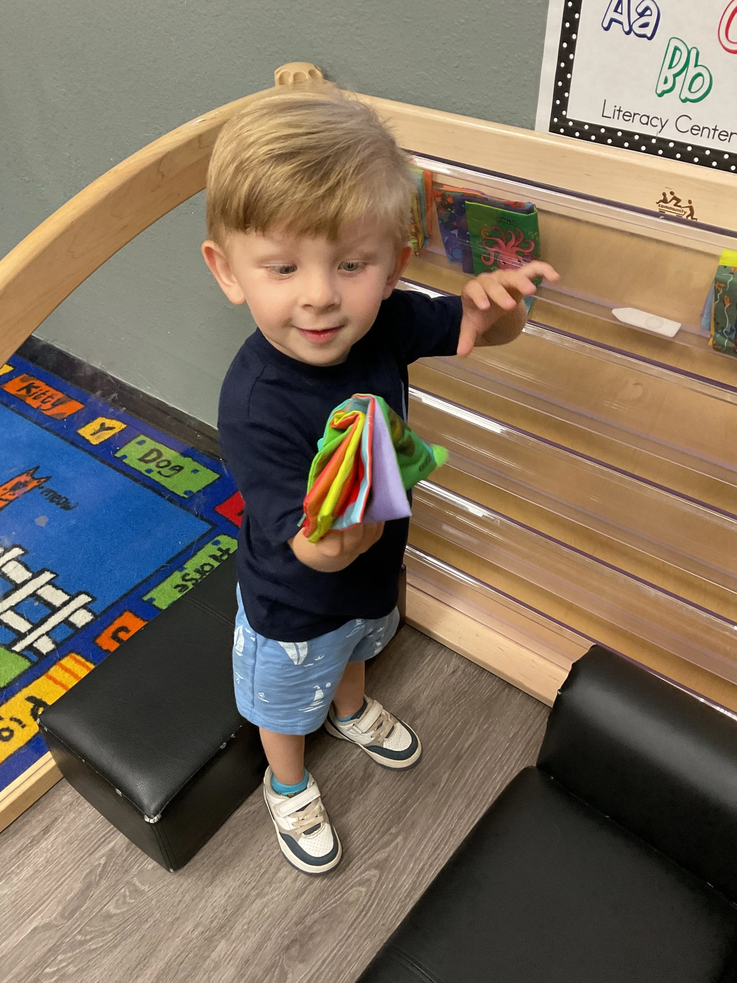 This morning, we read the book Three Hens and a Peacock written by Lester L. Laminack and illustrated by Henry Cole. During our music and movement time, we practiced some yoga poses. Then, during our math and cognition lesson, we worked on naming three dimensional shapes. Next, for our science and sensory lesson, we filled our sensory bin with leaves. Finally, for our literacy and fine motor lesson, we worked on a pin pushing exercise..