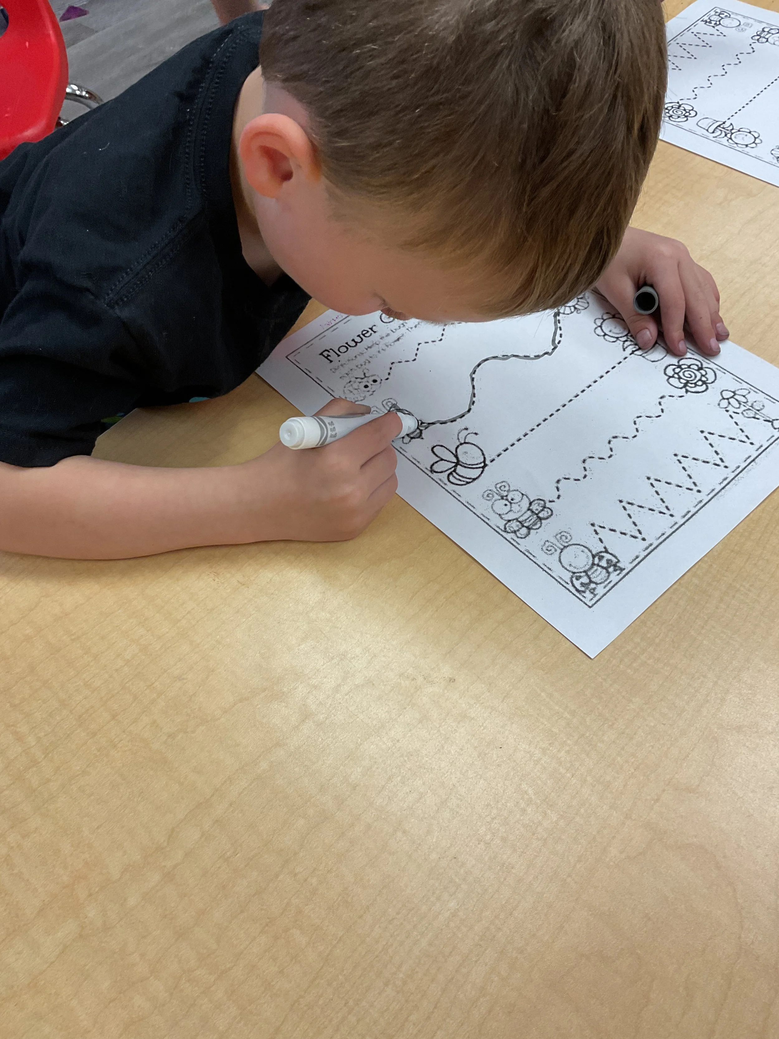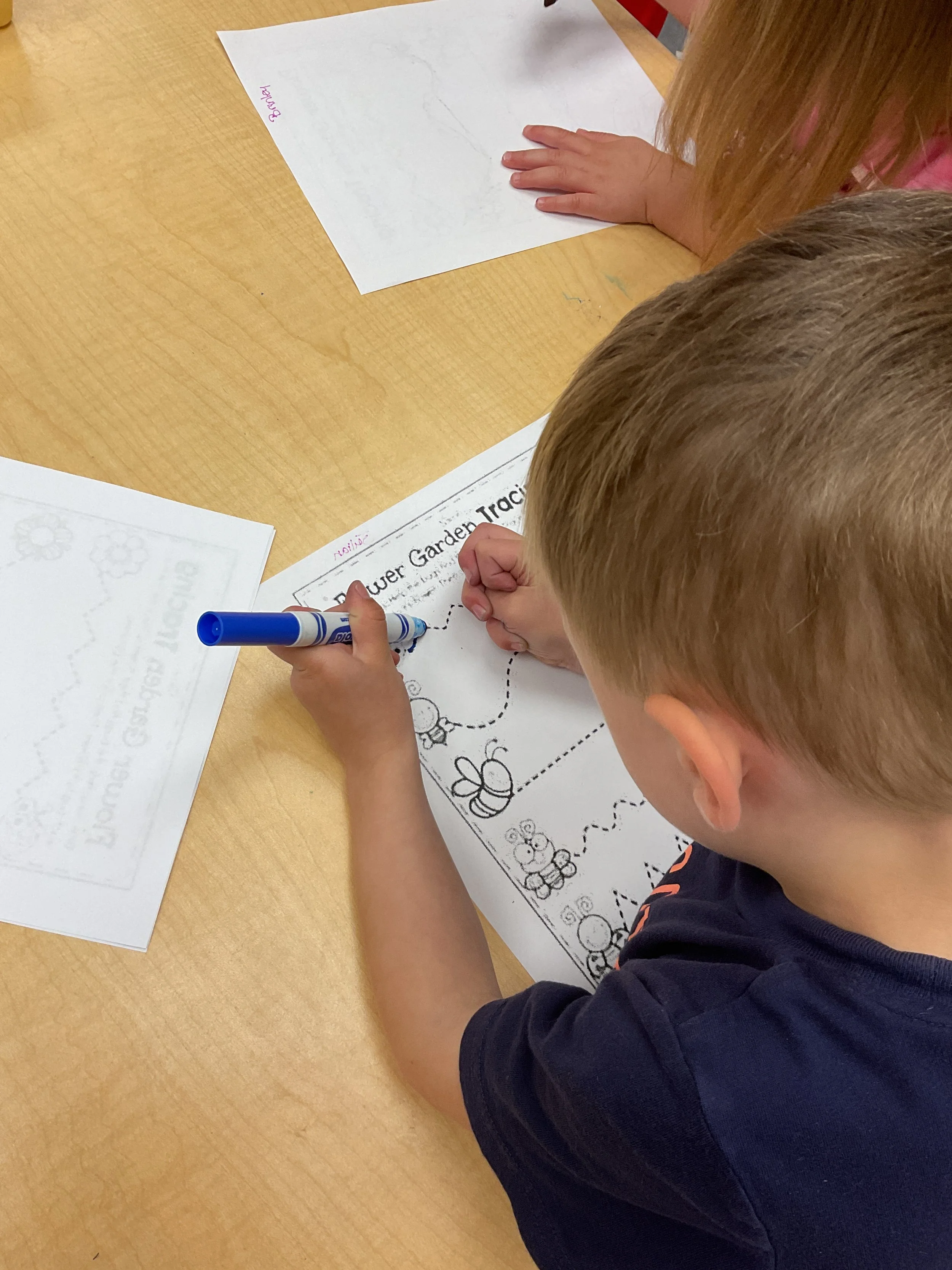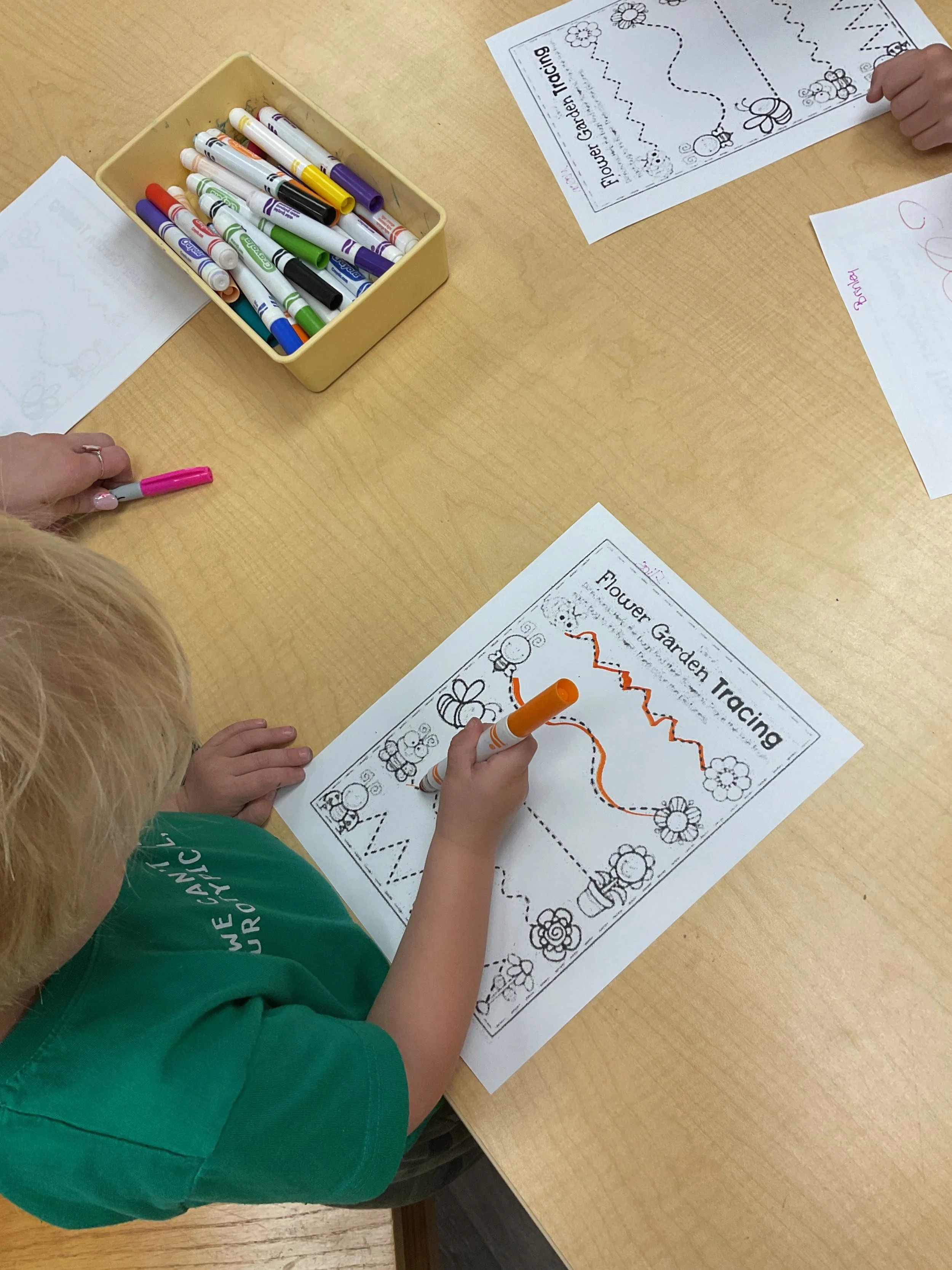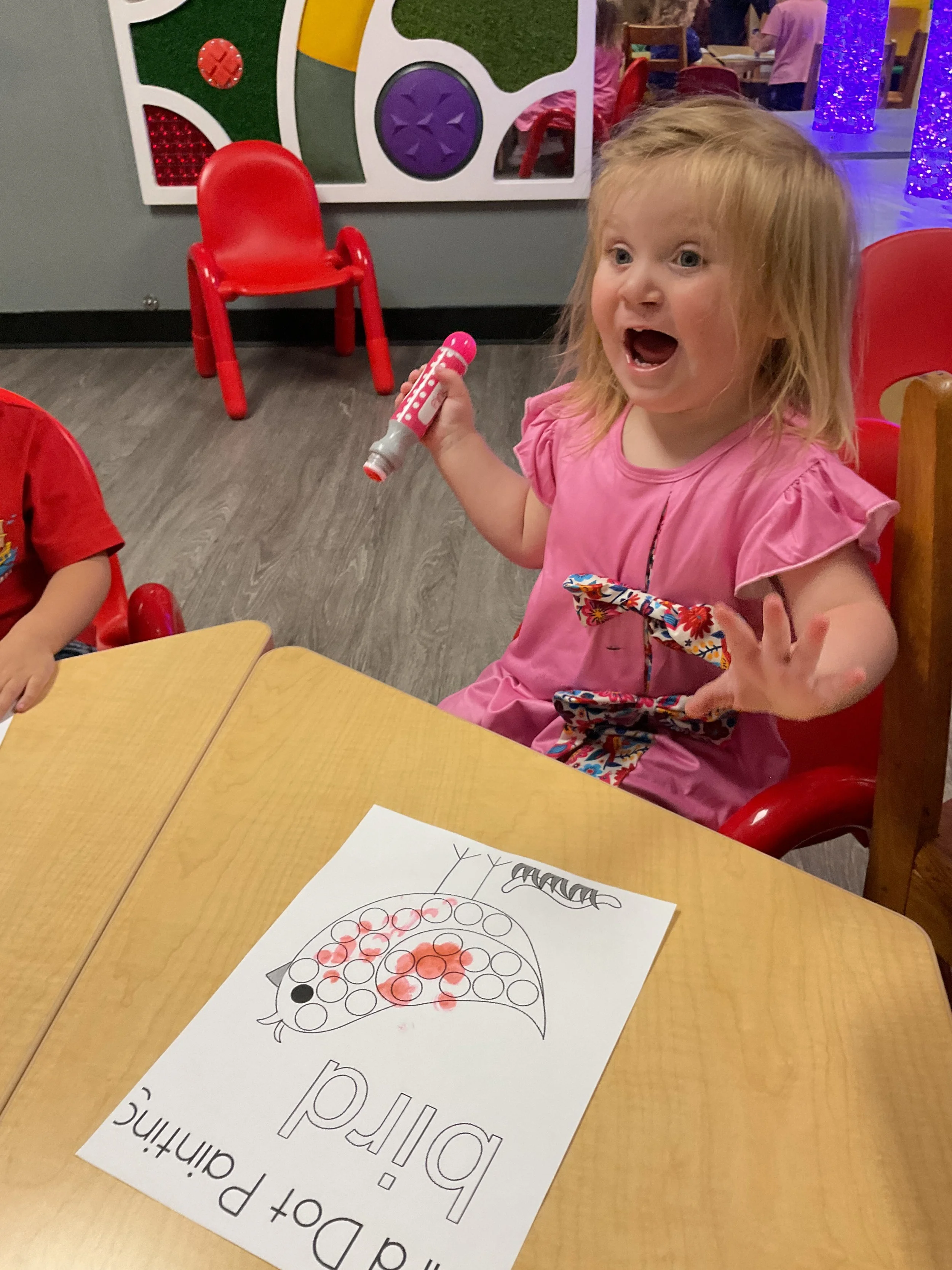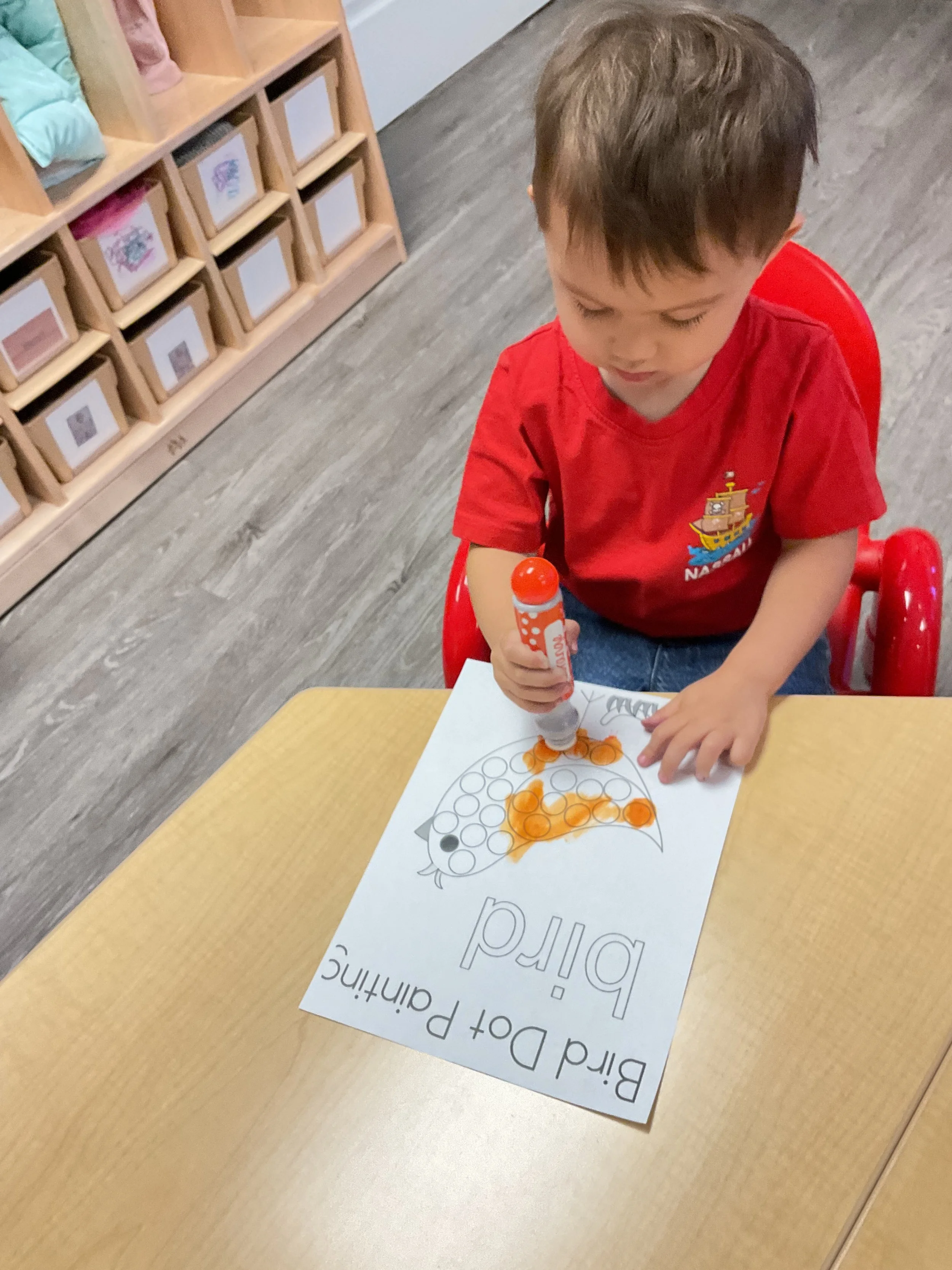 This morning, we read the book Three Hens and a Peacock written by Lester L. Laminack and illustrated by Henry Cole. During our music and movement time, we practiced some yoga poses. Then, during our math and cognition lesson, we worked on naming three dimensional shapes. Next, for our science and sensory lesson, we filled our sensory bin with leaves. Finally, for our literacy and fine motor lesson, we worked on a pin pushing exercise..