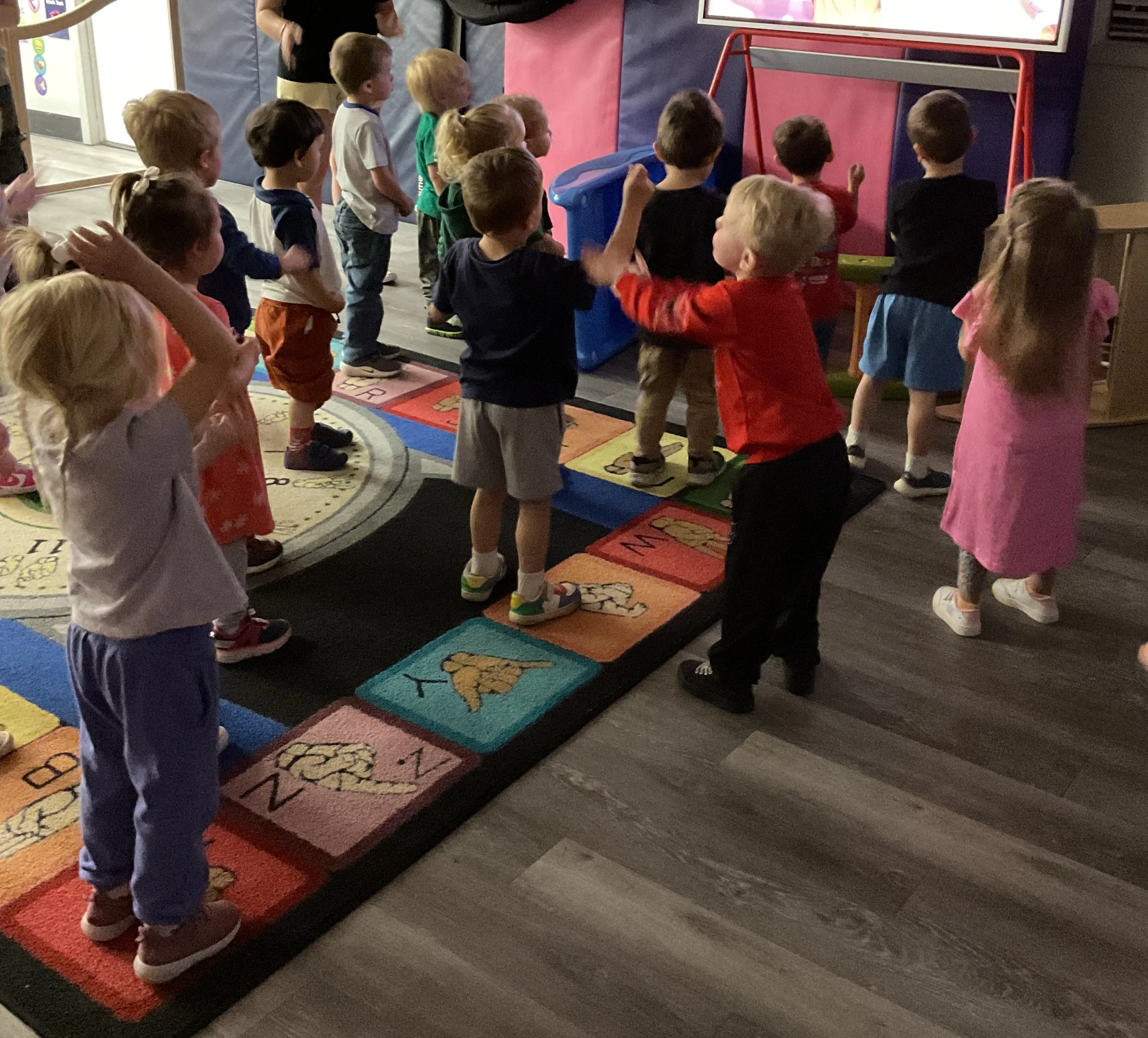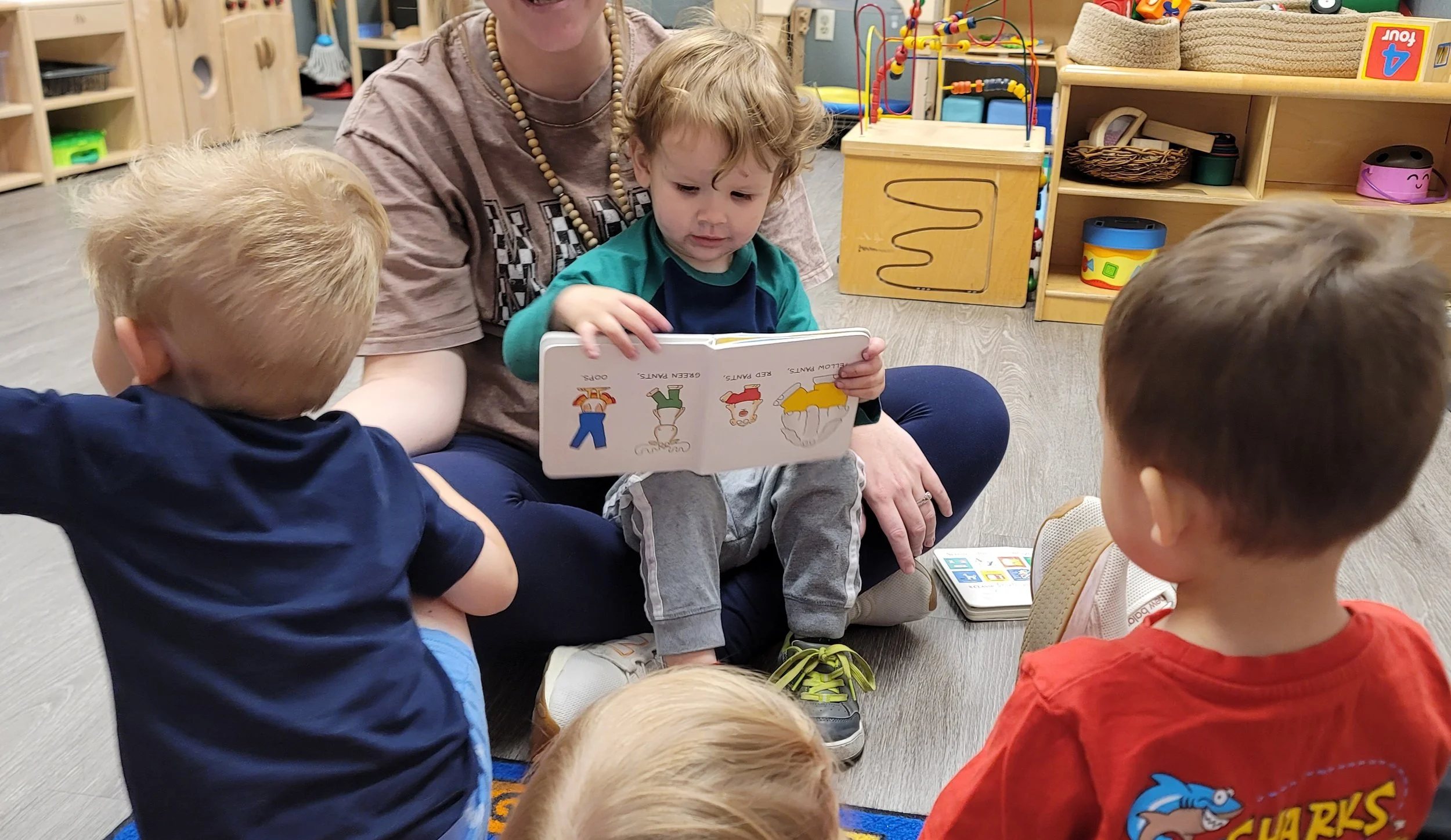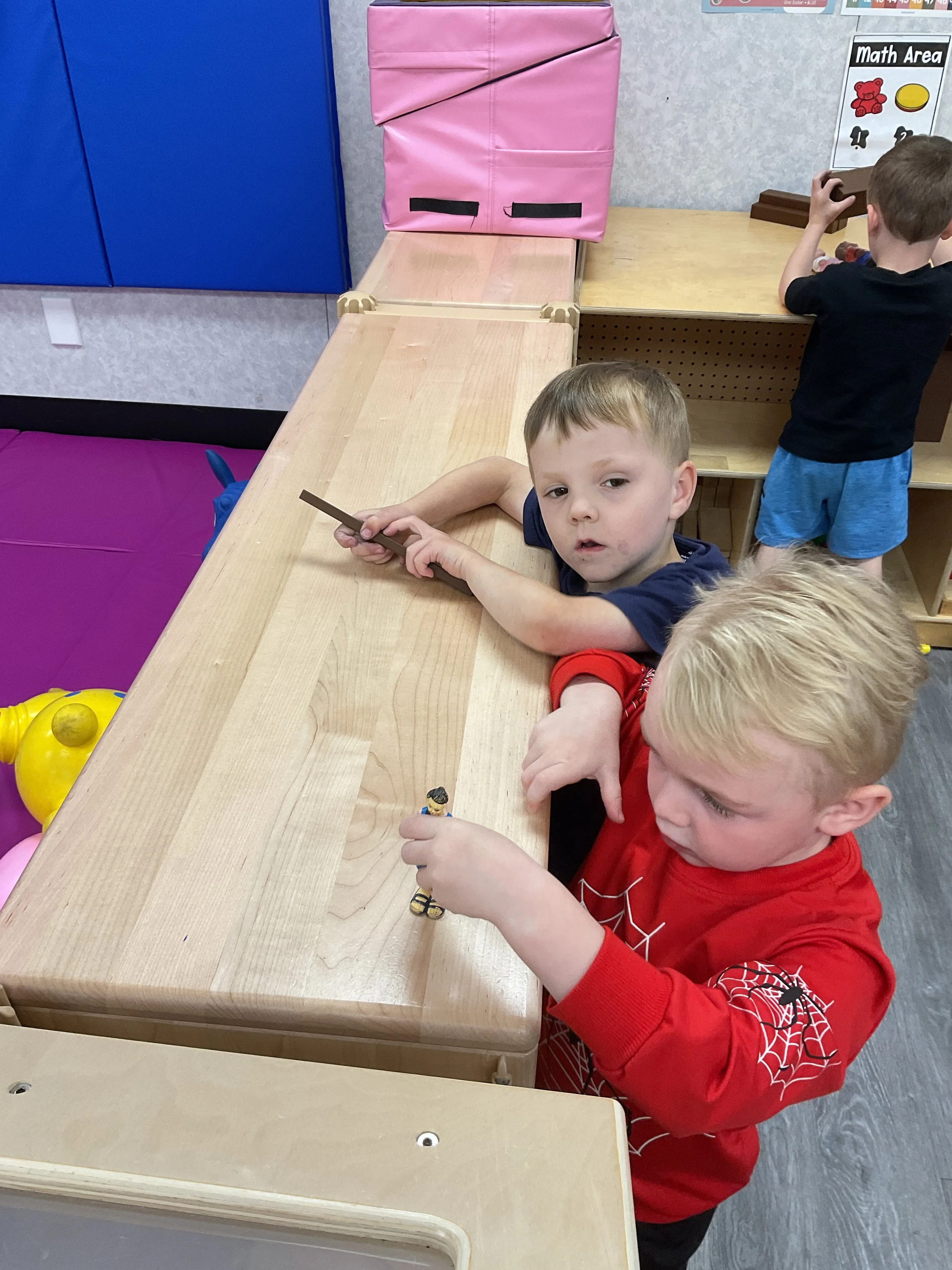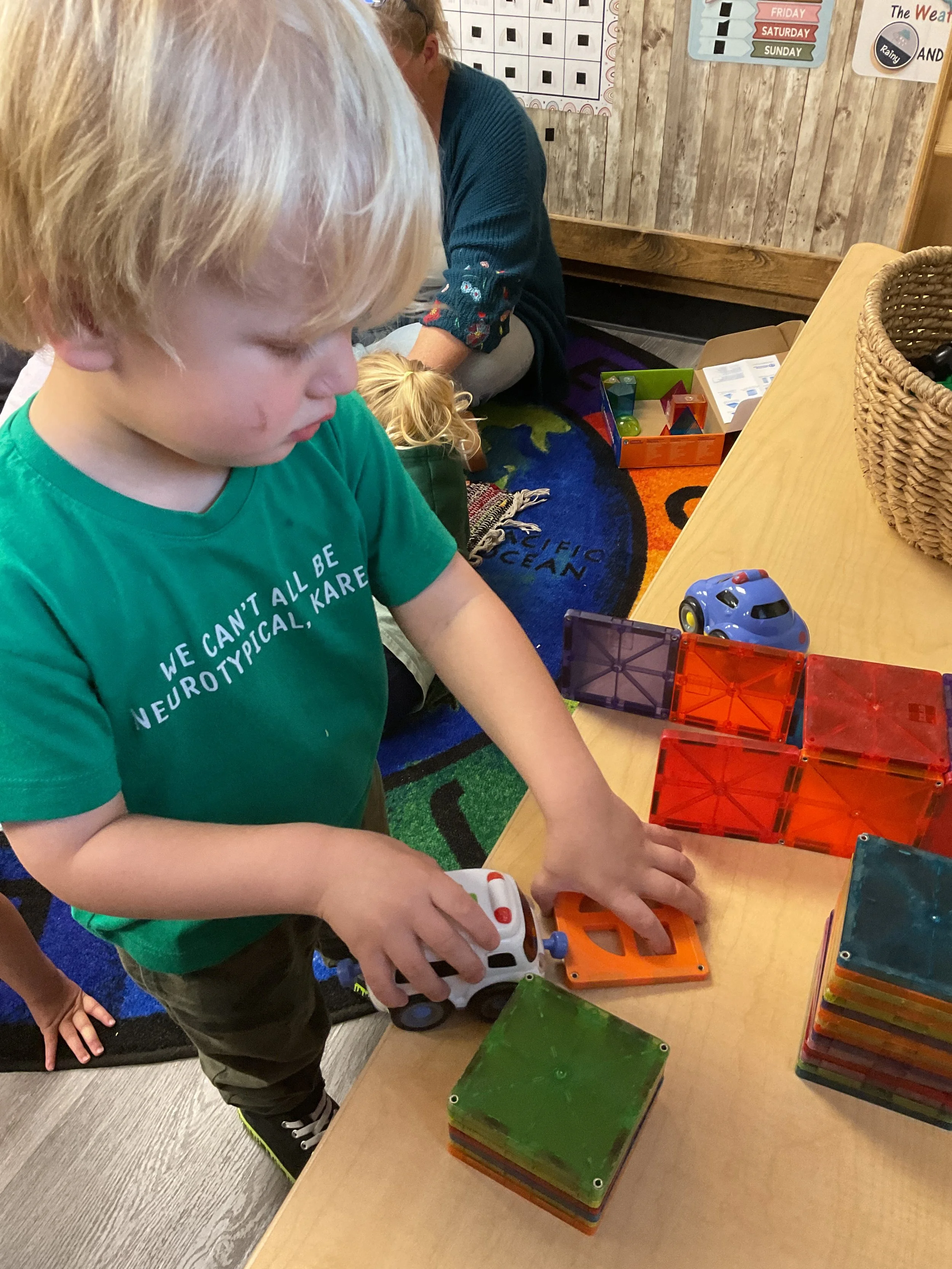 This morning, we read the book Three Hens and a Peacock written by Lester L. Laminack and illustrated by Henry Cole. During our music and movement time, we practiced some yoga poses. Then, during our math and cognition lesson, we worked on naming three dimensional shapes. Next, for our science and sensory lesson, we filled our sensory bin with leaves. Finally, for our literacy and fine motor lesson, we worked on a pin pushing exercise..
