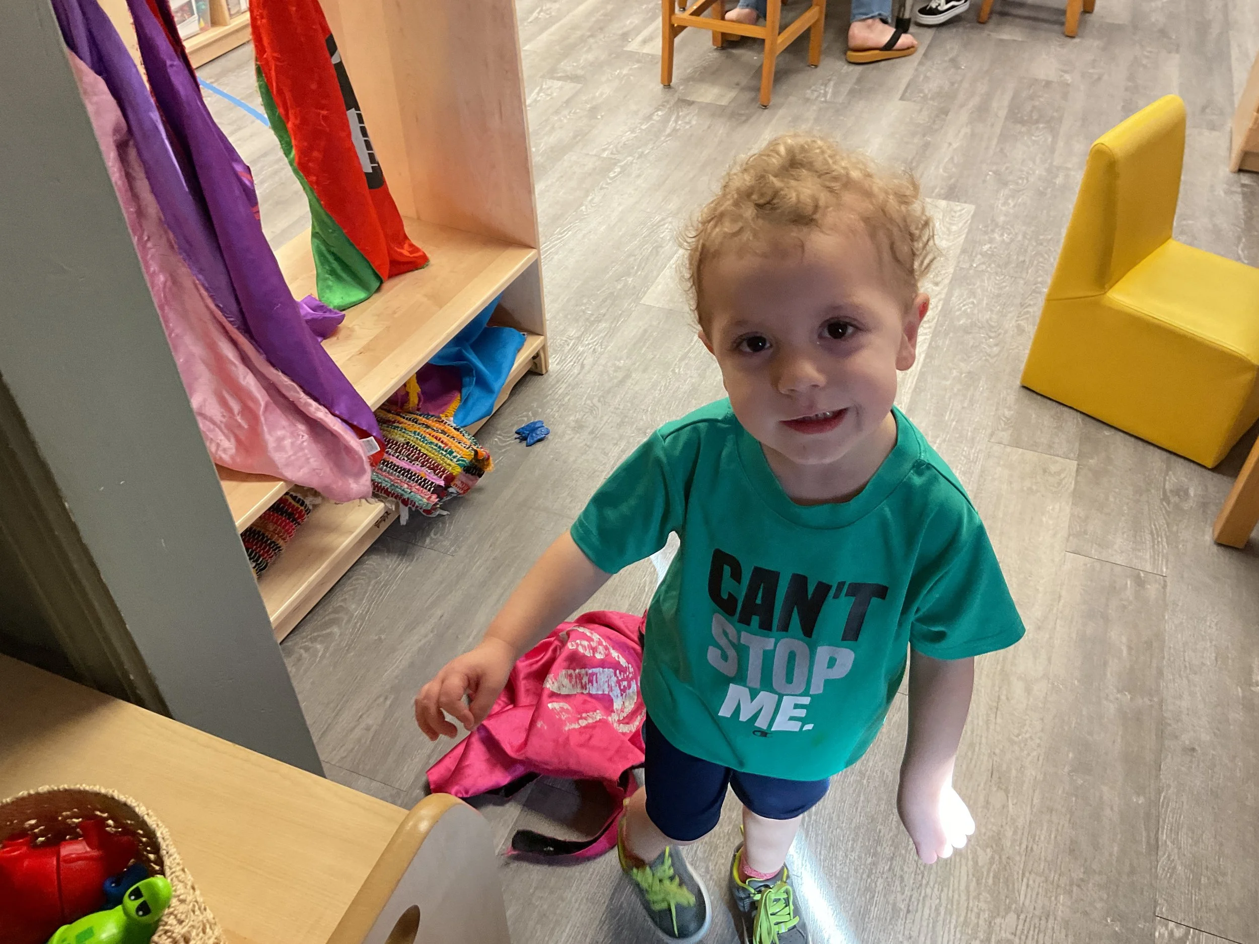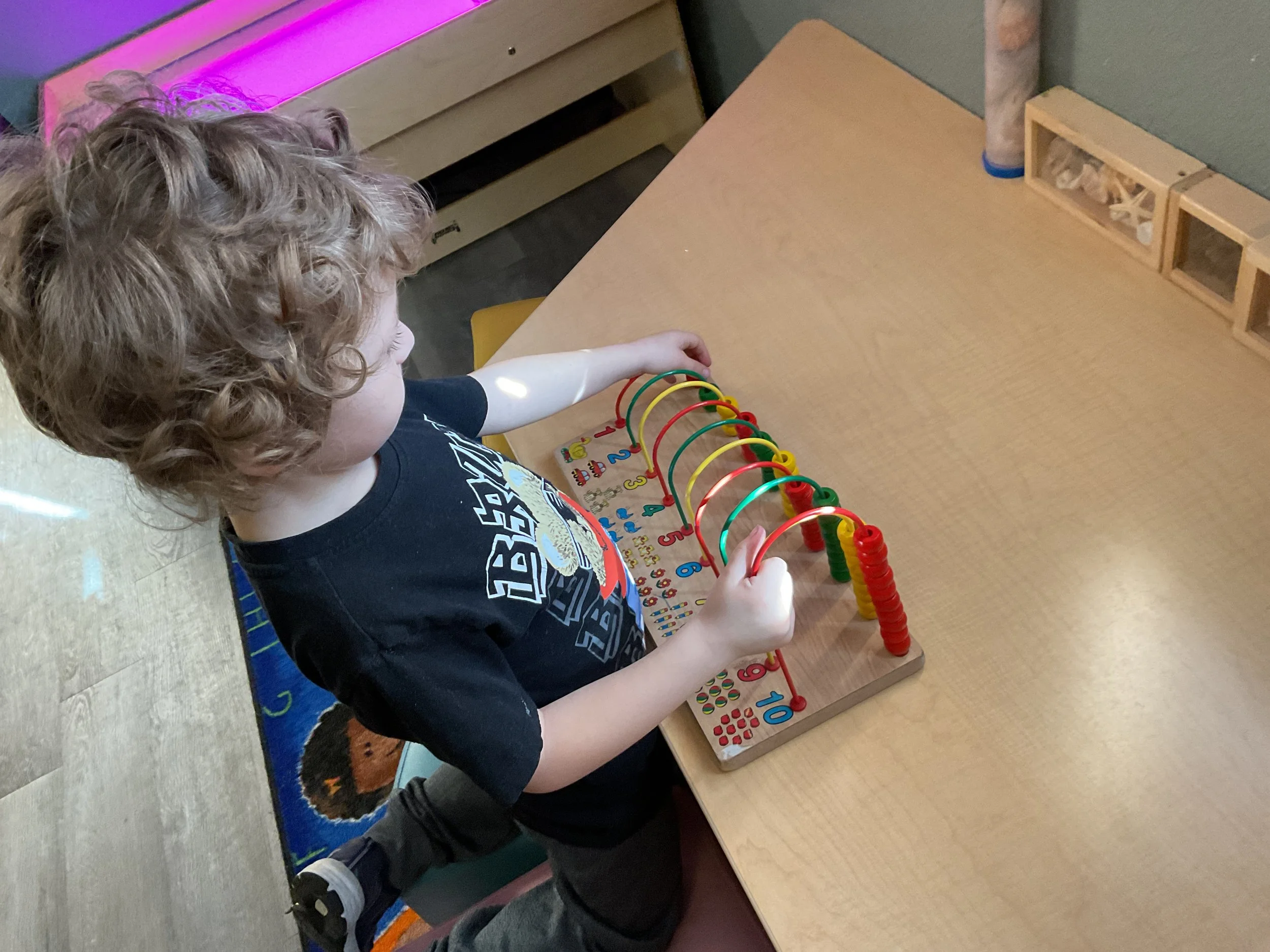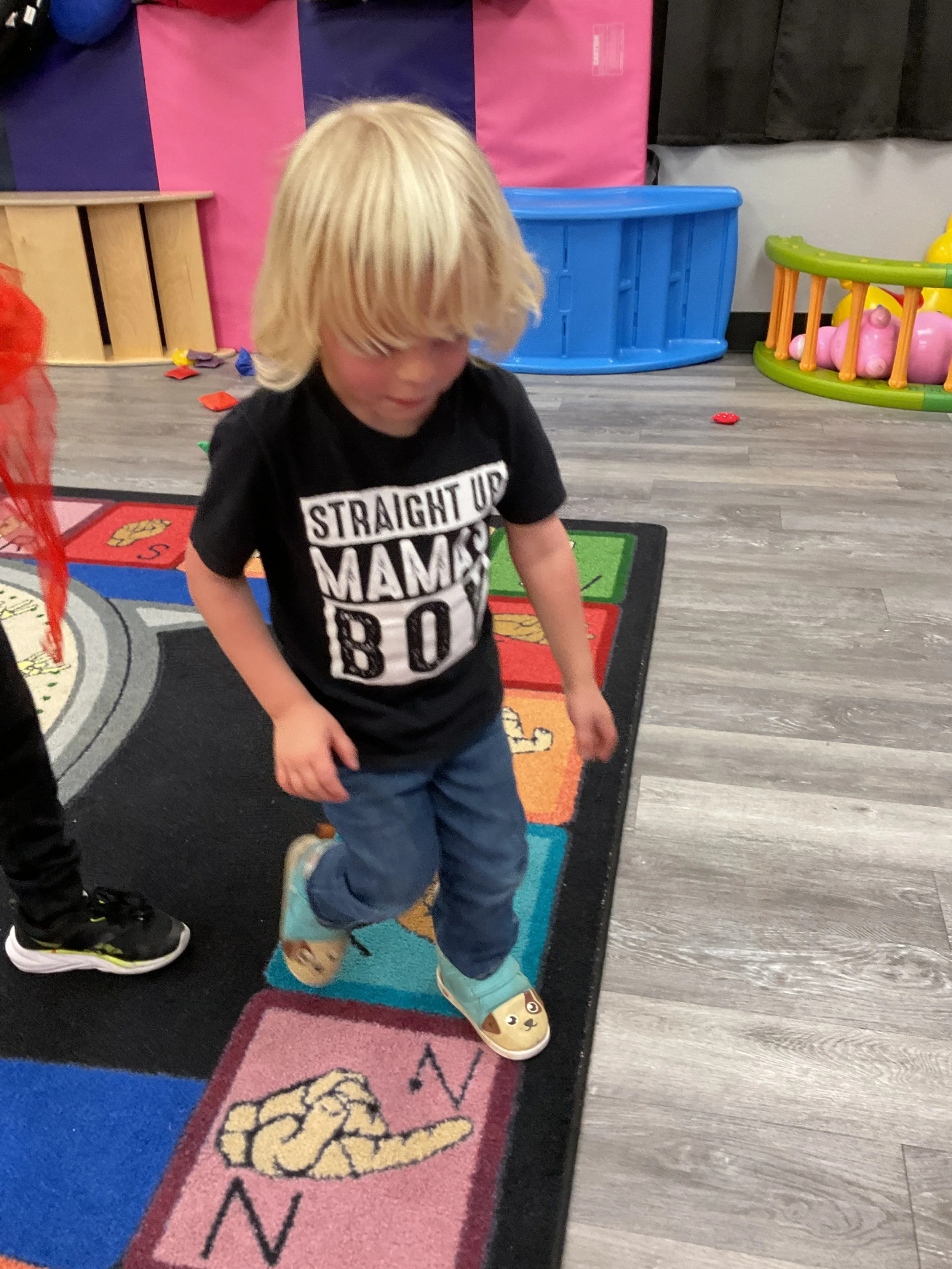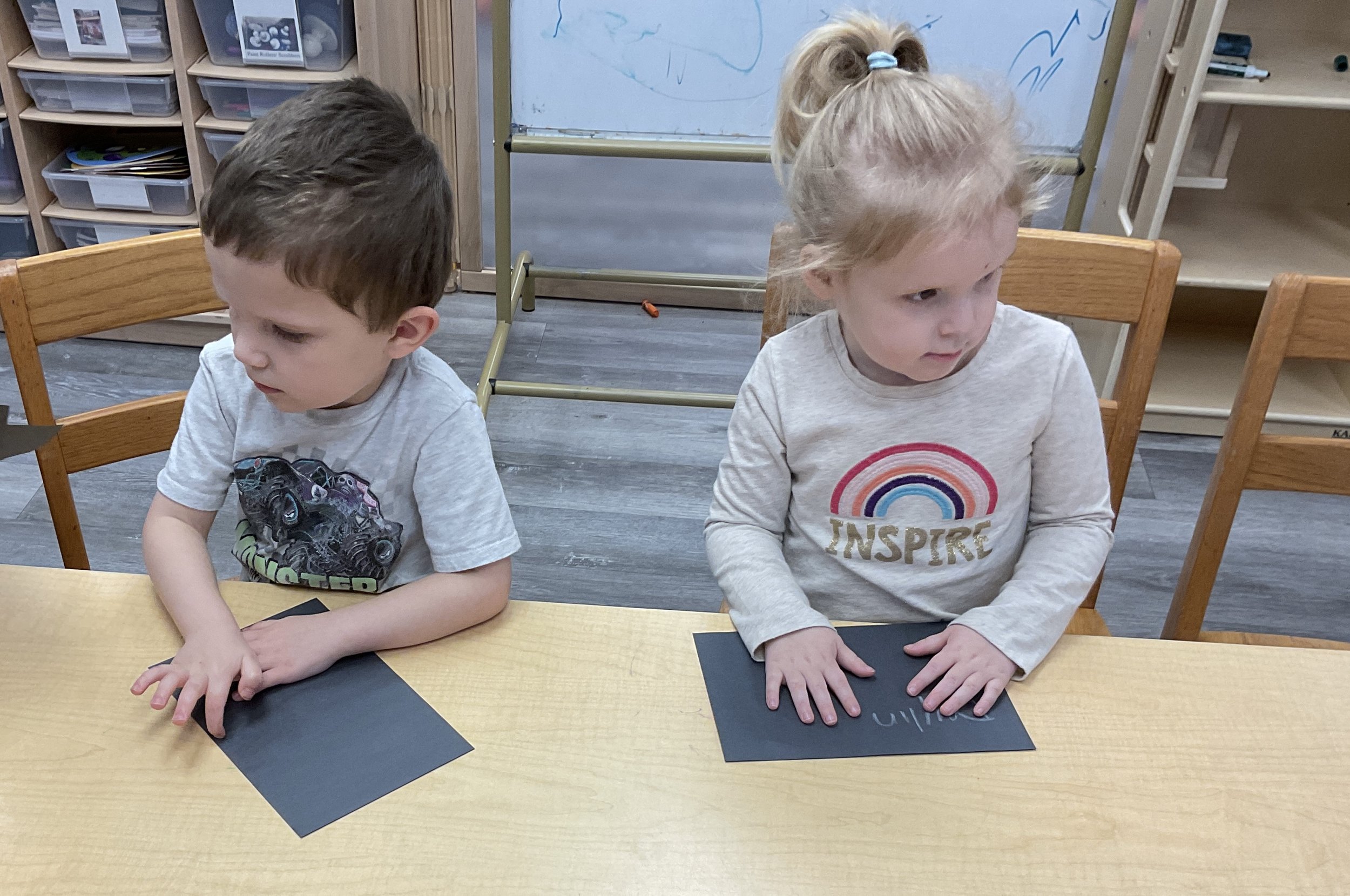 This morning, we read the book Zipping, Zapping, Zooming Bats written by Ann Earle and illustrated by Henry Cole. During our music and movement time, we had a Monday morning dance party! Then, during our math and cognition lesson, we worked on opposites. Next, for our science and sensory lesson, we drew moons so our nocturnal animals can see when they explore at night. Finally, for our literacy and fine motor lesson, we practiced tracing lines and writing our names.