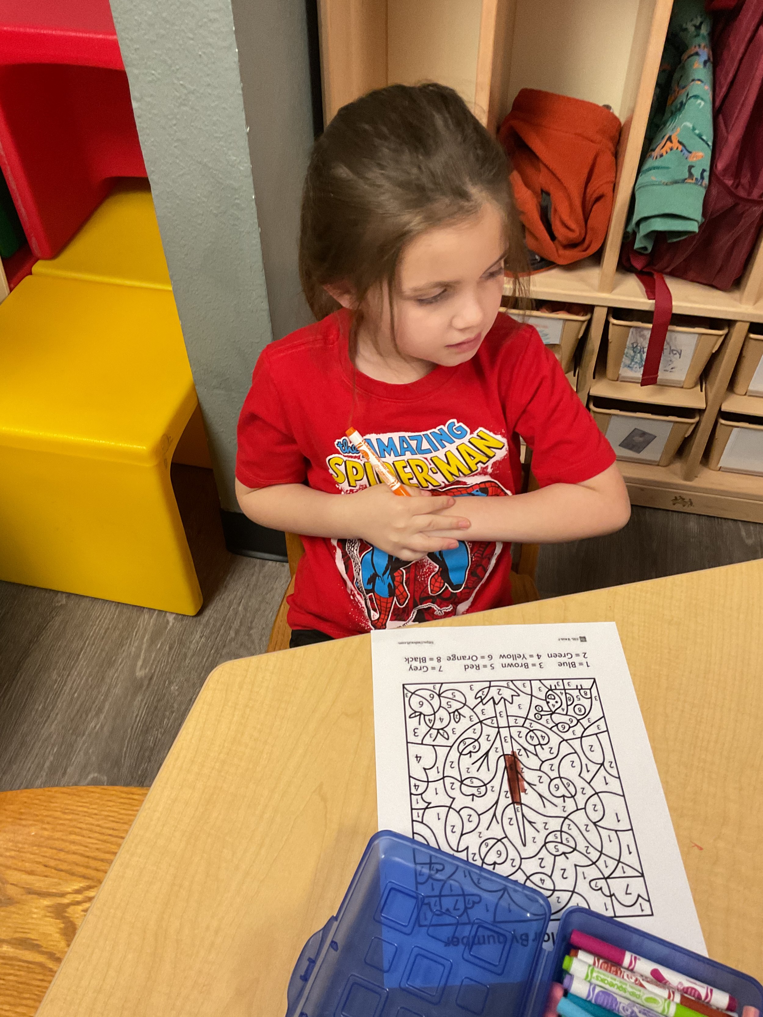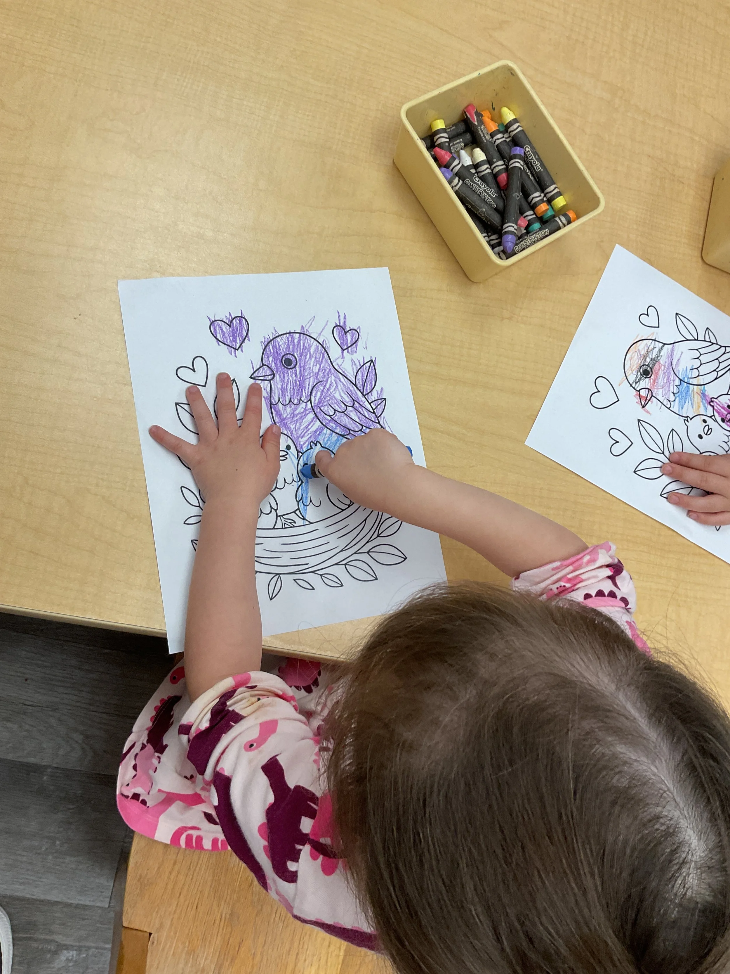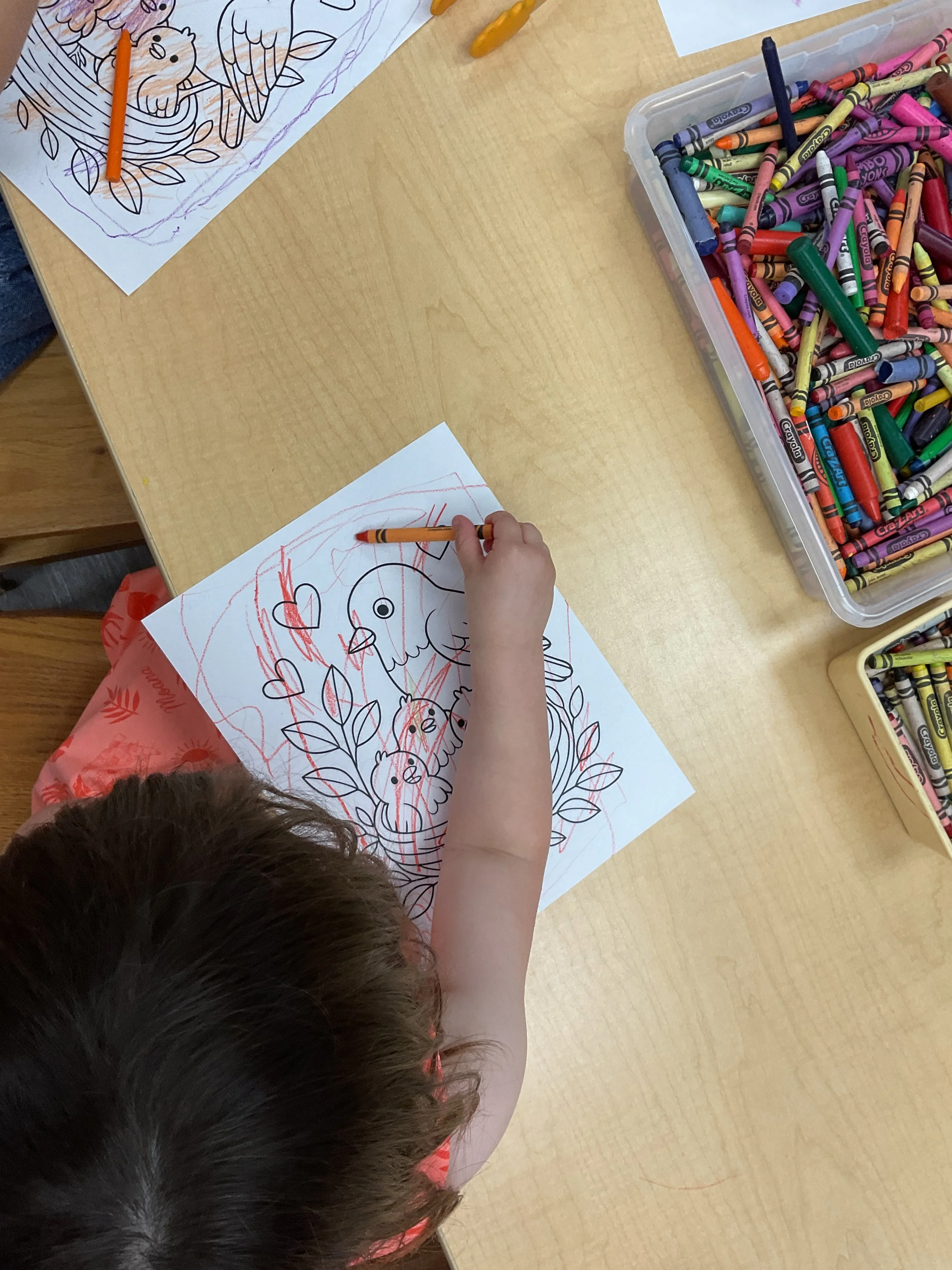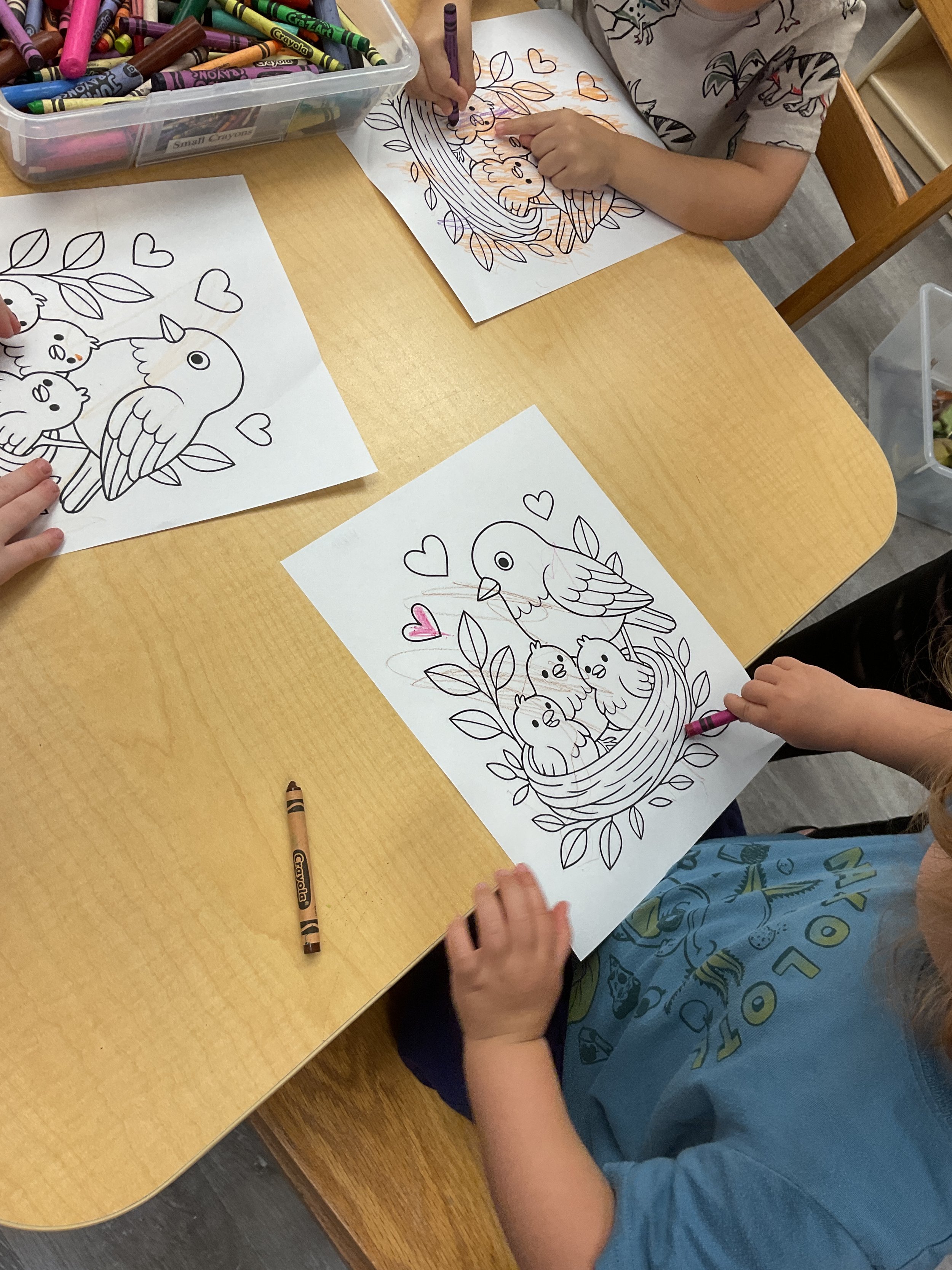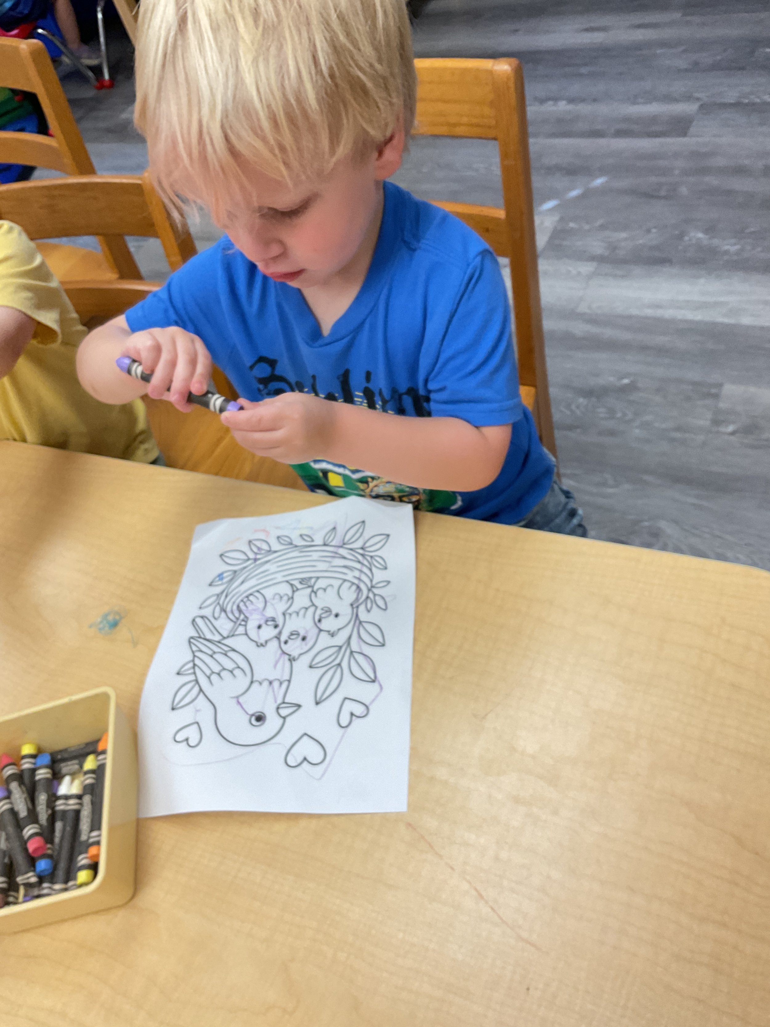 This morning, we read the book Parrots written by Helen Frost. During our music and movement time, we played with different sized balls. Then, during our math and cognition lesson, we worked on number recognition and 1 to 1 correspondence for numbers 1 through 20. Next, for our science and sensory lesson, we colored a picture of birds in a tree. Finally, for our literacy and fine motor lesson, we listened to a book on tape.