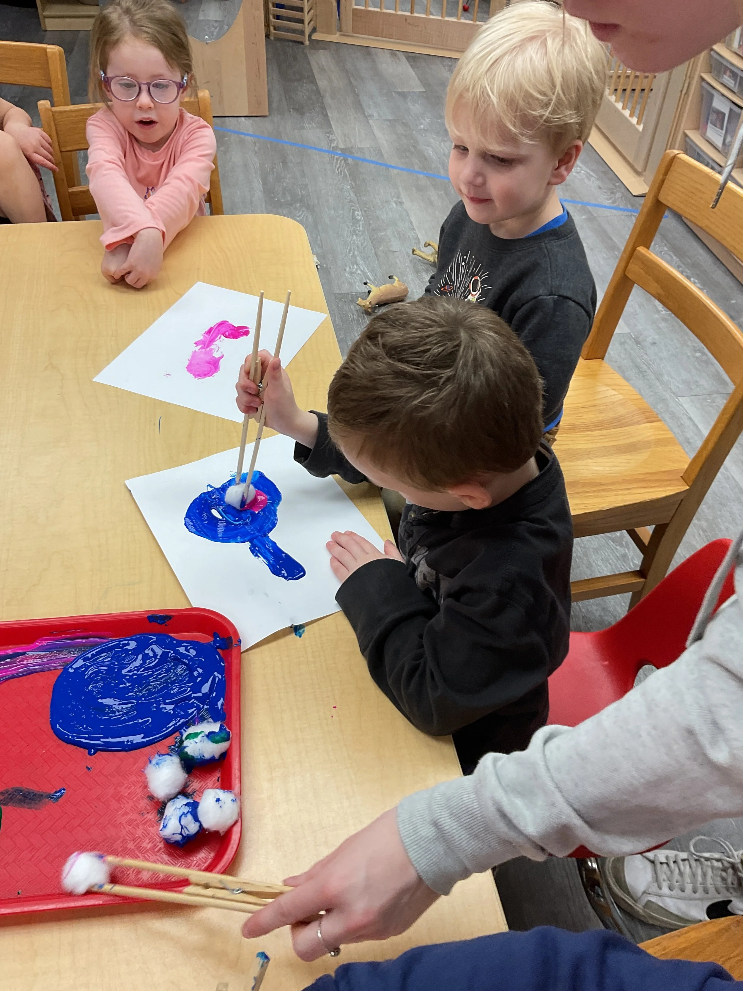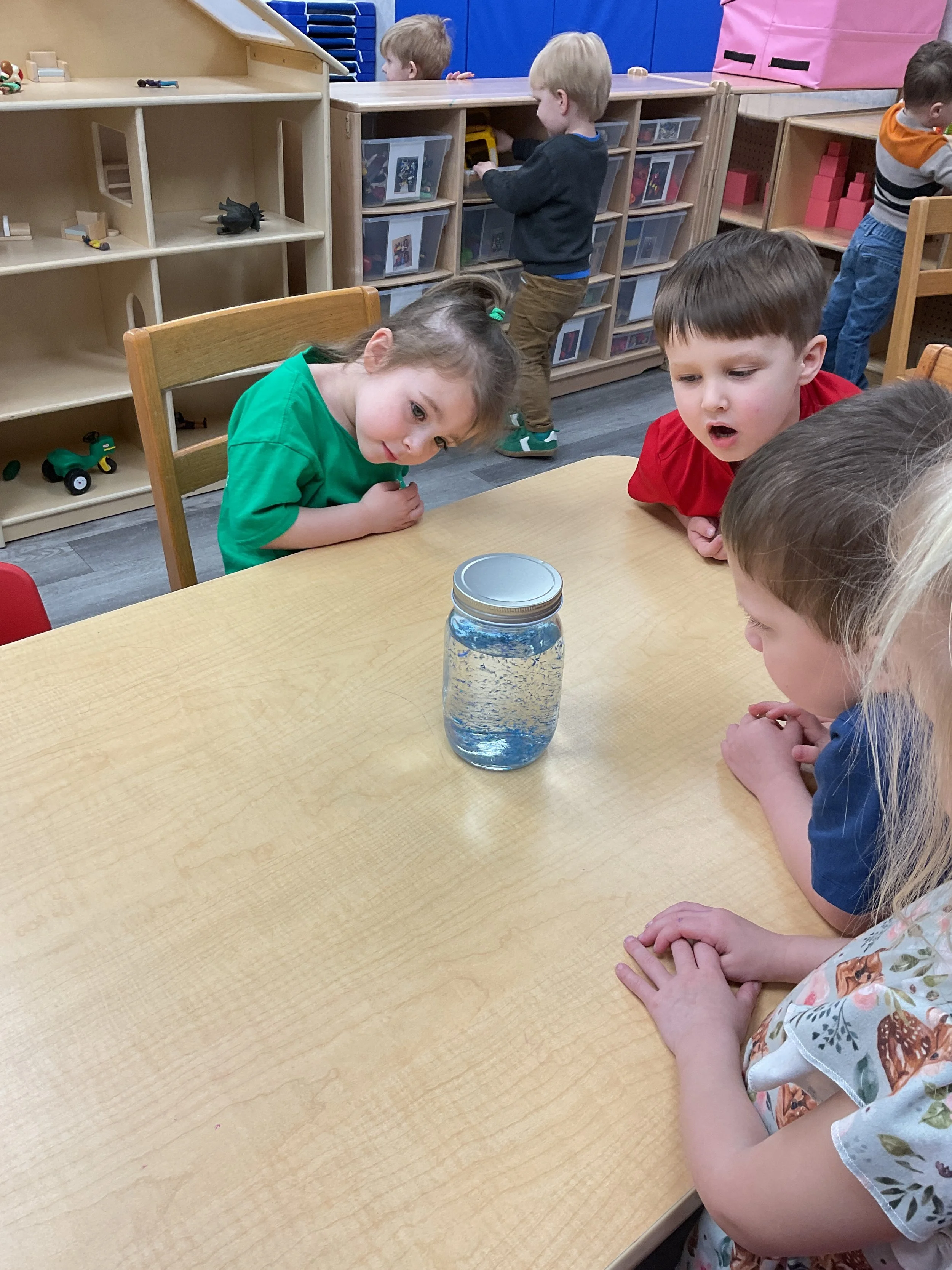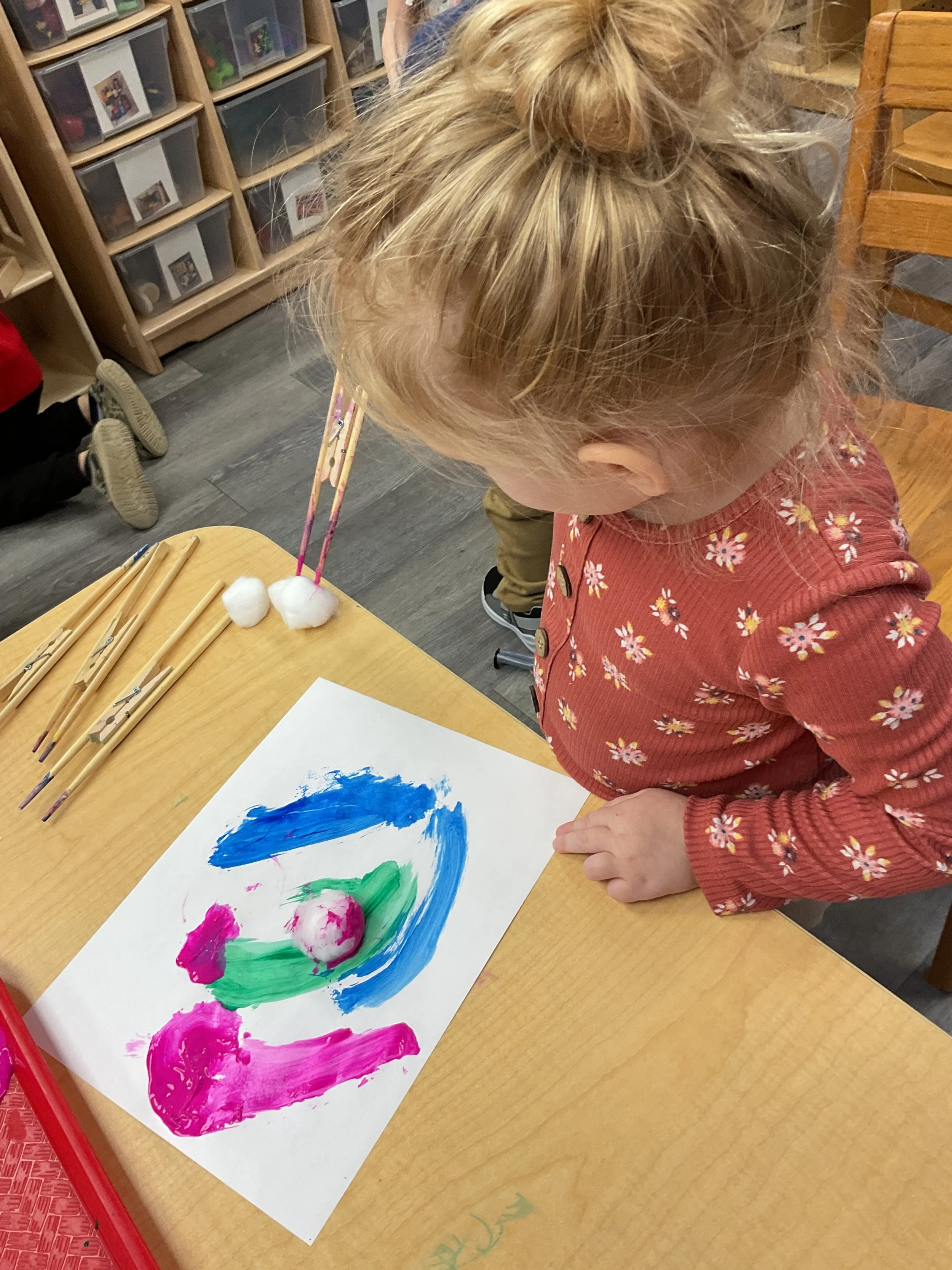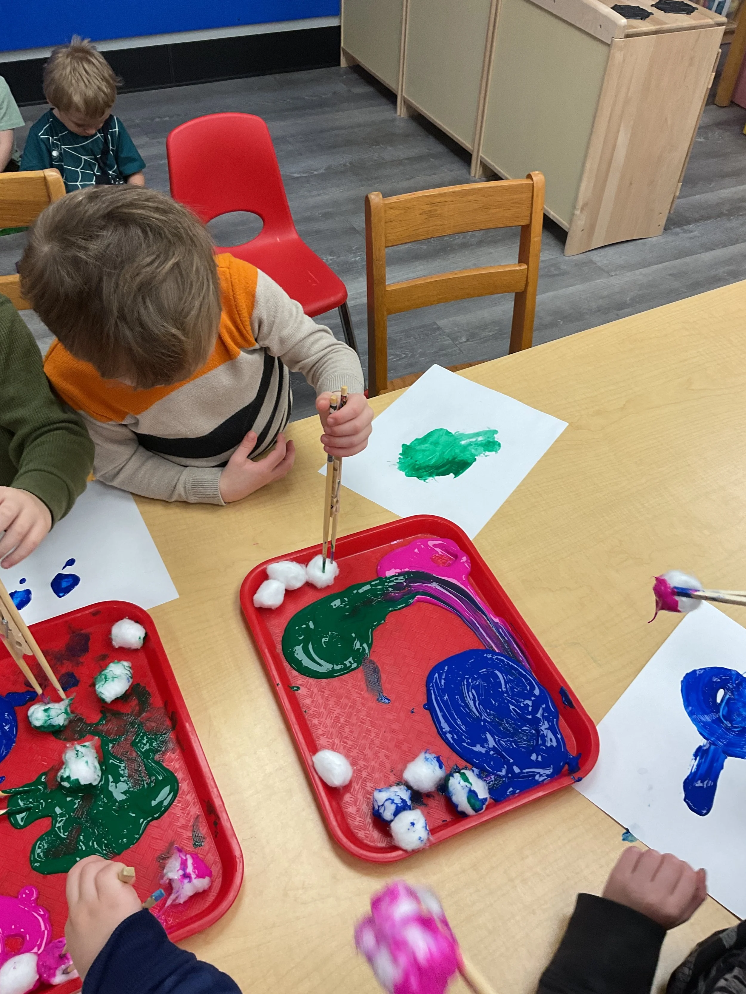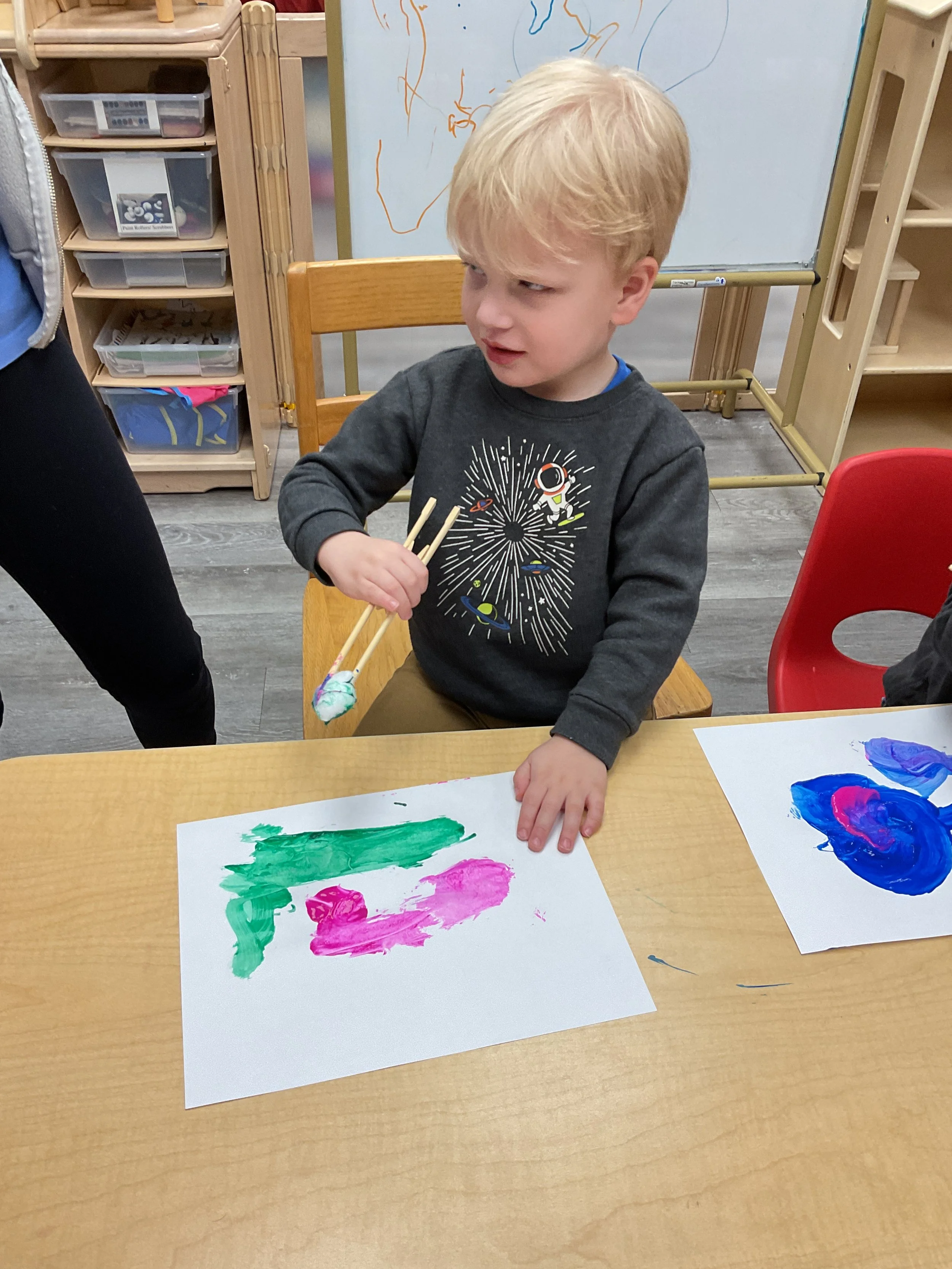 This morning, we read the book All Kinds of People written by Shelly Rotner and Shelia M. Kelly. During our music and movement time, we sang in French! We sang Frere Jacques and we worked on our rhythm with rhythm sticks. Then, during our math and cognition lesson, we looked at pictures of people, animals, and food from around the world. Next, for our science and sensory lesson, we made a tornado in a jar. We added glitter so we could see how fast the water was spinning. Finally, for our literacy and fine motor lesson, we used chopstick to paint with!
