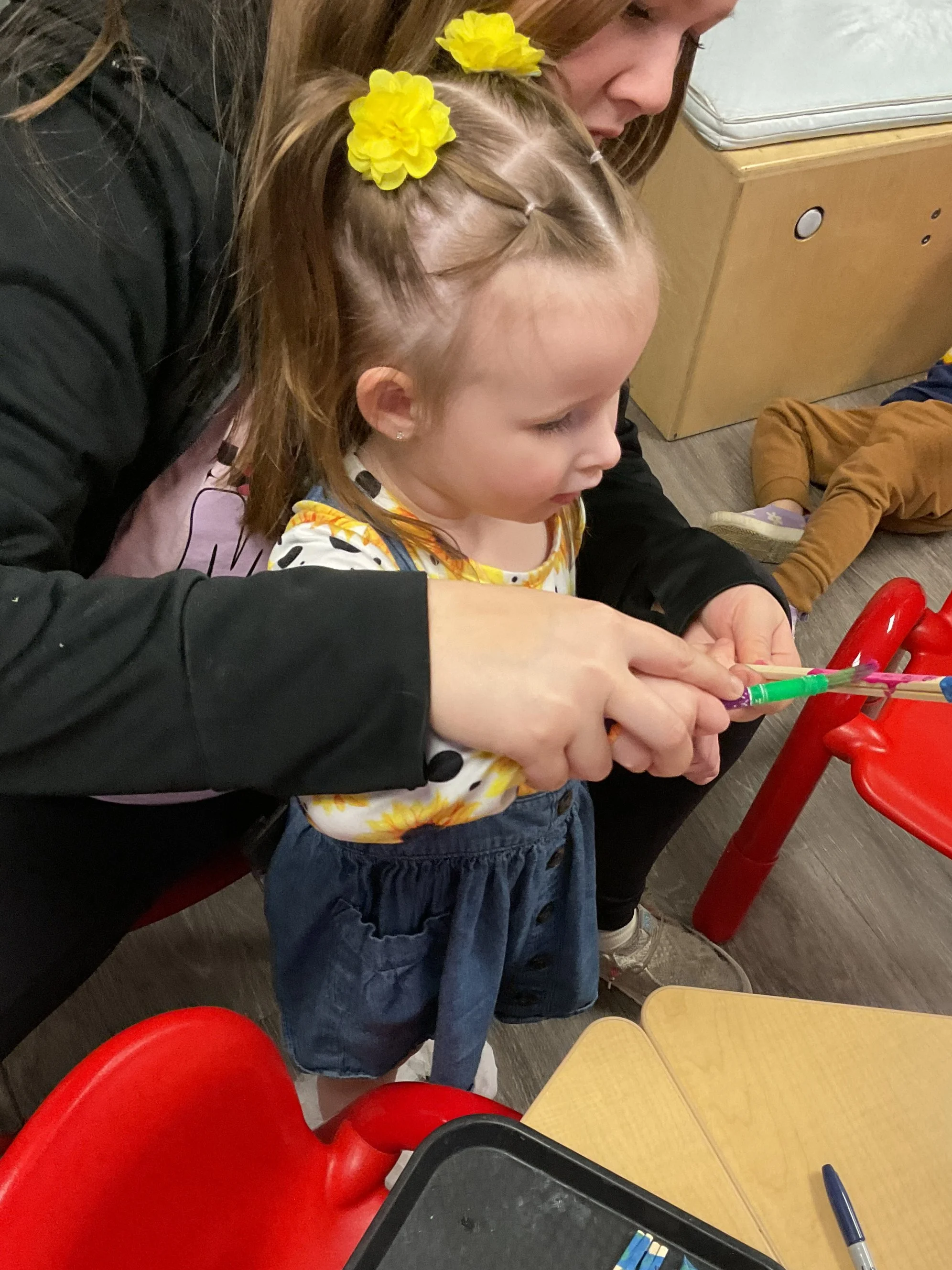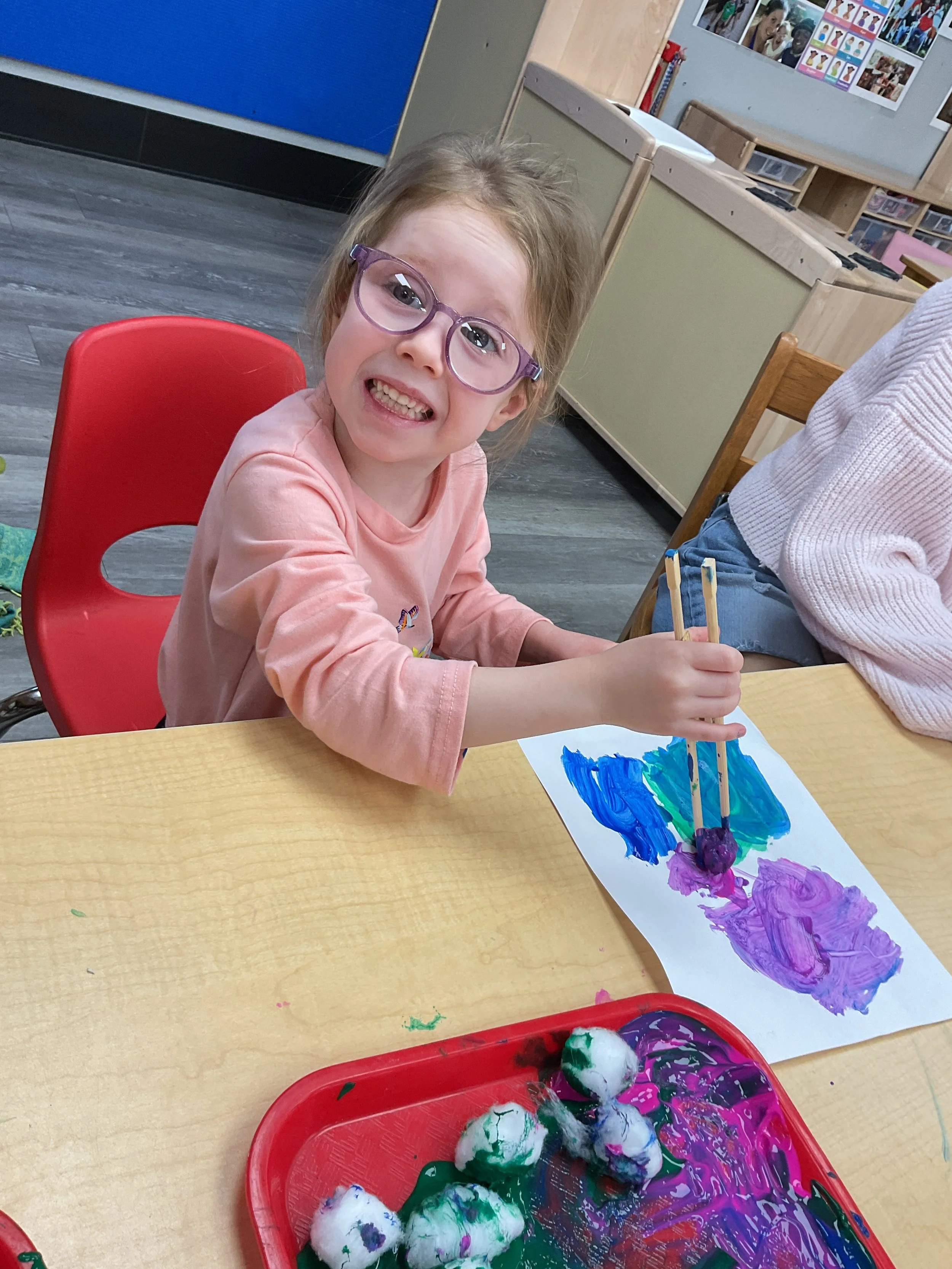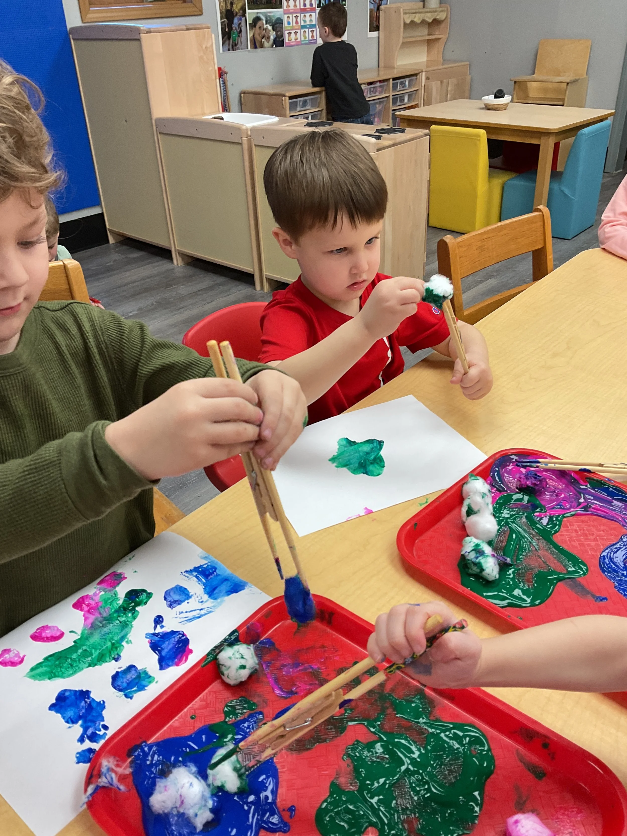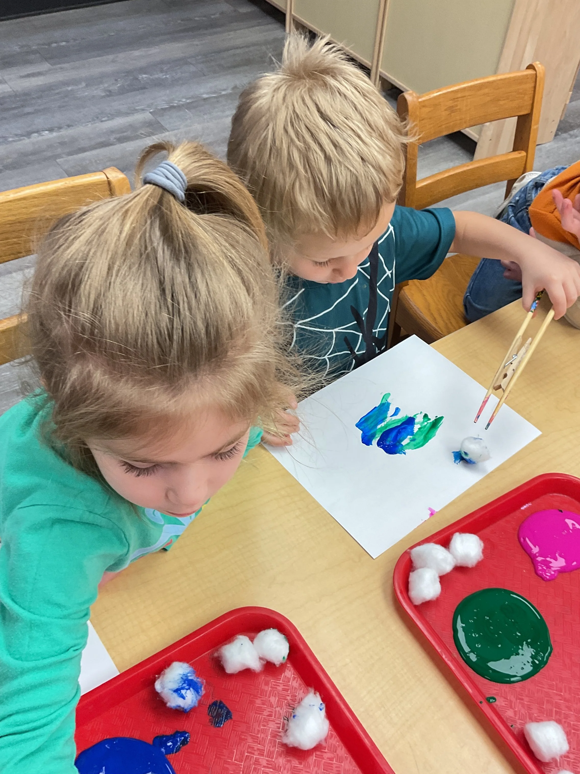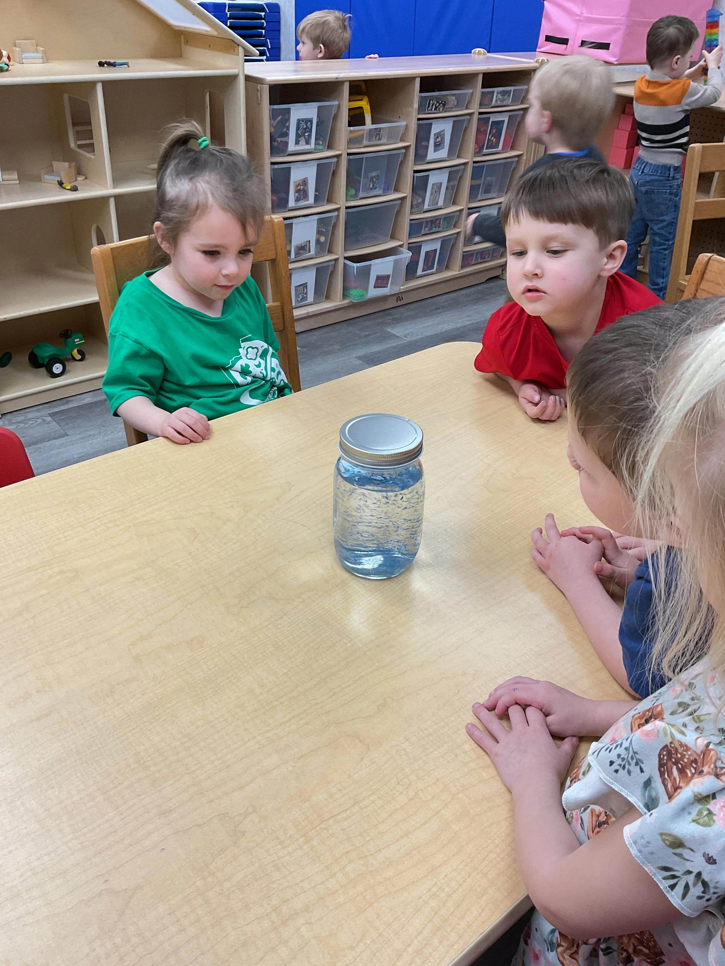 This morning, we read the book All Kinds of People written by Shelly Rotner and Shelia M. Kelly. During our music and movement time, we sang in French! We sang Frere Jacques and we worked on our rhythm with rhythm sticks. Then, during our math and cognition lesson, we looked at pictures of people, animals, and food from around the world. Next, for our science and sensory lesson, we made a tornado in a jar. We added glitter so we could see how fast the water was spinning. Finally, for our literacy and fine motor lesson, we used chopstick to paint with!