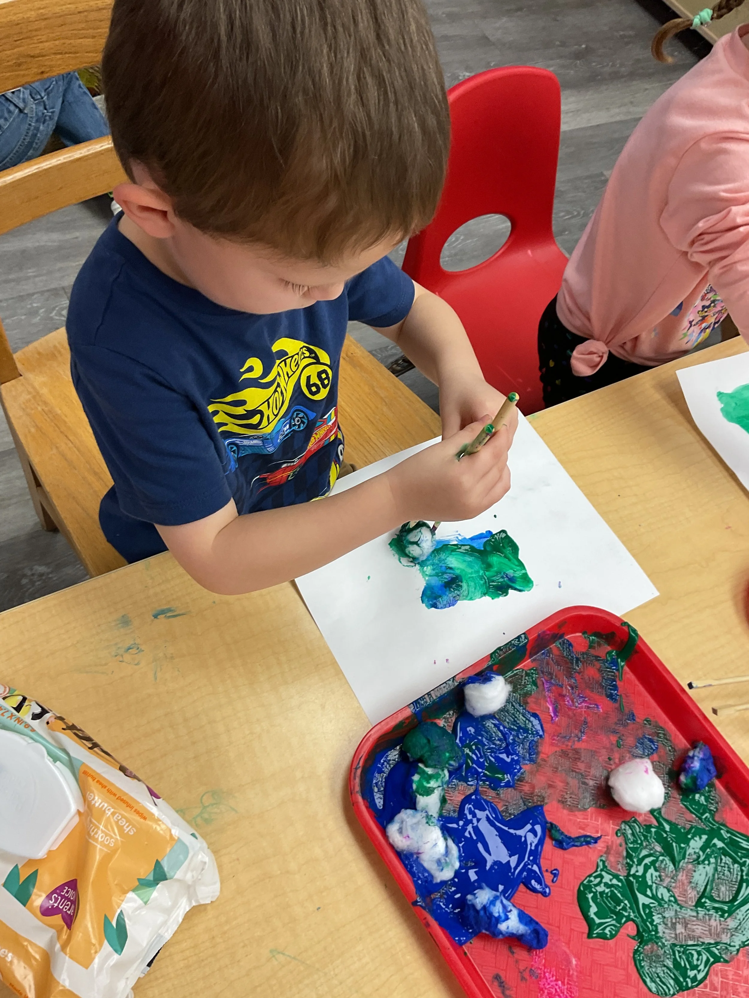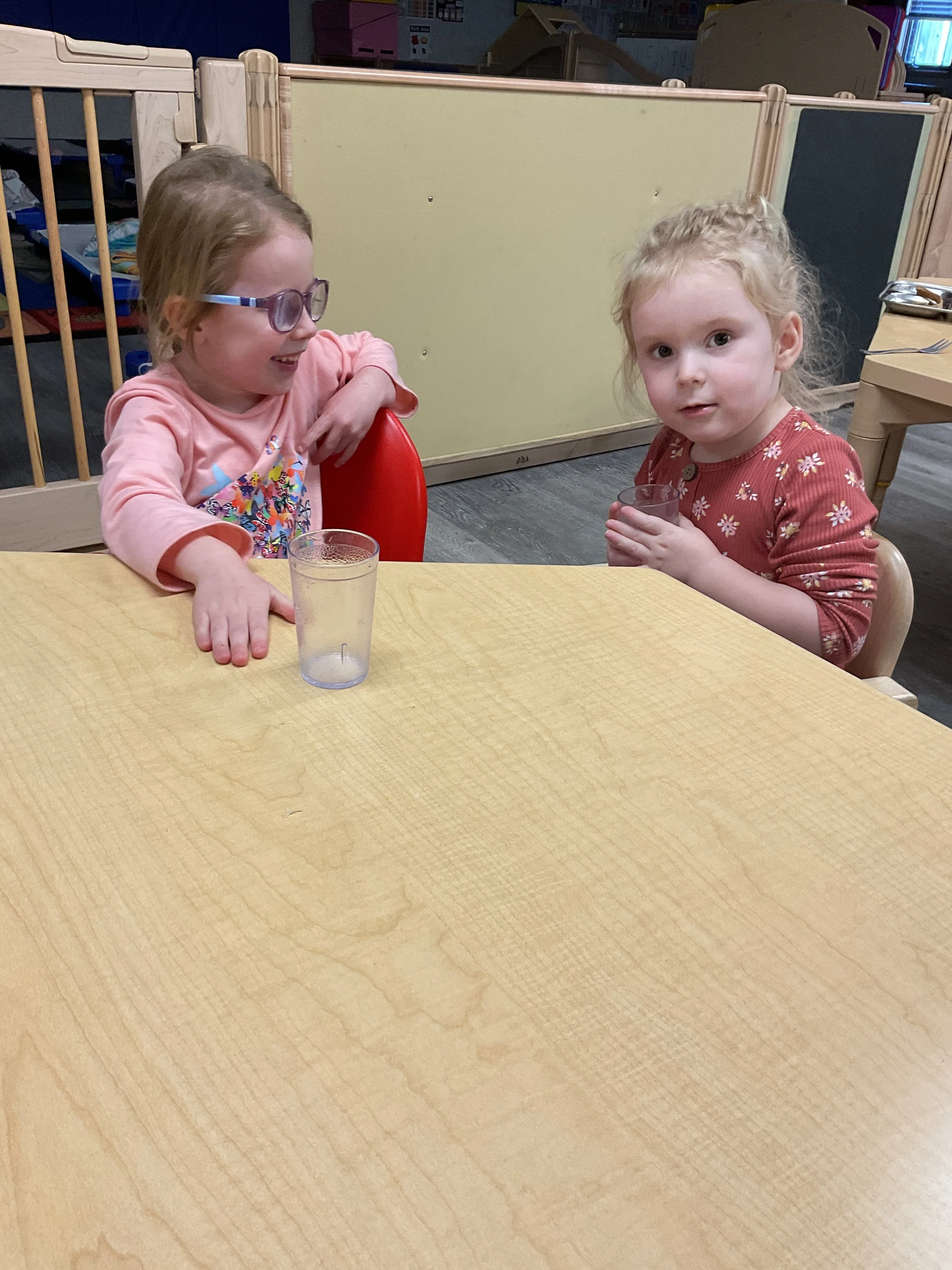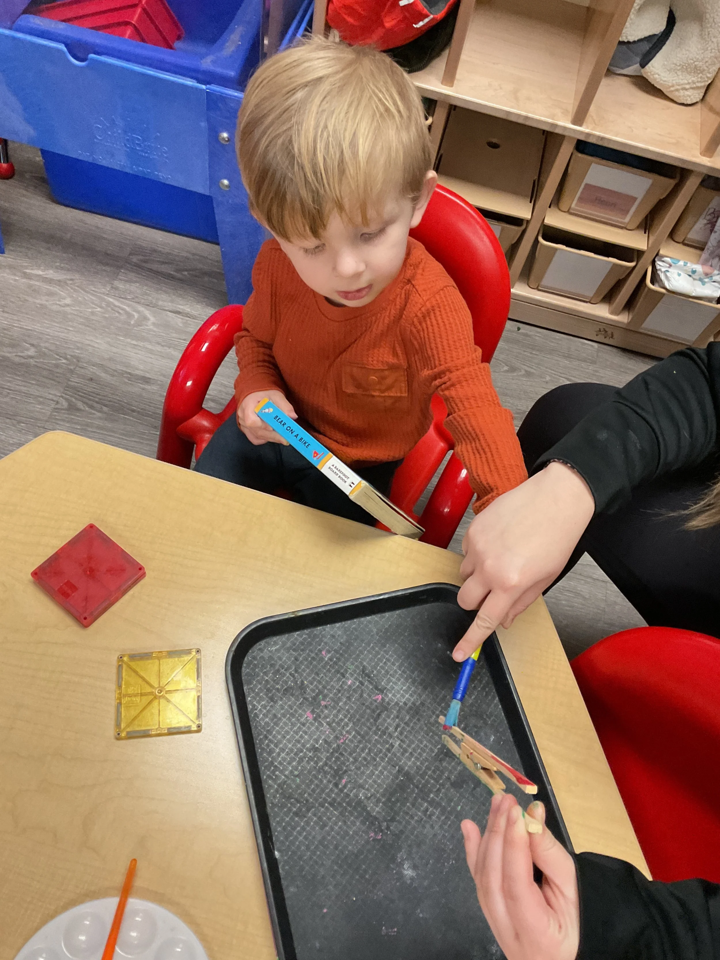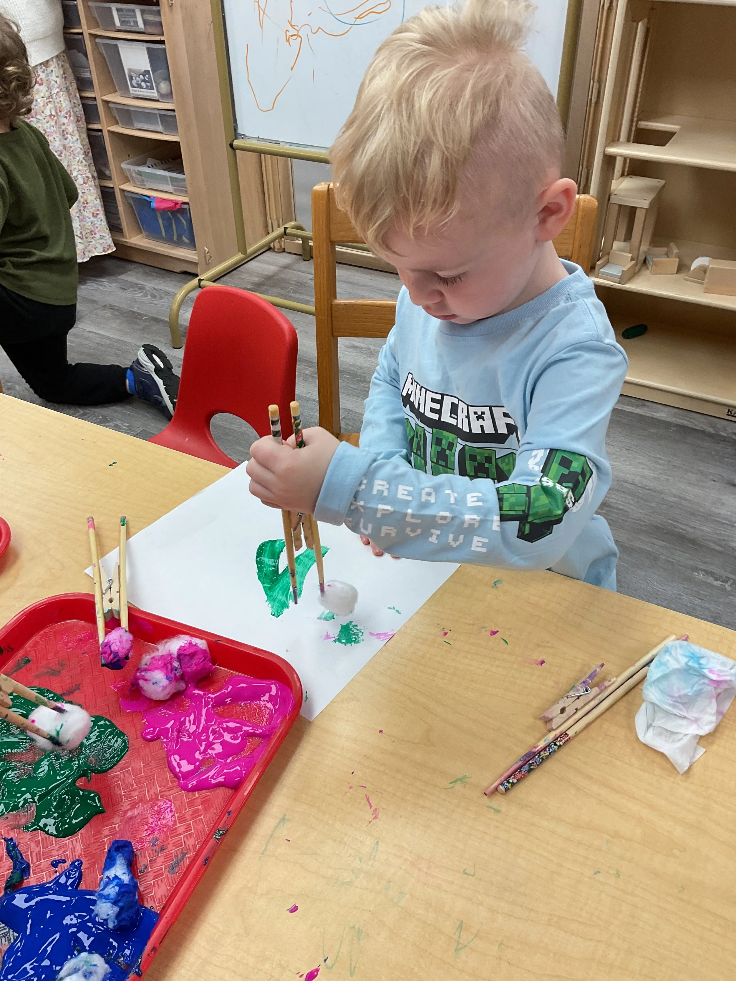 This morning, we read the book All Kinds of People written by Shelly Rotner and Shelia M. Kelly. During our music and movement time, we sang in French! We sang Frere Jacques and we worked on our rhythm with rhythm sticks. Then, during our math and cognition lesson, we looked at pictures of people, animals, and food from around the world. Next, for our science and sensory lesson, we made a tornado in a jar. We added glitter so we could see how fast the water was spinning. Finally, for our literacy and fine motor lesson, we used chopstick to paint with!