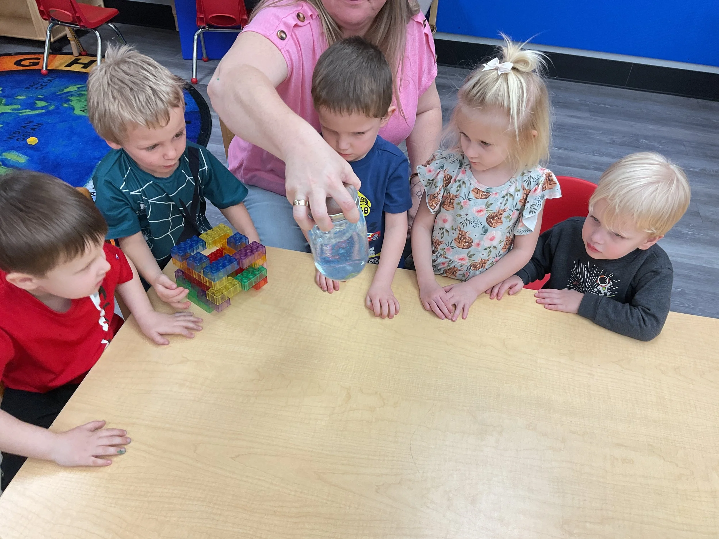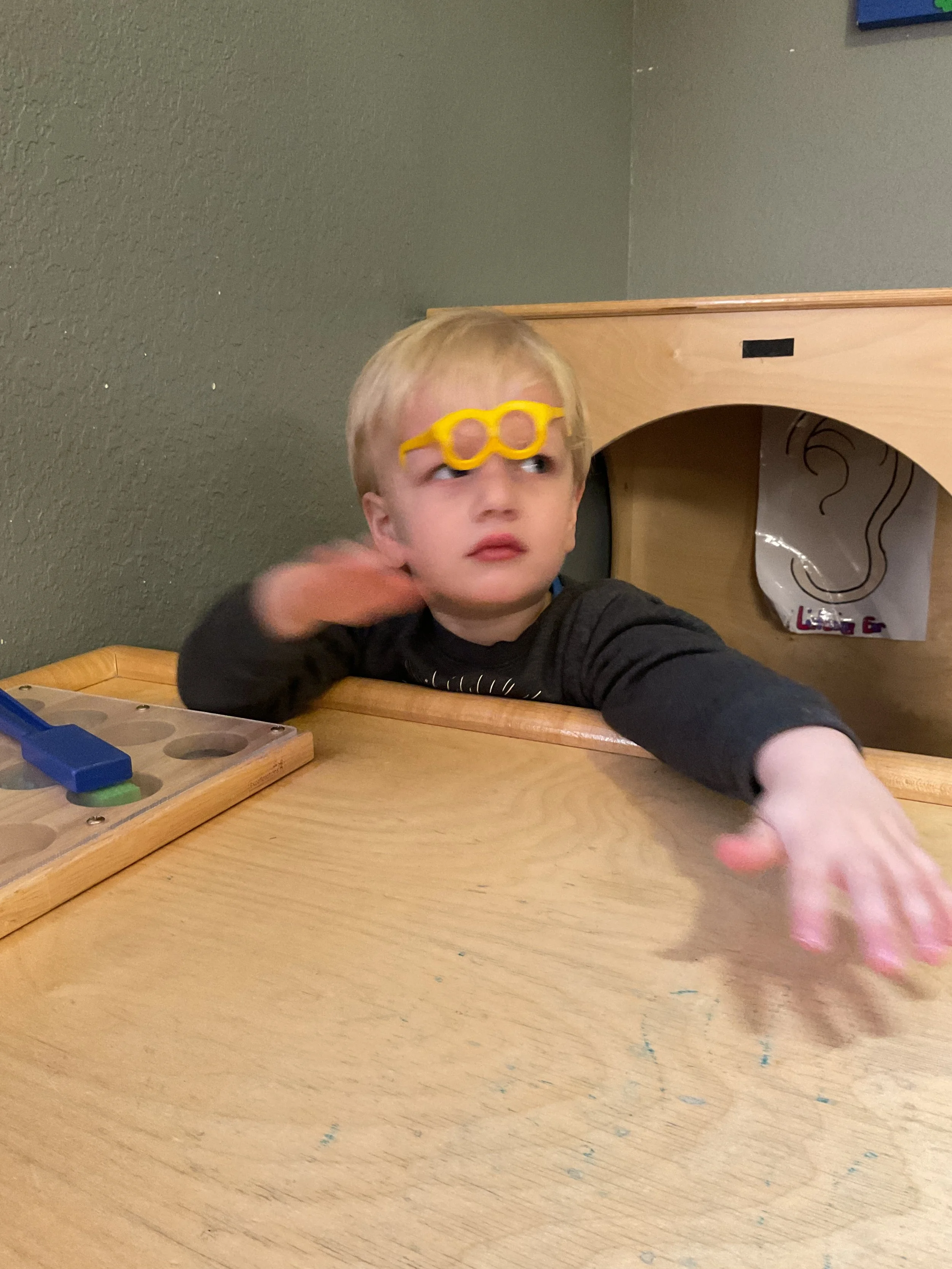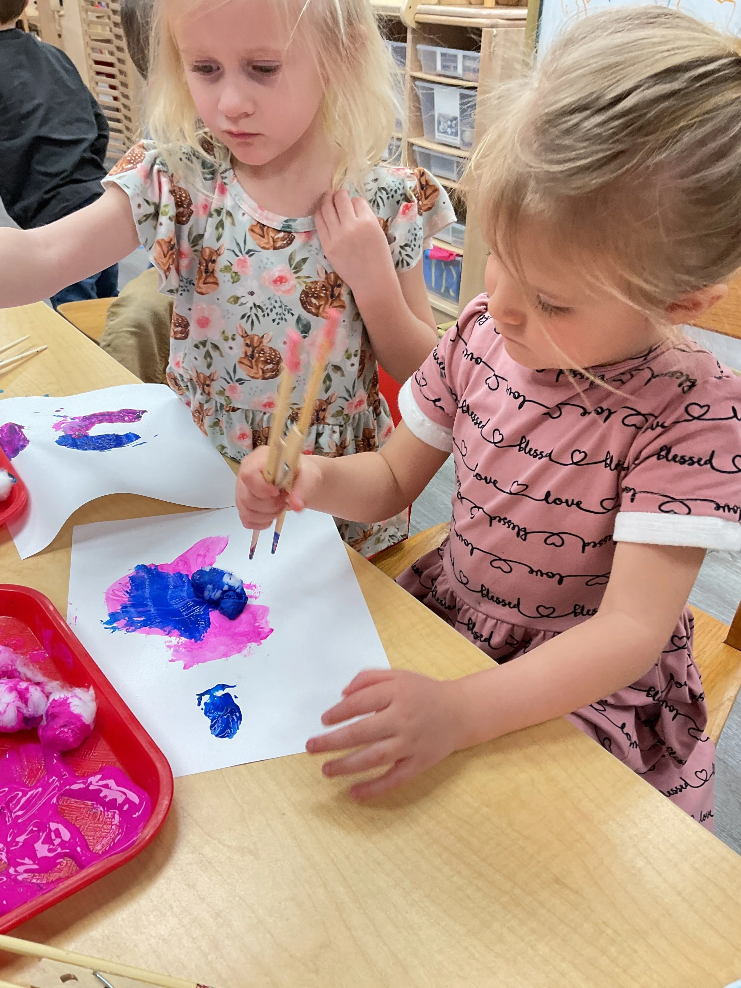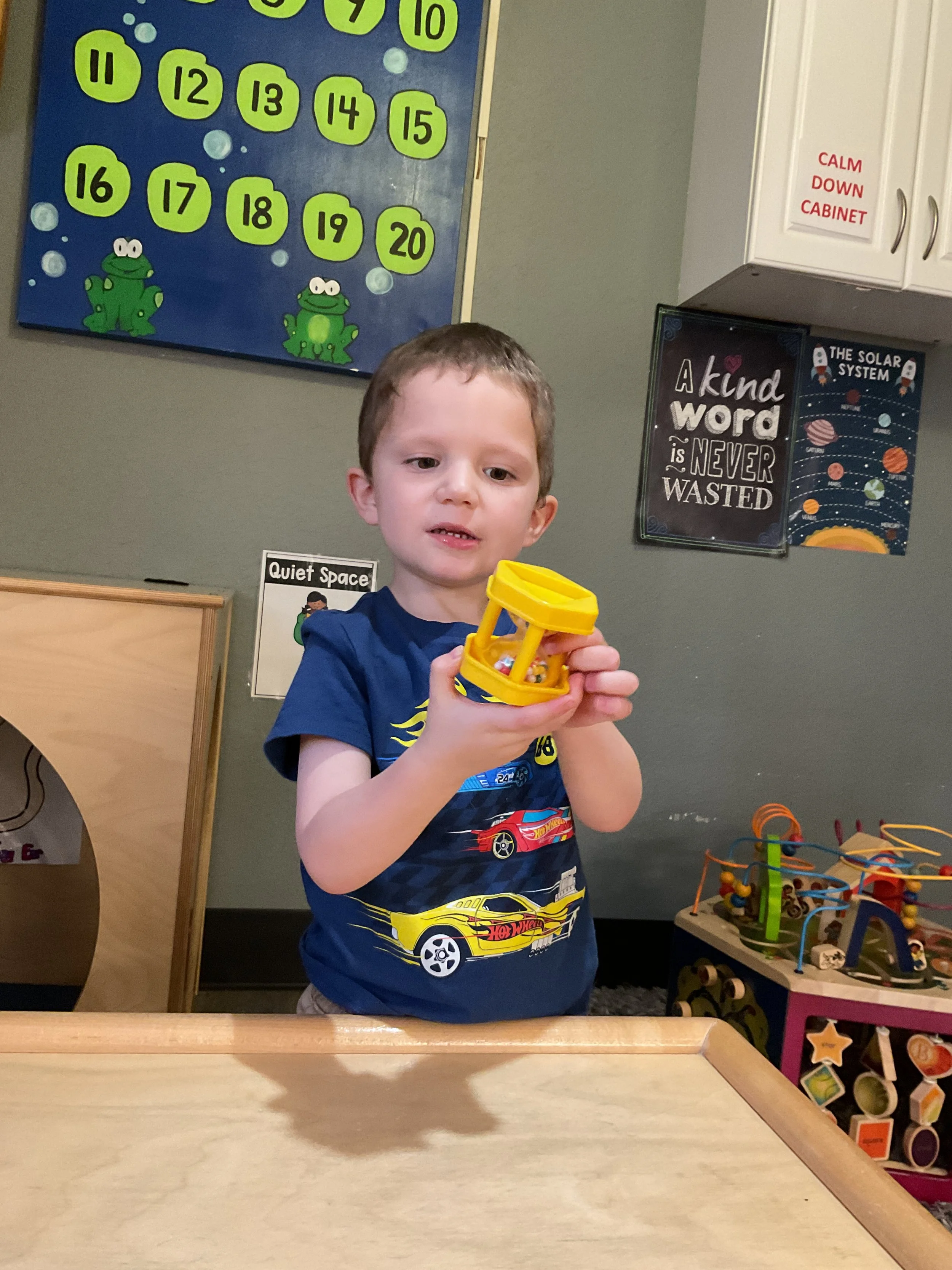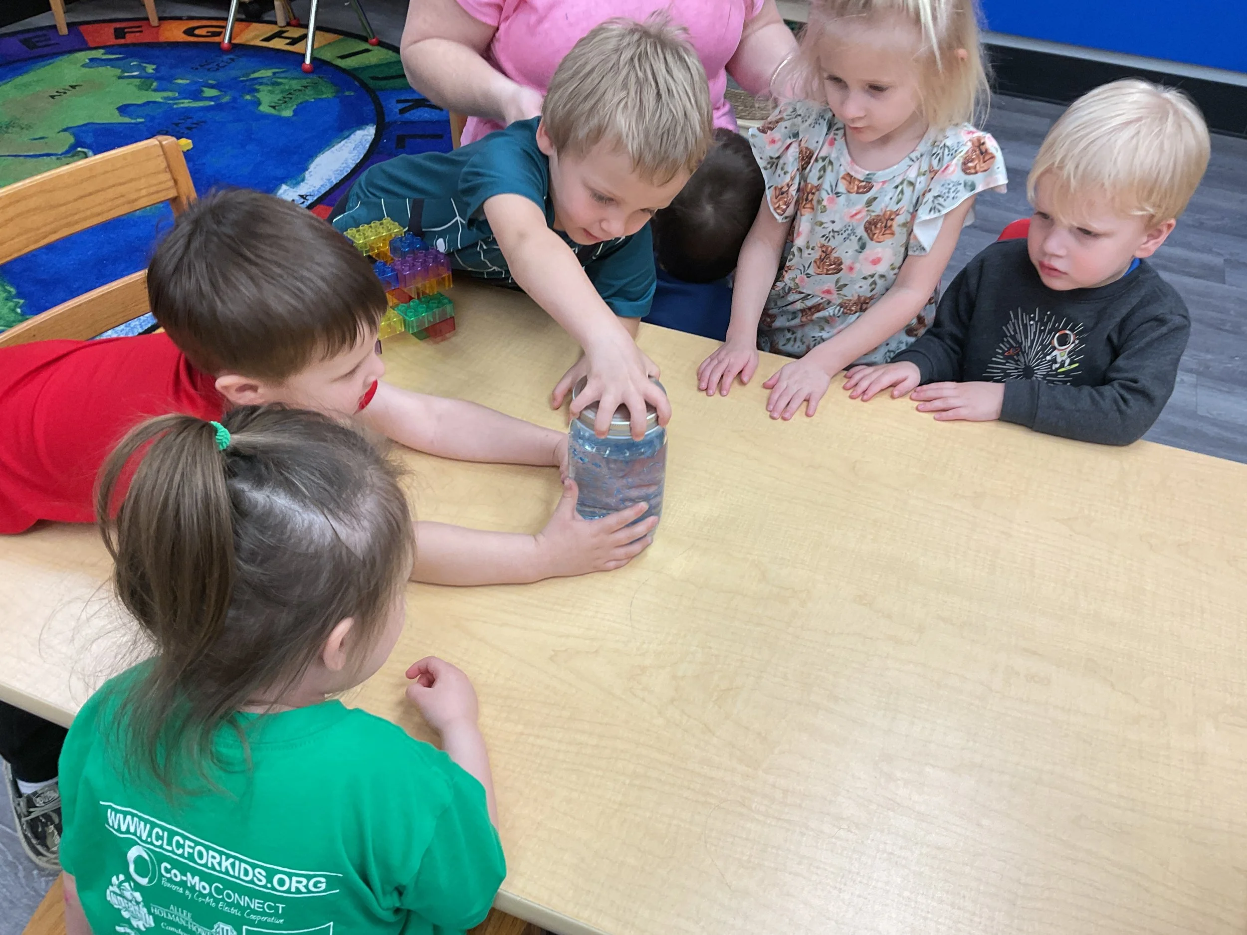This morning, we read the book All Kinds of People written by Shelly Rotner and Shelia M. Kelly. During our music and movement time, we sang in French! We sang Frere Jacques and we worked on our rhythm with rhythm sticks. Then, during our math and cognition lesson, we looked at pictures of people, animals, and food from around the world. Next, for our science and sensory lesson, we made a tornado in a jar. We added glitter so we could see how fast the water was spinning. Finally, for our literacy and fine motor lesson, we used chopstick to paint with!