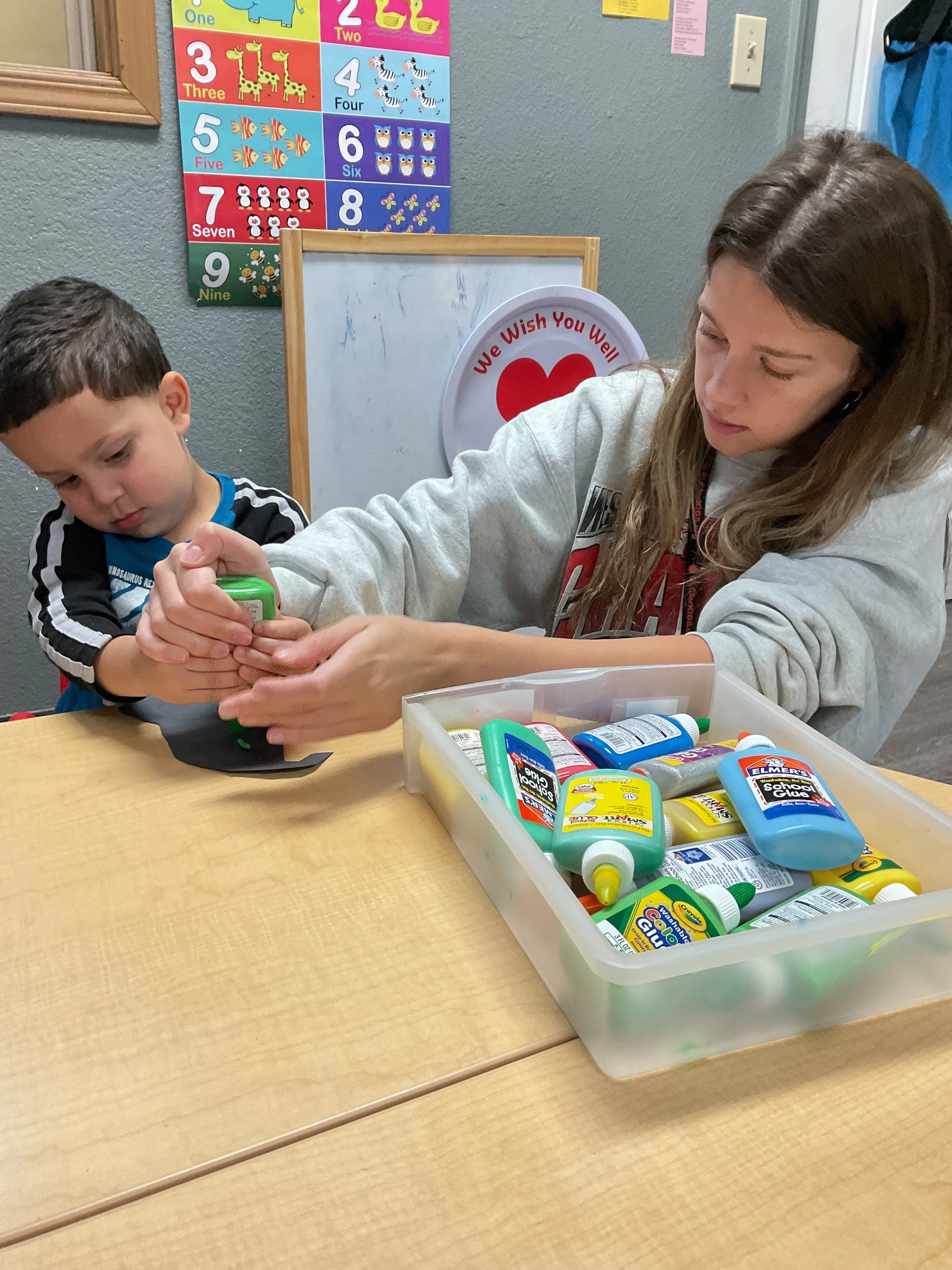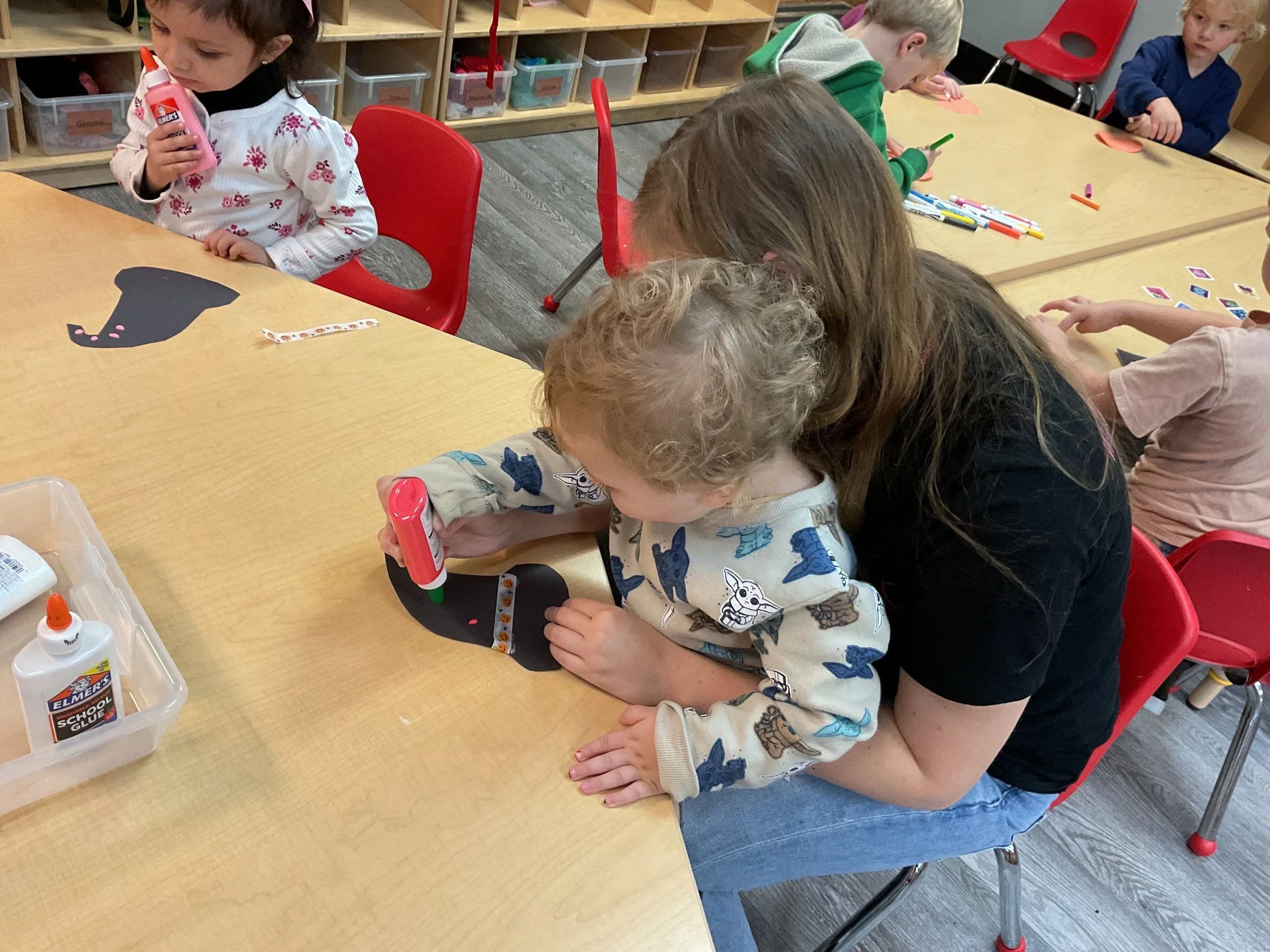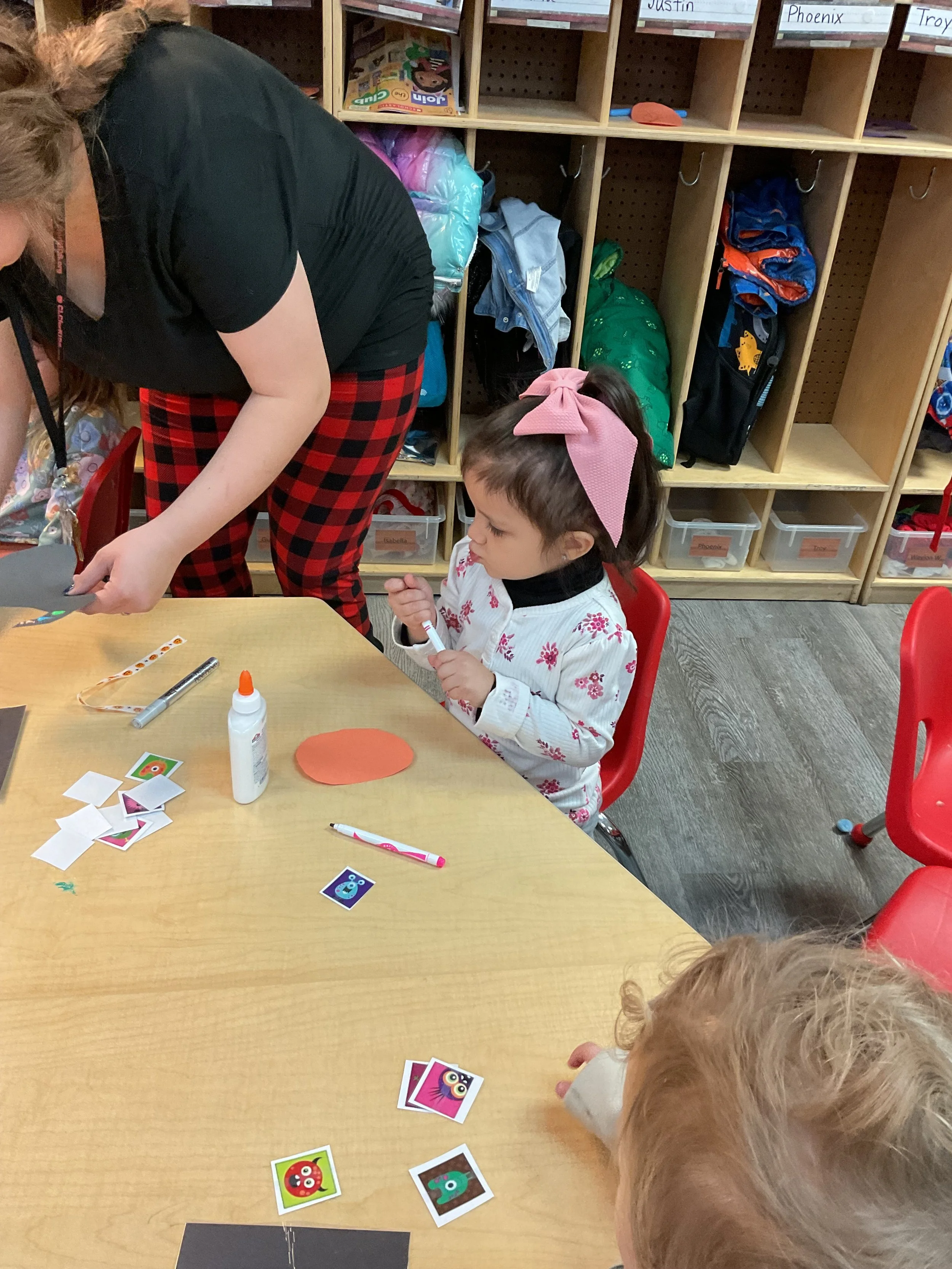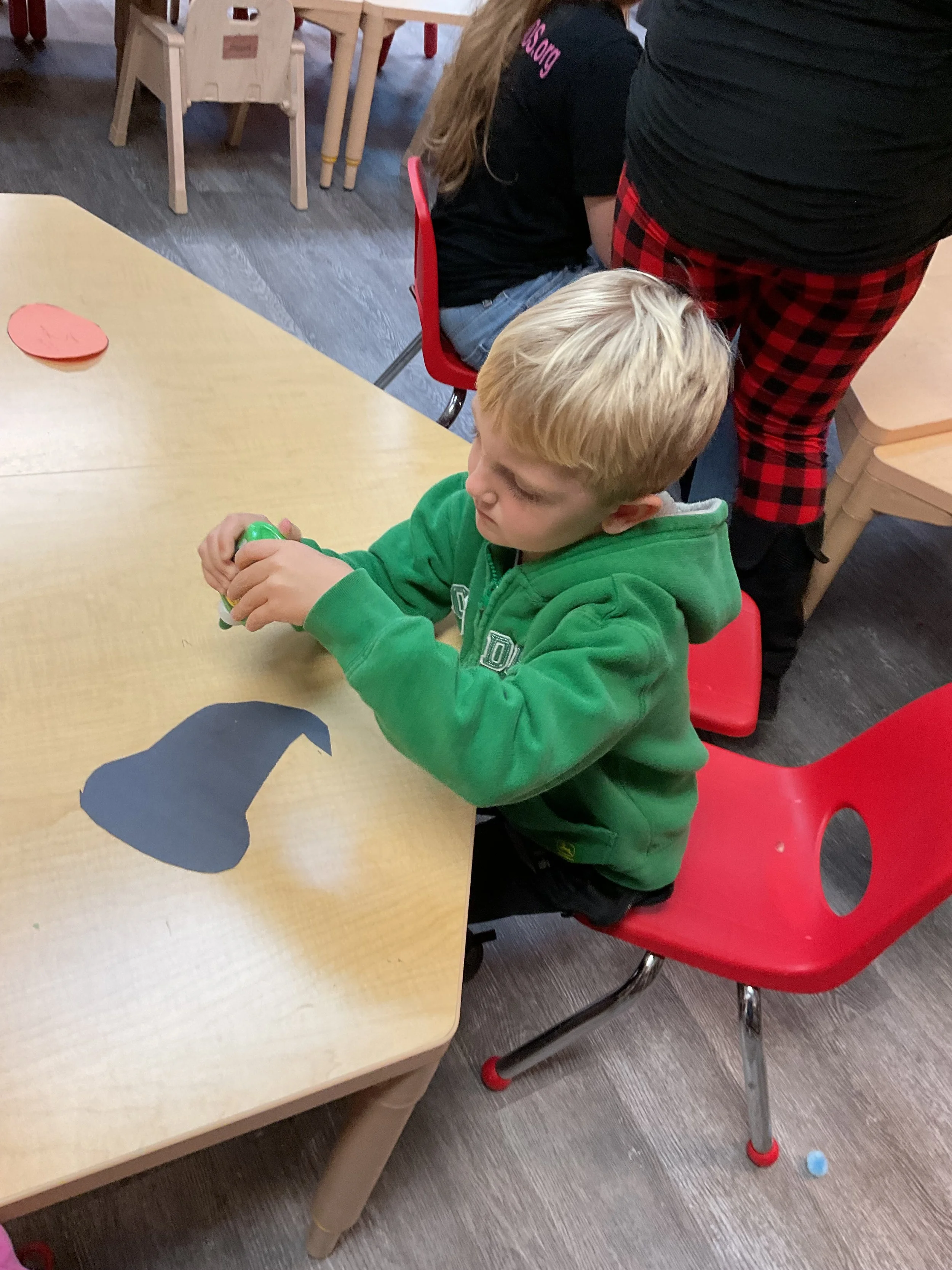 Happy Monday! This week we are learning all about Halloween. Today we read the book Monster Be Good! By Natalie Marshall. This book is about a child who is in charge of a little monster. It tells the child what to do if the monster is hungry, tired, grumpy, etc. For our math and cognition activity we matched together different monster cards. During science and sensory time we decorated a witches hat using colorful glue. Lastly, for our fine motor and literacy time we traced our name with glue and used glitter to decorate them.