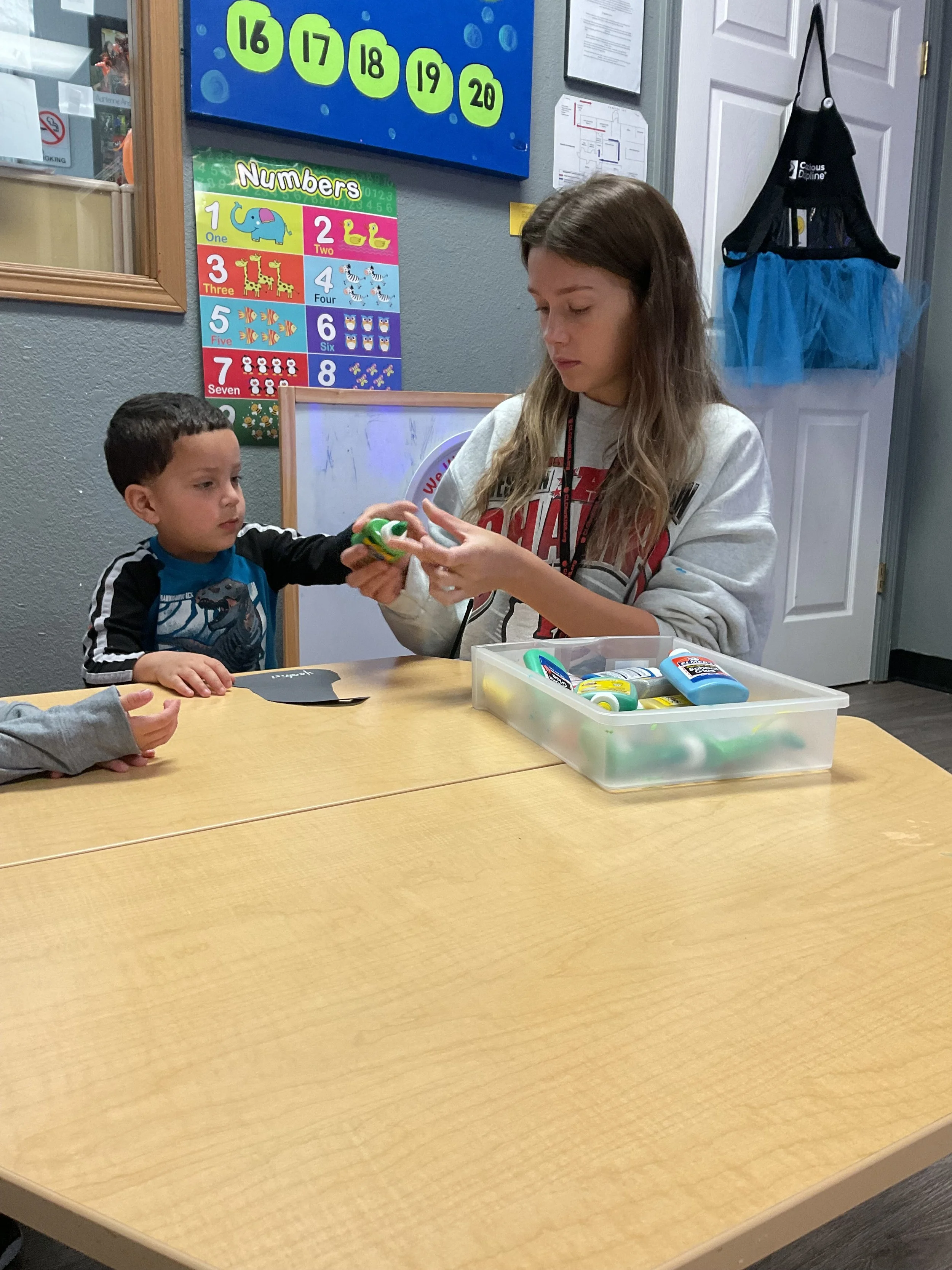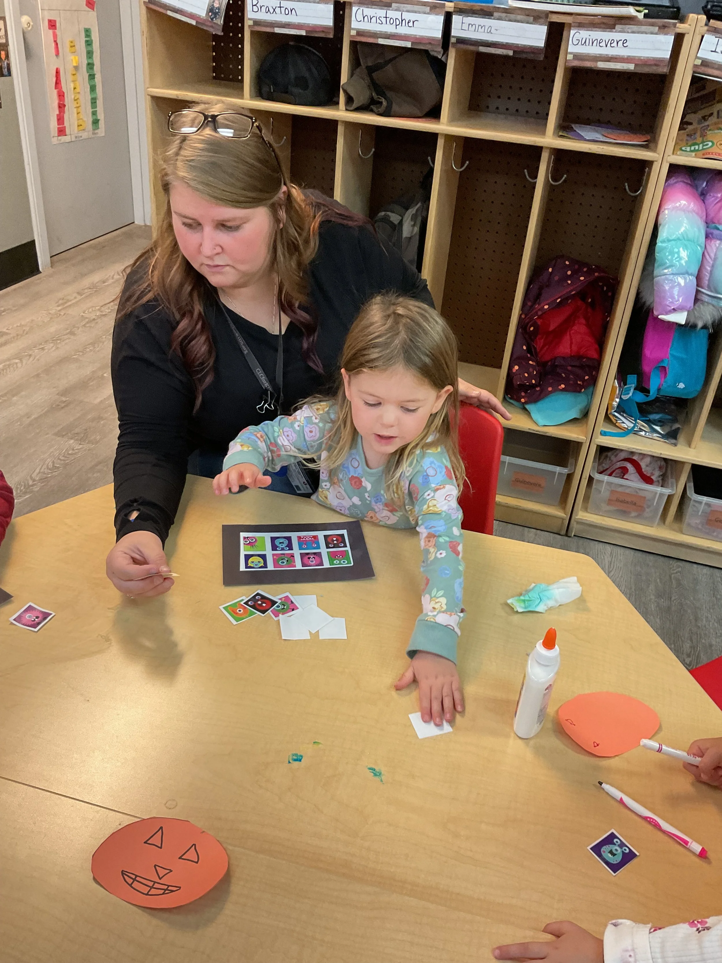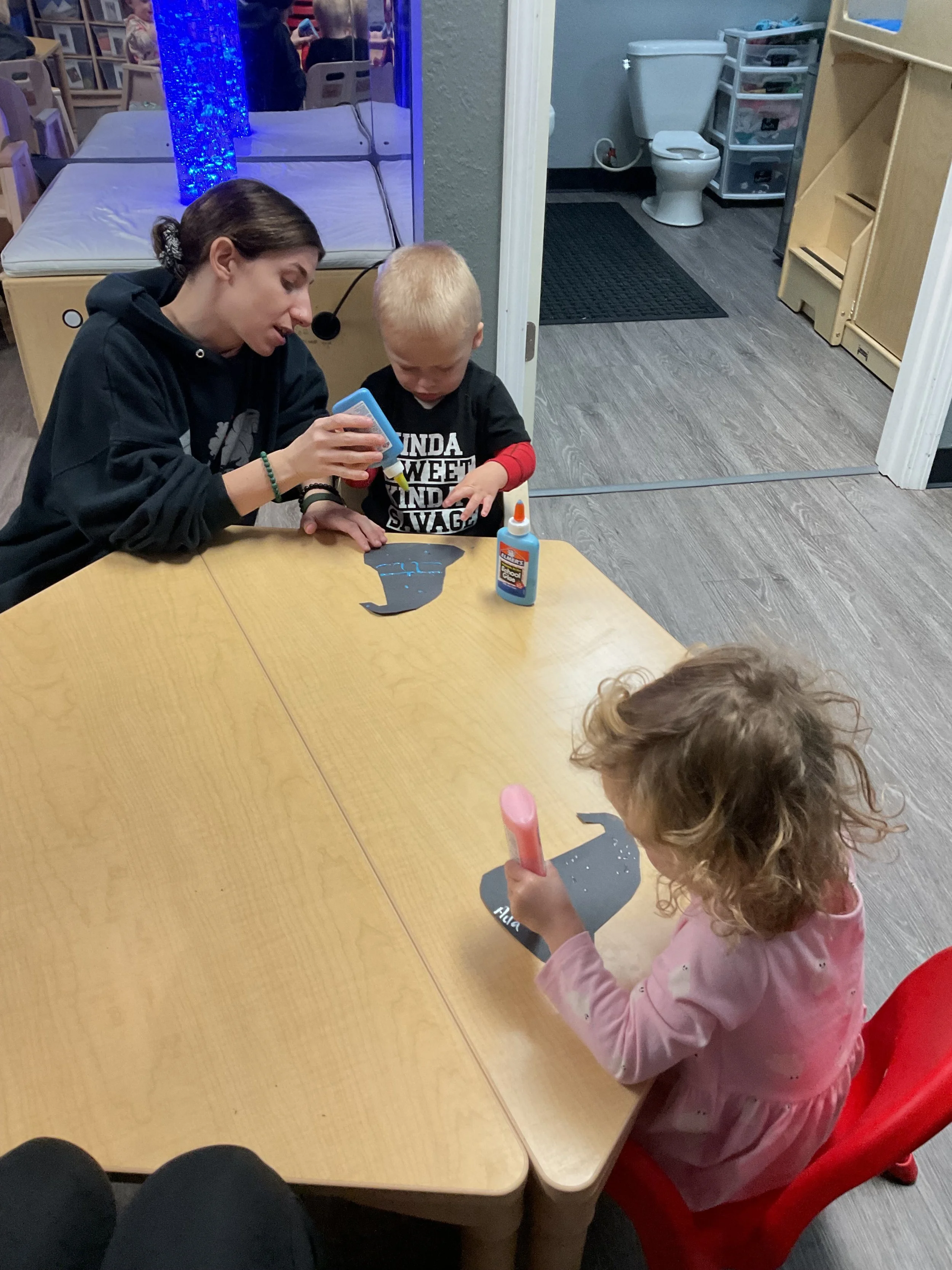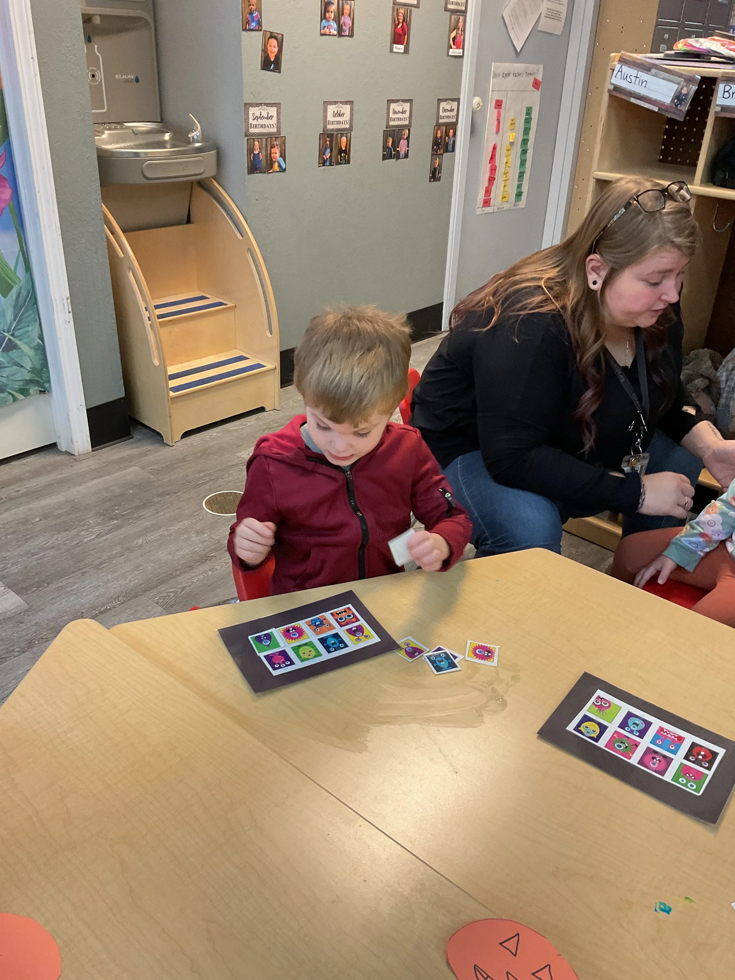 Happy Monday! This week we are learning all about Halloween. Today we read the book Monster Be Good! By Natalie Marshall. This book is about a child who is in charge of a little monster. It tells the child what to do if the monster is hungry, tired, grumpy, etc. For our math and cognition activity we matched together different monster cards. During science and sensory time we decorated a witches hat using colorful glue. Lastly, for our fine motor and literacy time we traced our name with glue and used glitter to decorate them.