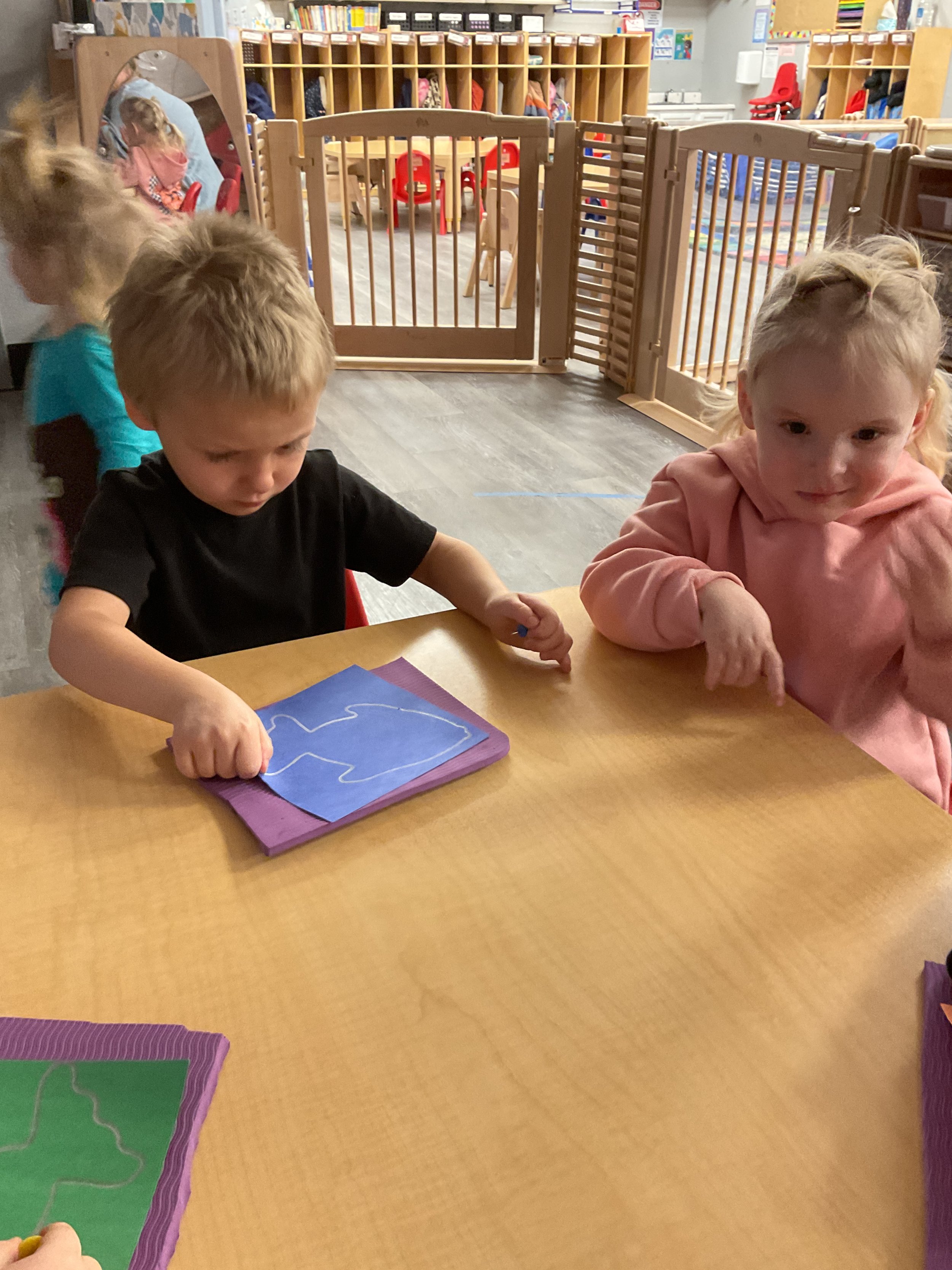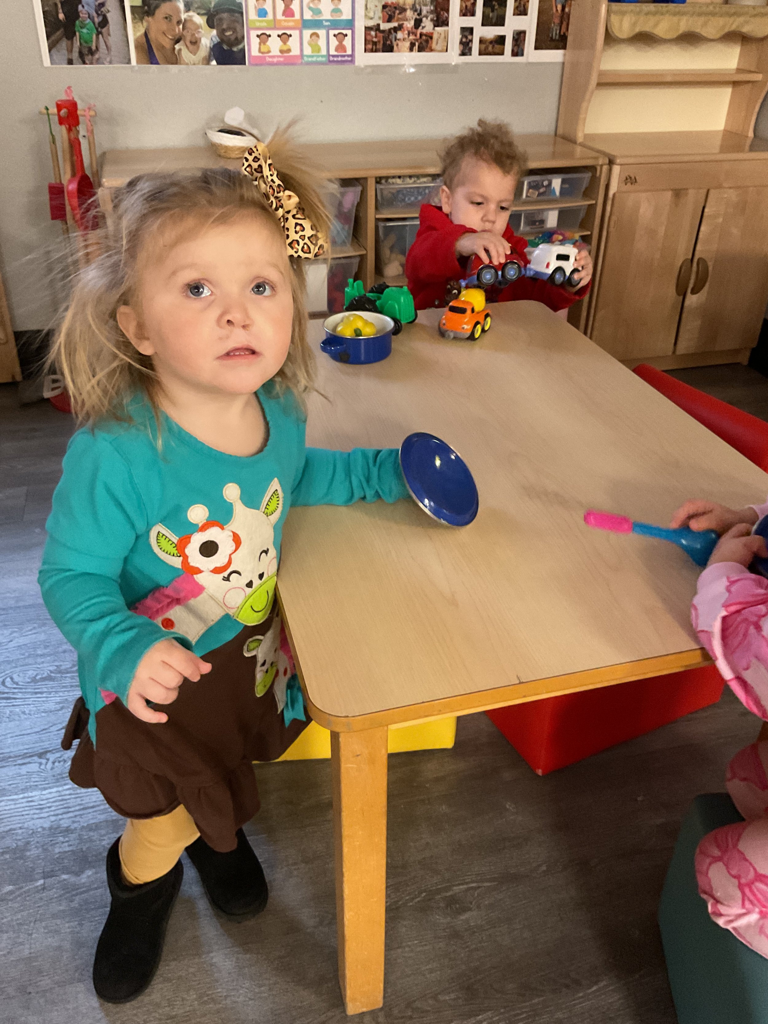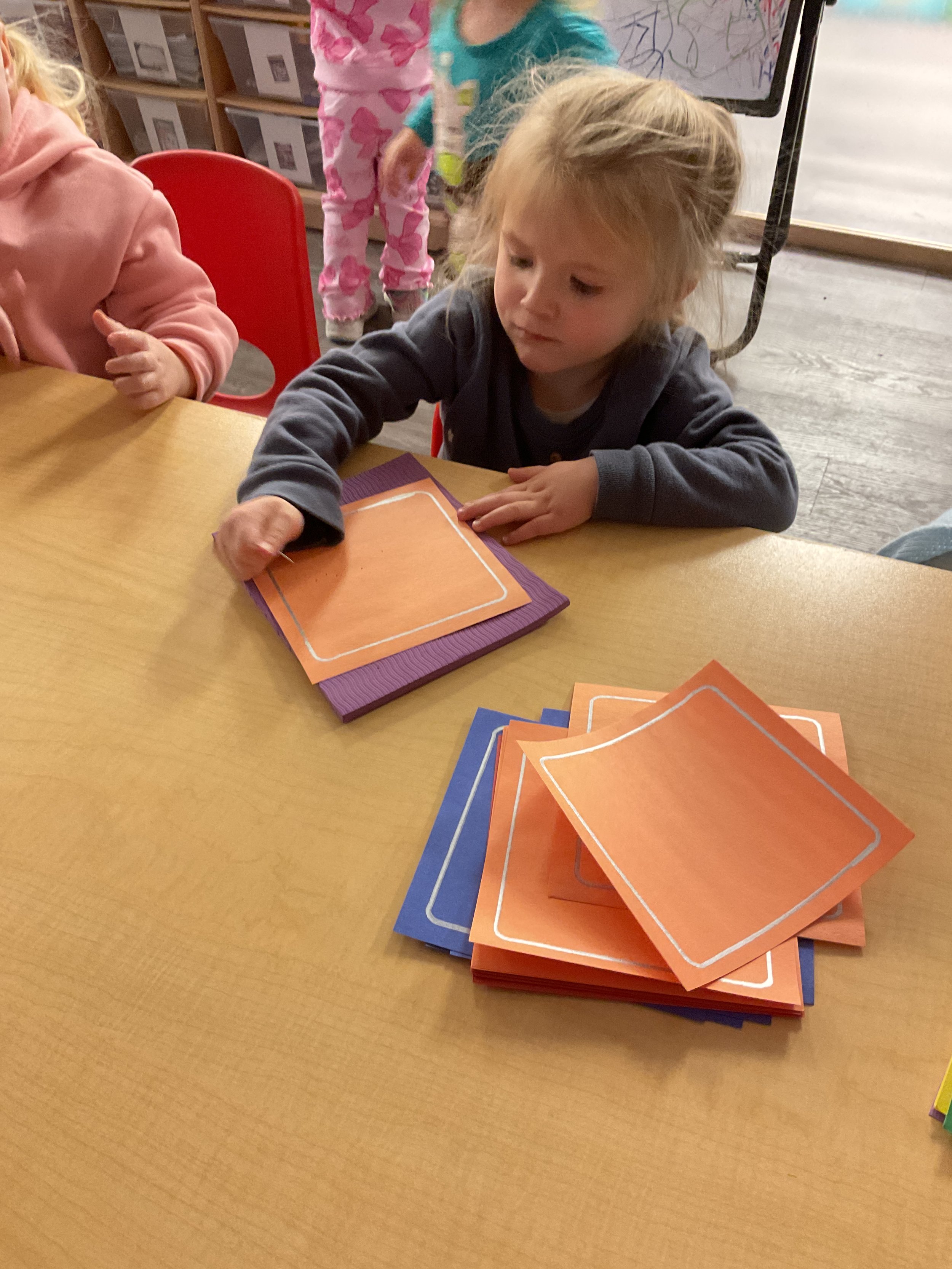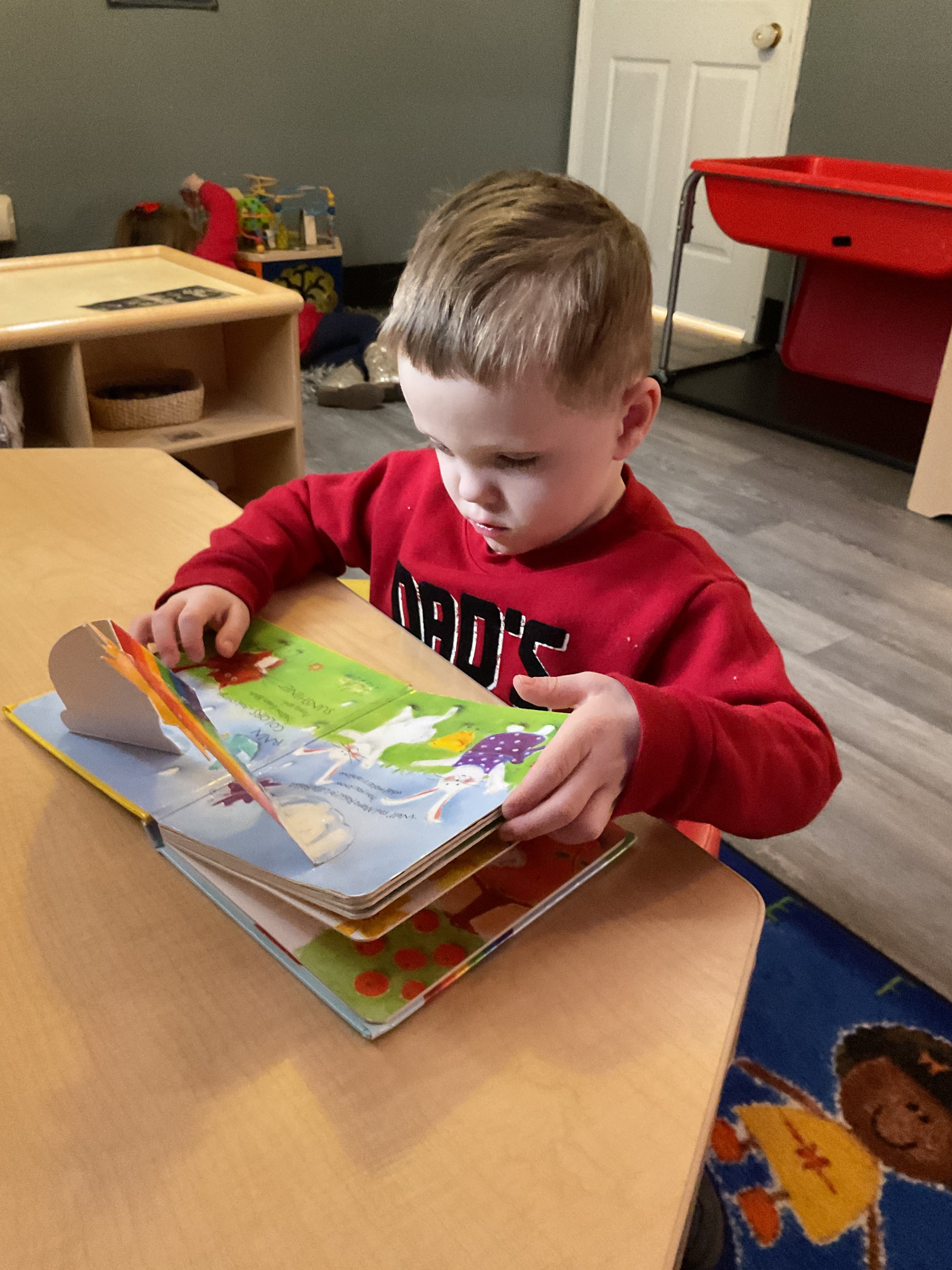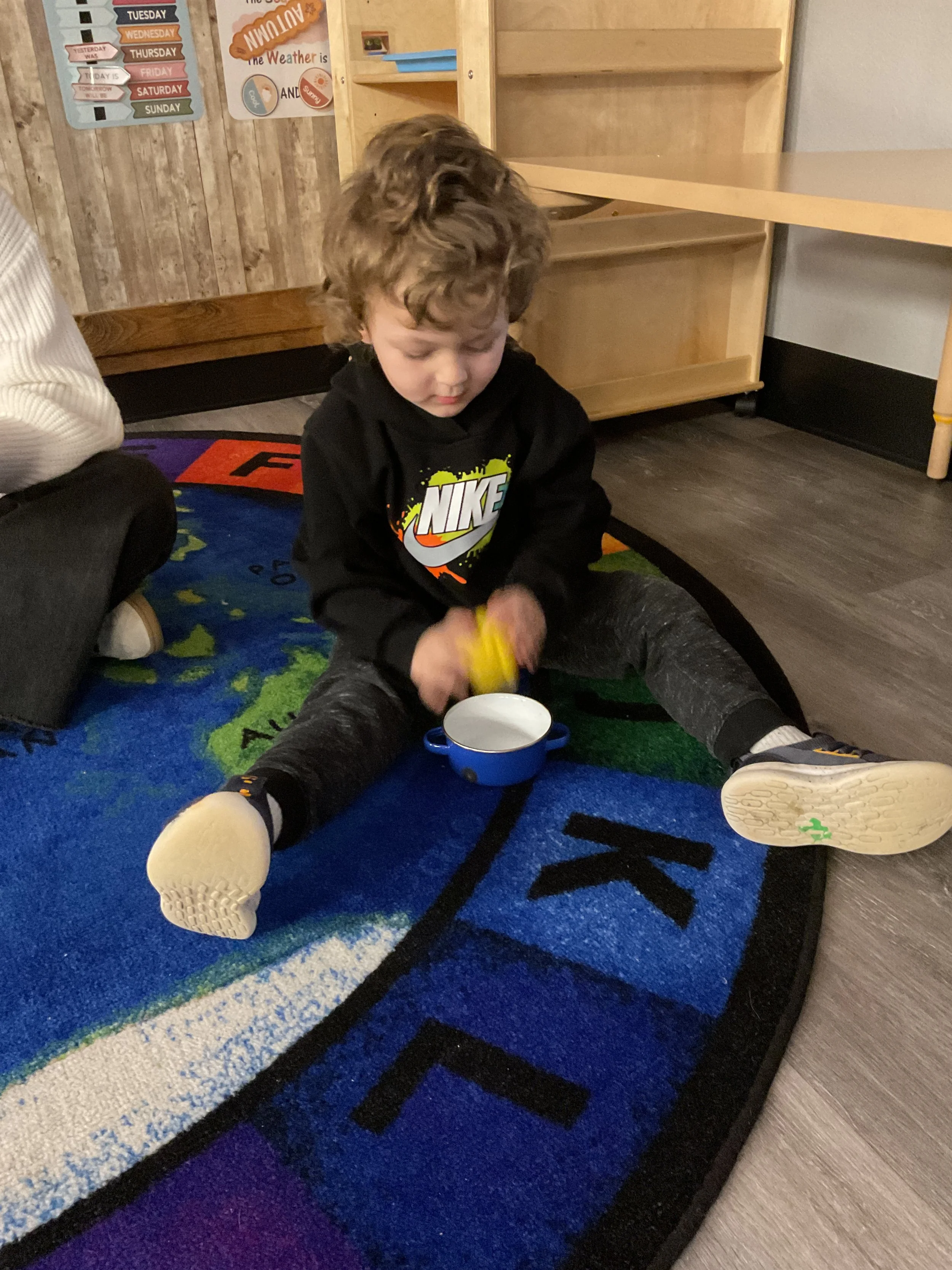 This morning, we read the book Chocolate Mud Cake written and illustrated by Maxine Lee. During our music and movement time, we started our day off with yoga. Then, during our math and cognition lesson, we sorted food by color. Next, for our science and sensory lesson, we filled our sensory bin with all kinds of play food. Finally, for our literacy and fine motor lesson, we worked on our 3 finger grips by doing a pin pushing.