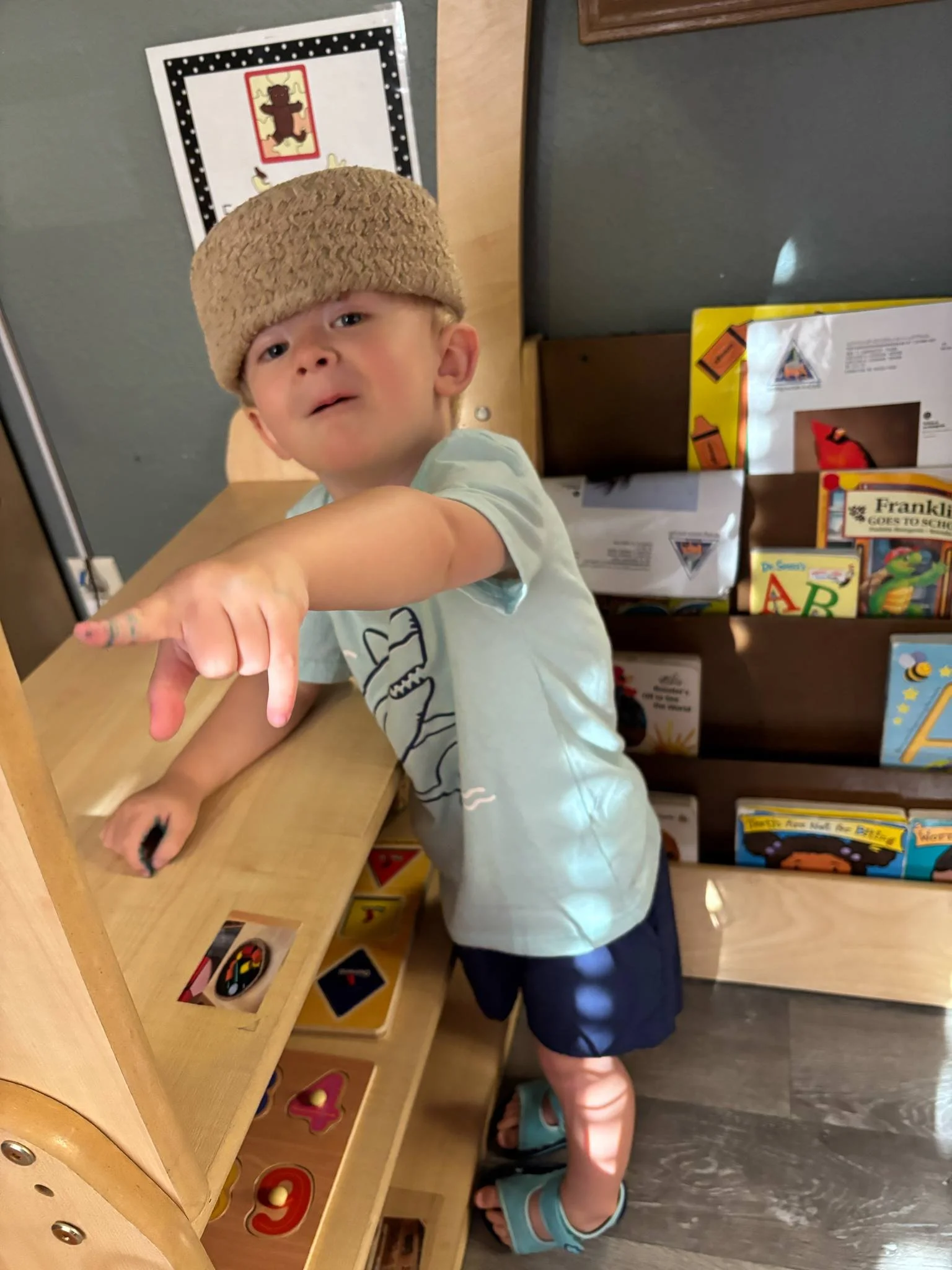 This morning, we read the book Opposites written by Sandra Boynton. During music and movement time, we sang songs and played “I spy.” During our math and cognition lesson, we worked on number recognition. For our science and sensory lesson, we talked about what opposites are and we drew pictures of different kinds of opposites. Finally, during our fine motor and literacy lesson, we listened to a book on tape.