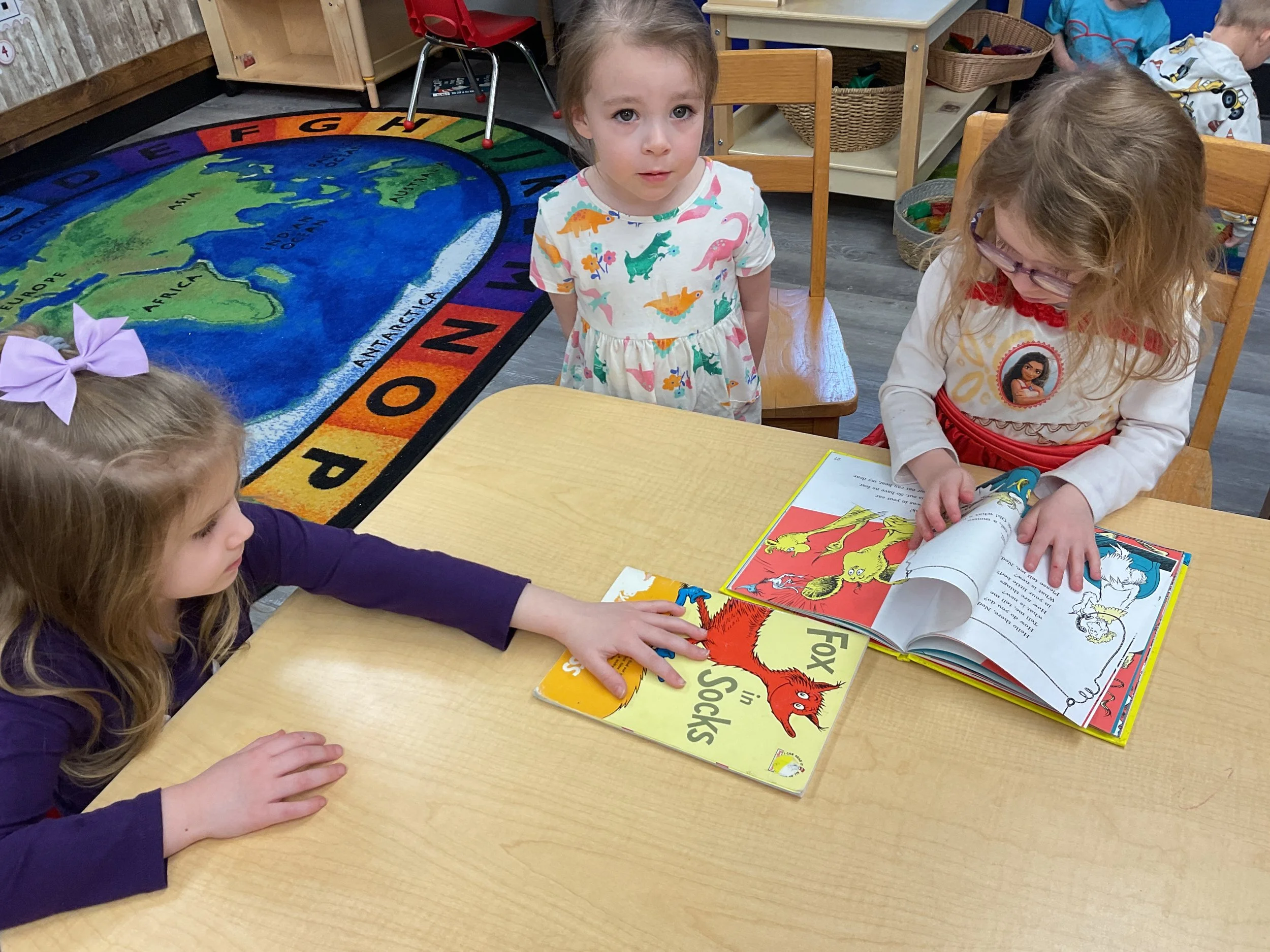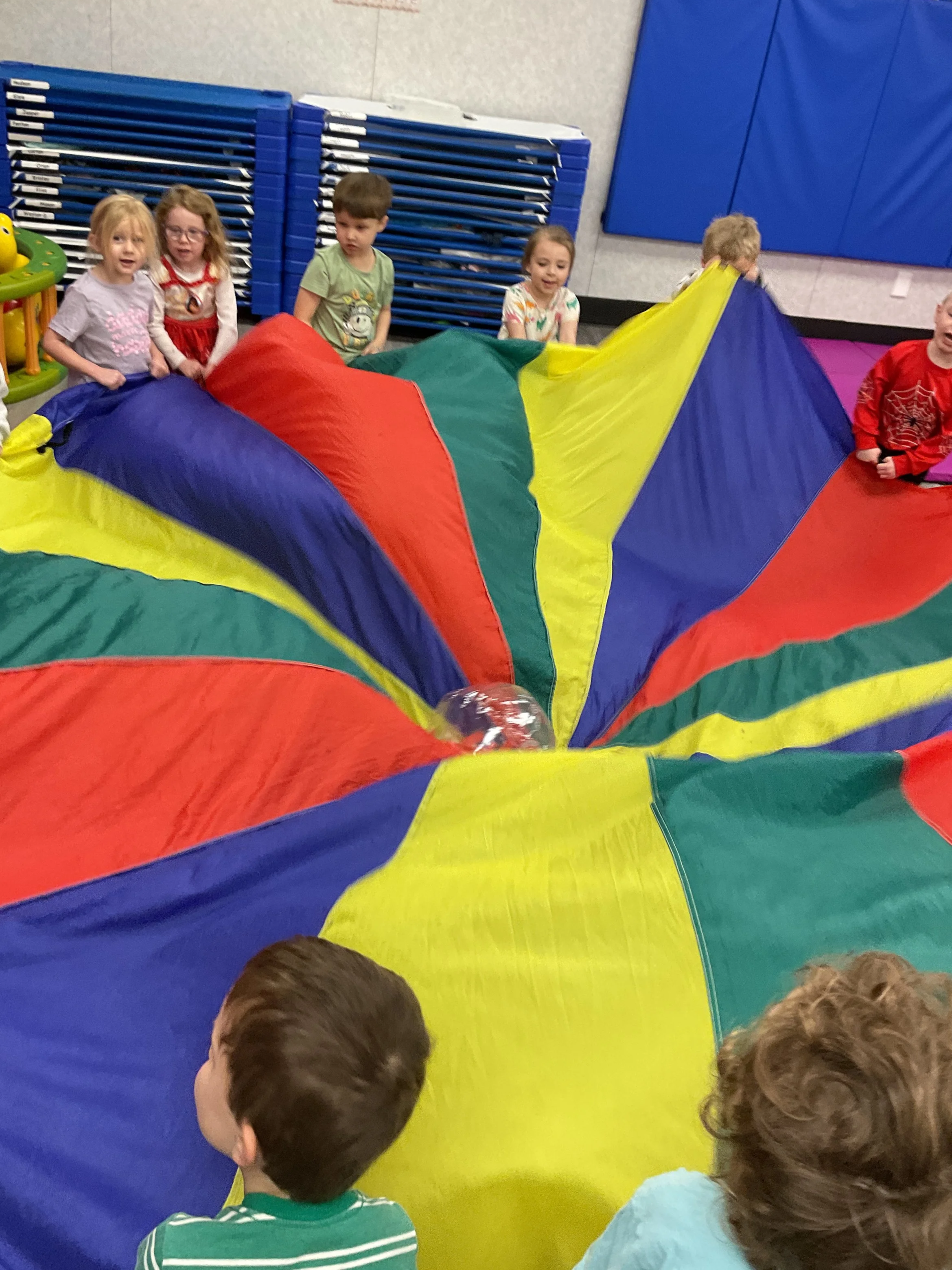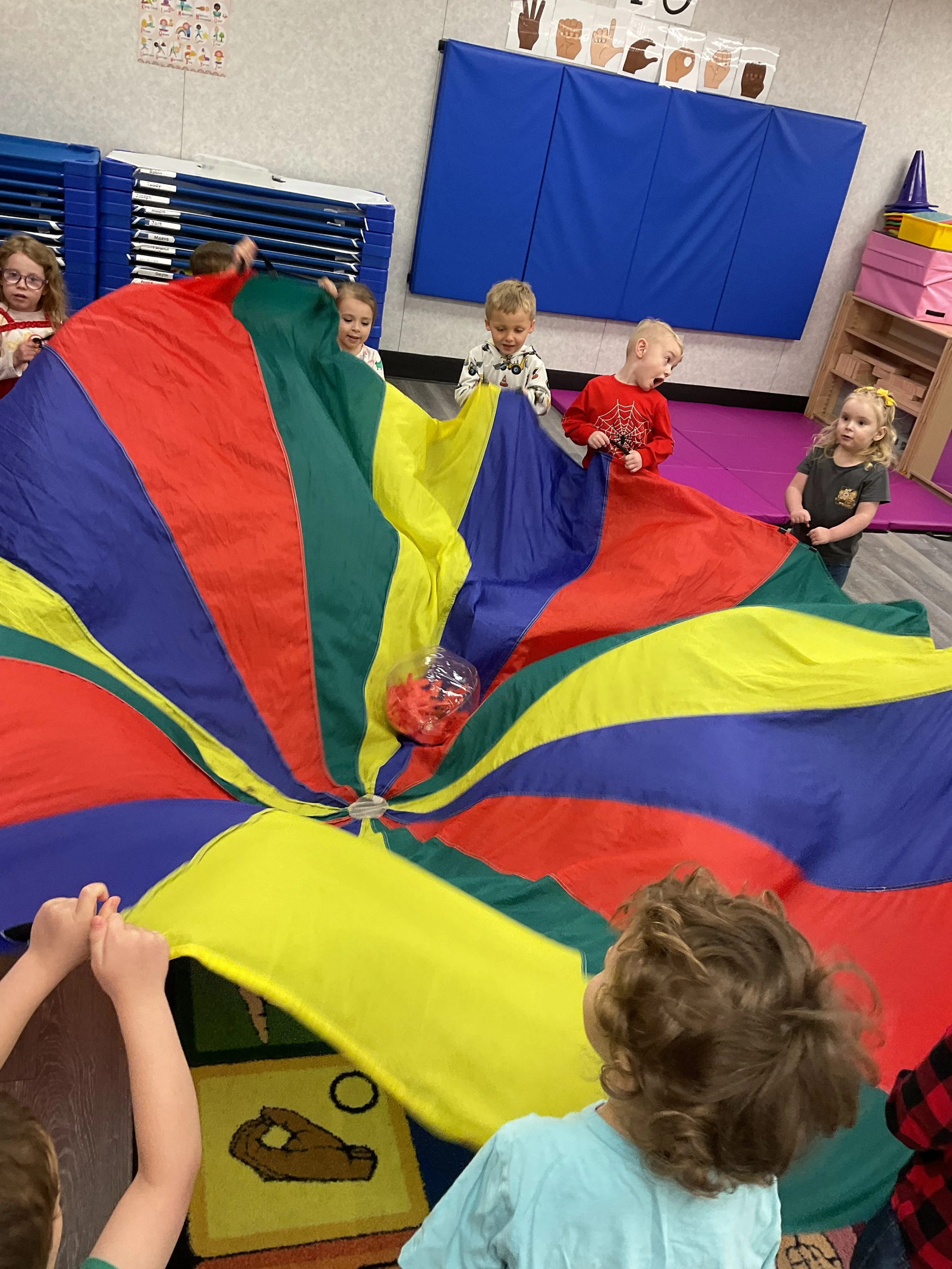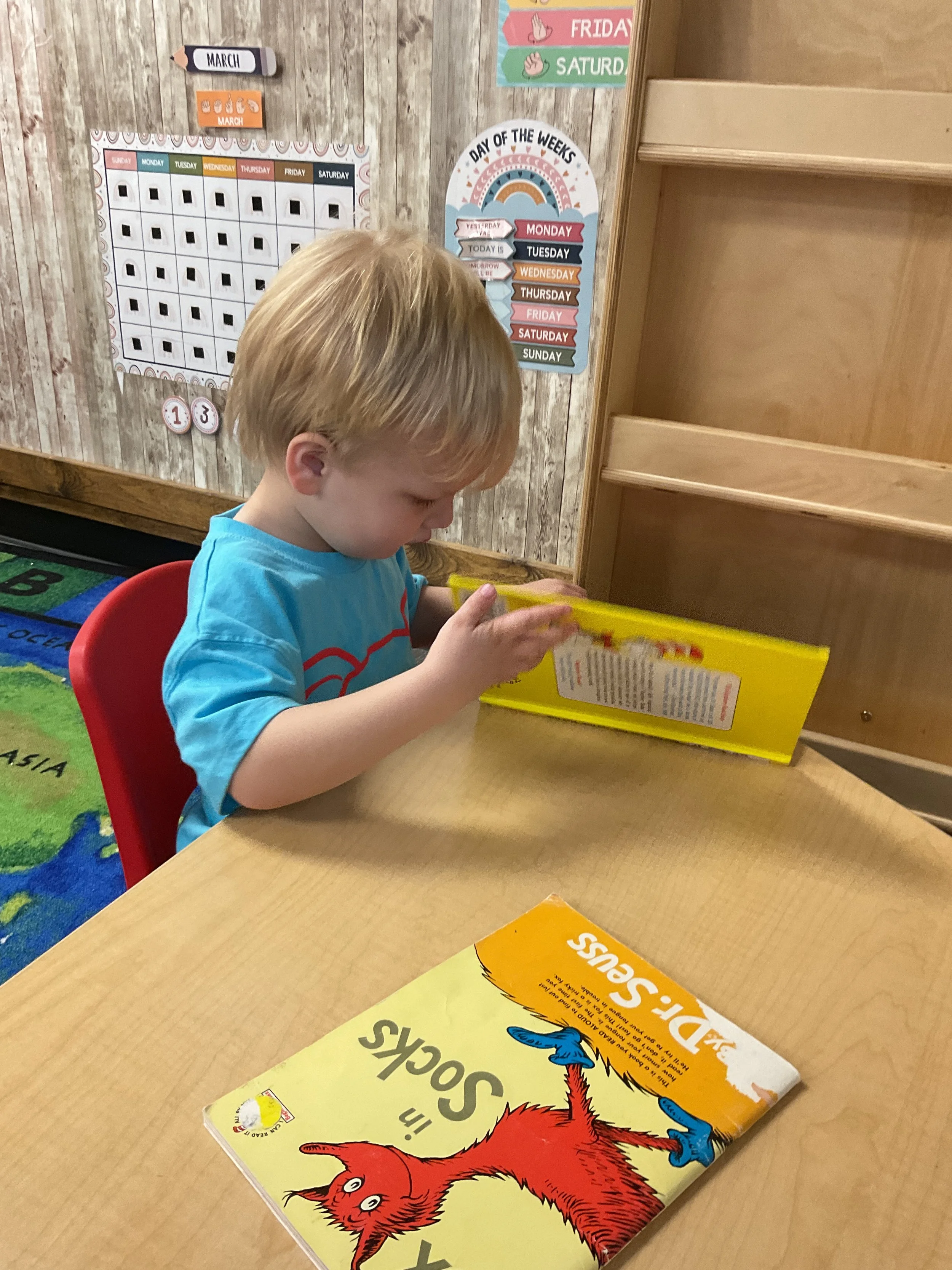 This morning, we read the book Green Eggs and Ham written by Dr. Seuss. During our music and movement time, we used the parachute! Then, during our math and cognition lesson, we counted dots on red and blue fish and found the corresponding number. Next, for our science and sensory lesson, we talked about trying new foods. Finally, for our literacy and fine motor lesson, we wrote a book!