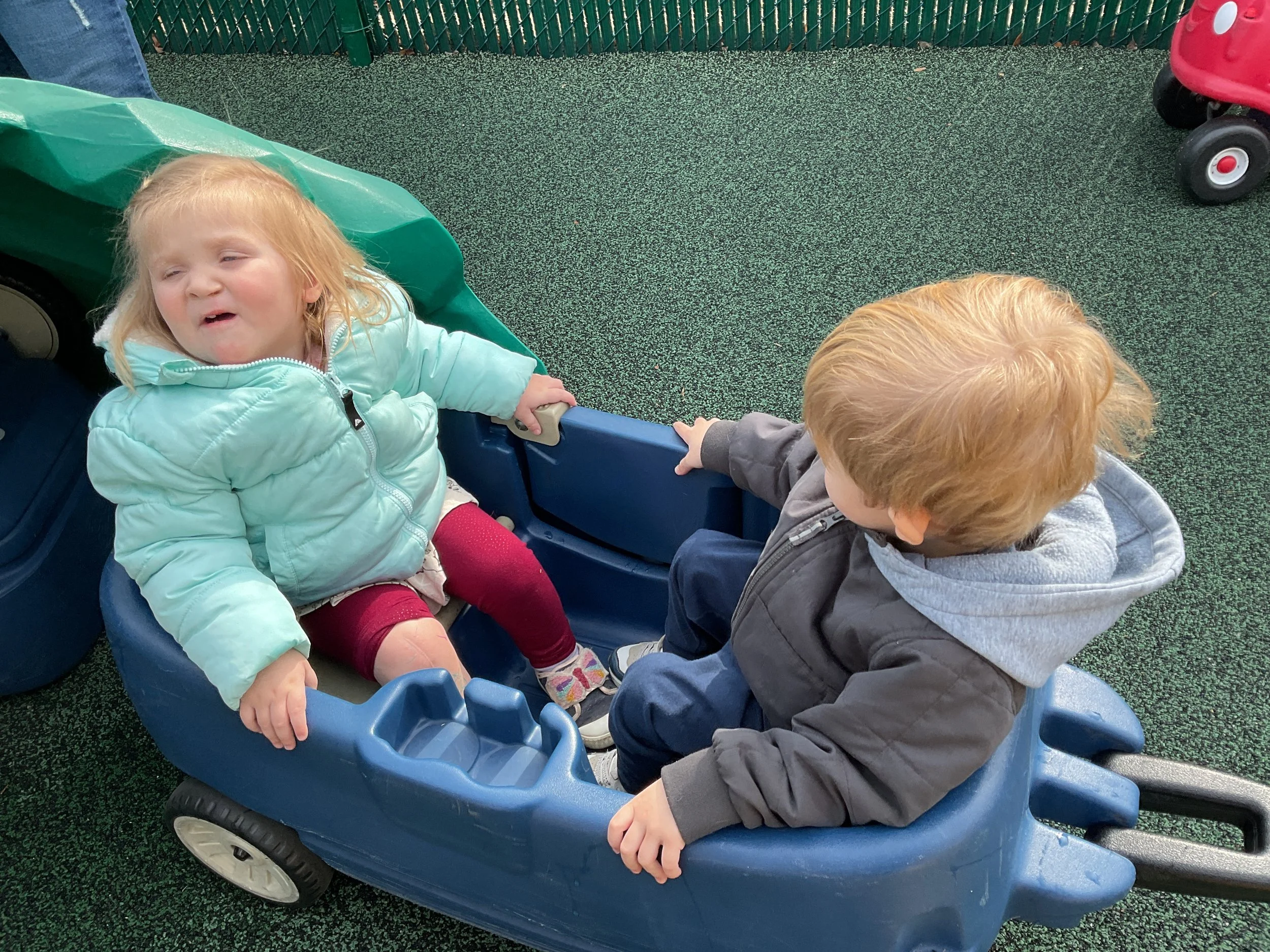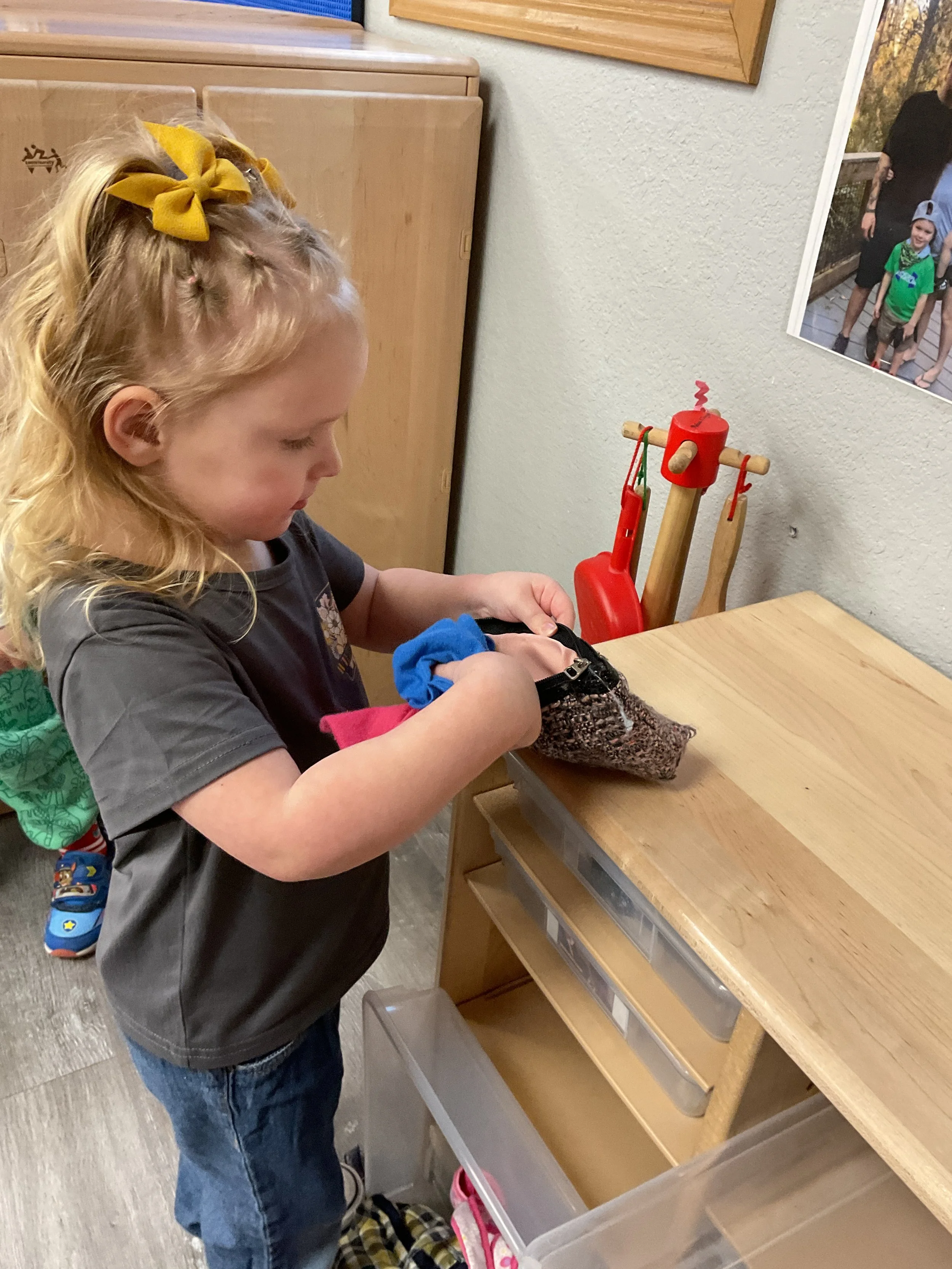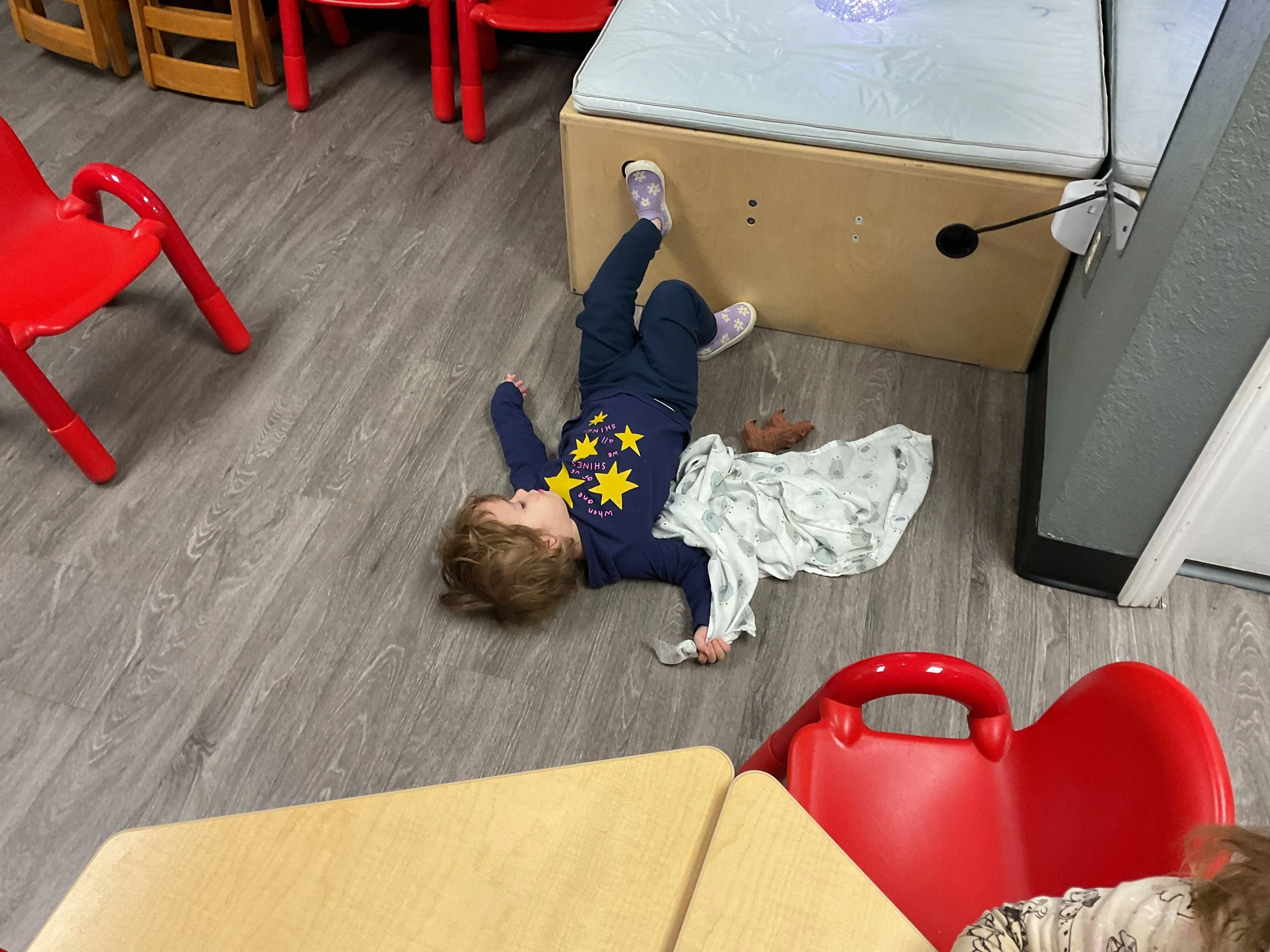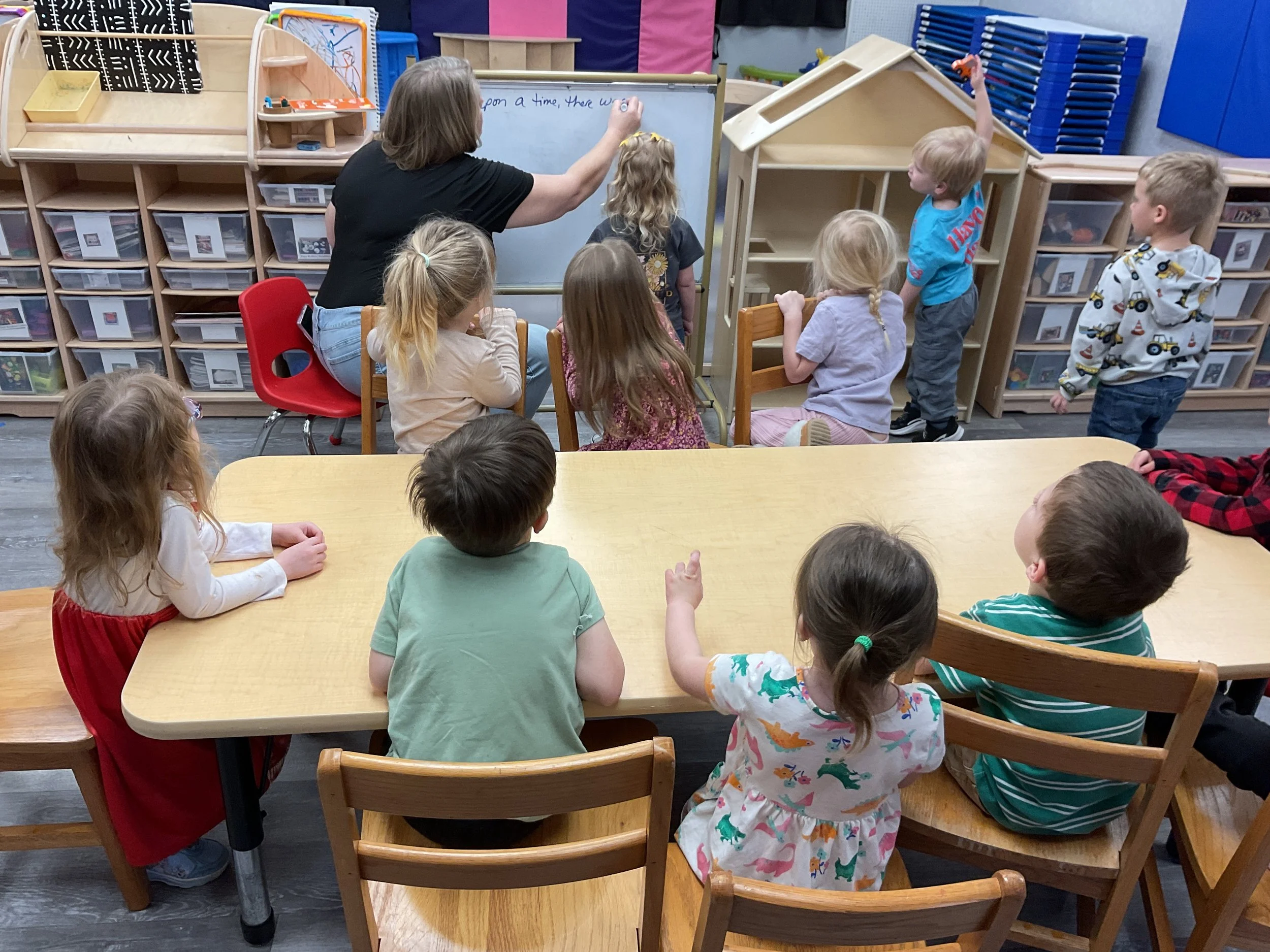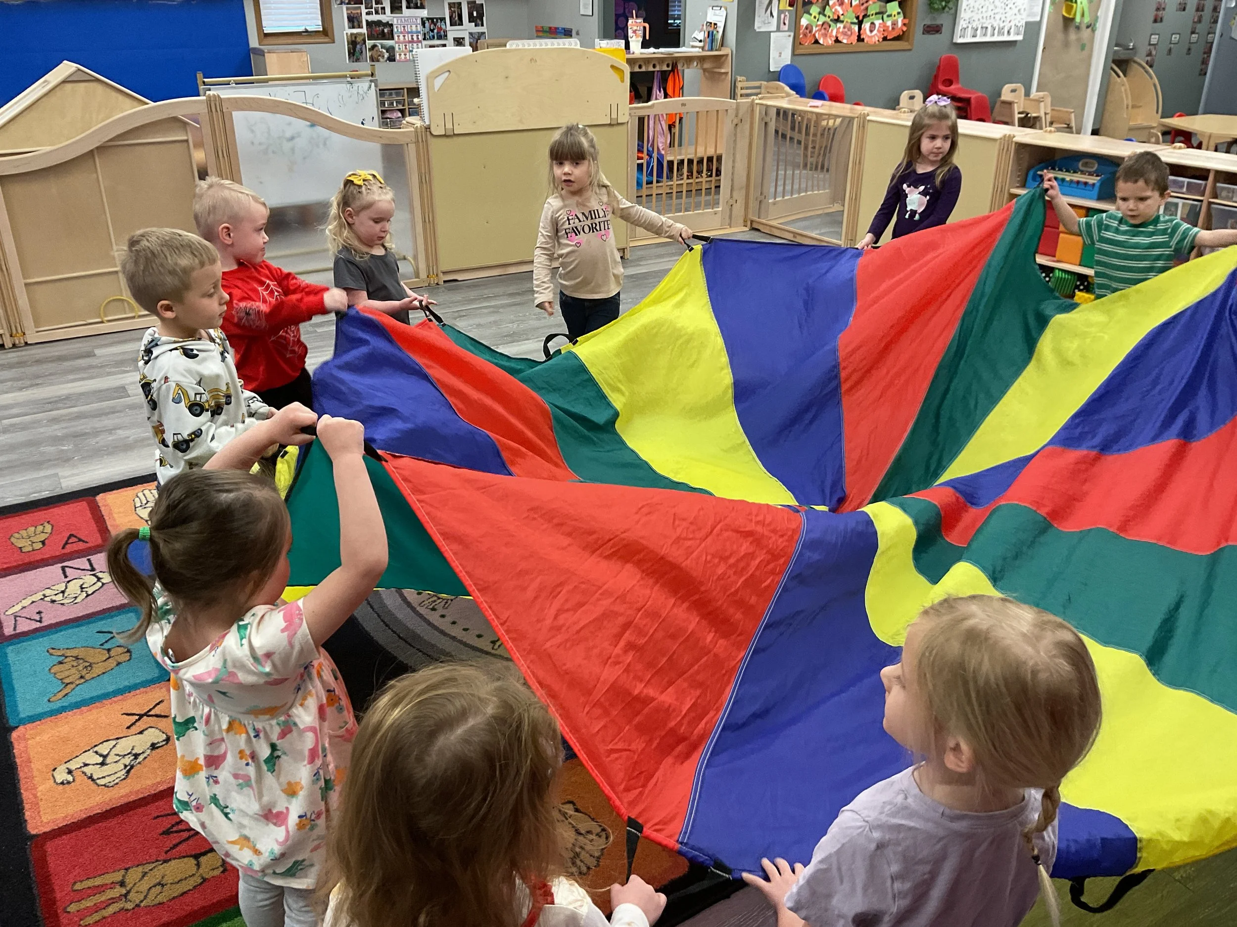 This morning, we read the book Green Eggs and Ham written by Dr. Seuss. During our music and movement time, we used the parachute! Then, during our math and cognition lesson, we counted dots on red and blue fish and found the corresponding number. Next, for our science and sensory lesson, we talked about trying new foods. Finally, for our literacy and fine motor lesson, we wrote a book!