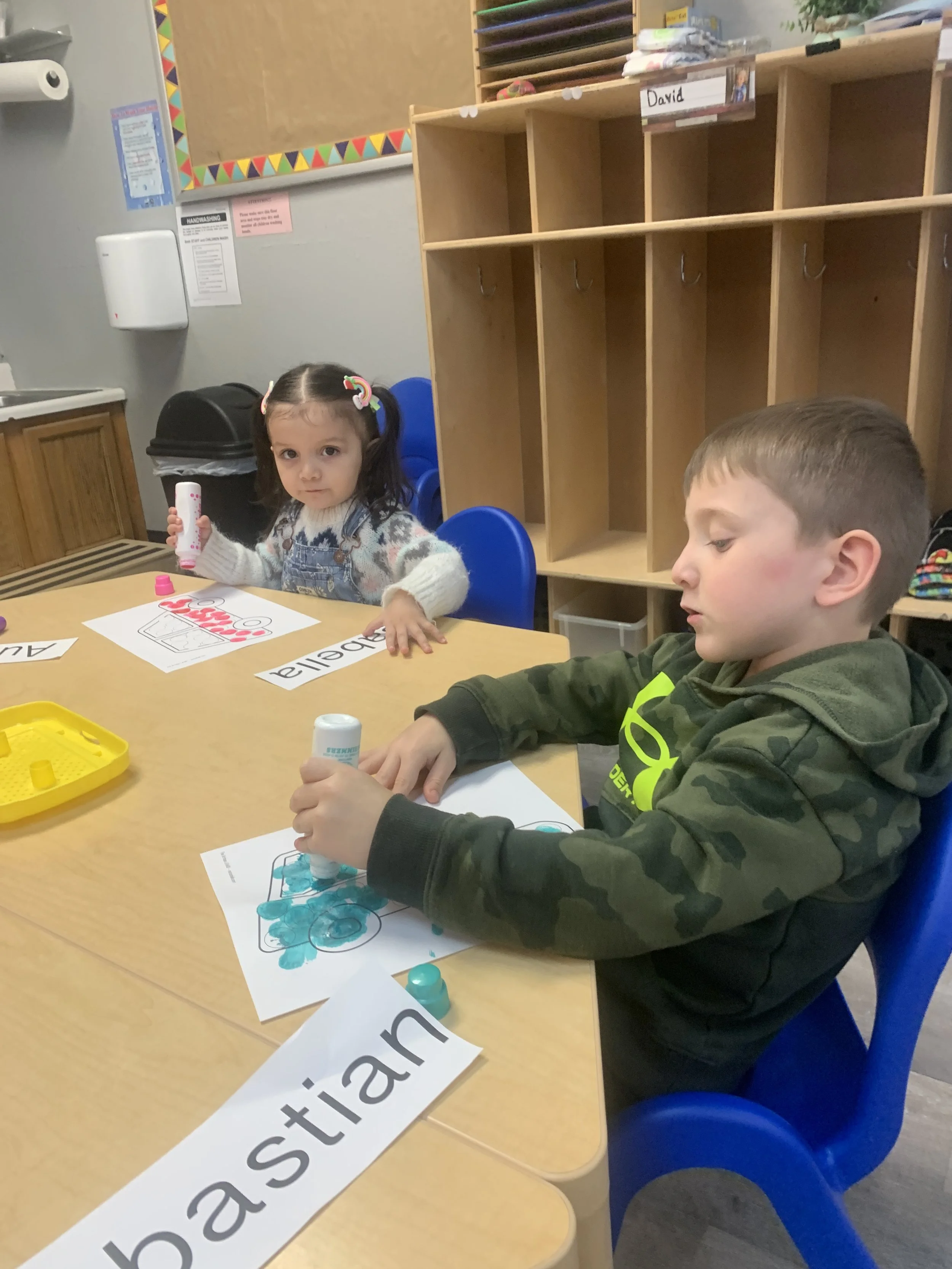 Today we read the book Stanley the builder by William Bee. In this book Stanley’s friend asks him to build her a new house. Stanley worked hard to build his friend a new house. We talked about how friends help friends. During our math and cognition activity we counted construction trucks on our counting cards. During our science and sensory activity we used bingo dotters to make different construction trucks. During our fine motor and literacy activity we listened to a book on tape.