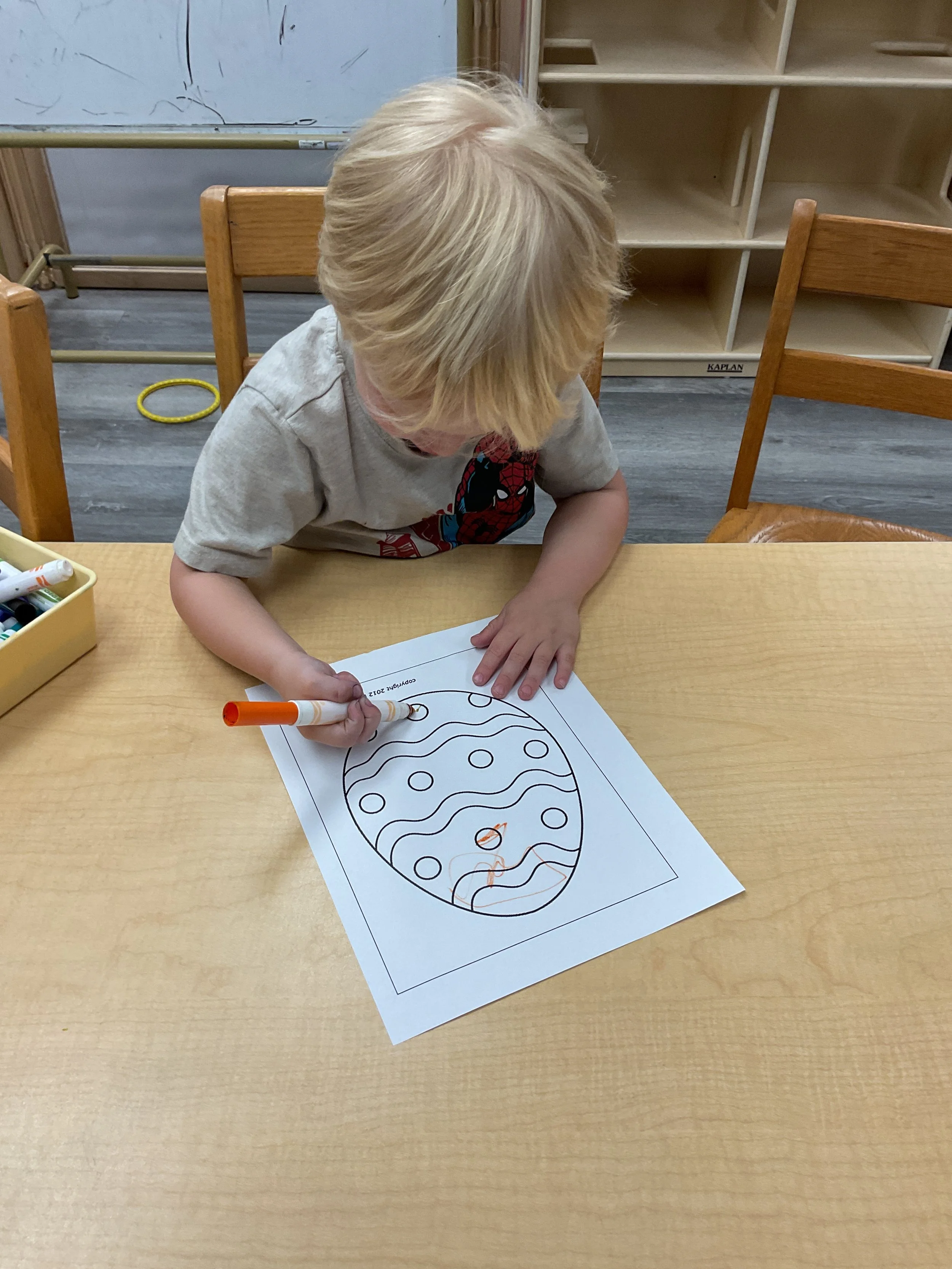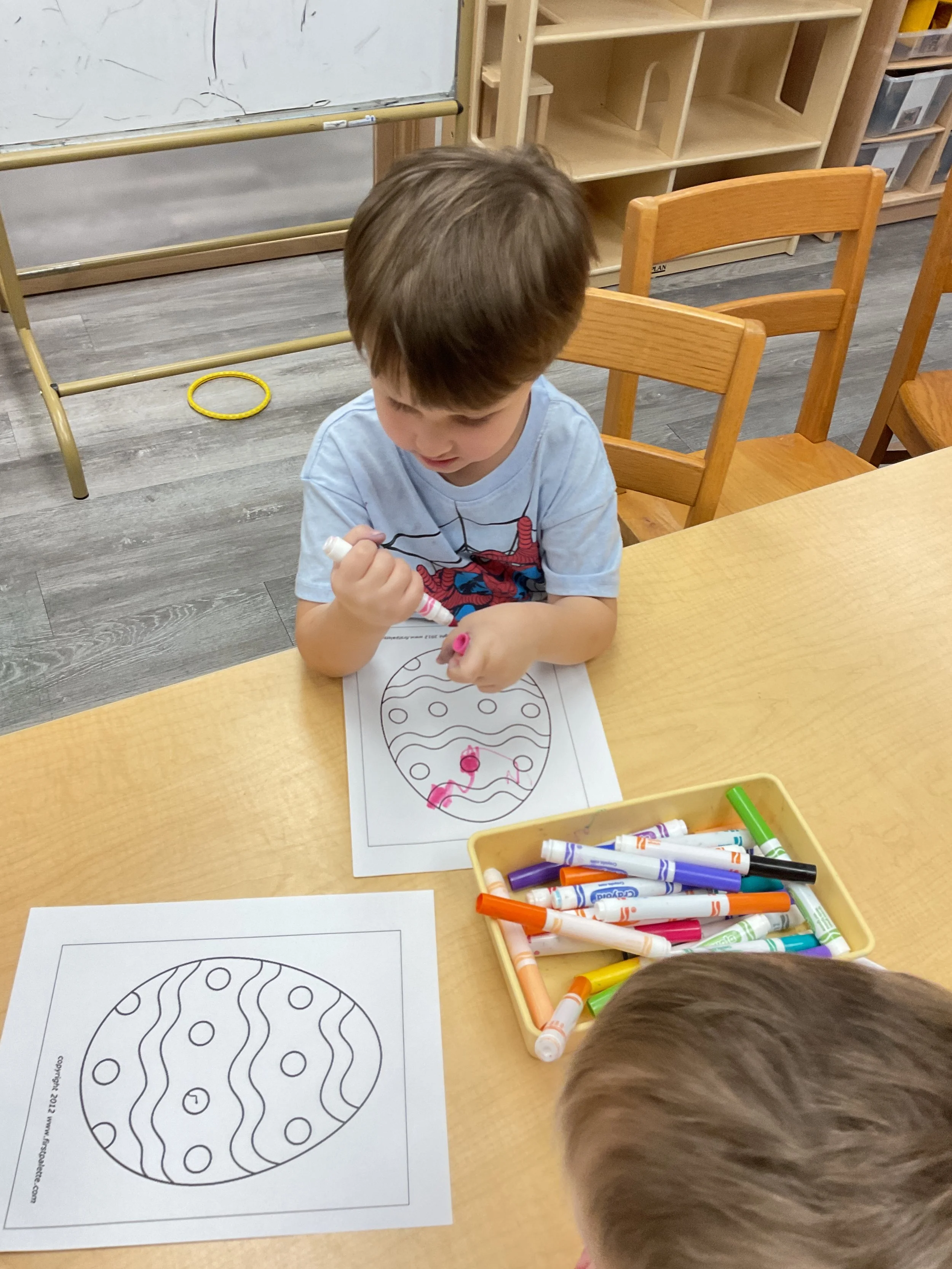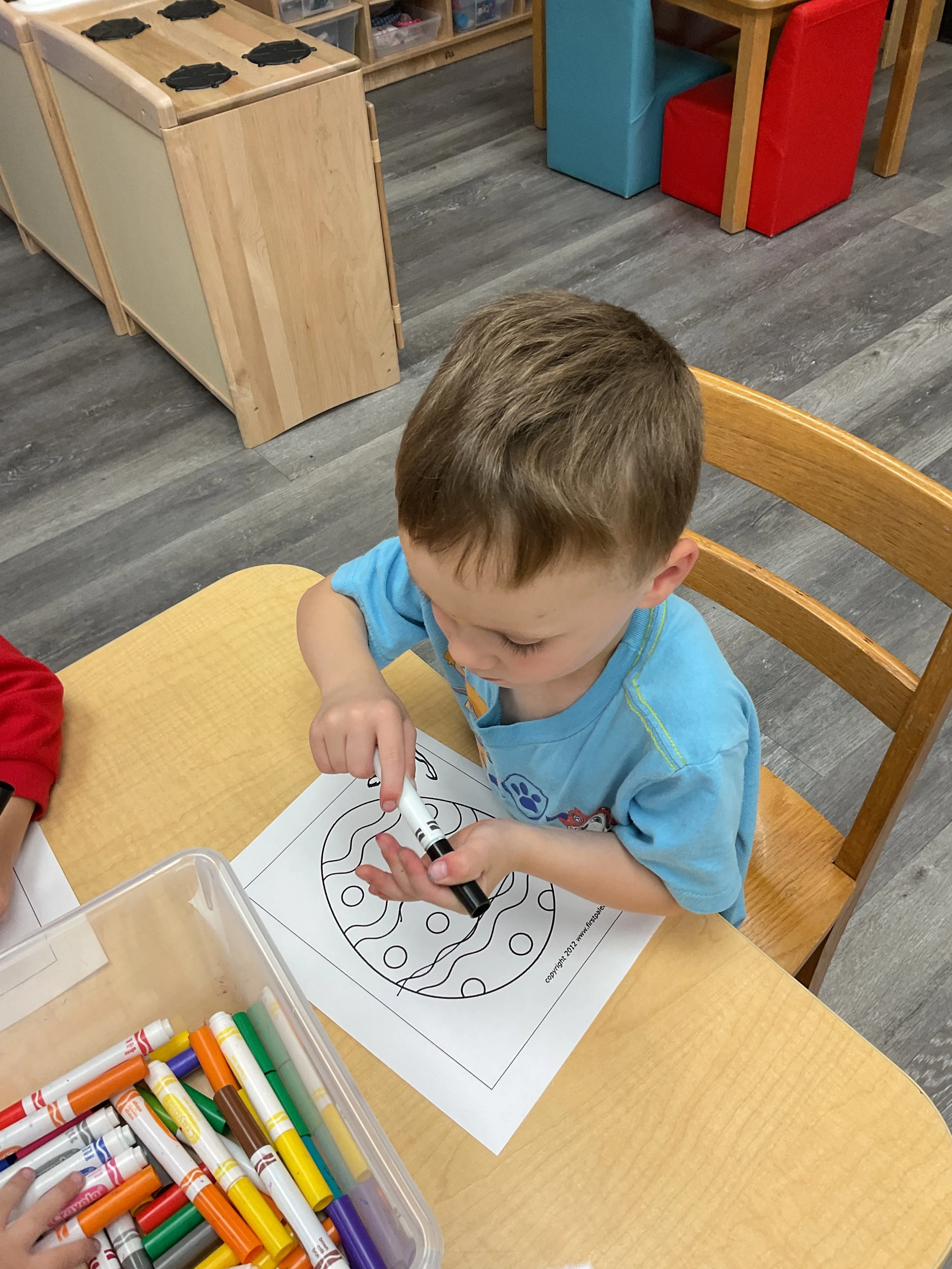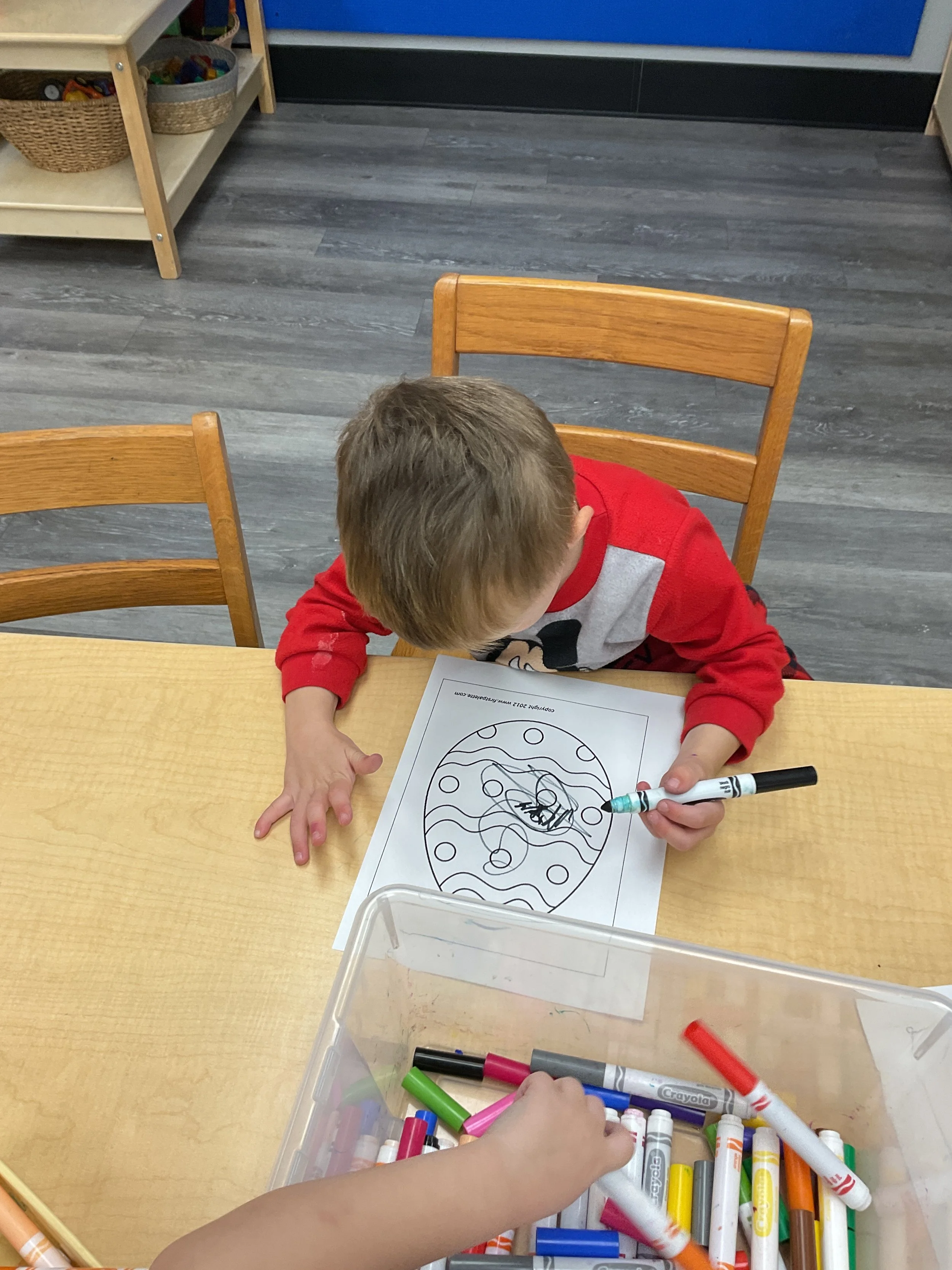 This morning, we read the book There Was an Old Women Who Swallowed a Chick written by Lucille Colandro and illustrated by Jared Lee. During our music and movement time, we used blocks of all shapes and sizes to build an Easter City. Then, during our math and cognition lesson, we matched Easter eggs by color. Next, for our science and sensory lesson, we used foil and markers to dye Easter eggs! We did this by coloring on the foil with washable markers, sprayed a bit of water on the foil, then we wrapped an egg in the foil as tightly as we could, then we unwrapped the egg, and we had beautifully dyed eggs. Finally, for our literacy and fine motor lesson, we colored an Easter egg coloring page.