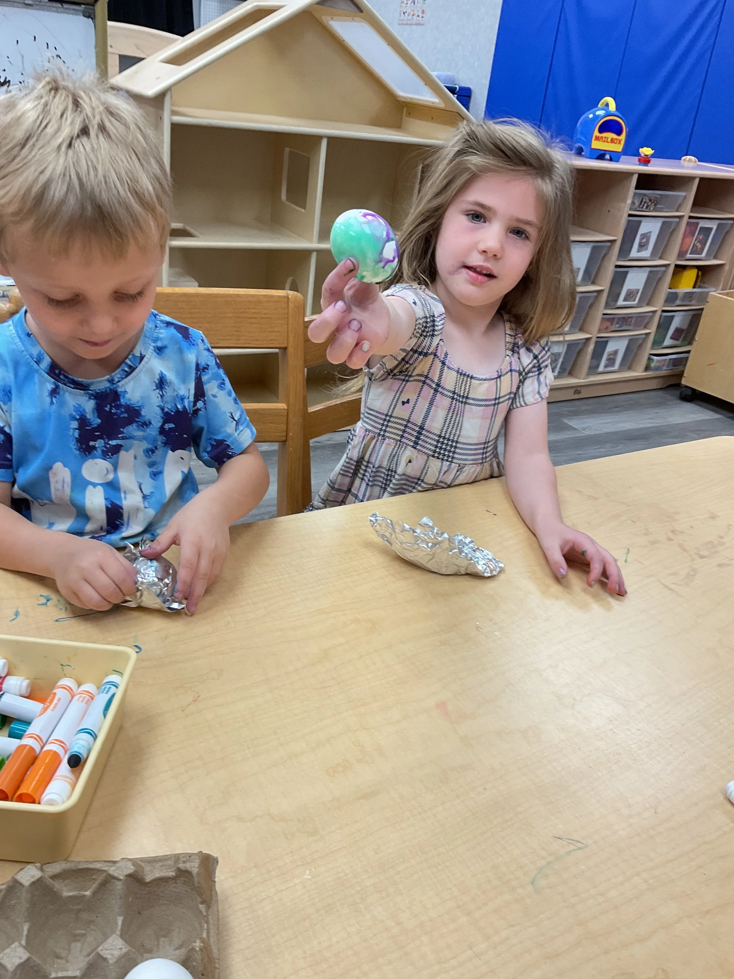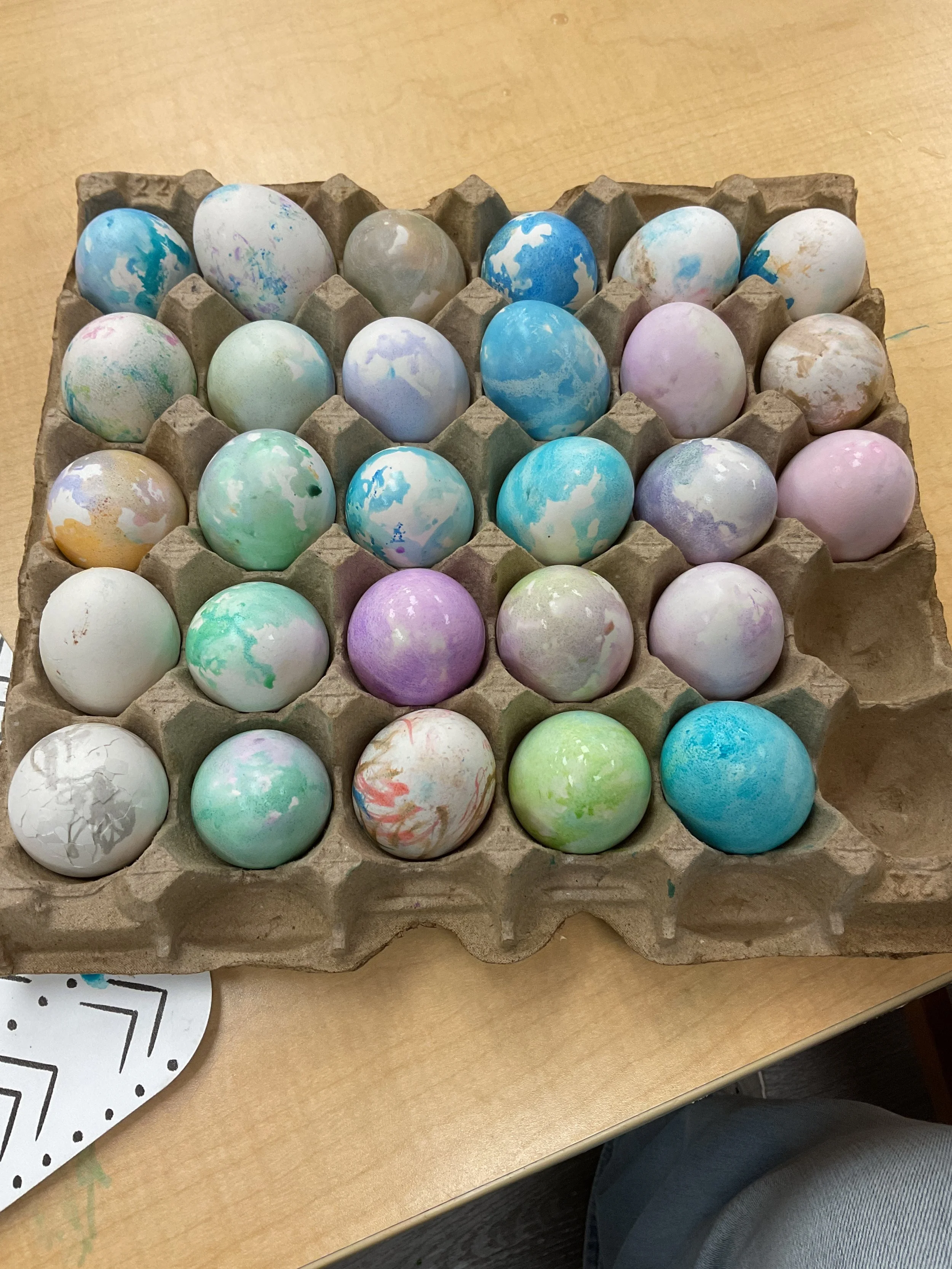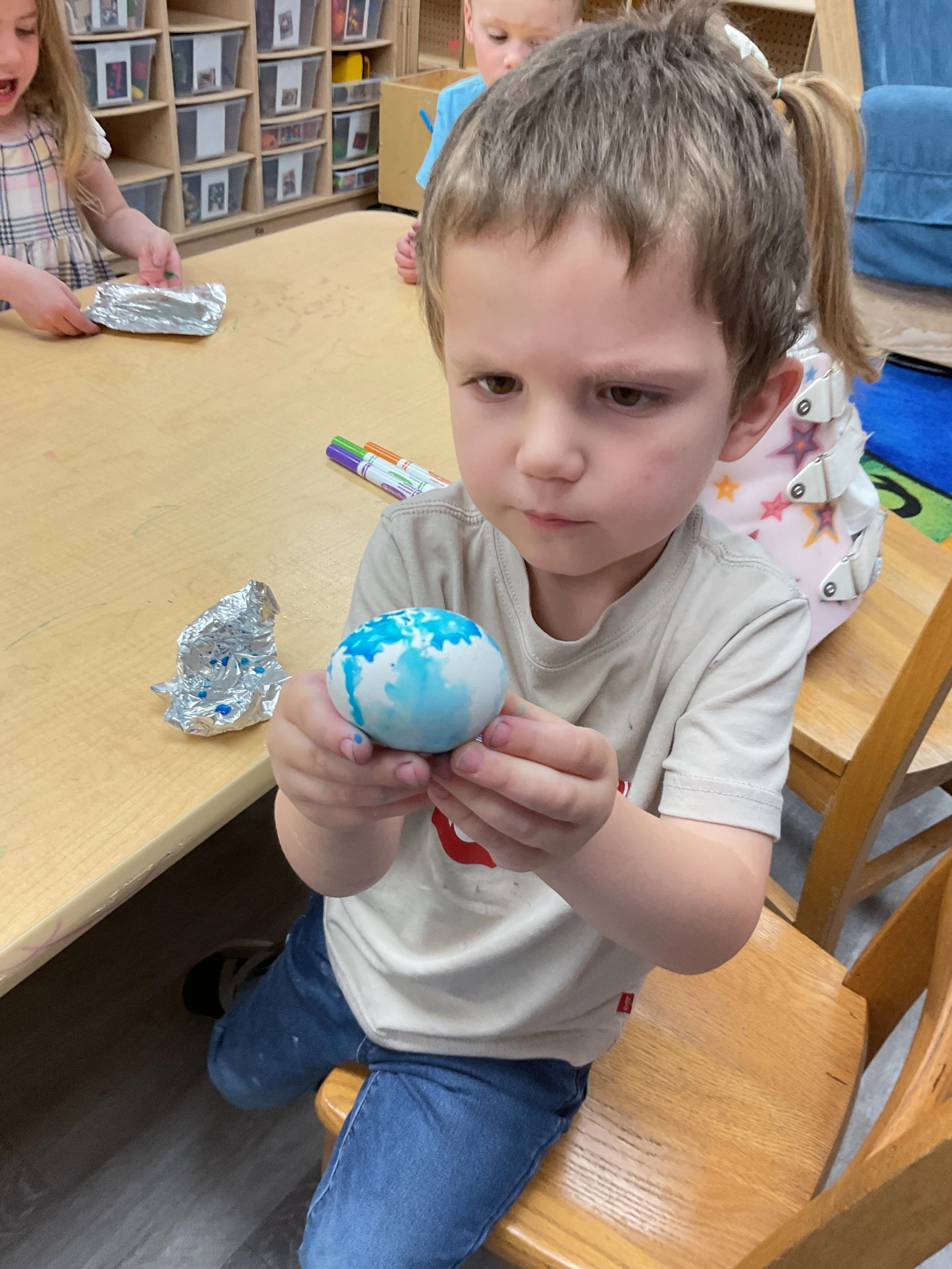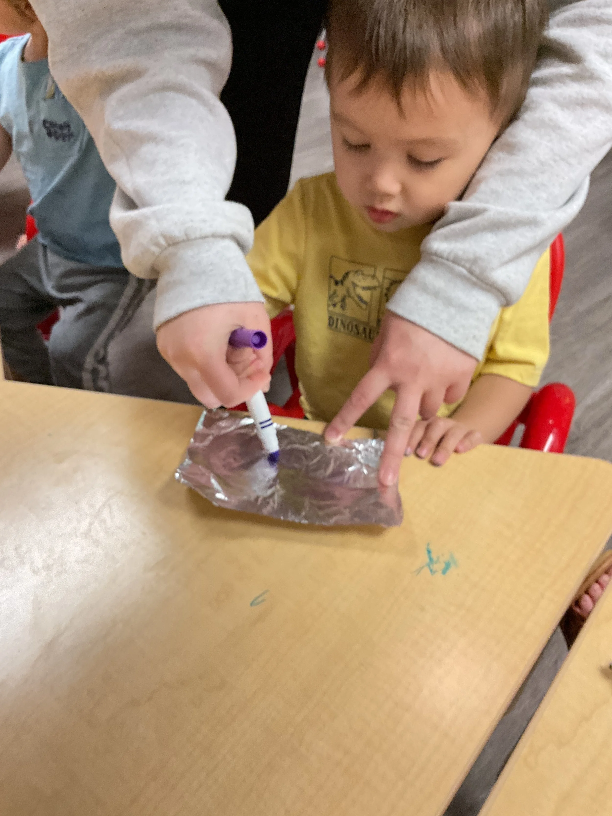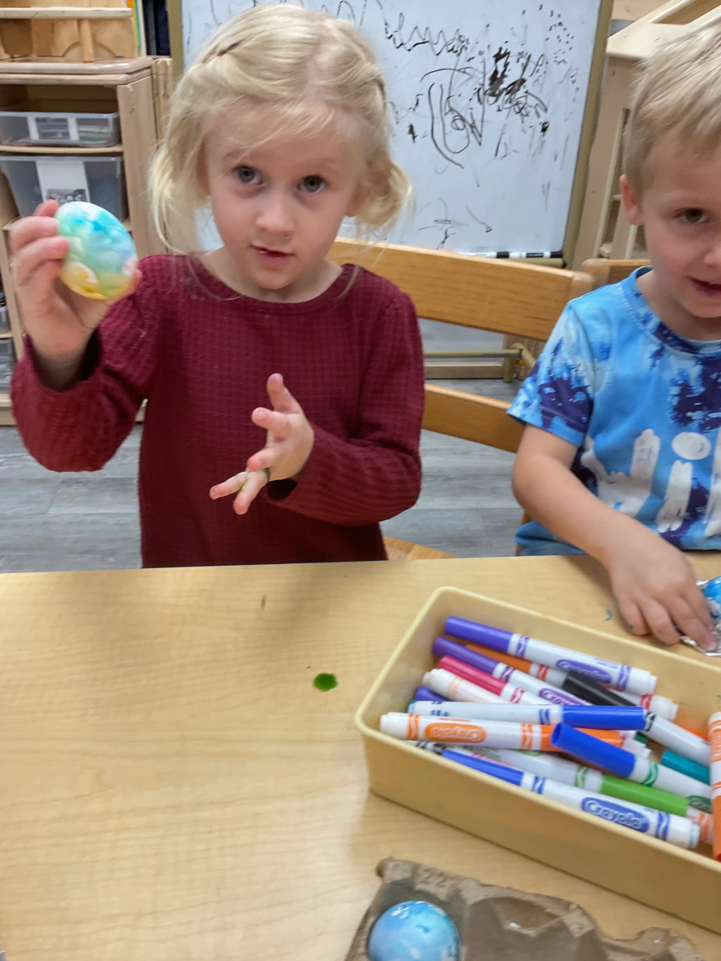 This morning, we read the book There Was an Old Women Who Swallowed a Chick written by Lucille Colandro and illustrated by Jared Lee. During our music and movement time, we used blocks of all shapes and sizes to build an Easter City. Then, during our math and cognition lesson, we matched Easter eggs by color. Next, for our science and sensory lesson, we used foil and markers to dye Easter eggs! We did this by coloring on the foil with washable markers, sprayed a bit of water on the foil, then we wrapped an egg in the foil as tightly as we could, then we unwrapped the egg, and we had beautifully dyed eggs. Finally, for our literacy and fine motor lesson, we colored an Easter egg coloring page.