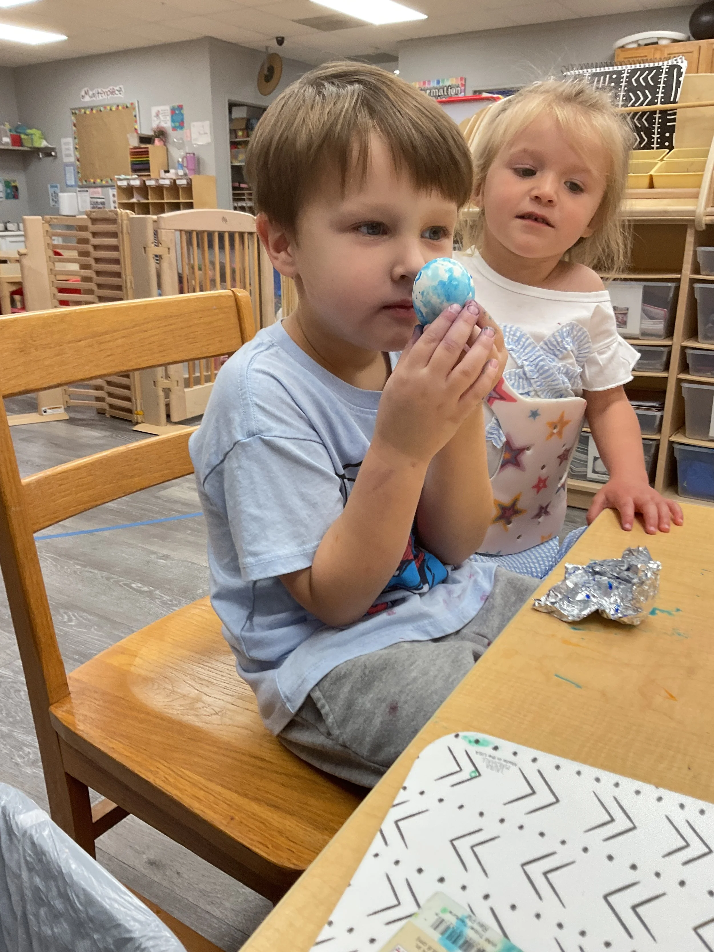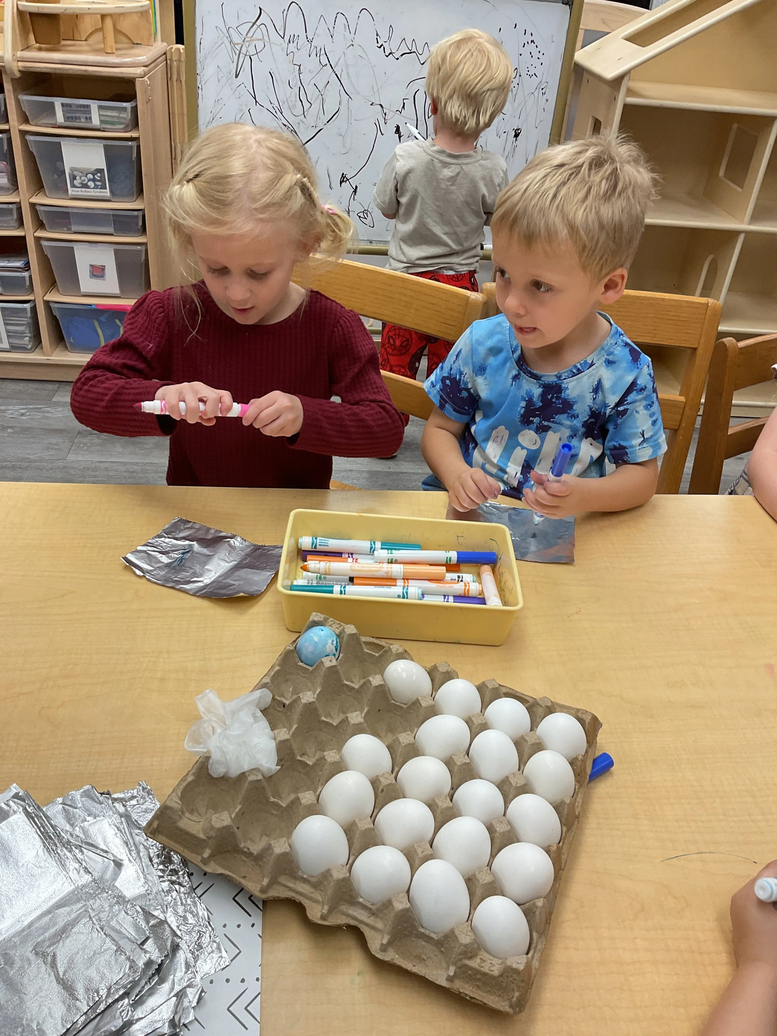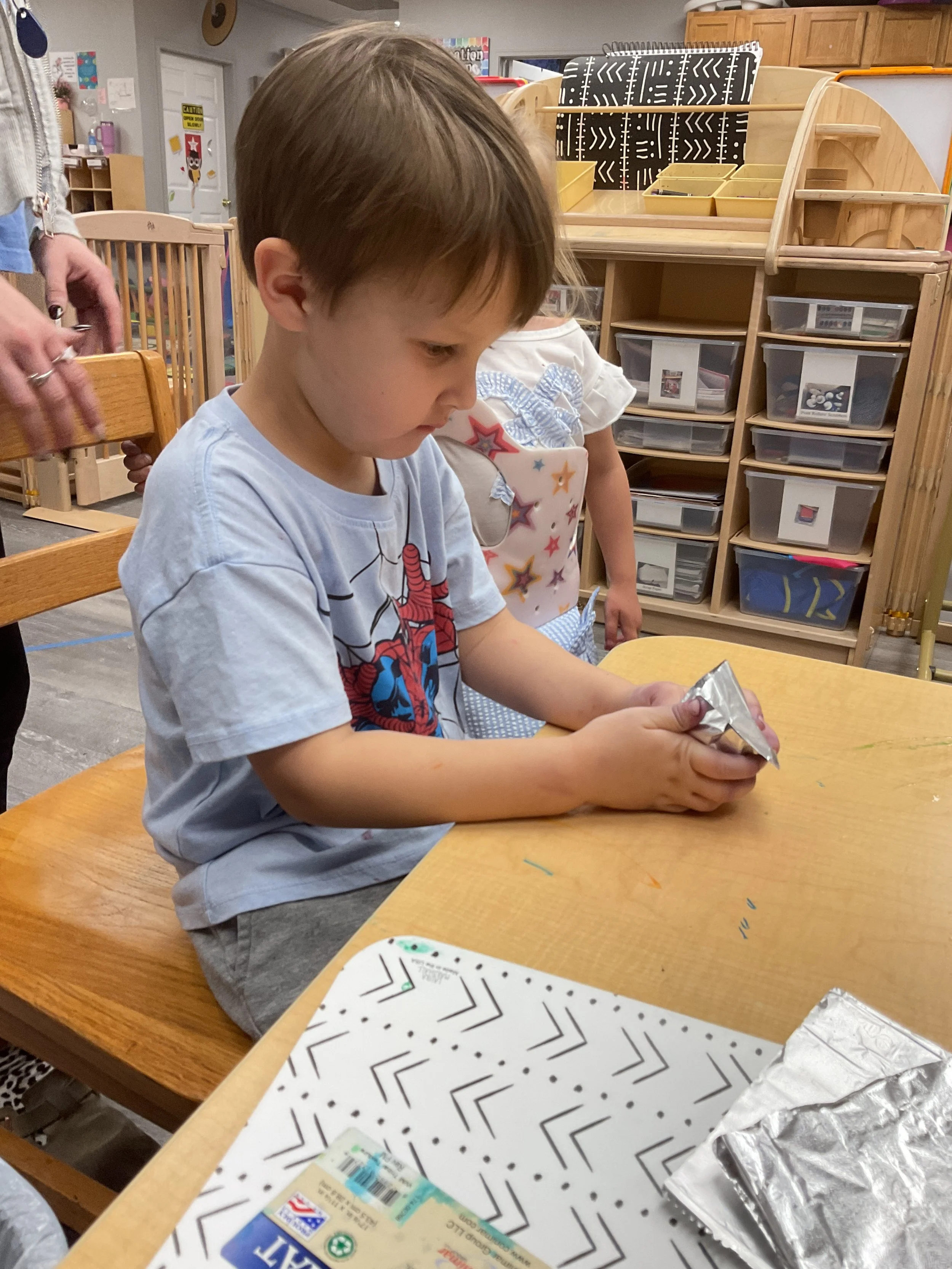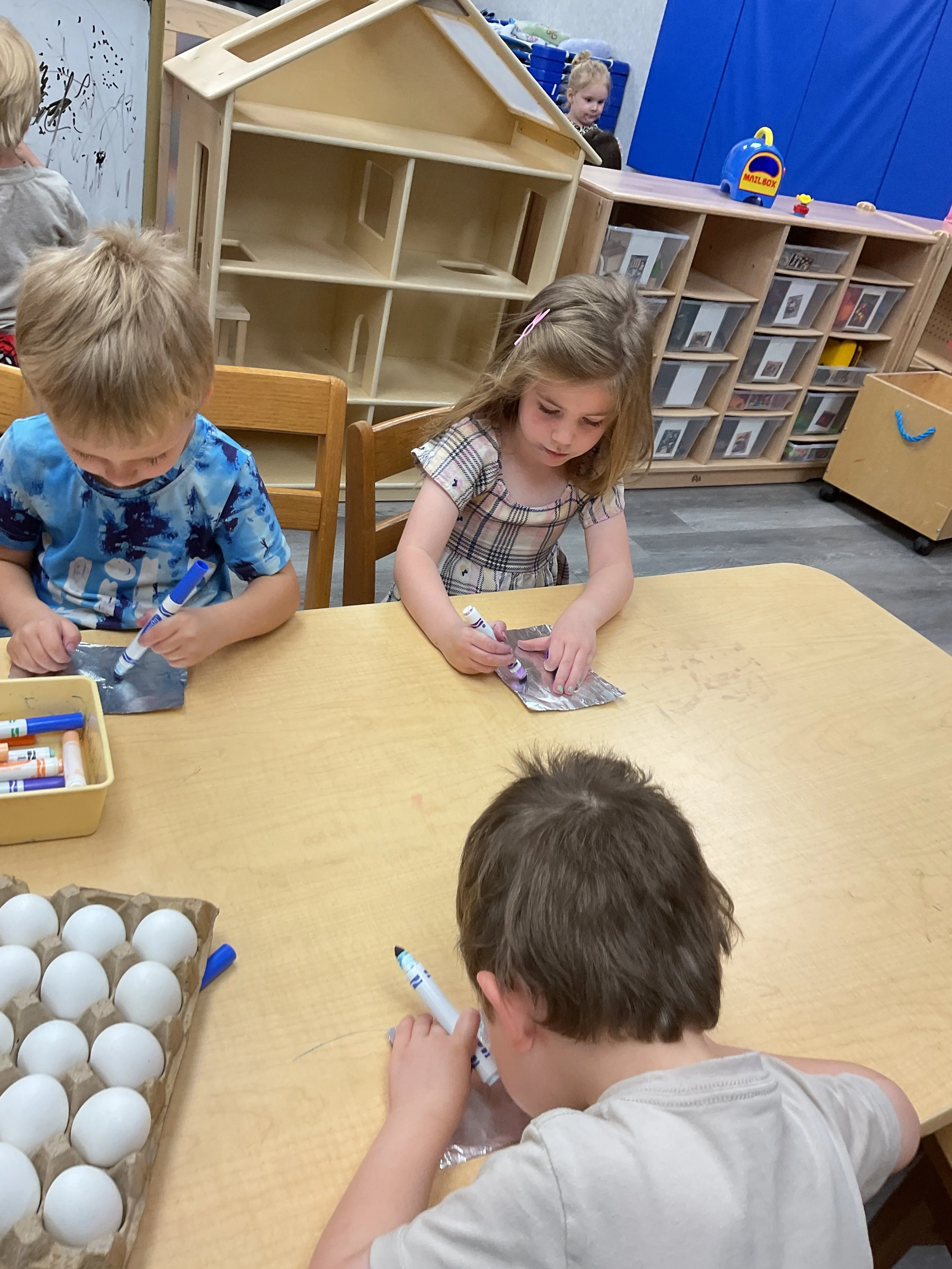 This morning, we read the book There Was an Old Women Who Swallowed a Chick written by Lucille Colandro and illustrated by Jared Lee. During our music and movement time, we used blocks of all shapes and sizes to build an Easter City. Then, during our math and cognition lesson, we matched Easter eggs by color. Next, for our science and sensory lesson, we used foil and markers to dye Easter eggs! We did this by coloring on the foil with washable markers, sprayed a bit of water on the foil, then we wrapped an egg in the foil as tightly as we could, then we unwrapped the egg, and we had beautifully dyed eggs. Finally, for our literacy and fine motor lesson, we colored an Easter egg coloring page.