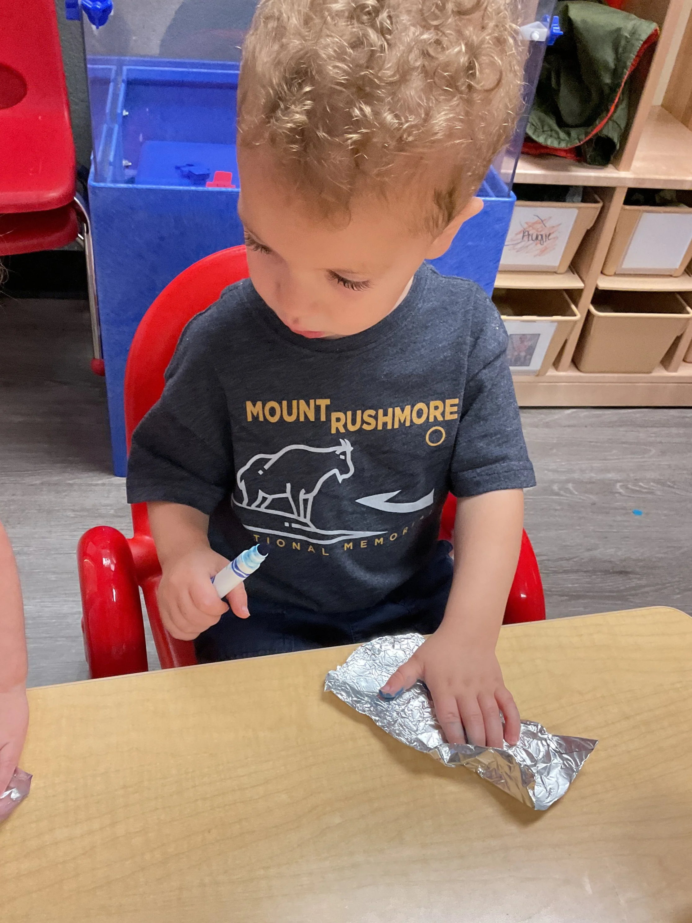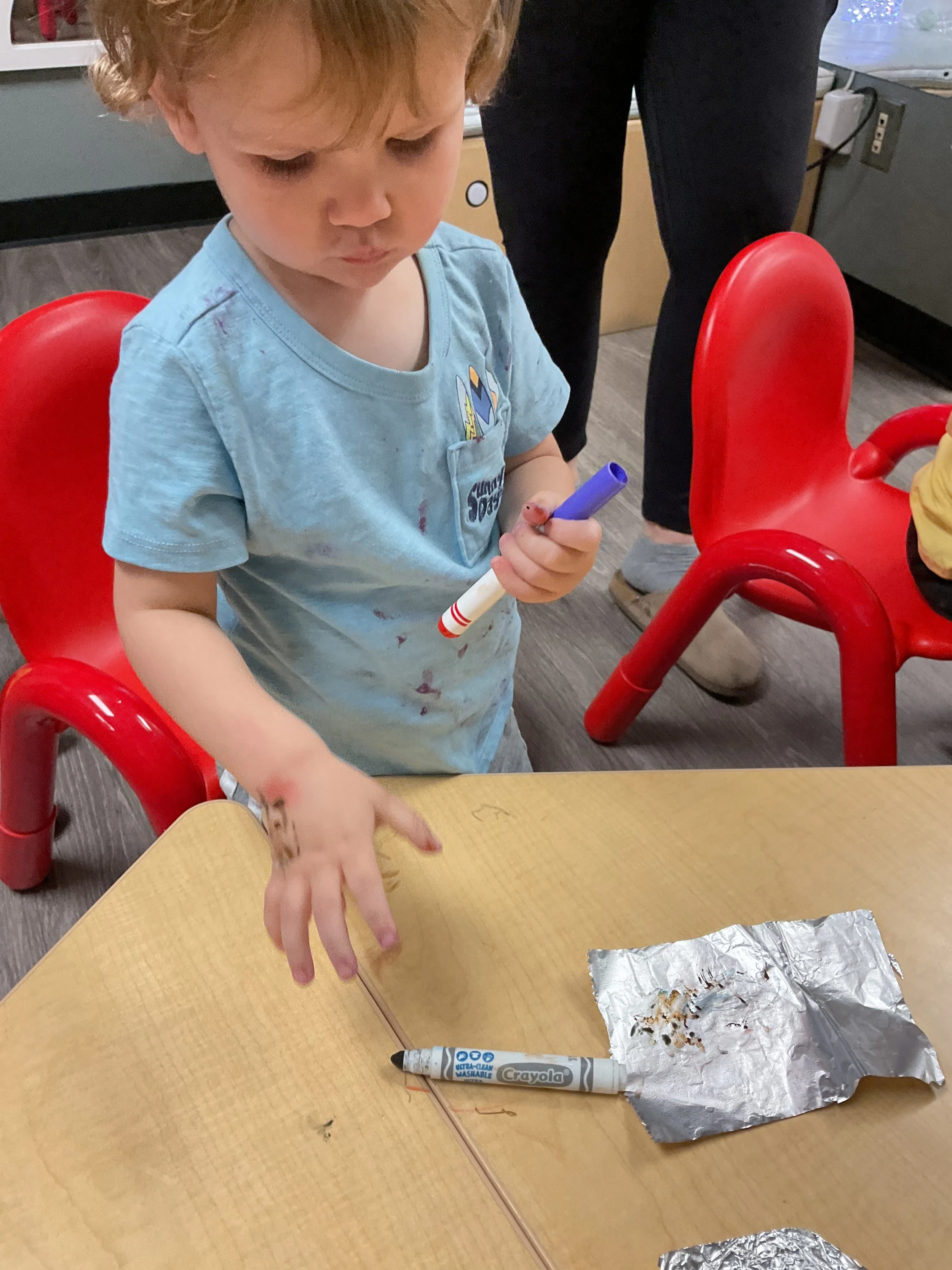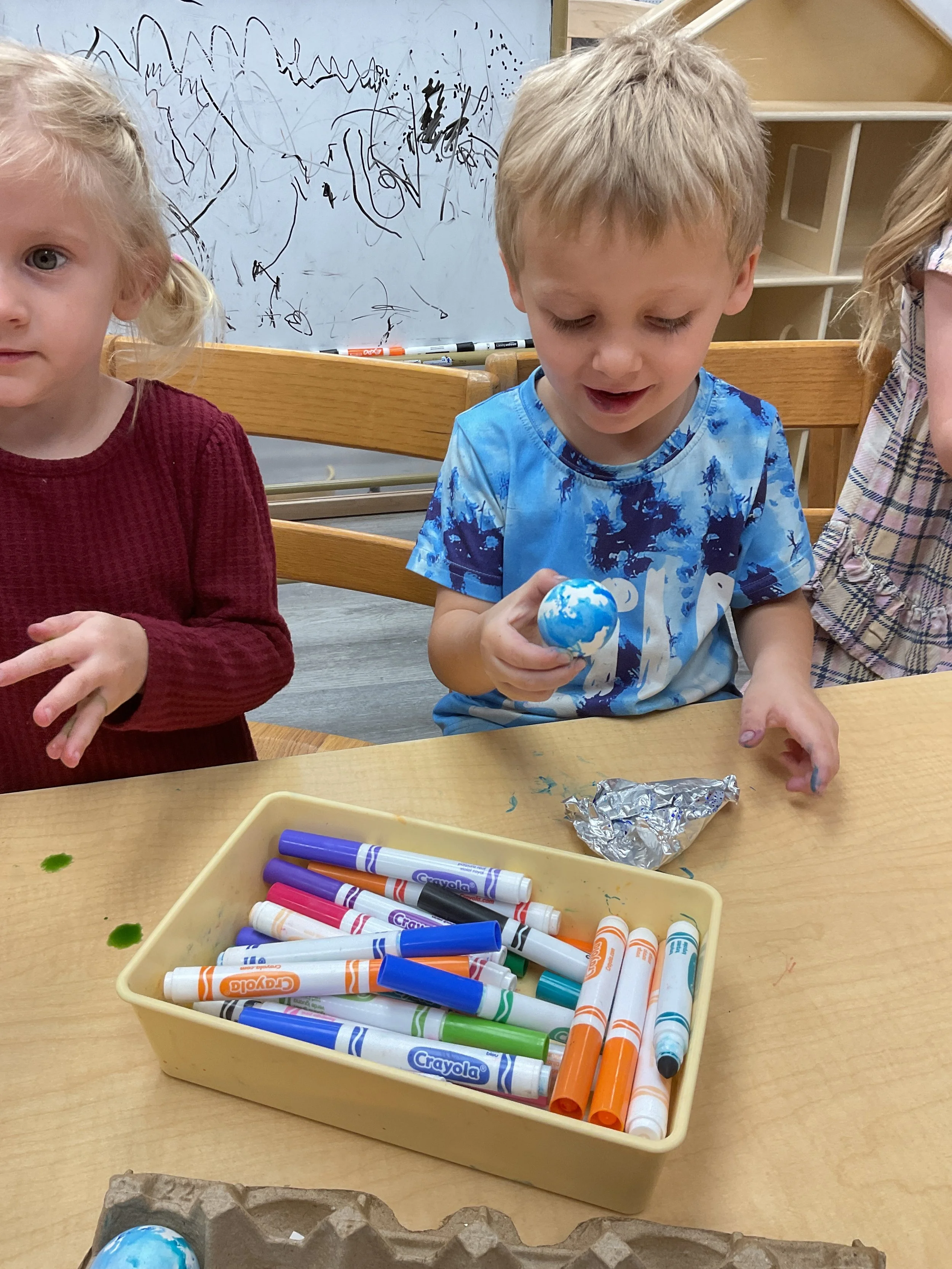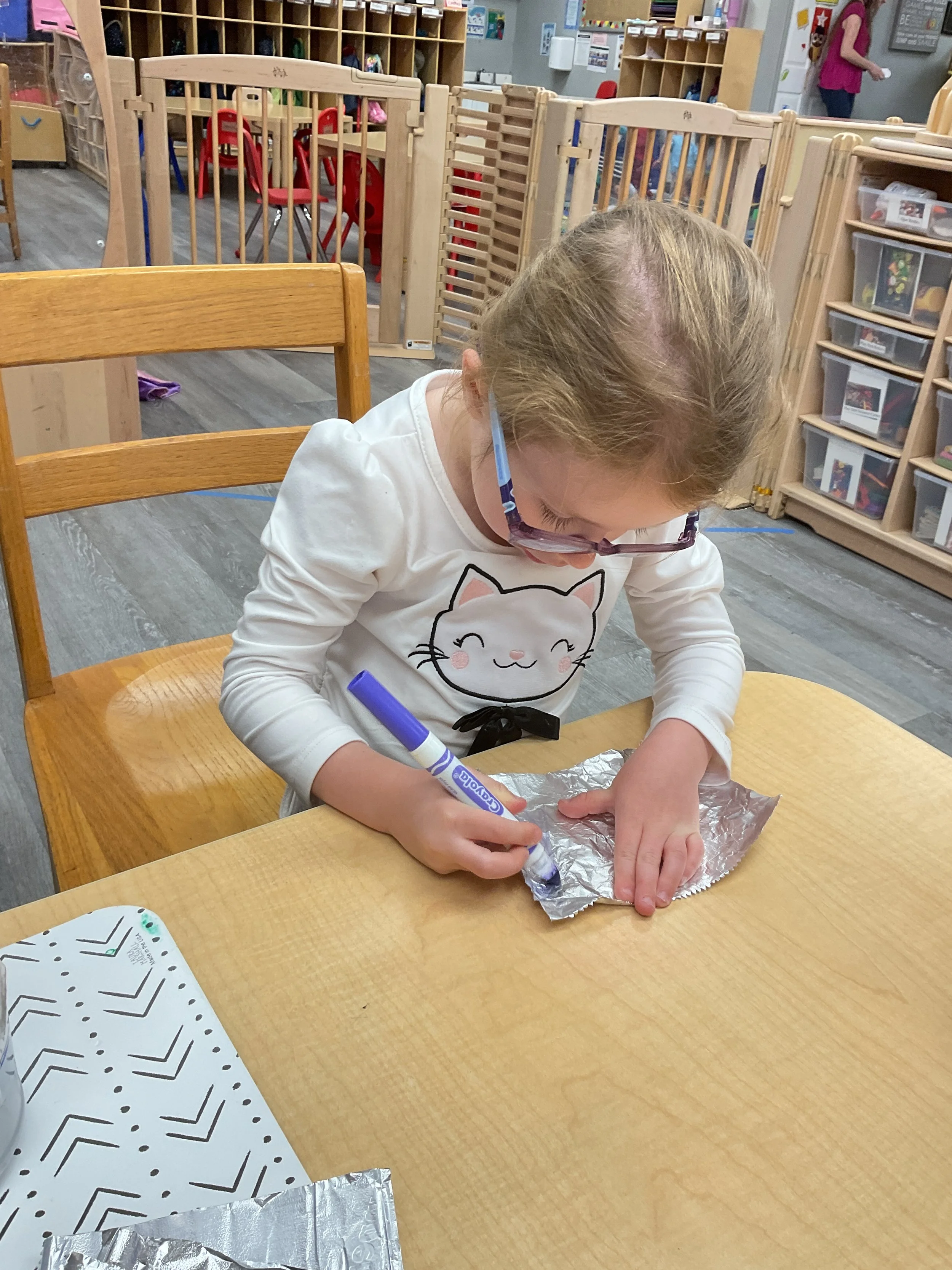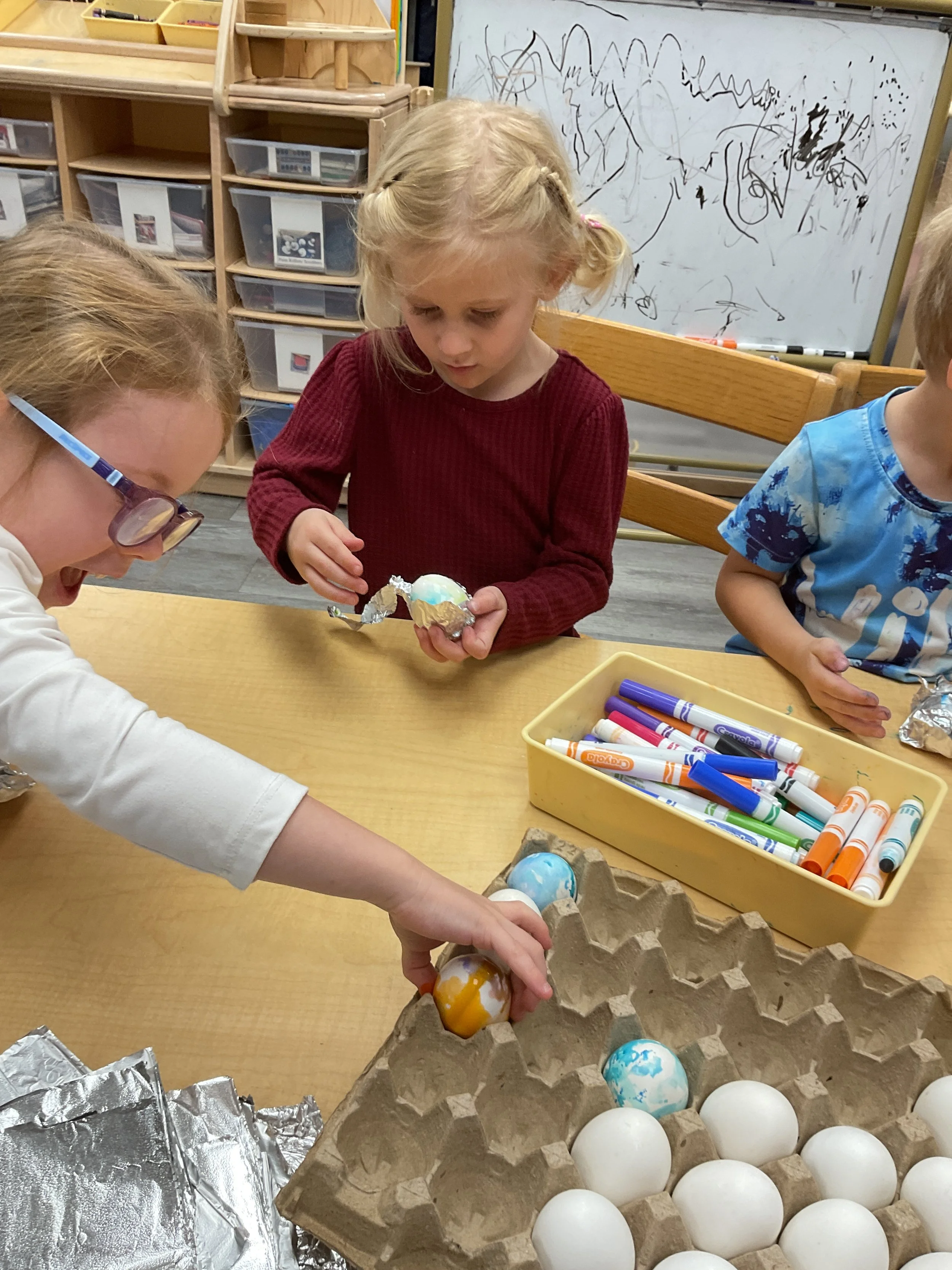 This morning, we read the book There Was an Old Women Who Swallowed a Chick written by Lucille Colandro and illustrated by Jared Lee. During our music and movement time, we used blocks of all shapes and sizes to build an Easter City. Then, during our math and cognition lesson, we matched Easter eggs by color. Next, for our science and sensory lesson, we used foil and markers to dye Easter eggs! We did this by coloring on the foil with washable markers, sprayed a bit of water on the foil, then we wrapped an egg in the foil as tightly as we could, then we unwrapped the egg, and we had beautifully dyed eggs. Finally, for our literacy and fine motor lesson, we colored an Easter egg coloring page.