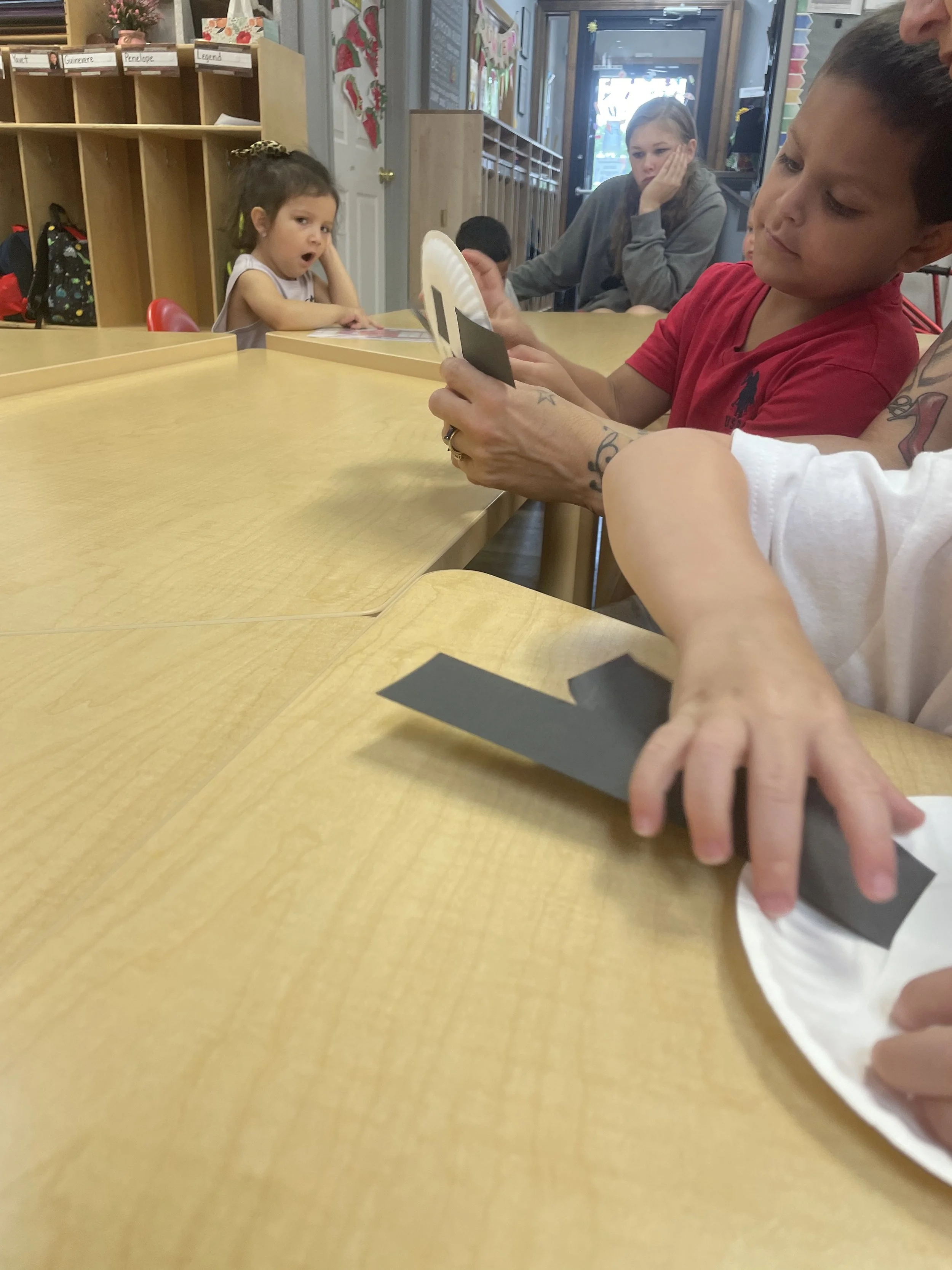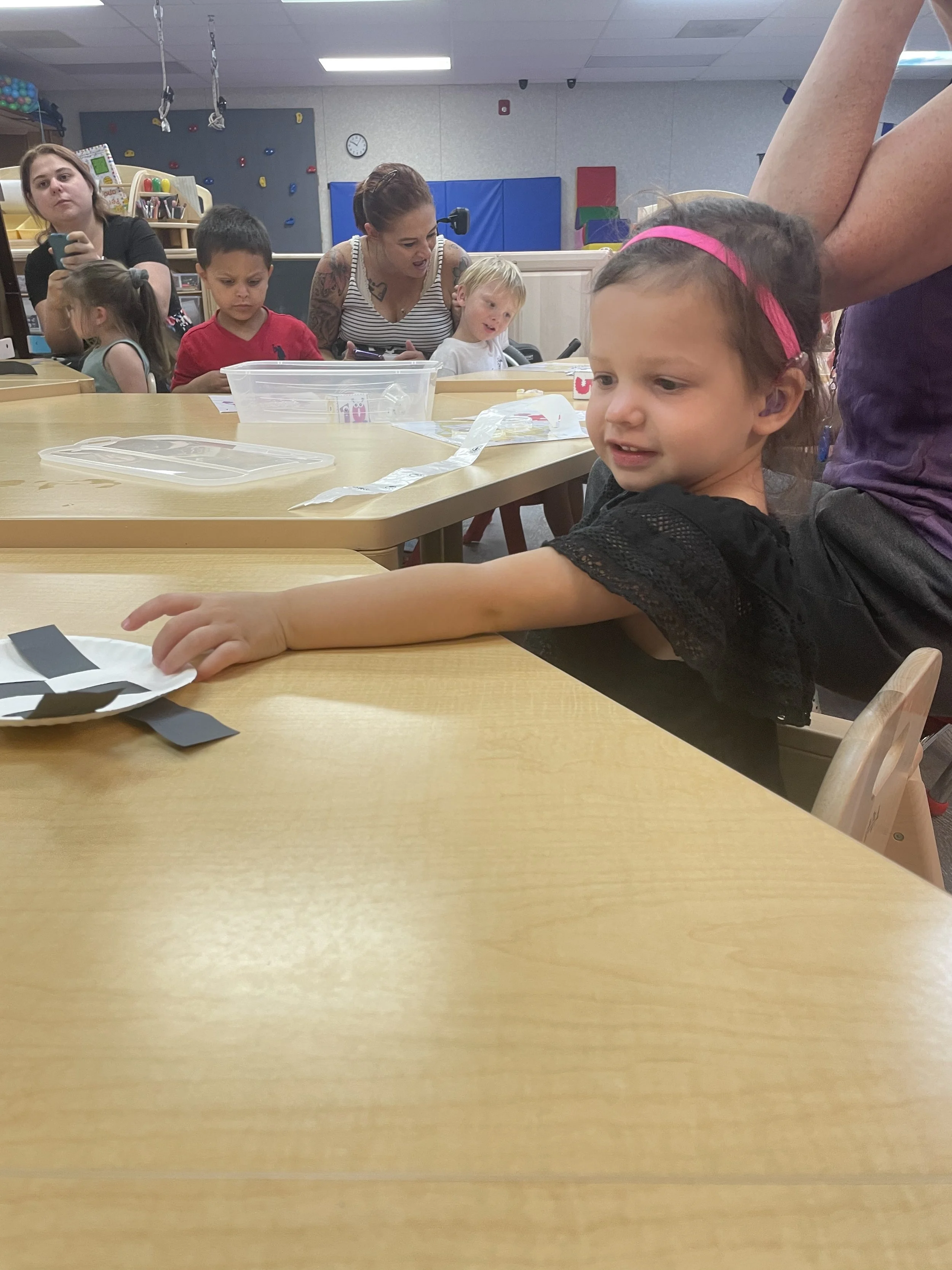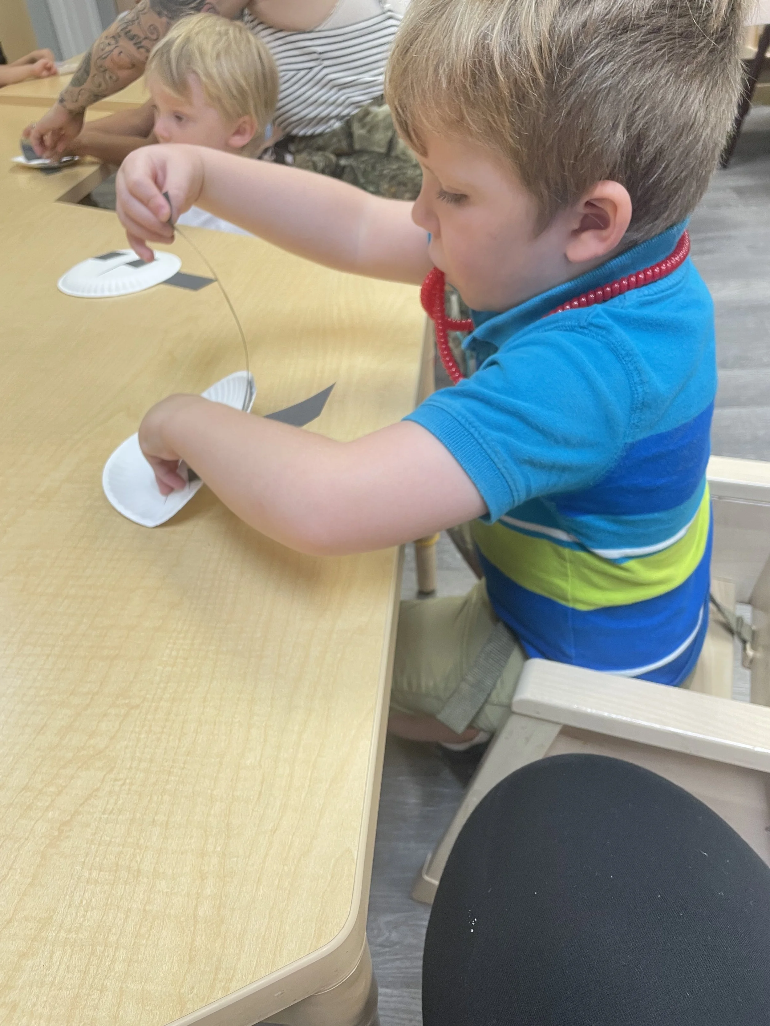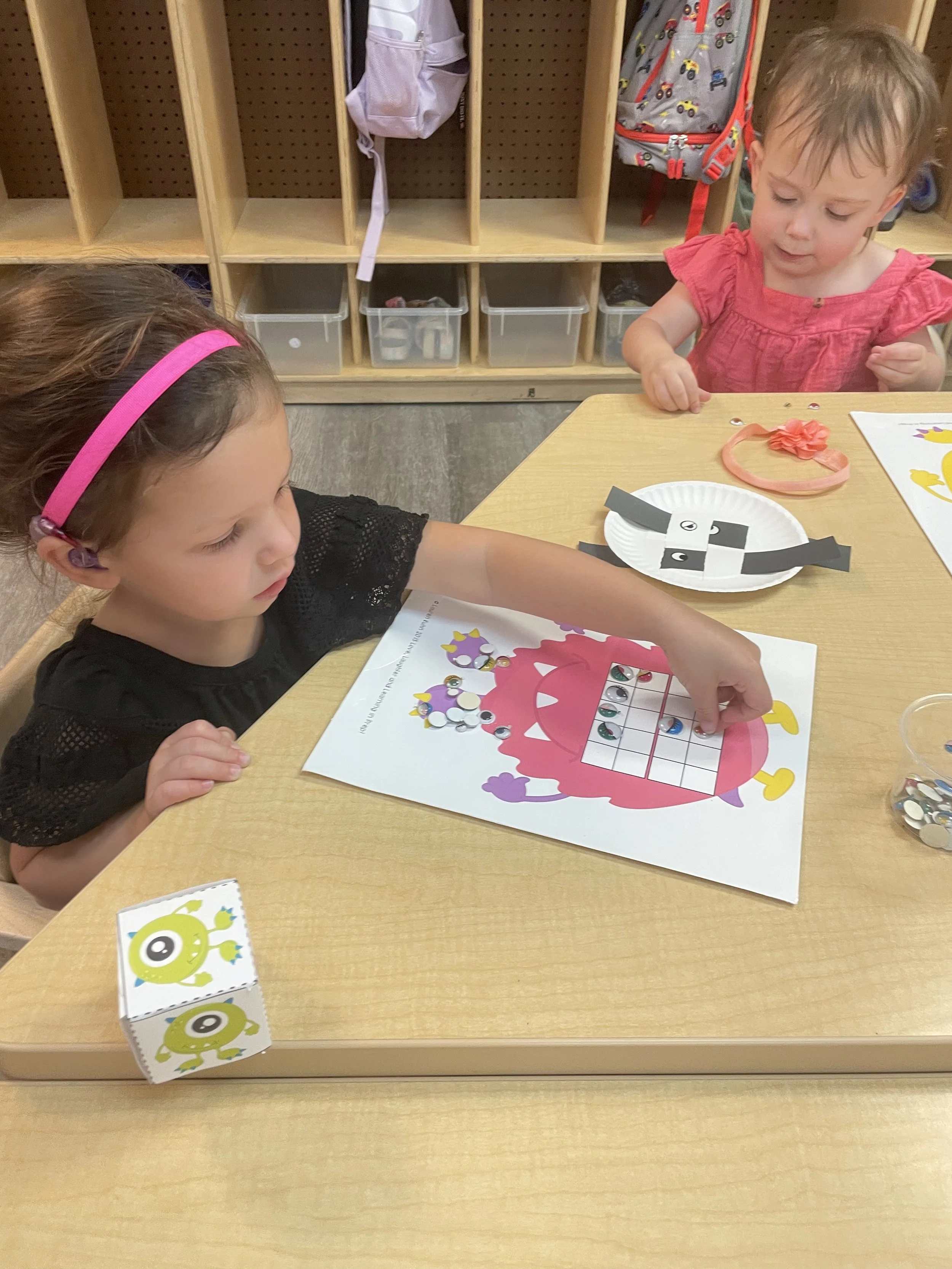 Happy Monday! Today we read the book Monsters vs. Kittens by Dani Jones and Stan Lee. In this book, the monster and kitten are opposites in some ways such as: the monster is big and the kitten little, the monster is messy and the kitten is clean. The pair also has things that are alike such as enjoying sunning themselves and both being warm and cuddly. Even though they have differences they are friends. For our math and cognition activity, we rolled to add eyes to monsters using googly eyes making some of the monsters have up to 20 eyes. For our sensory and science activity, we weaved over and under (opposites) black construction paper with a white paper plate (opposites black/white) to make a monster. During our literacy and fine motor activity, we practiced writing our names.