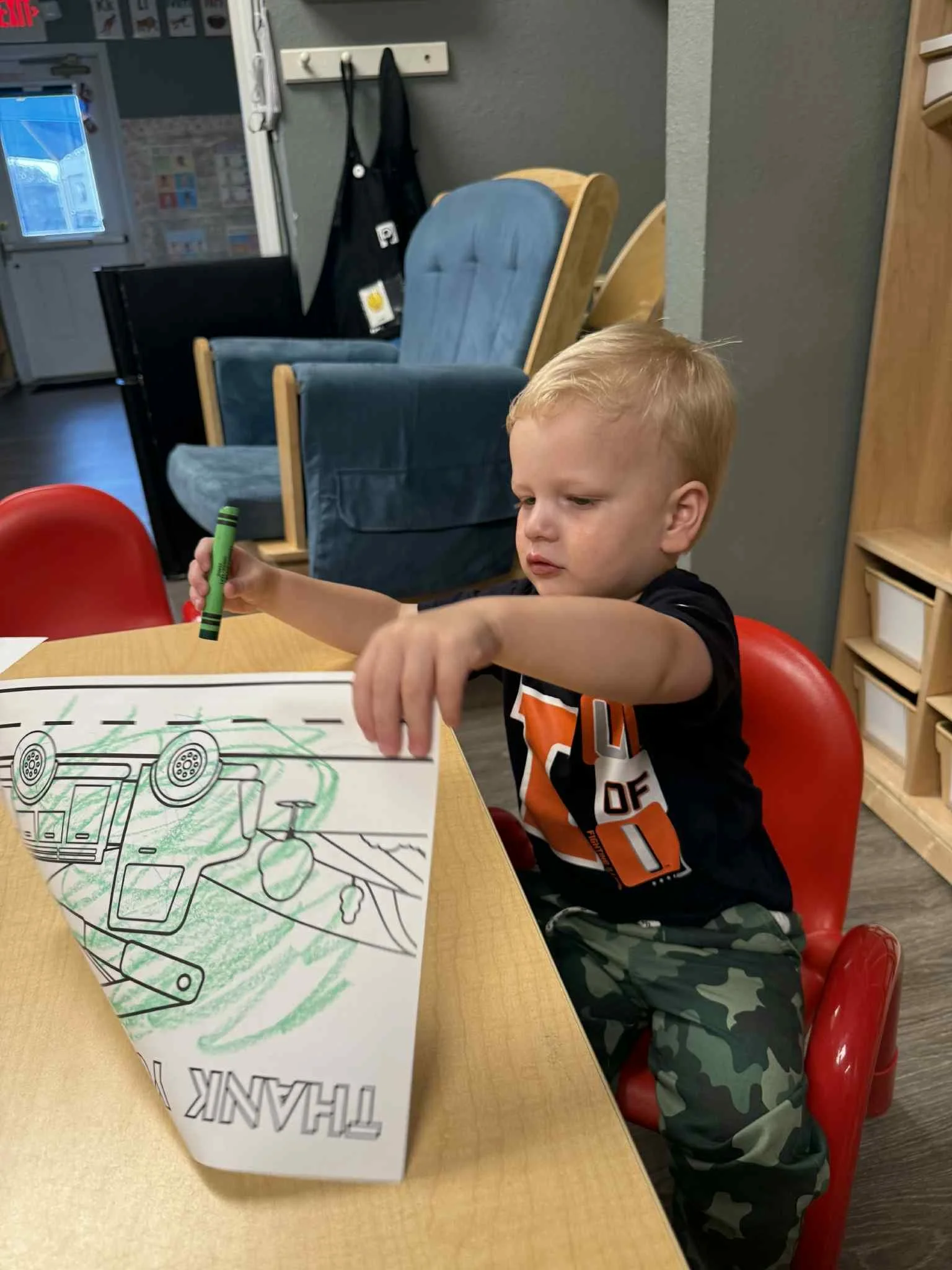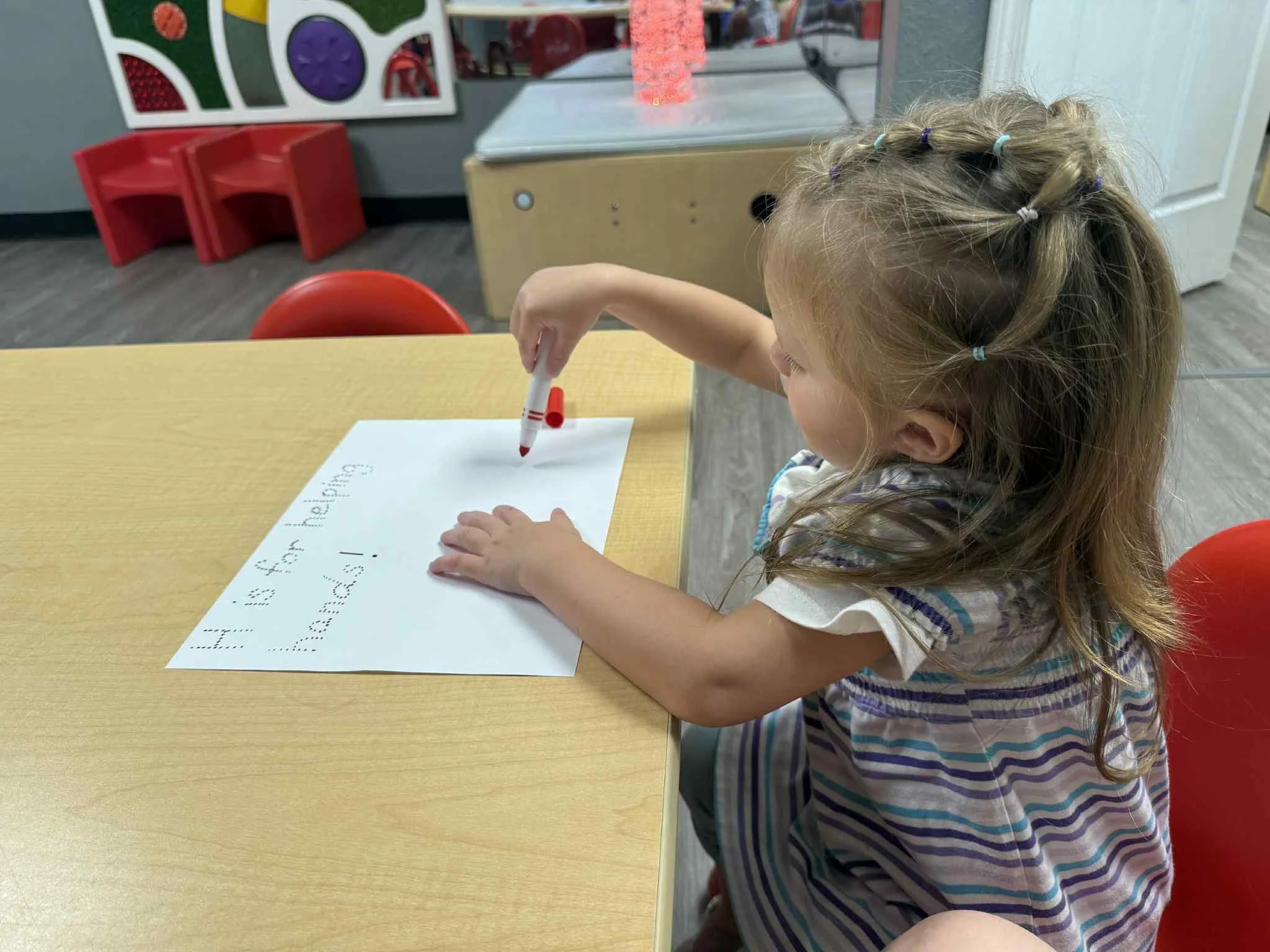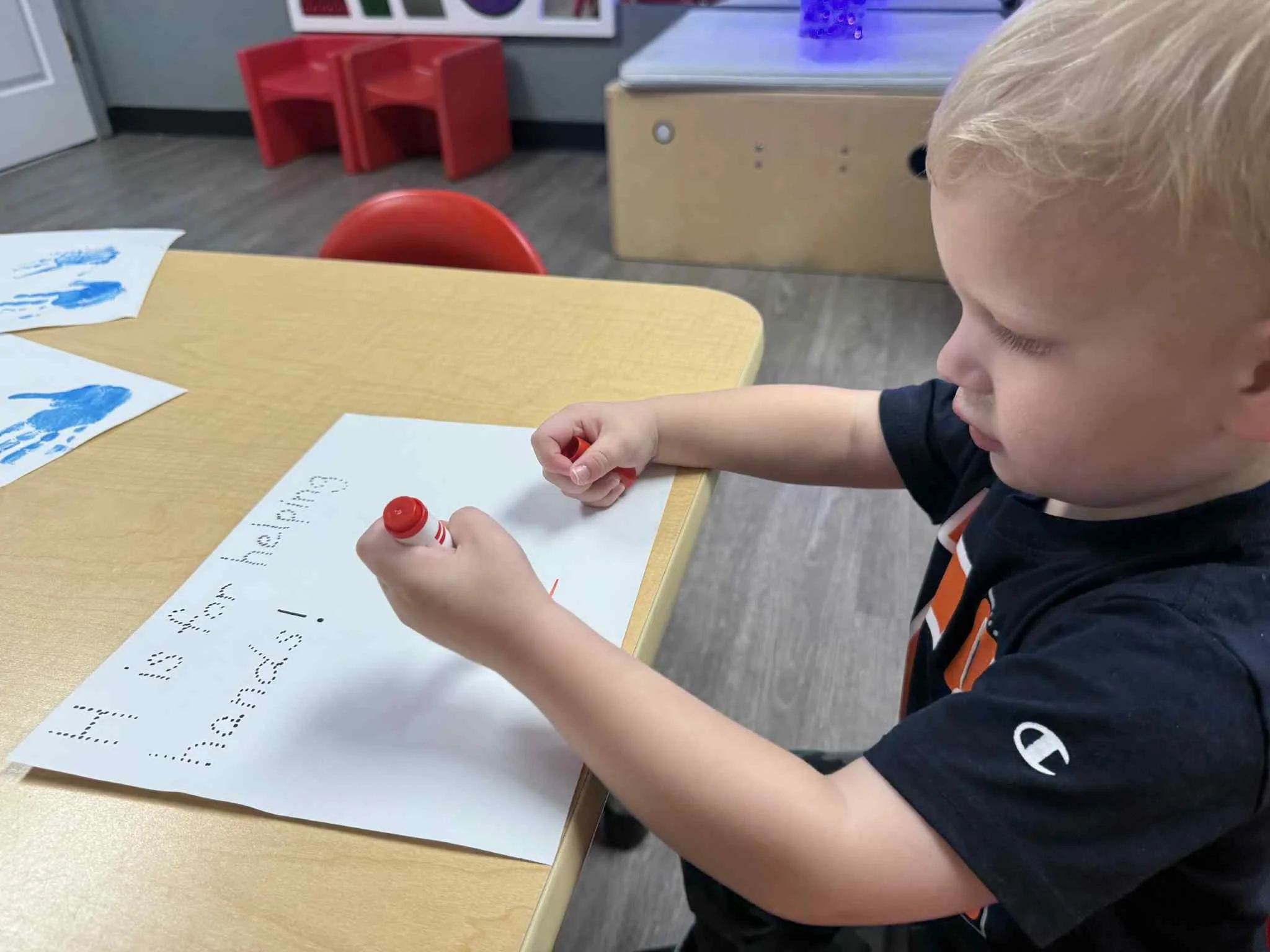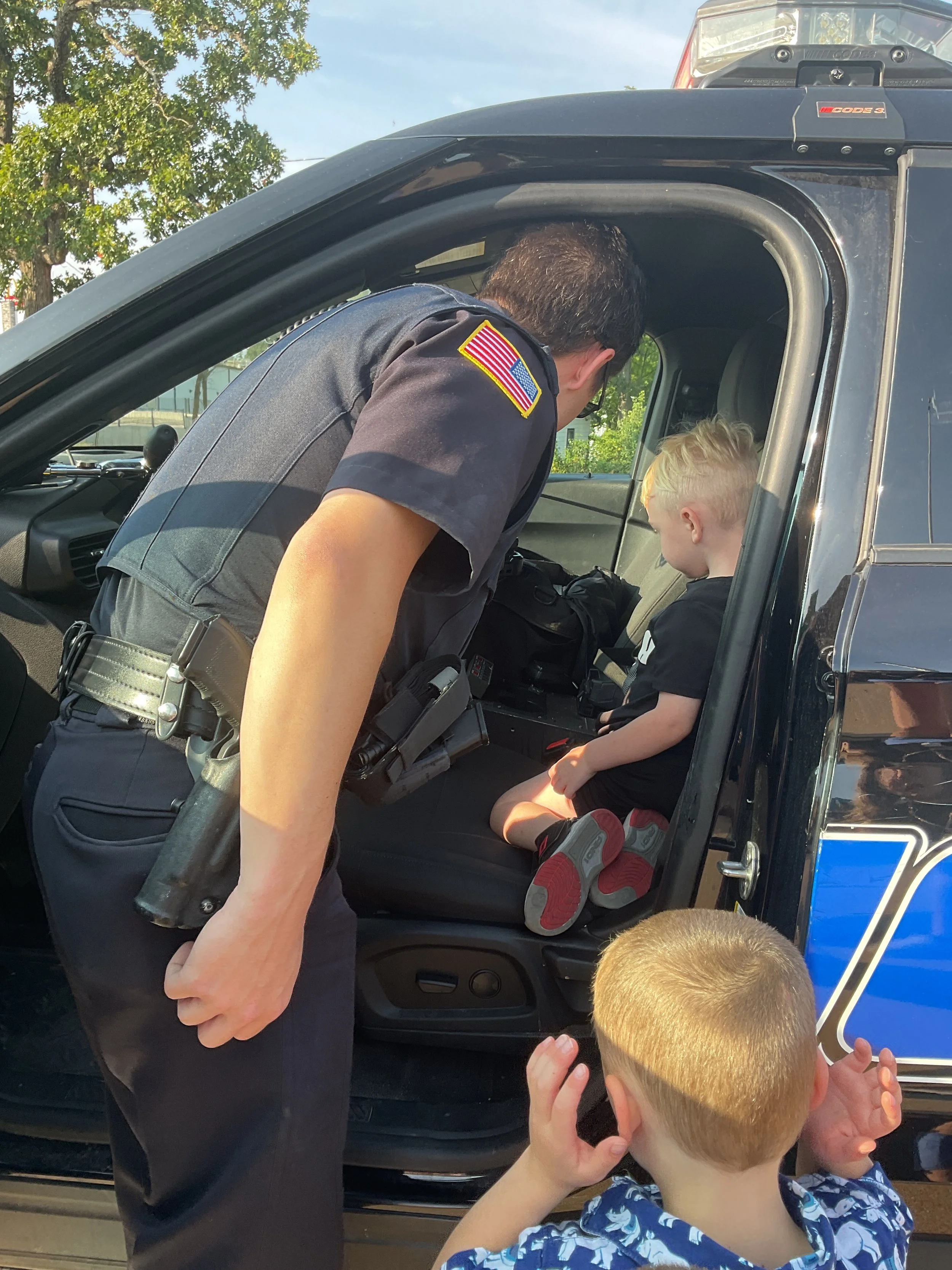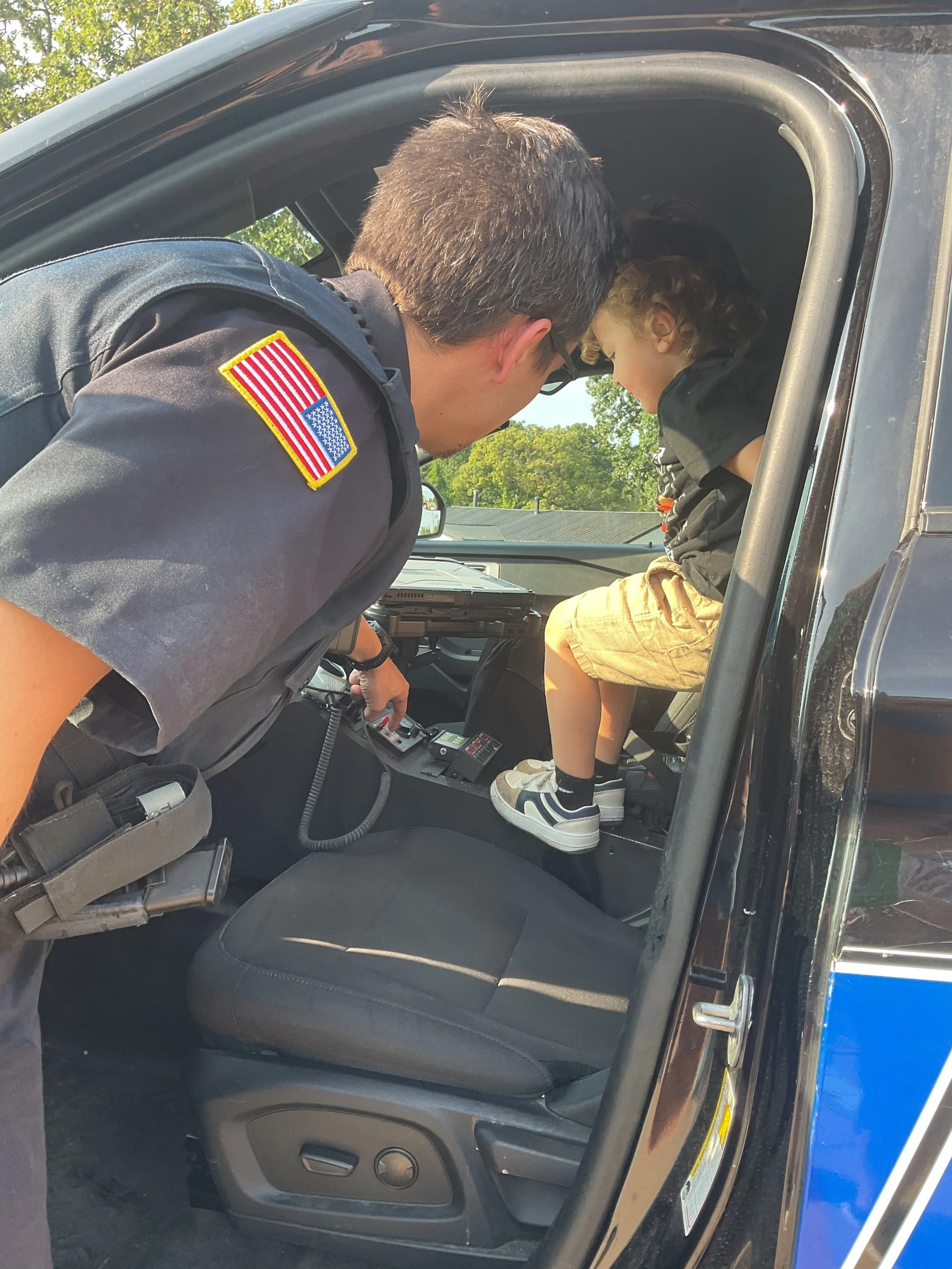 Today we read the book Lola at the Library written by Anna McQuinn and Rosalind Beardshaw. We would like to thank the Camdenton City Police Department for coming to CLC today! They talked to us about calling 911 in an emergency. They let us see their patrol car and they even turned on the sirens! We learned that when you hear the siren, that means help is on its way. During our math and cognition lesson, we put together community helper puzzles. Next, during our science and sensory lesson, we used an ink pad to examine the lines on our fingerprints. We learned that everyone’s fingerprints are different and unique. Finally, for our fine motor and literacy lesson, we traced the words “H is for helping hands” and then put a painted handprint on the paper.