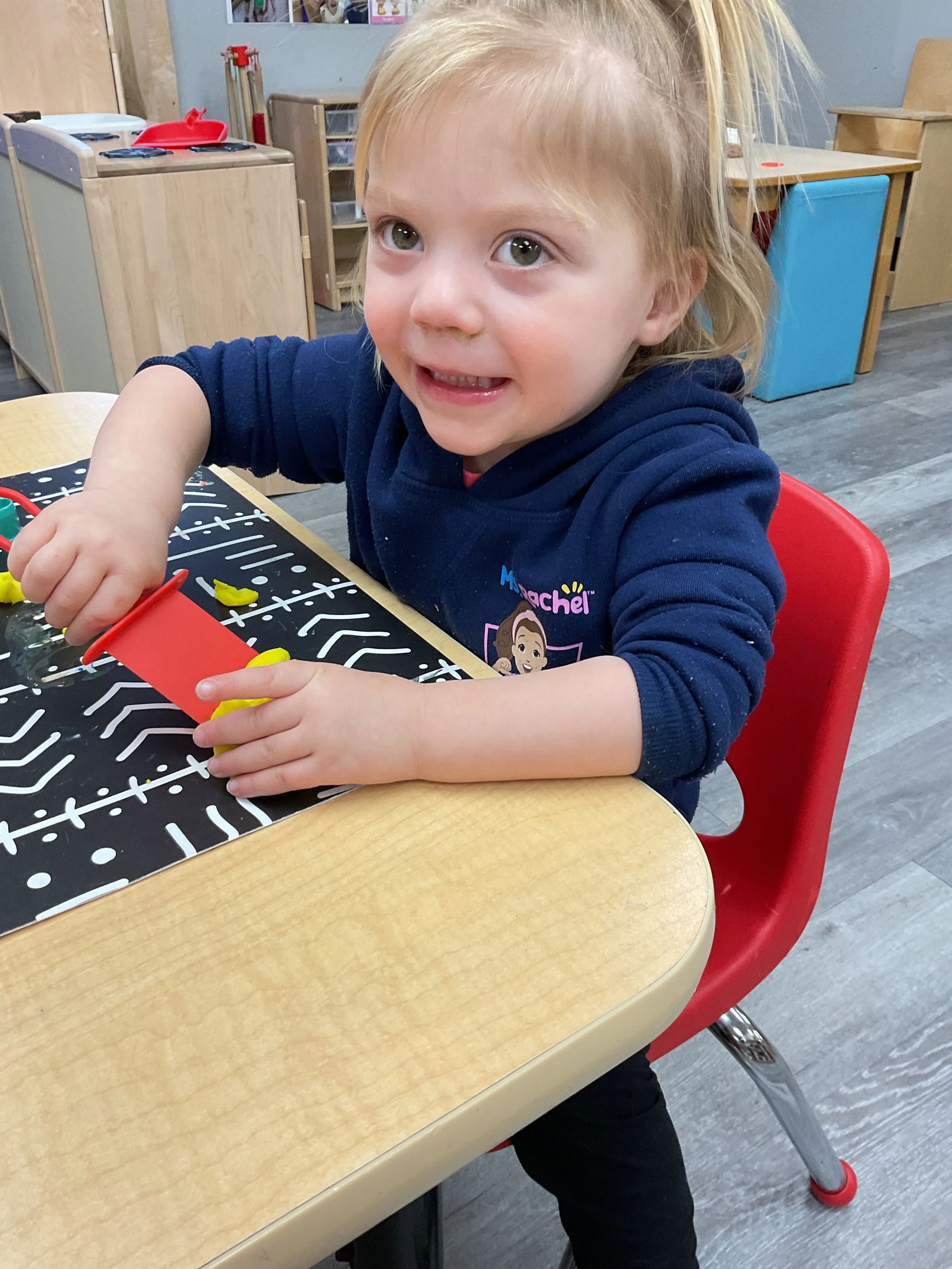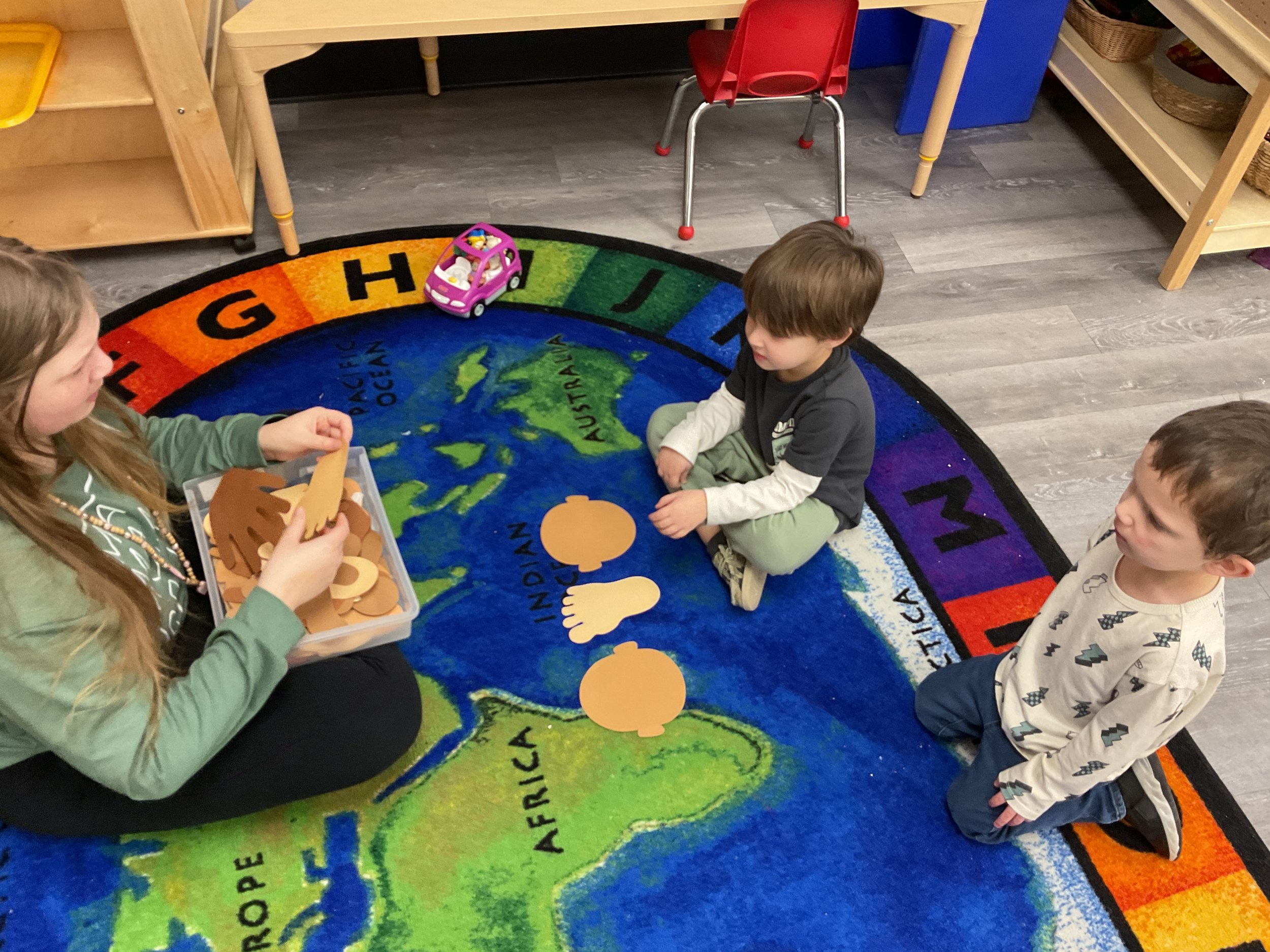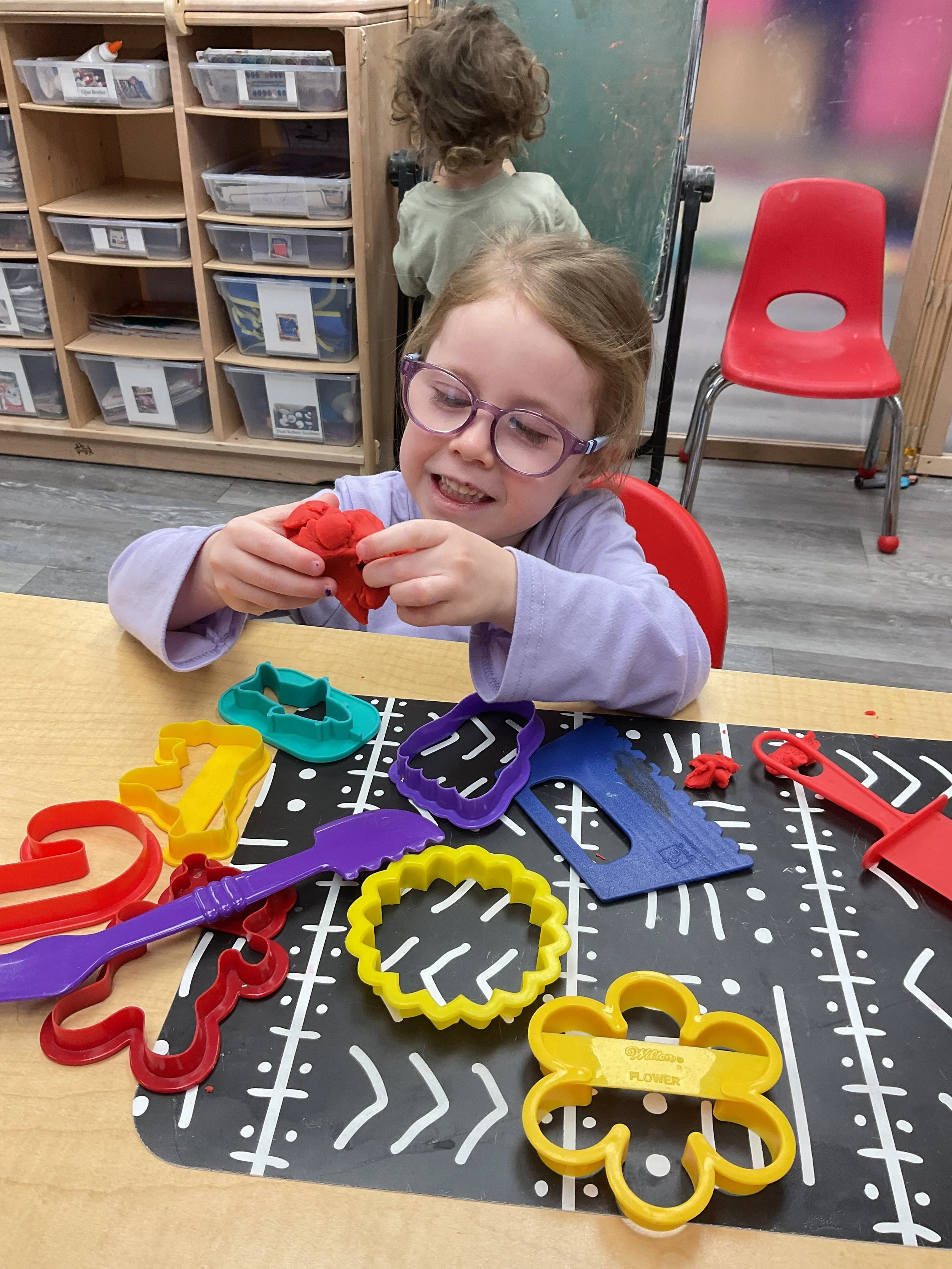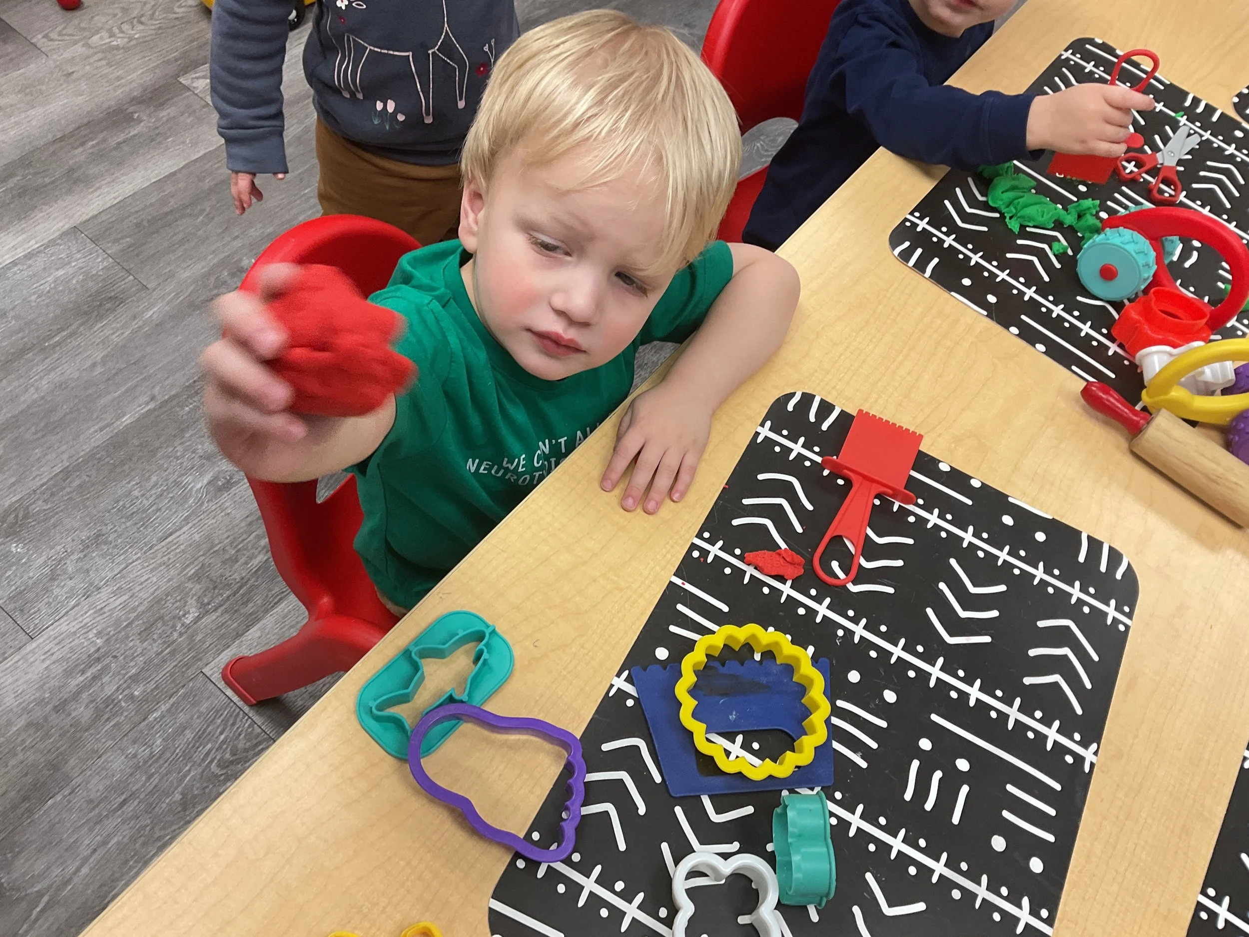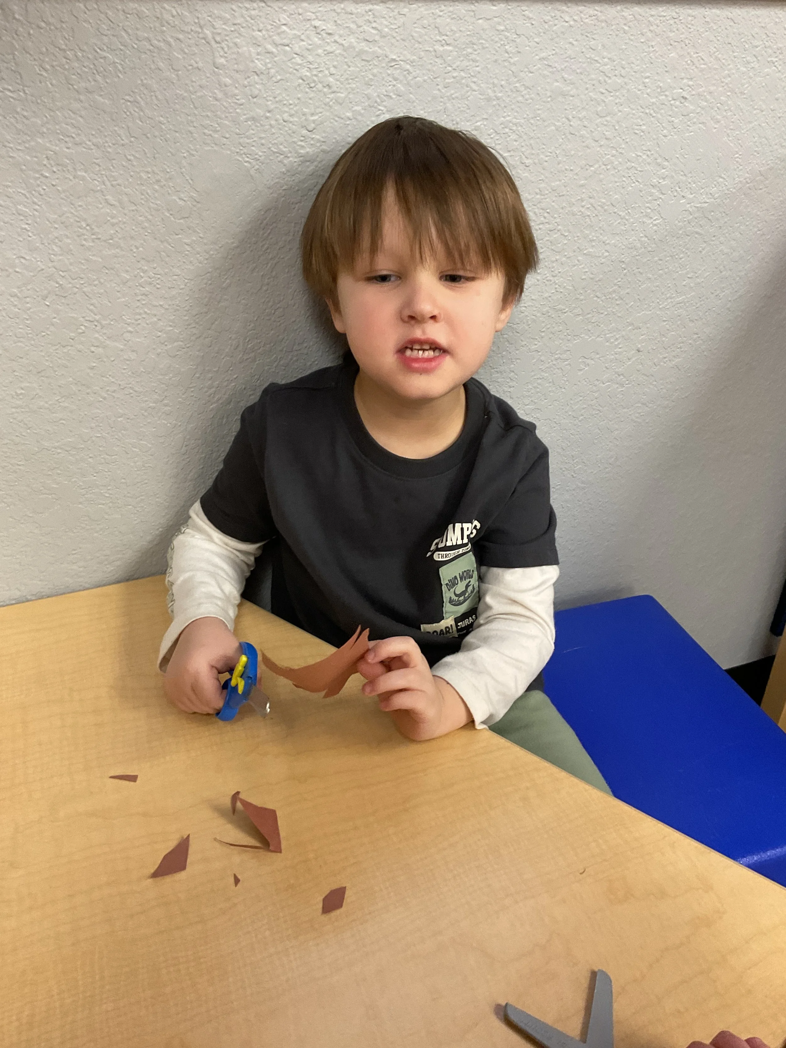 This morning, we read the book Hands are Not for Hitting written by Martine Agassi and illustrated by Marieka Heinlen. During our music and movement time, we navigated an obstacle course. Then, during our math and cognition lesson, we used paper bodies to make patterns. Next, for our science and sensory lesson, we used playdough to make people! Finally, for our literacy and fine motor lesson, we practiced our cutting skills.