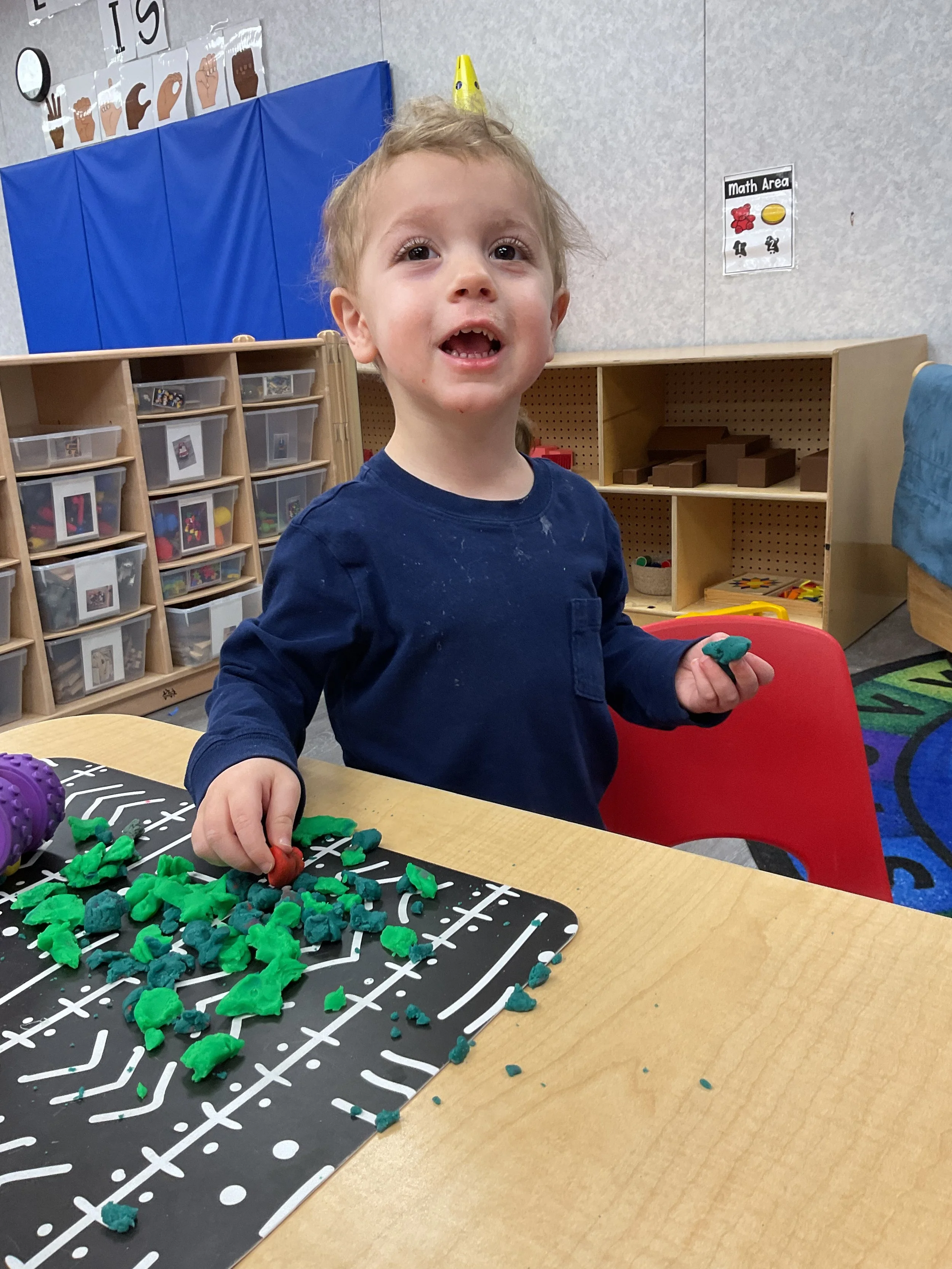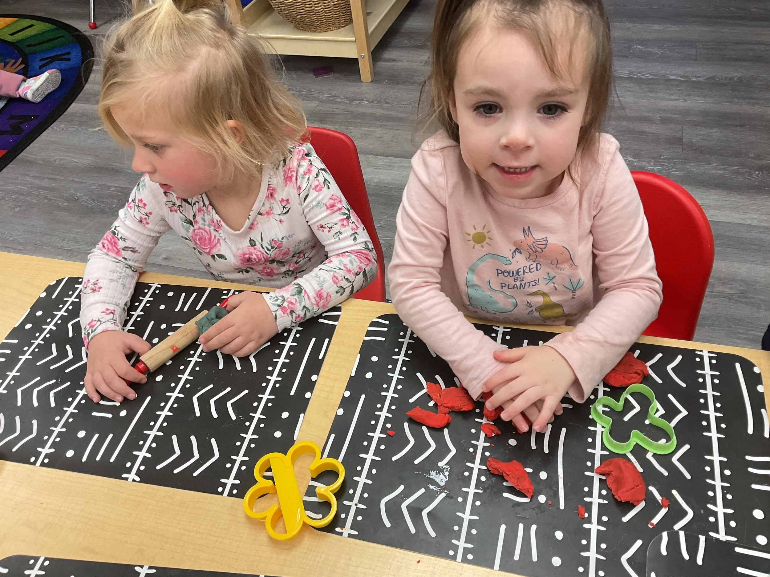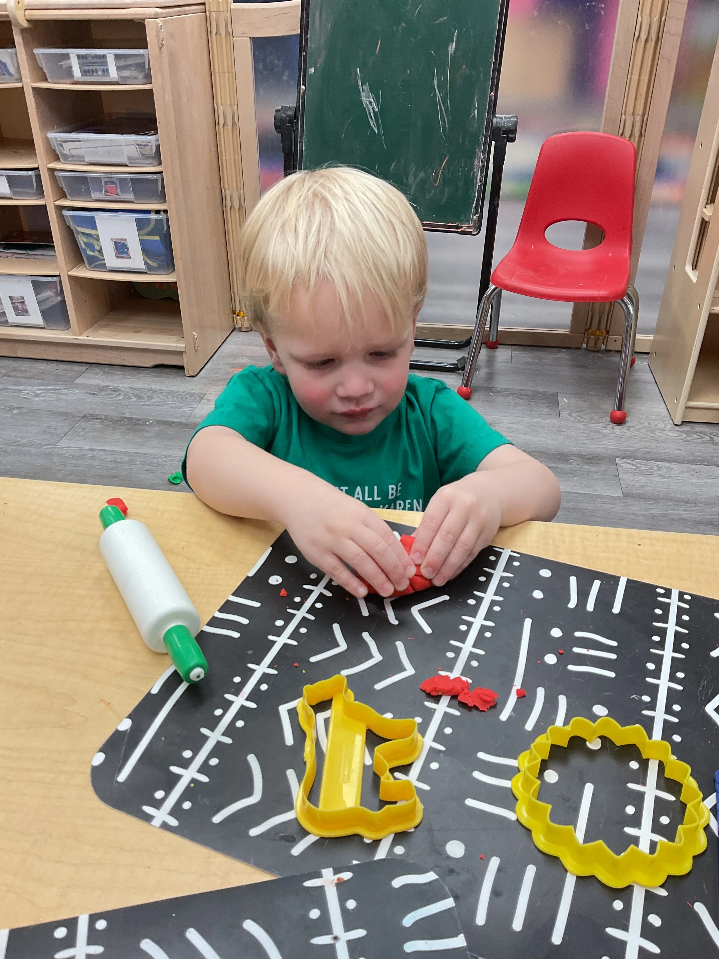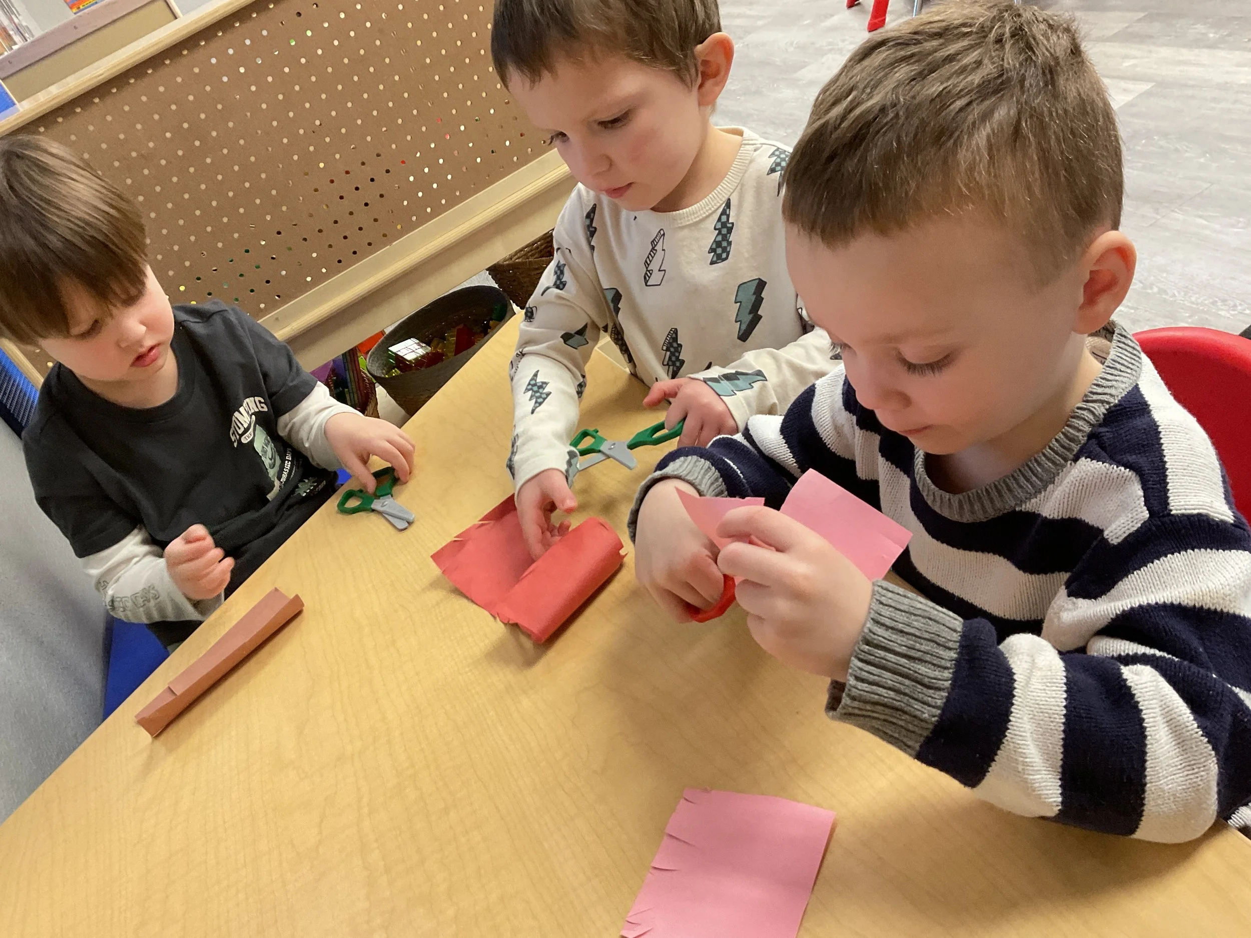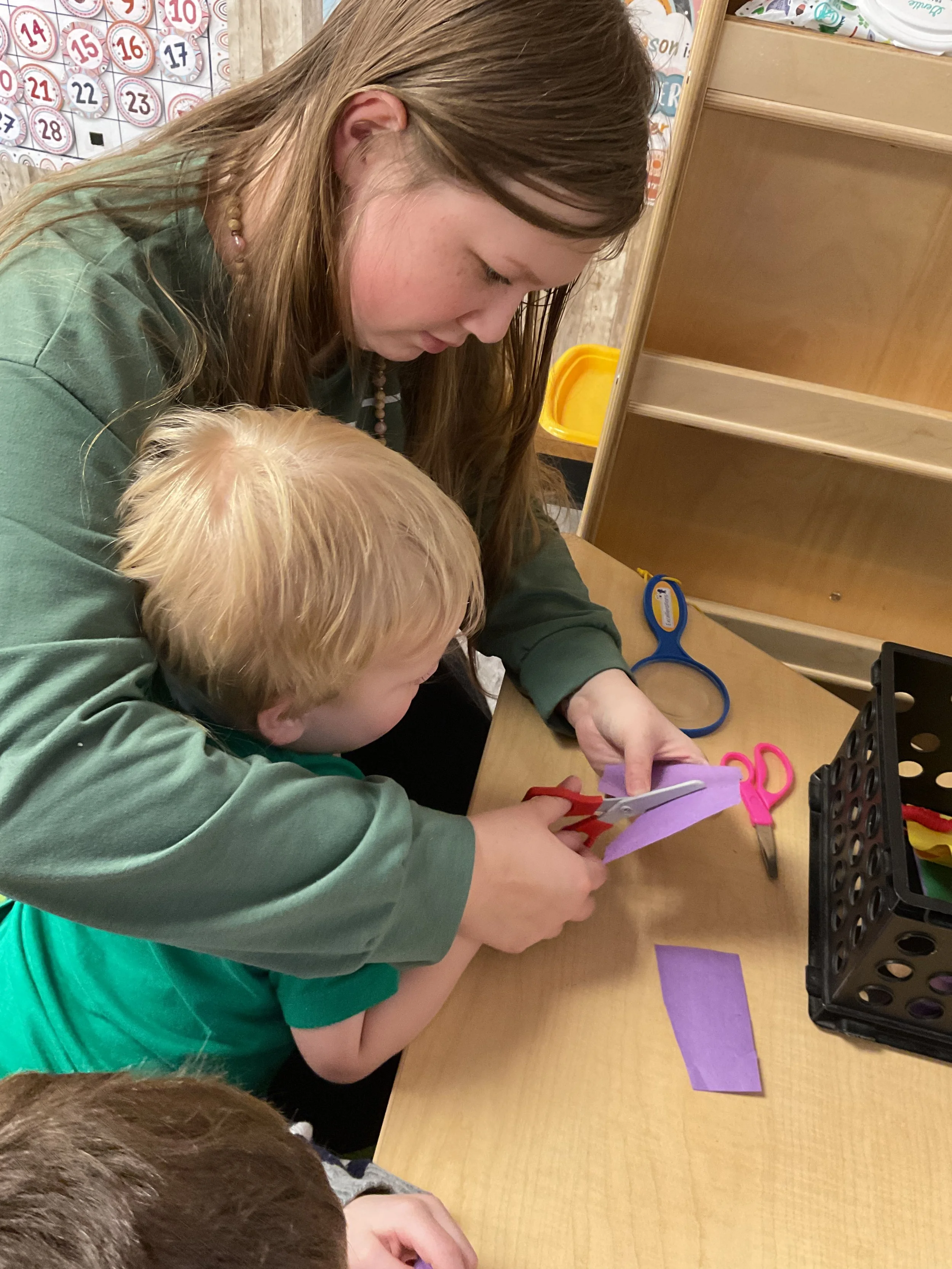 This morning, we read the book Hands are Not for Hitting written by Martine Agassi and illustrated by Marieka Heinlen. During our music and movement time, we navigated an obstacle course. Then, during our math and cognition lesson, we used paper bodies to make patterns. Next, for our science and sensory lesson, we used playdough to make people! Finally, for our literacy and fine motor lesson, we practiced our cutting skills.