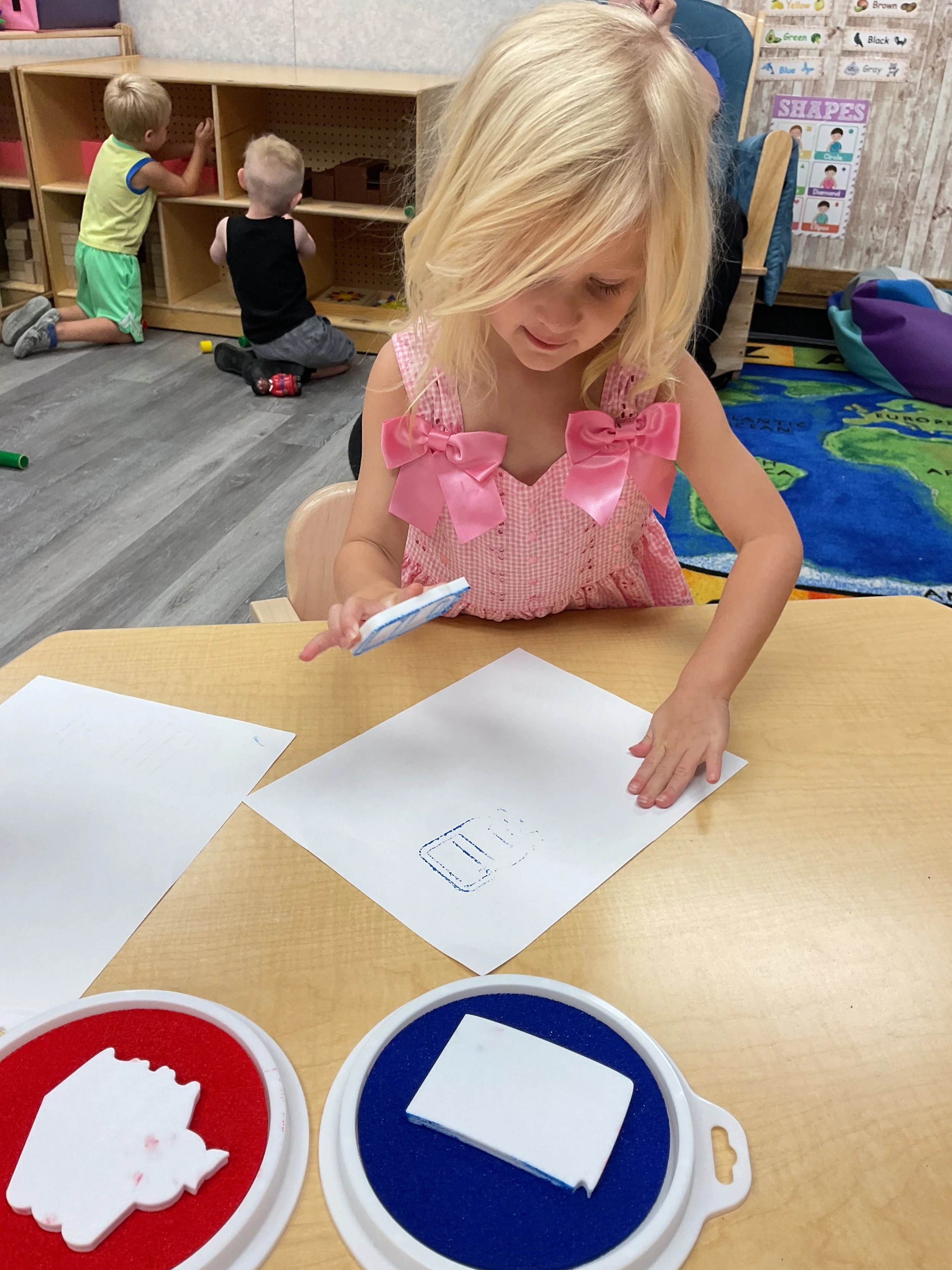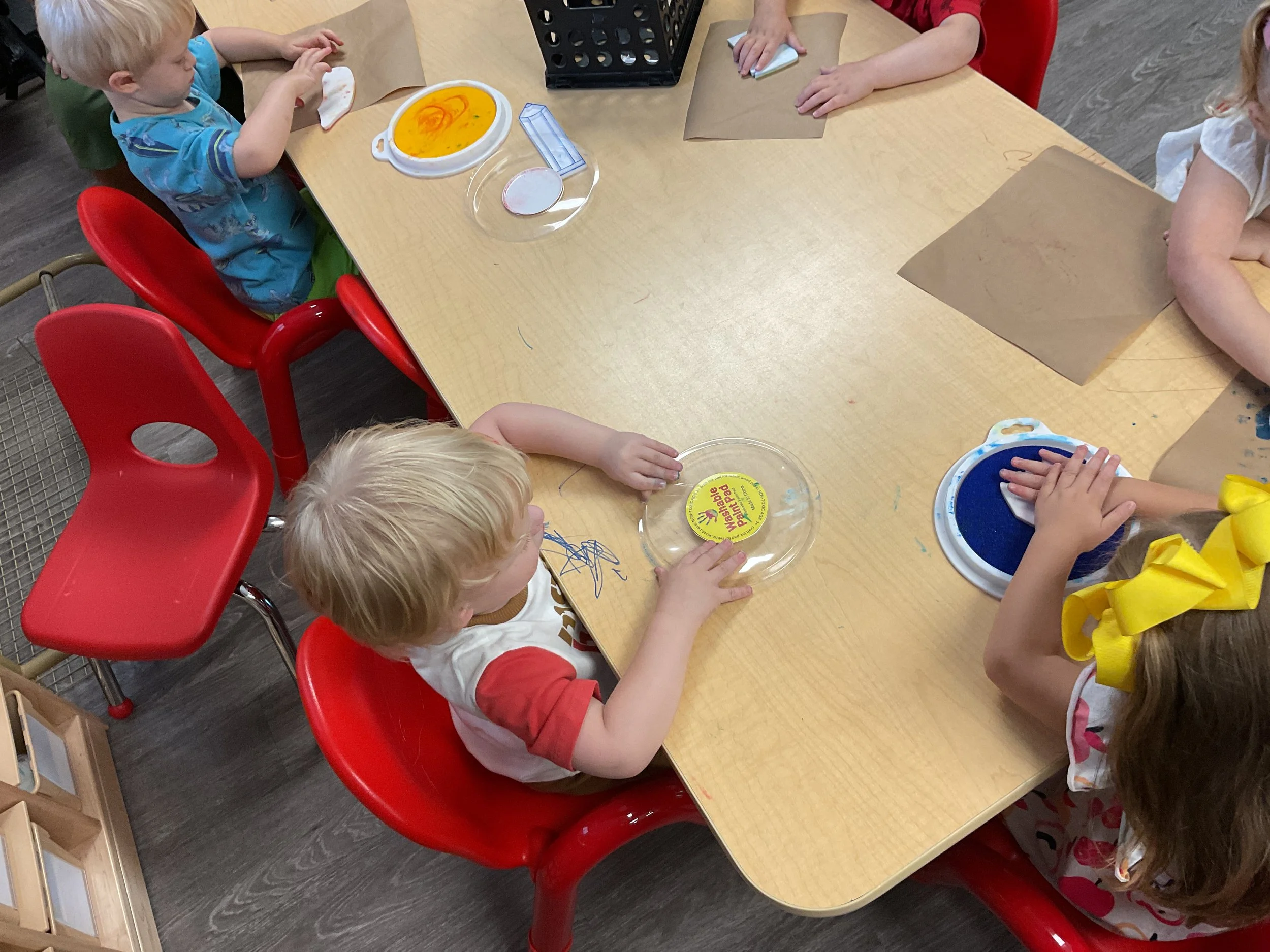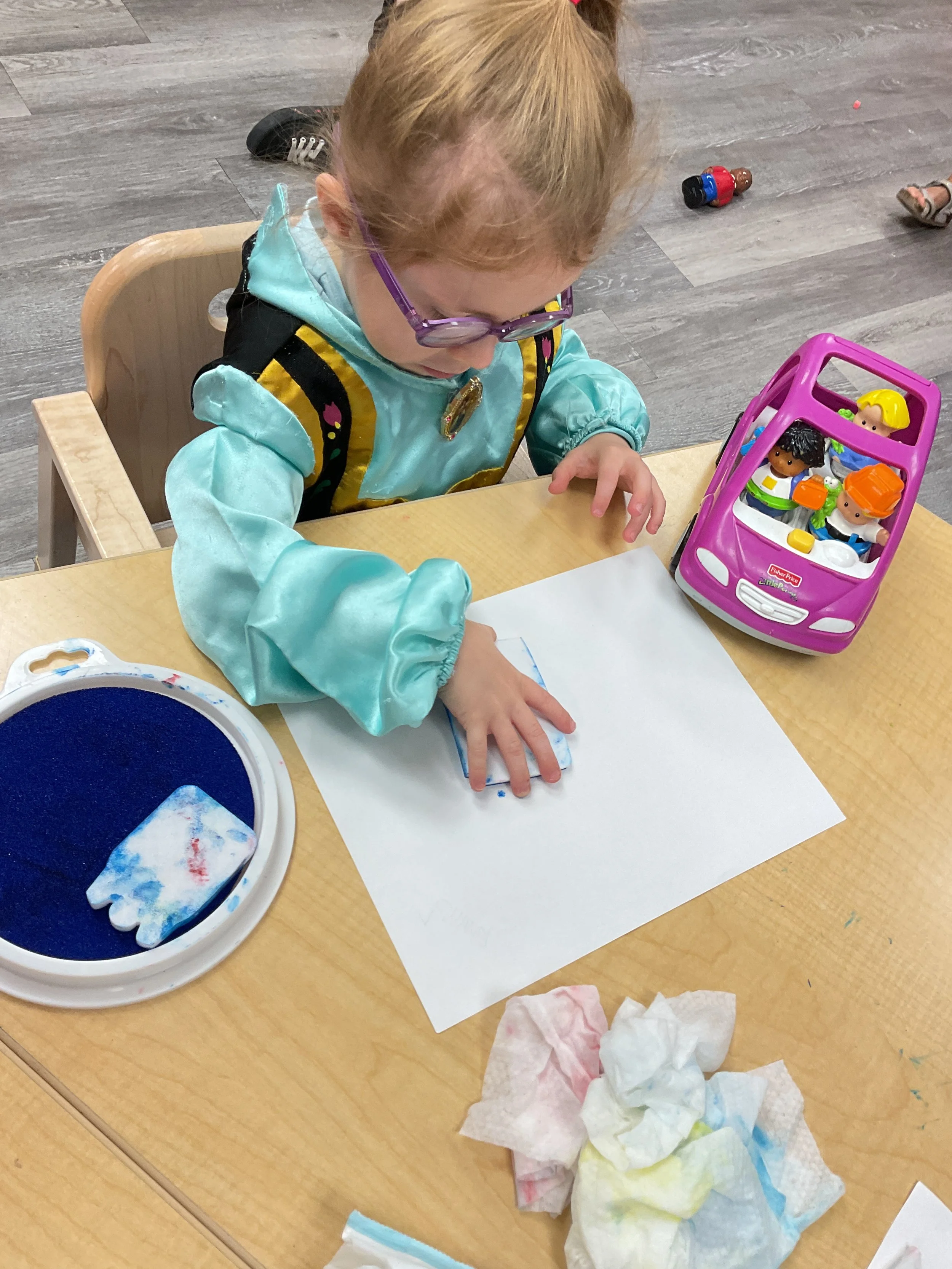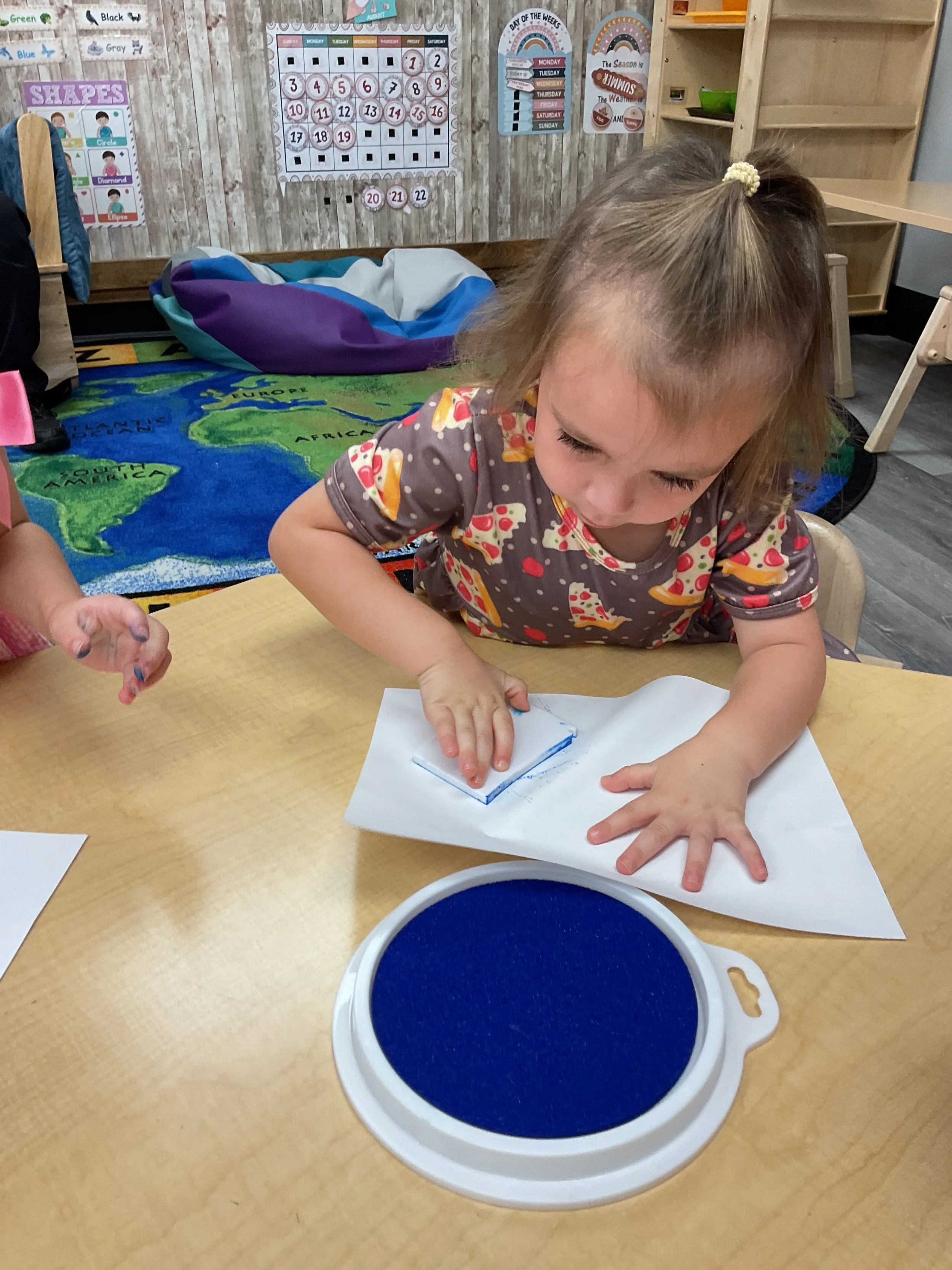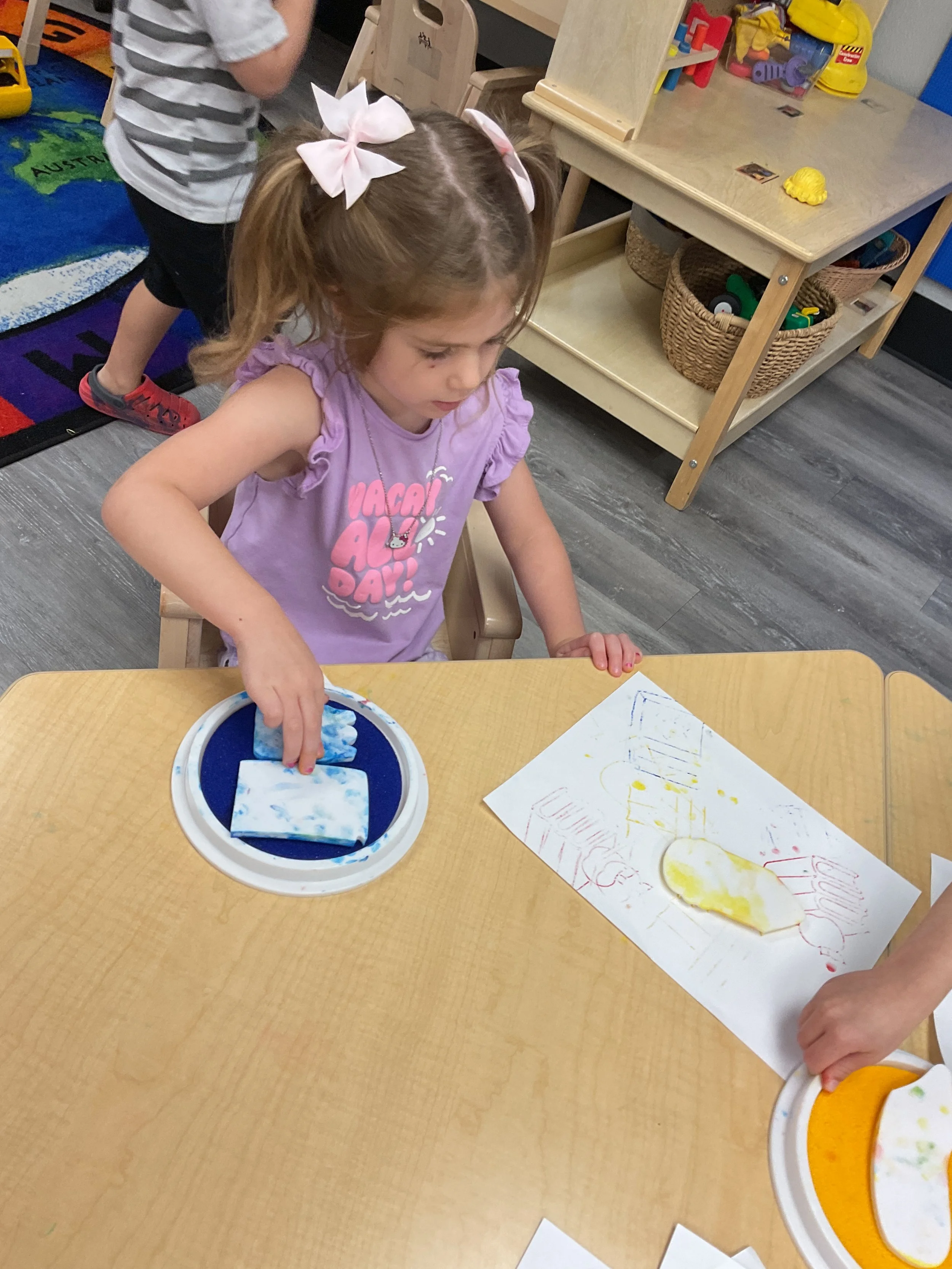 Welcome Back! We hope everyone had a wonderful summer! This morning, we read the book Mouse Loves School written by Lauren Thompson and illustrated by Buket Erdogan. Durning our music and movement time, we played with balloons! We made sure not to let them touch the floor and we played the game “The Floor is Lava”. Then, for our math and cognition lesson, we had to gather the correct amount of school supplies the number called for. Next, during our science and sensory lesson, we used stamps shaped like school supplies to make a back-to-school picture. Finally, for our fine motor and literacy lesson, we listened to a book on tape.