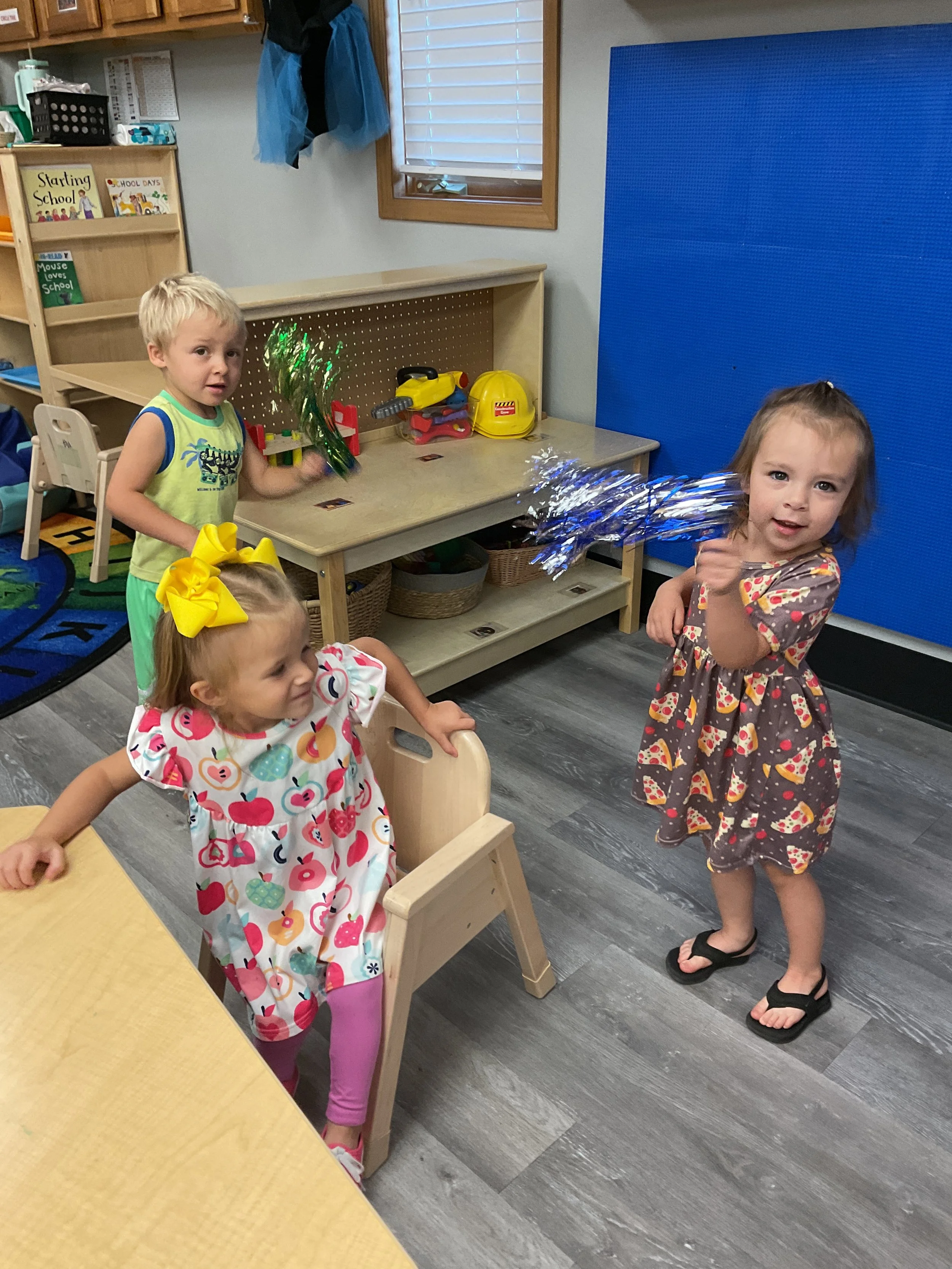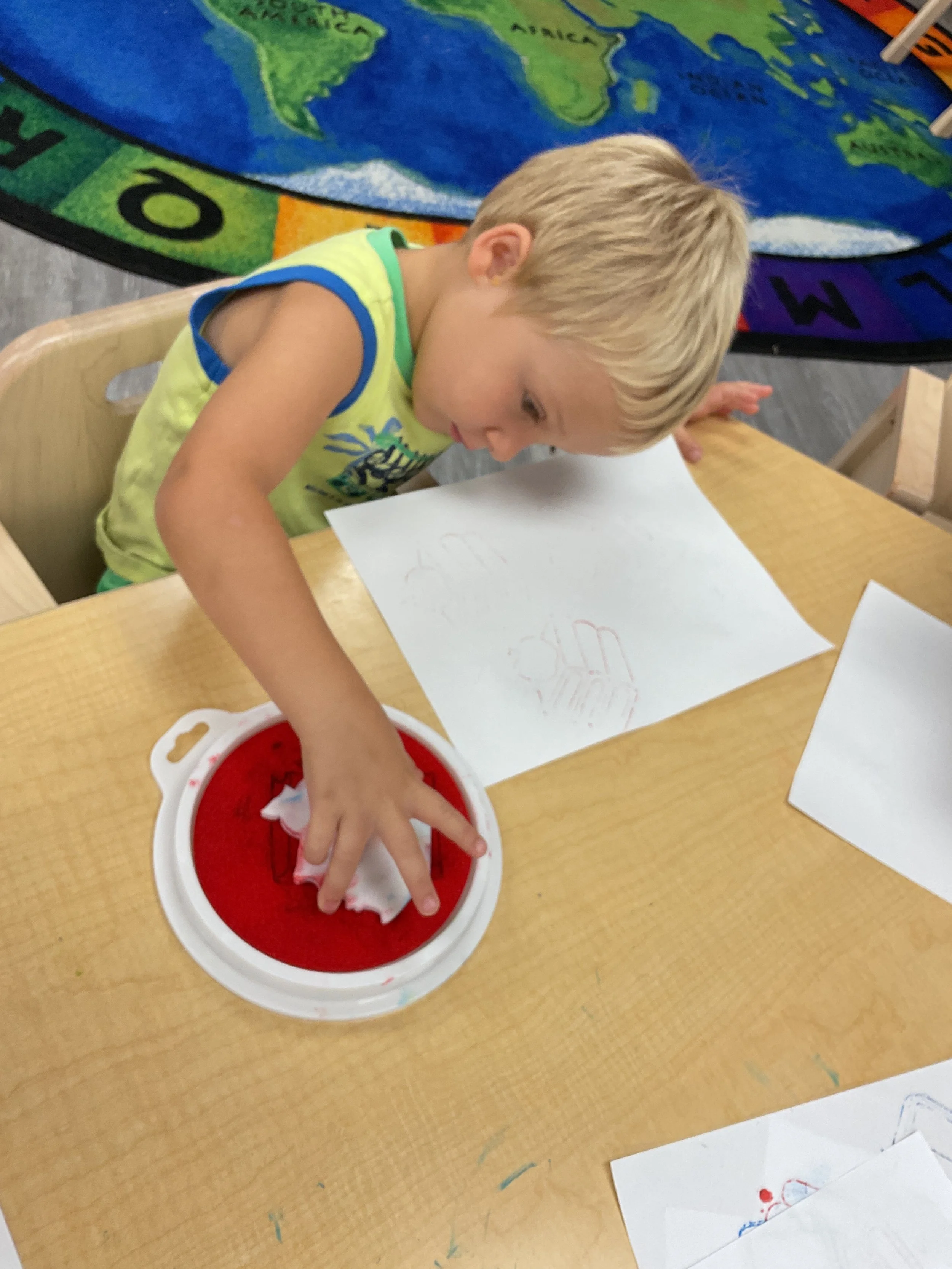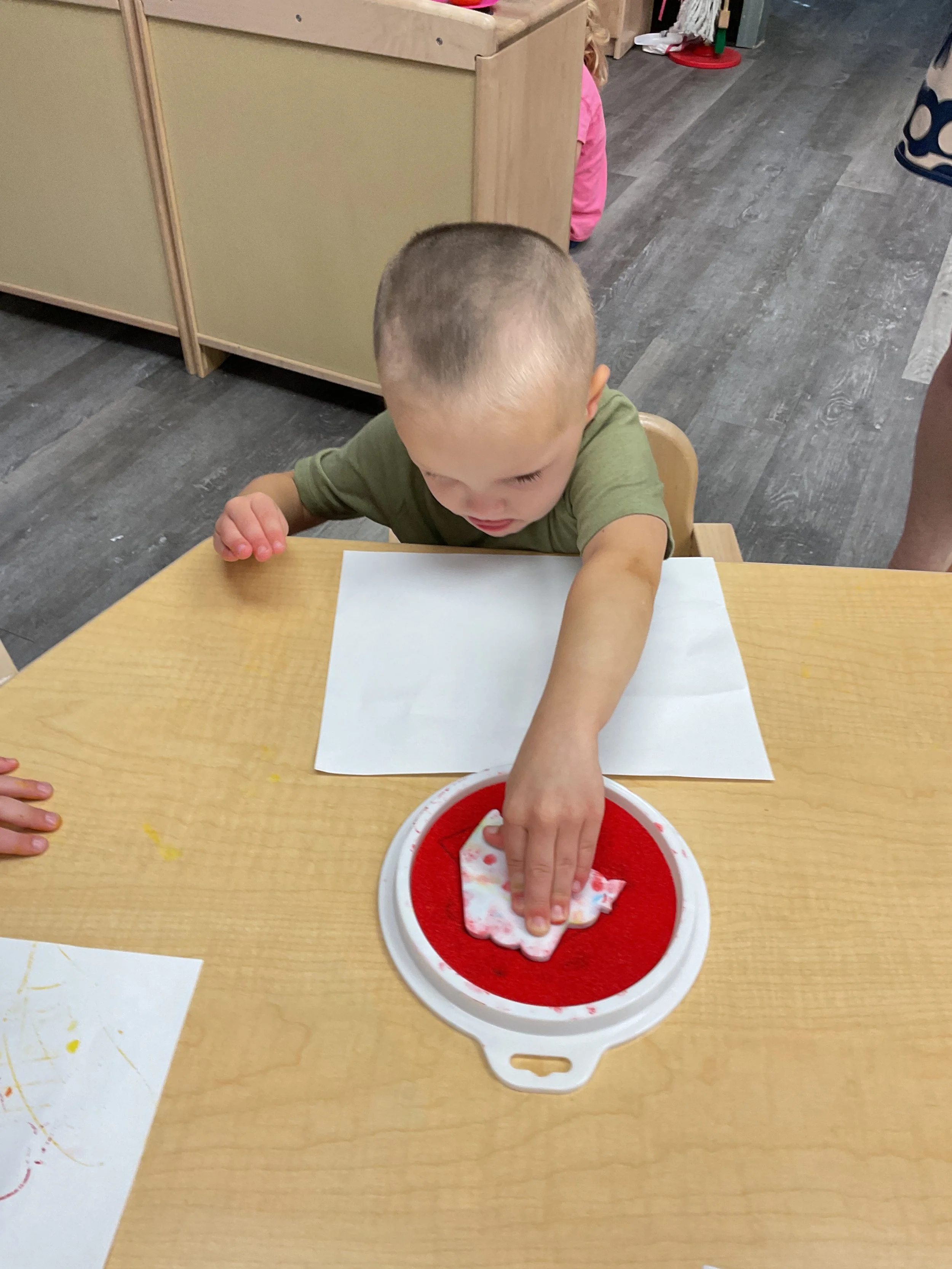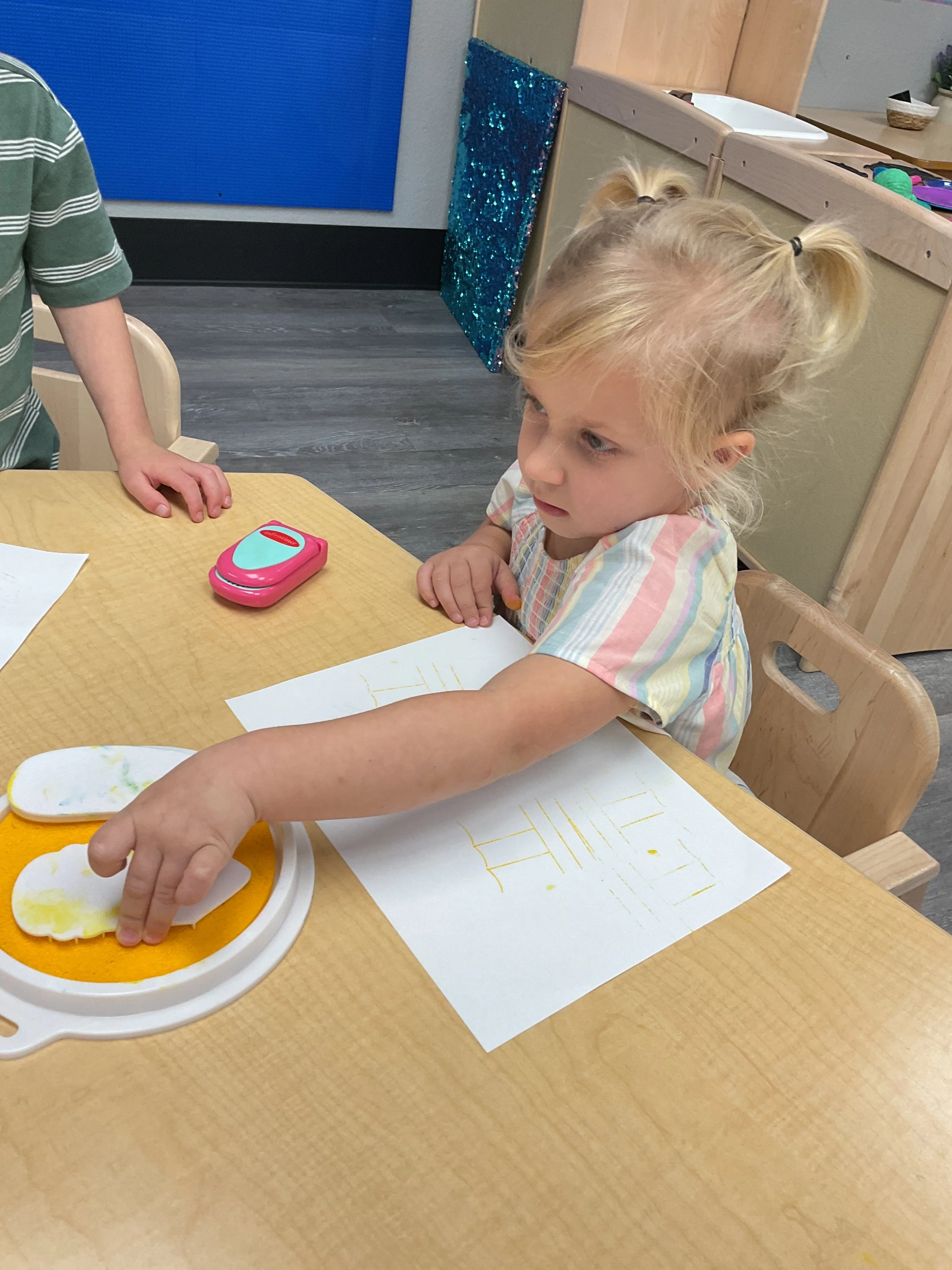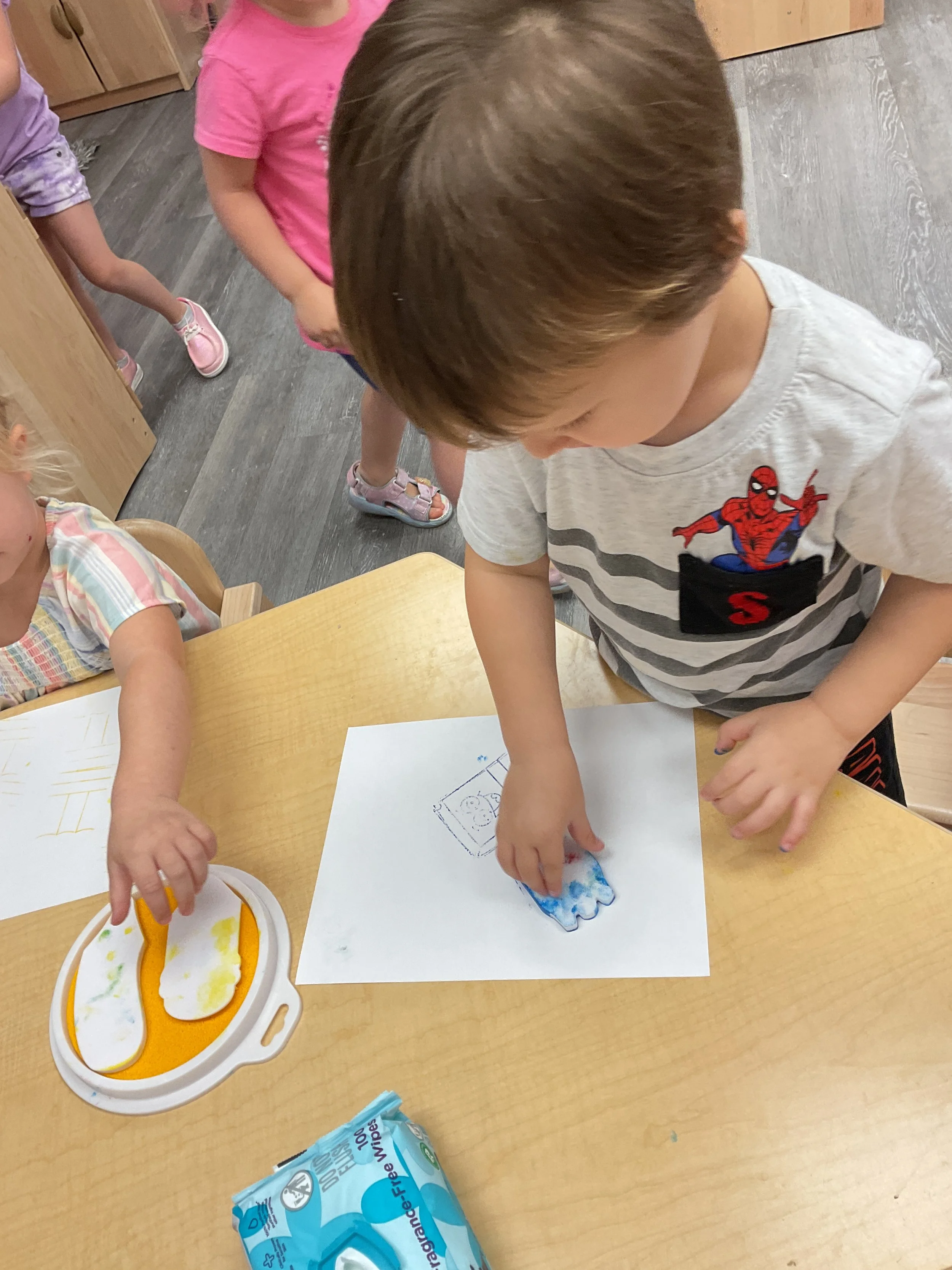 Welcome Back! We hope everyone had a wonderful summer! This morning, we read the book Mouse Loves School written by Lauren Thompson and illustrated by Buket Erdogan. Durning our music and movement time, we played with balloons! We made sure not to let them touch the floor and we played the game “The Floor is Lava”. Then, for our math and cognition lesson, we had to gather the correct amount of school supplies the number called for. Next, during our science and sensory lesson, we used stamps shaped like school supplies to make a back-to-school picture. Finally, for our fine motor and literacy lesson, we listened to a book on tape.