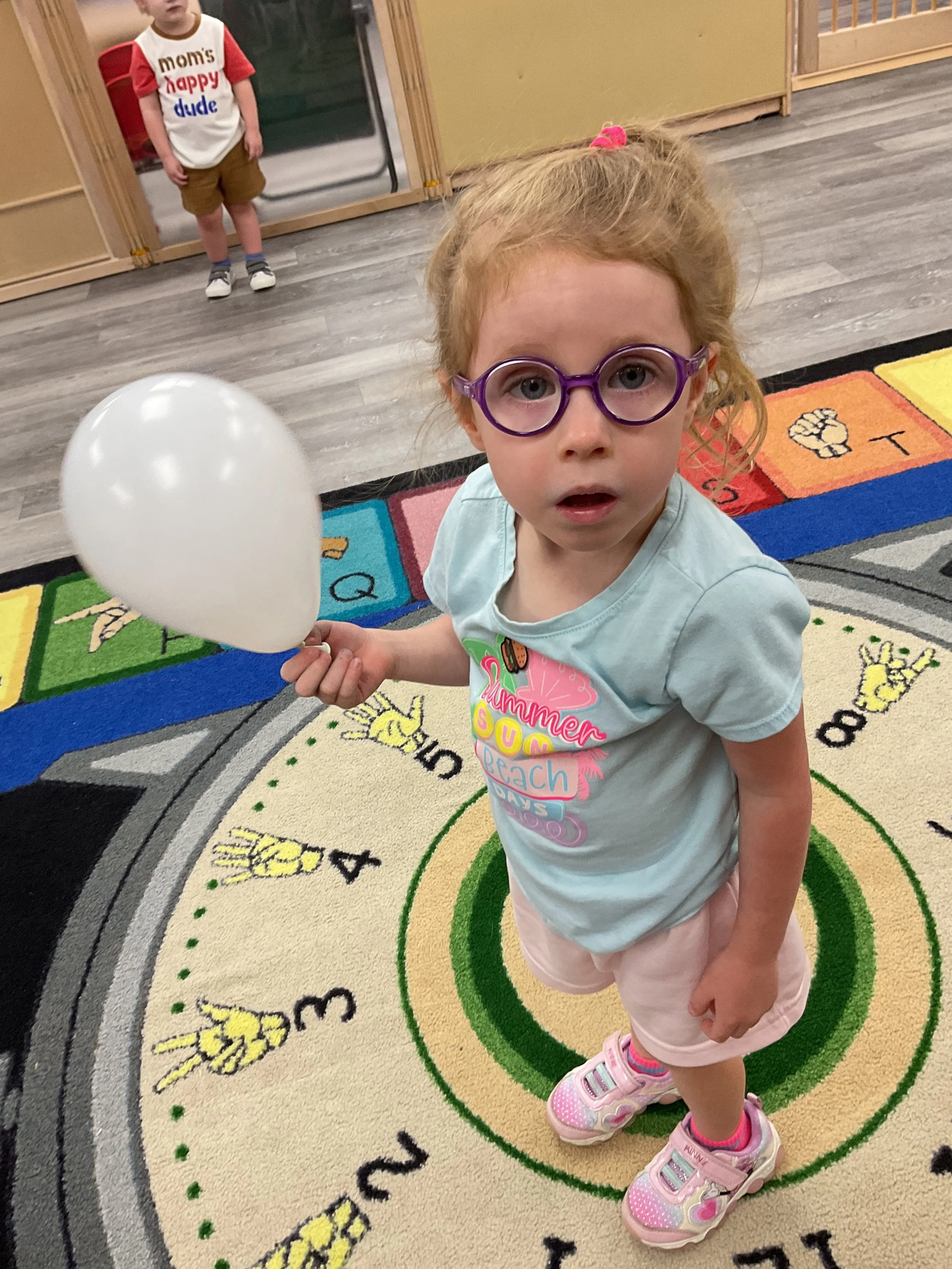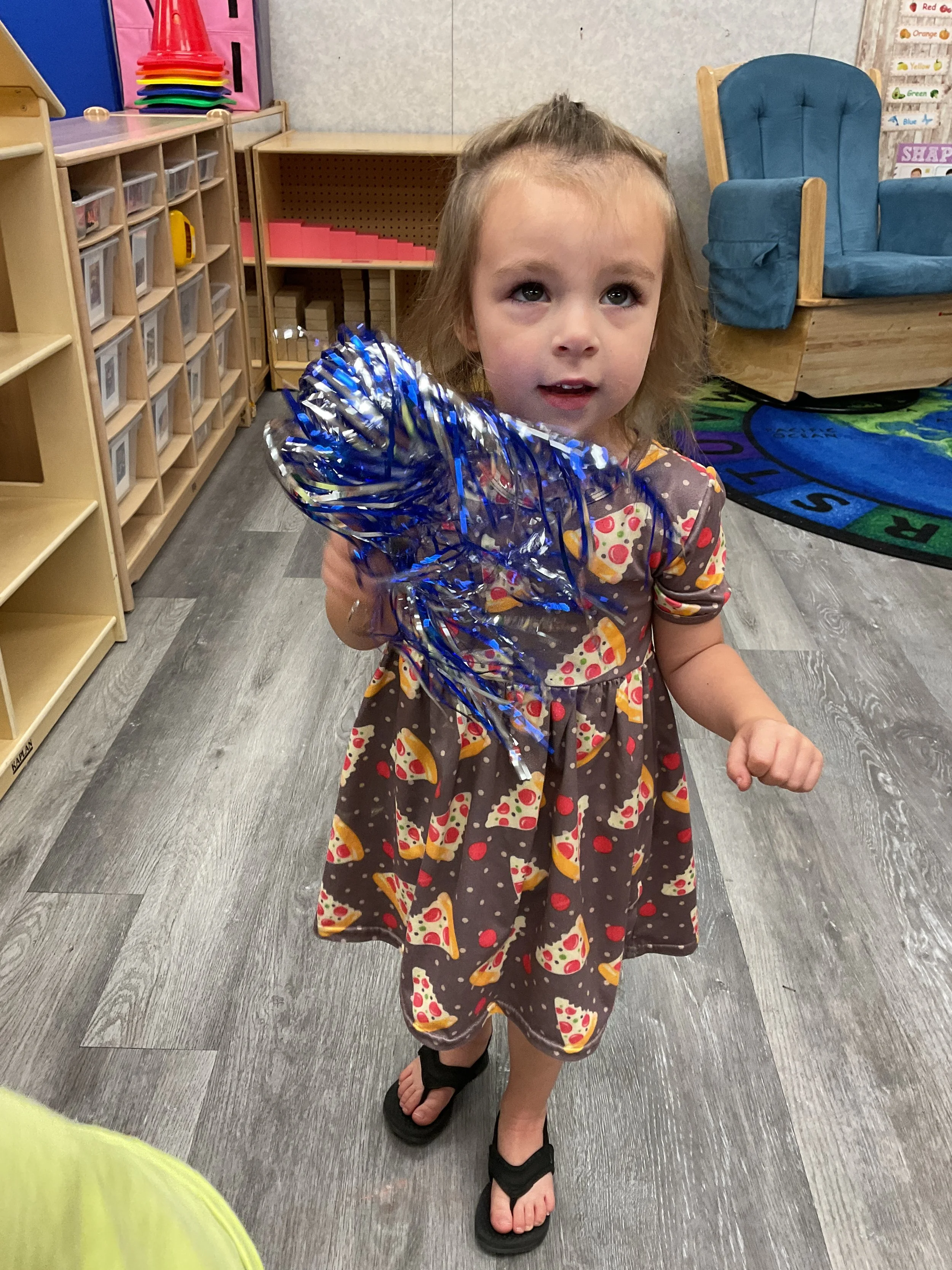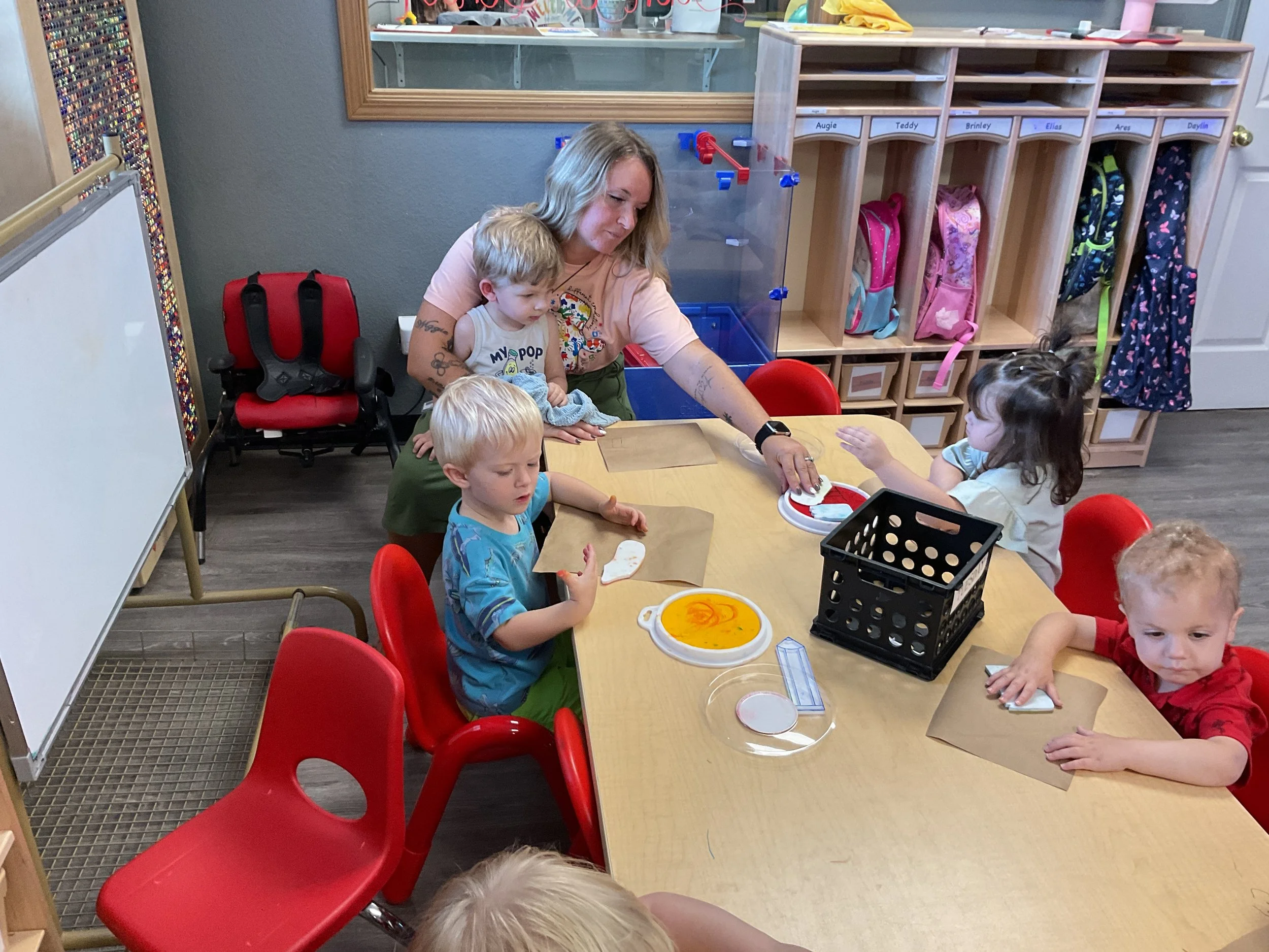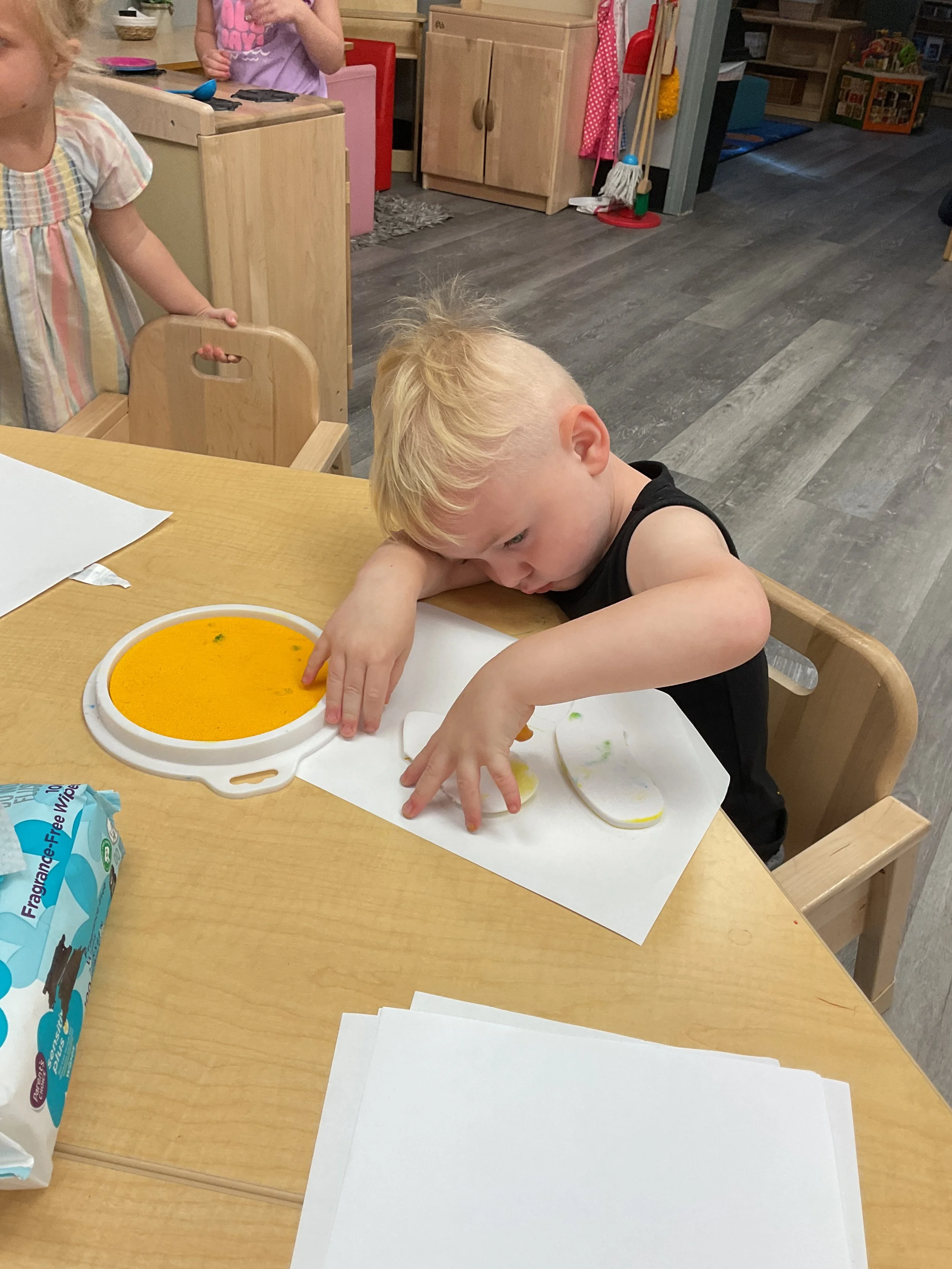 Welcome Back! We hope everyone had a wonderful summer! This morning, we read the book Mouse Loves School written by Lauren Thompson and illustrated by Buket Erdogan. Durning our music and movement time, we played with balloons! We made sure not to let them touch the floor and we played the game “The Floor is Lava”. Then, for our math and cognition lesson, we had to gather the correct amount of school supplies the number called for. Next, during our science and sensory lesson, we used stamps shaped like school supplies to make a back-to-school picture. Finally, for our fine motor and literacy lesson, we listened to a book on tape.