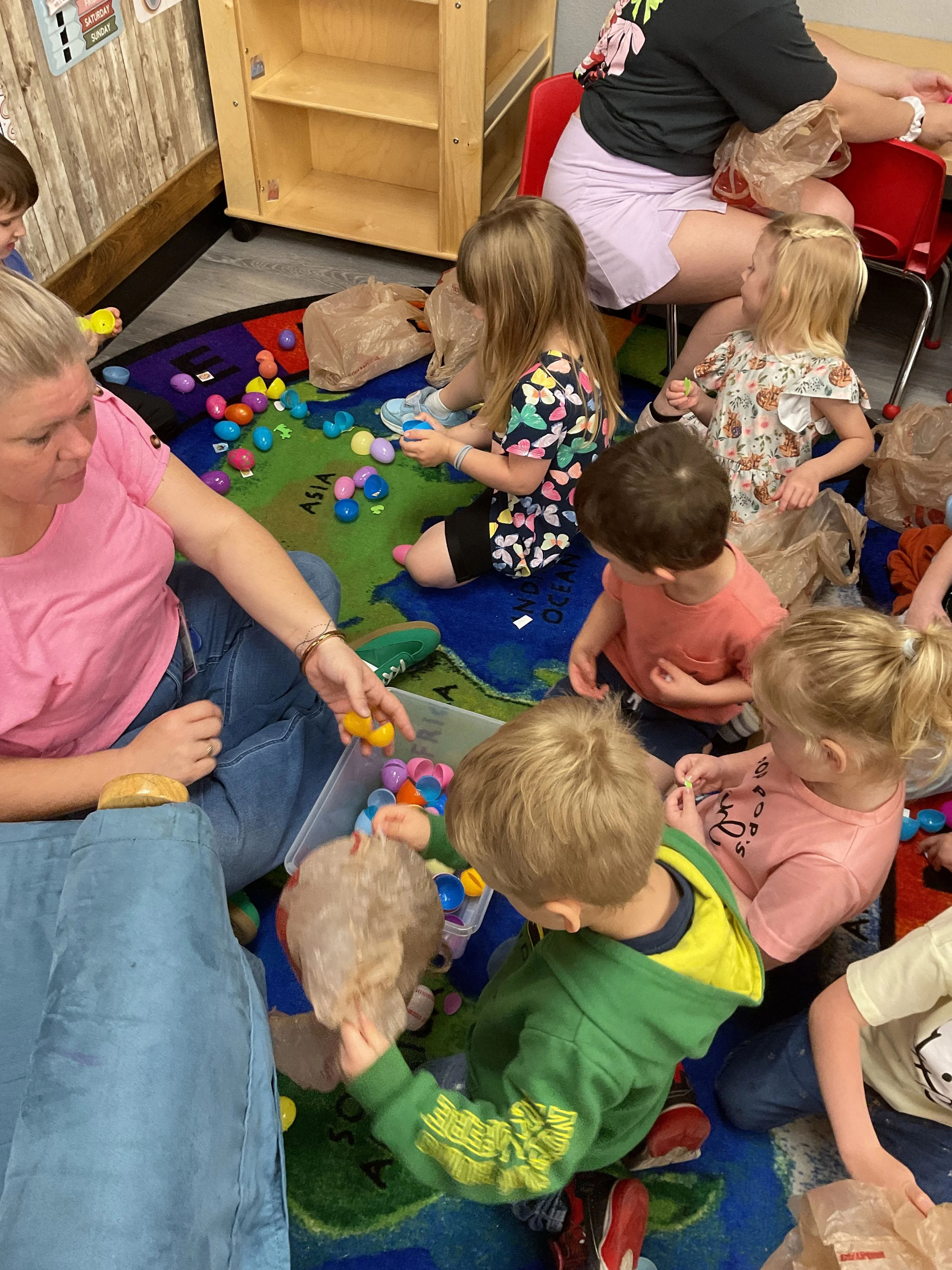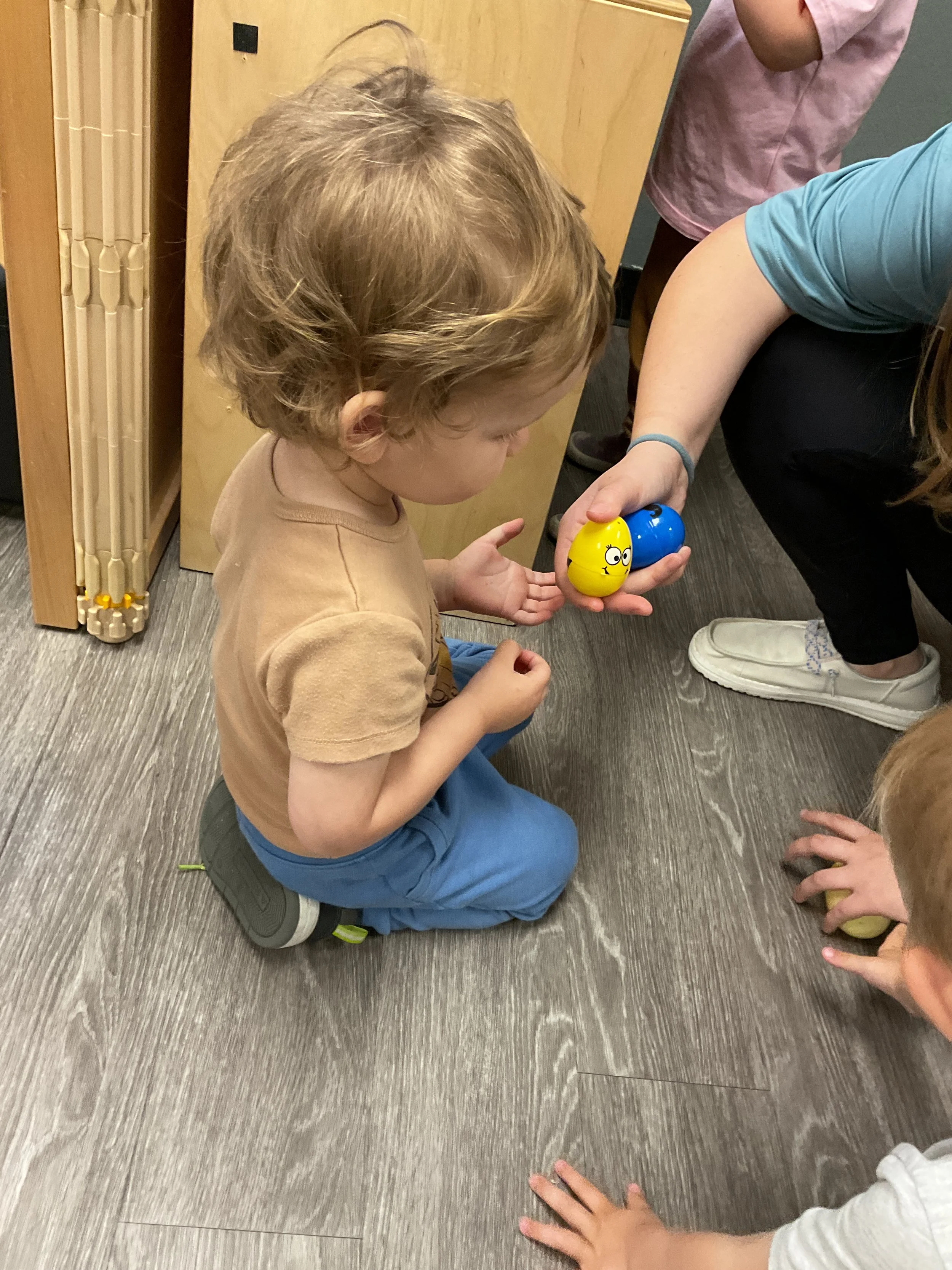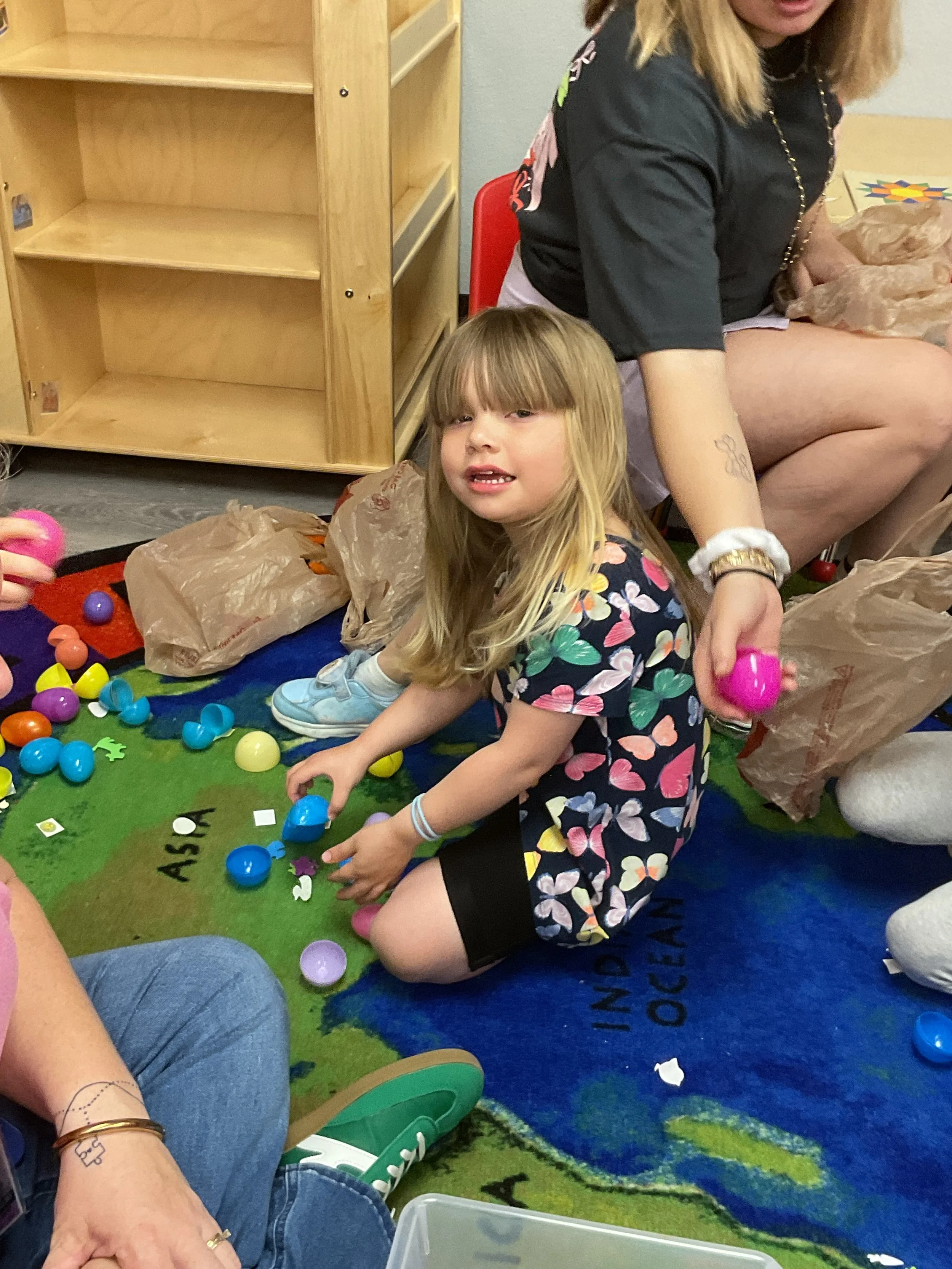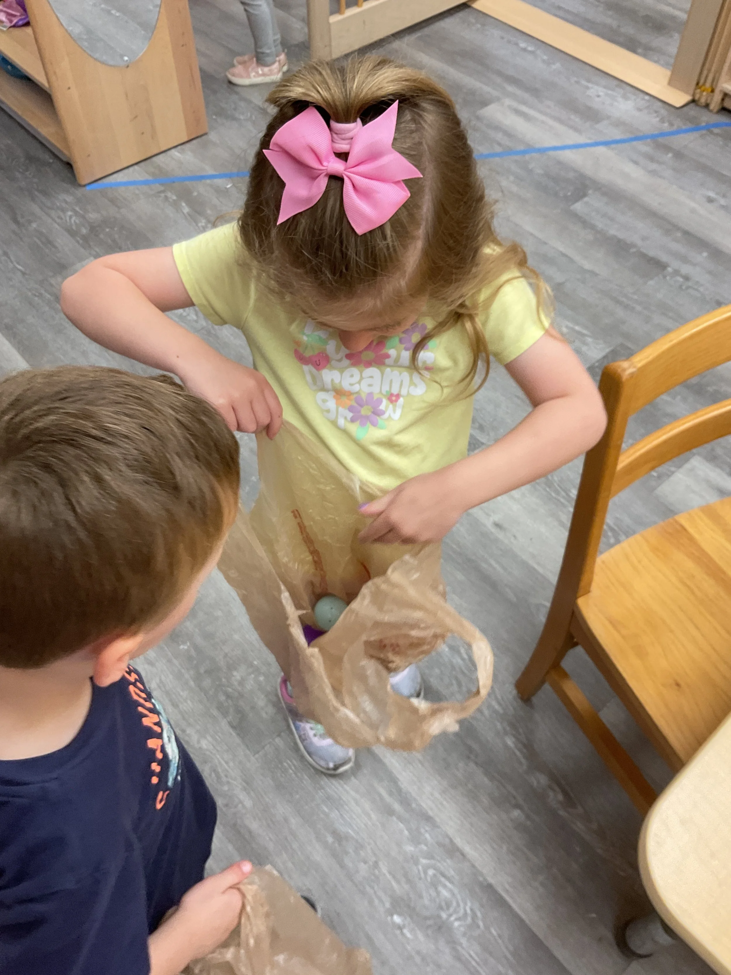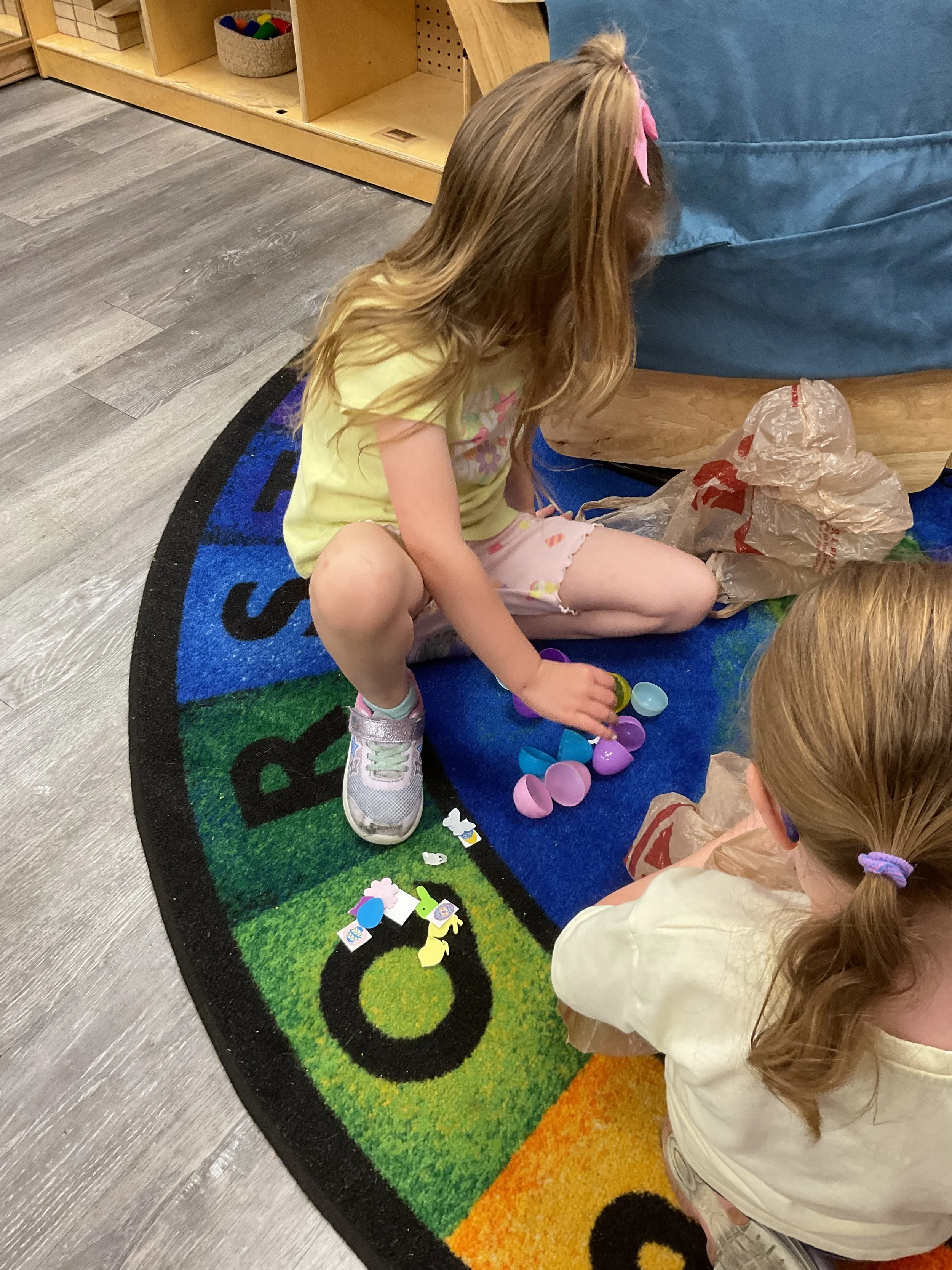 This morning, we read the book The Night Before Easter written by Natasha Wing and illustrated by Kathy Couri. During our music and movement time, we did yoga, some Danny Go, and the Roller Coaster song. Then, during our math and cognition lesson, we did paper weaving. Next, for our science and sensory lesson, we used playdough to make bunnies and eggs. Finally, for our literacy and fine motor lesson, we sharpened our cutting skills. The highlight of our day was our Easter Egg hunt!