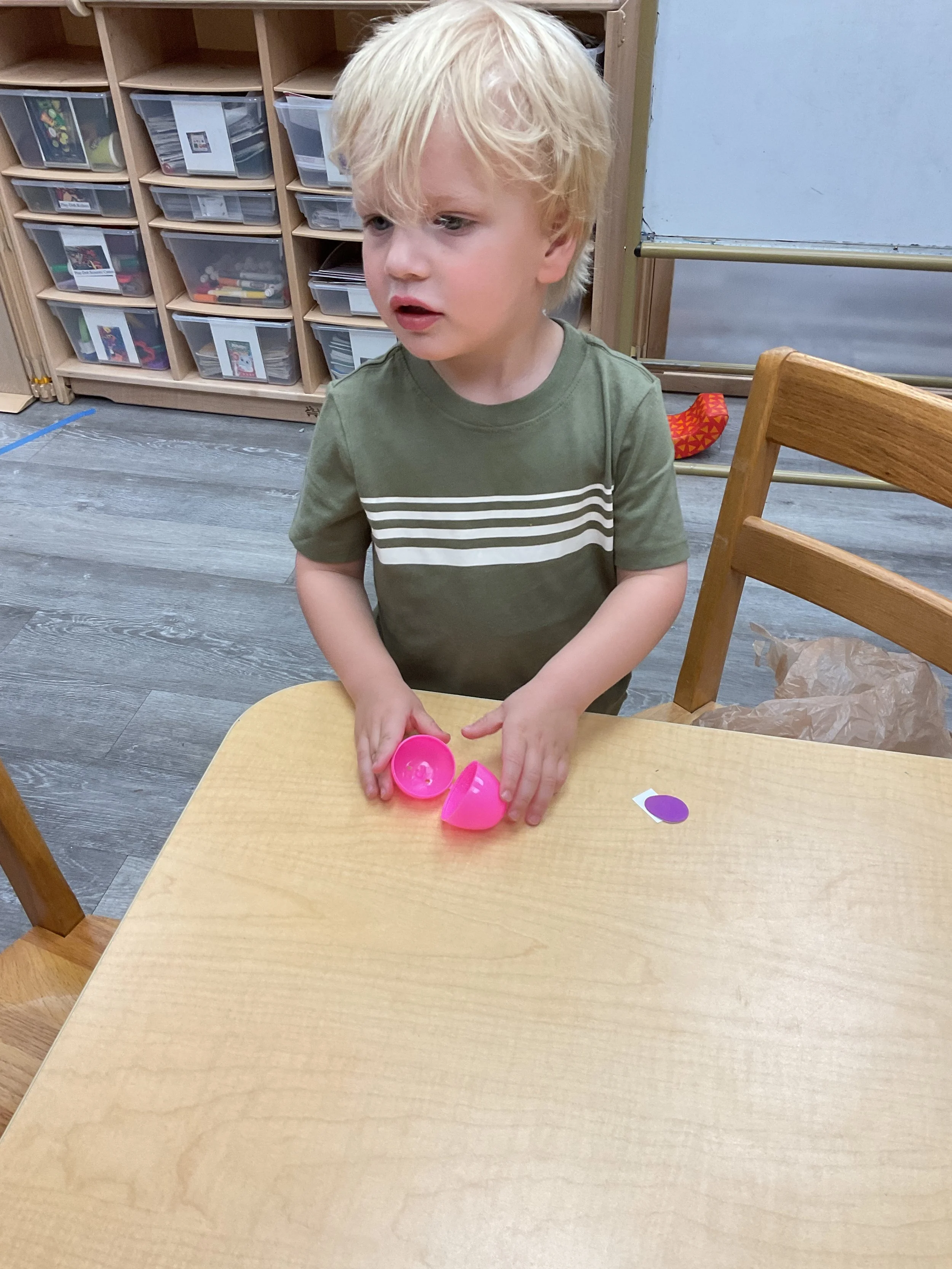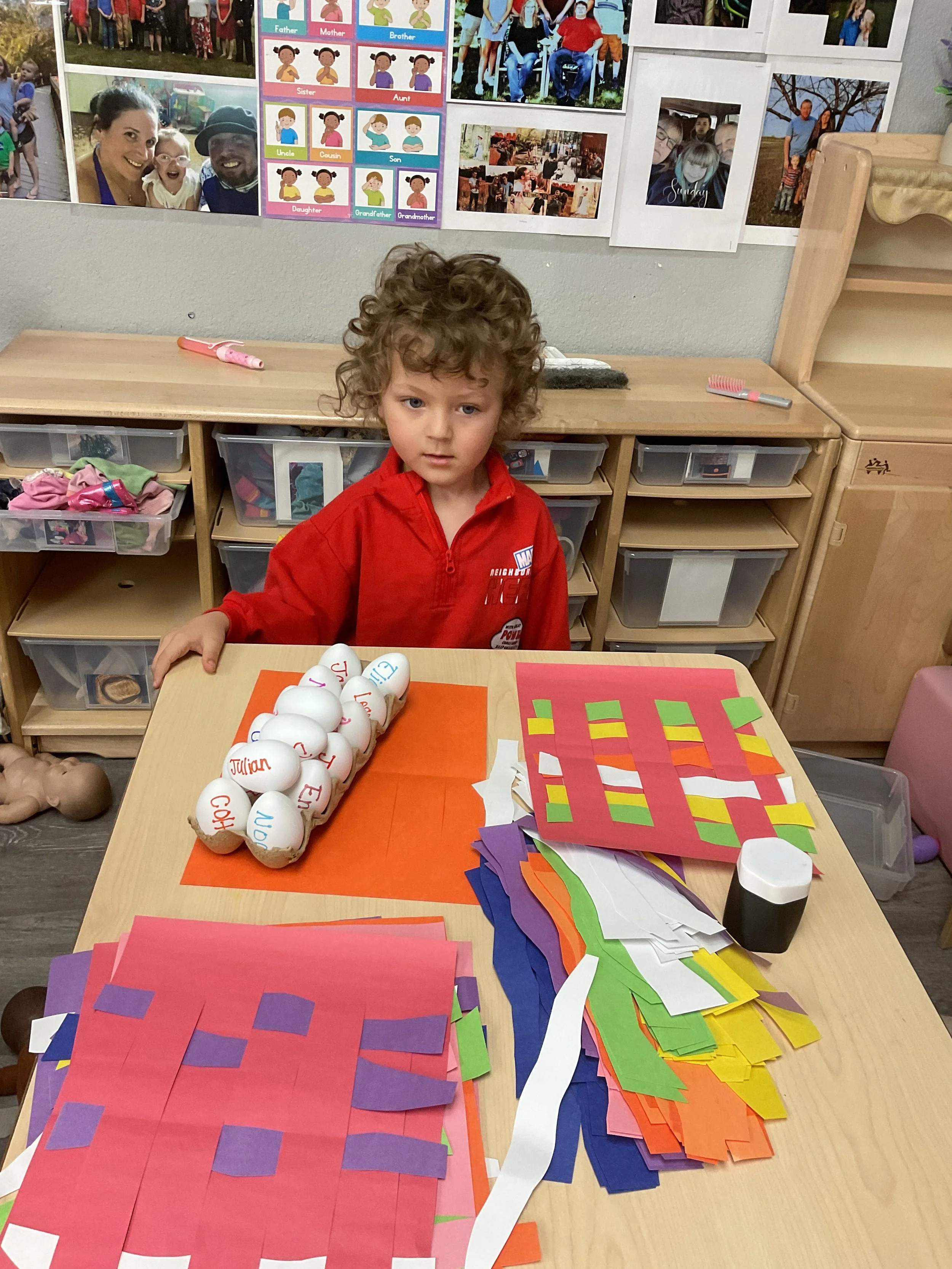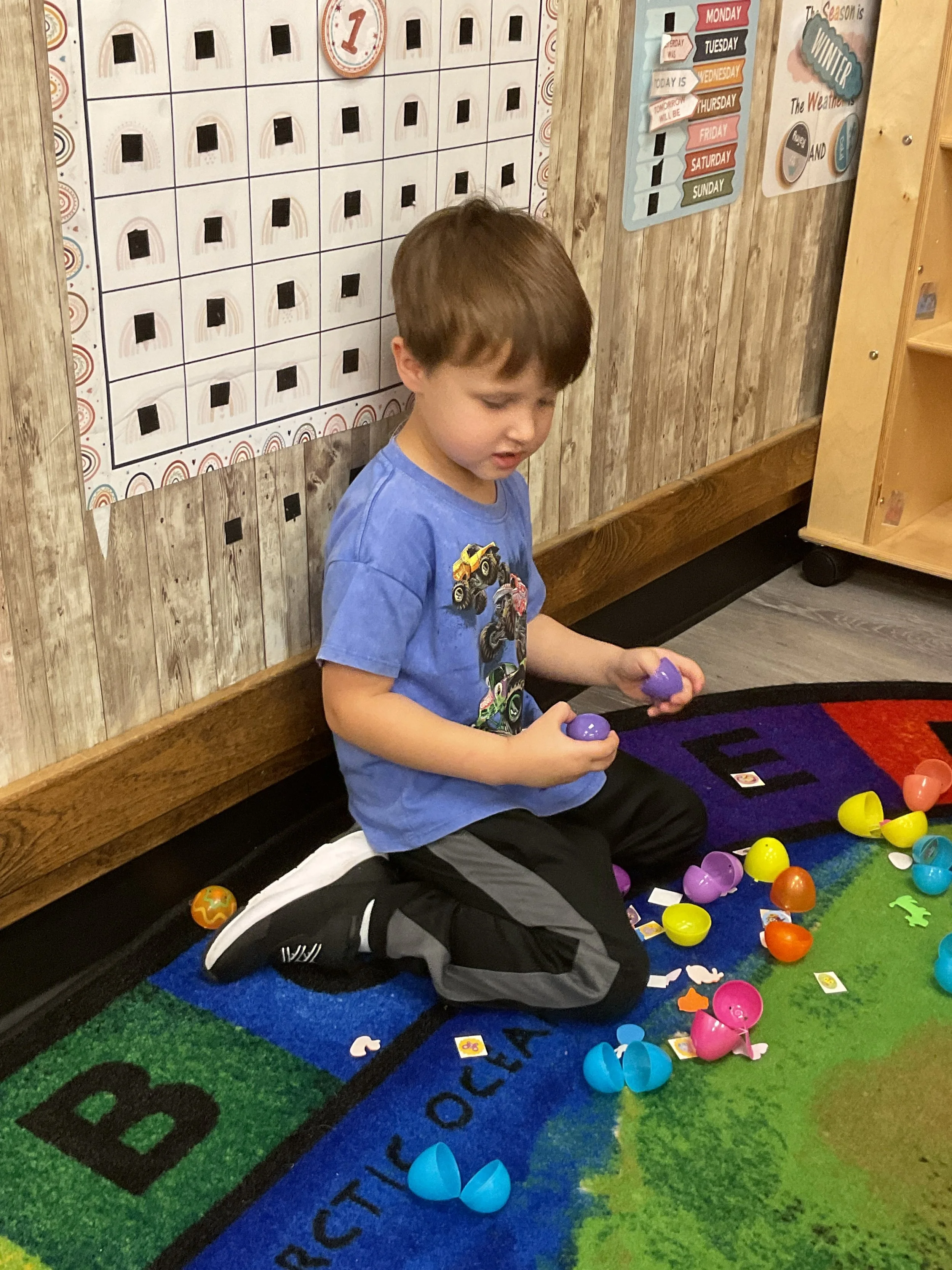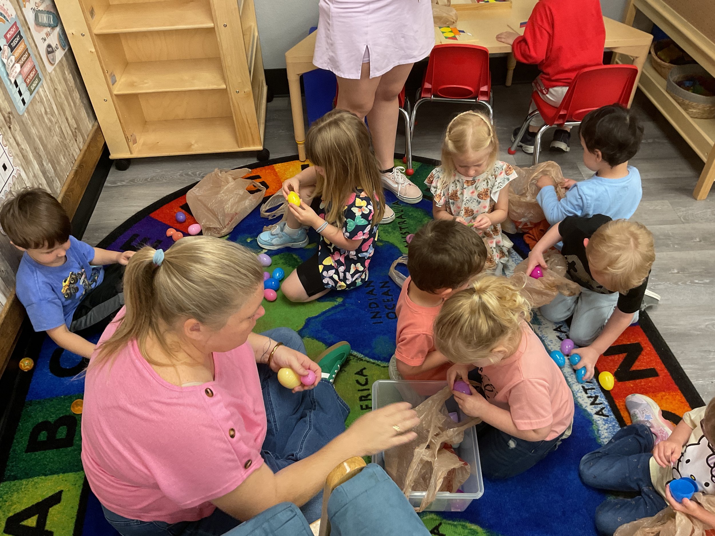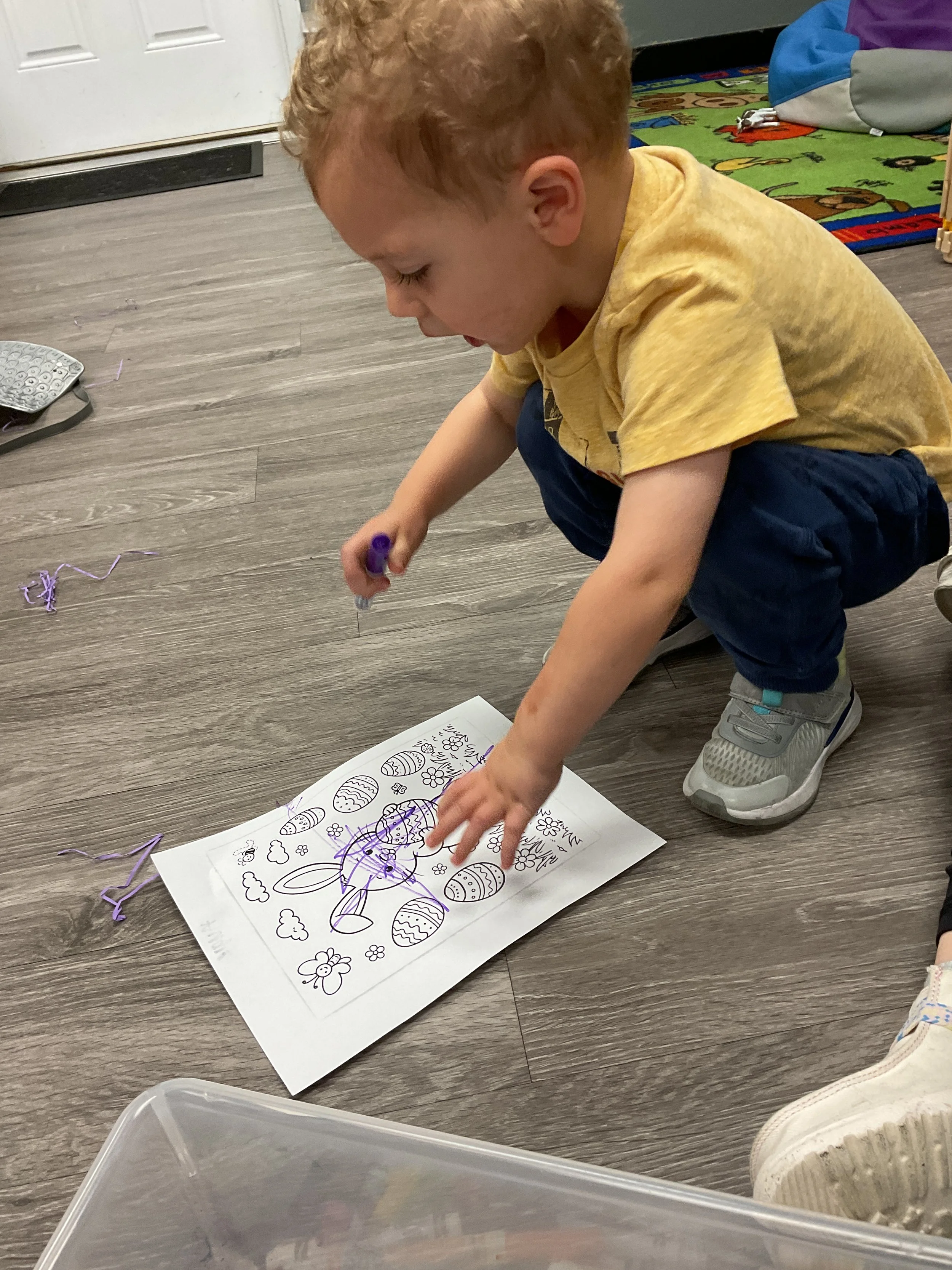This morning, we read the book The Night Before Easter written by Natasha Wing and illustrated by Kathy Couri. During our music and movement time, we did yoga, some Danny Go, and the Roller Coaster song. Then, during our math and cognition lesson, we did paper weaving. Next, for our science and sensory lesson, we used playdough to make bunnies and eggs. Finally, for our literacy and fine motor lesson, we sharpened our cutting skills. The highlight of our day was our Easter Egg hunt!