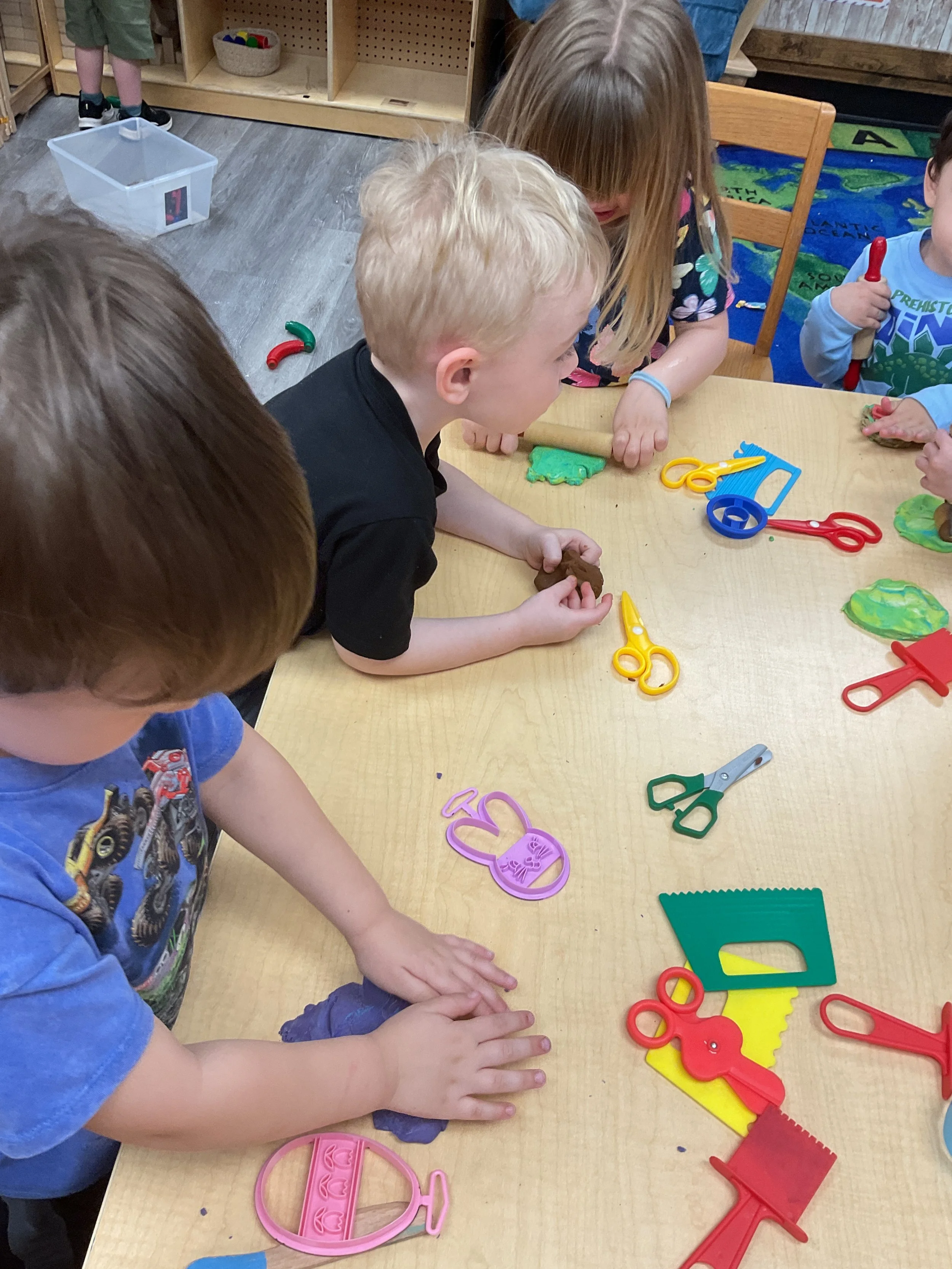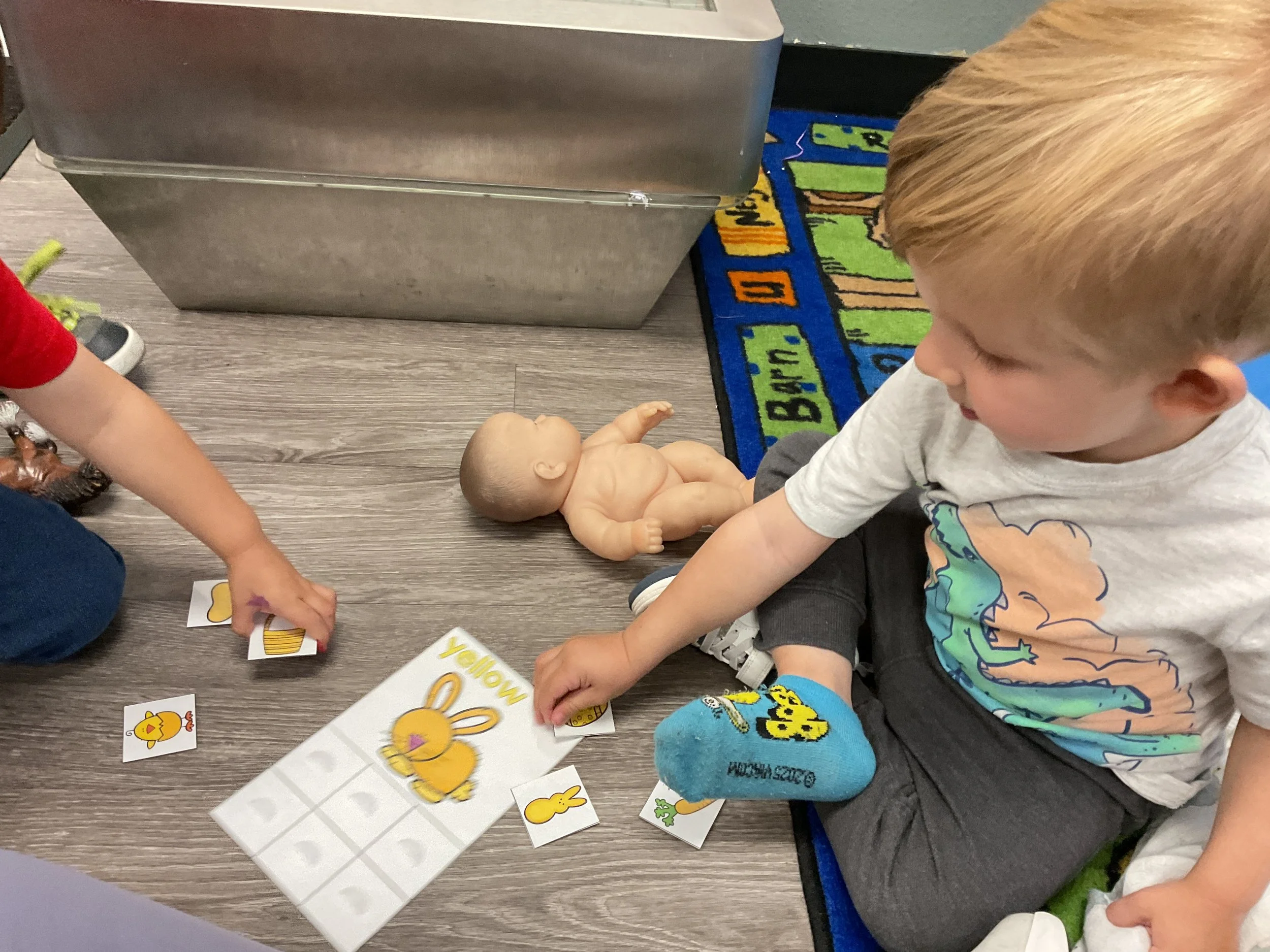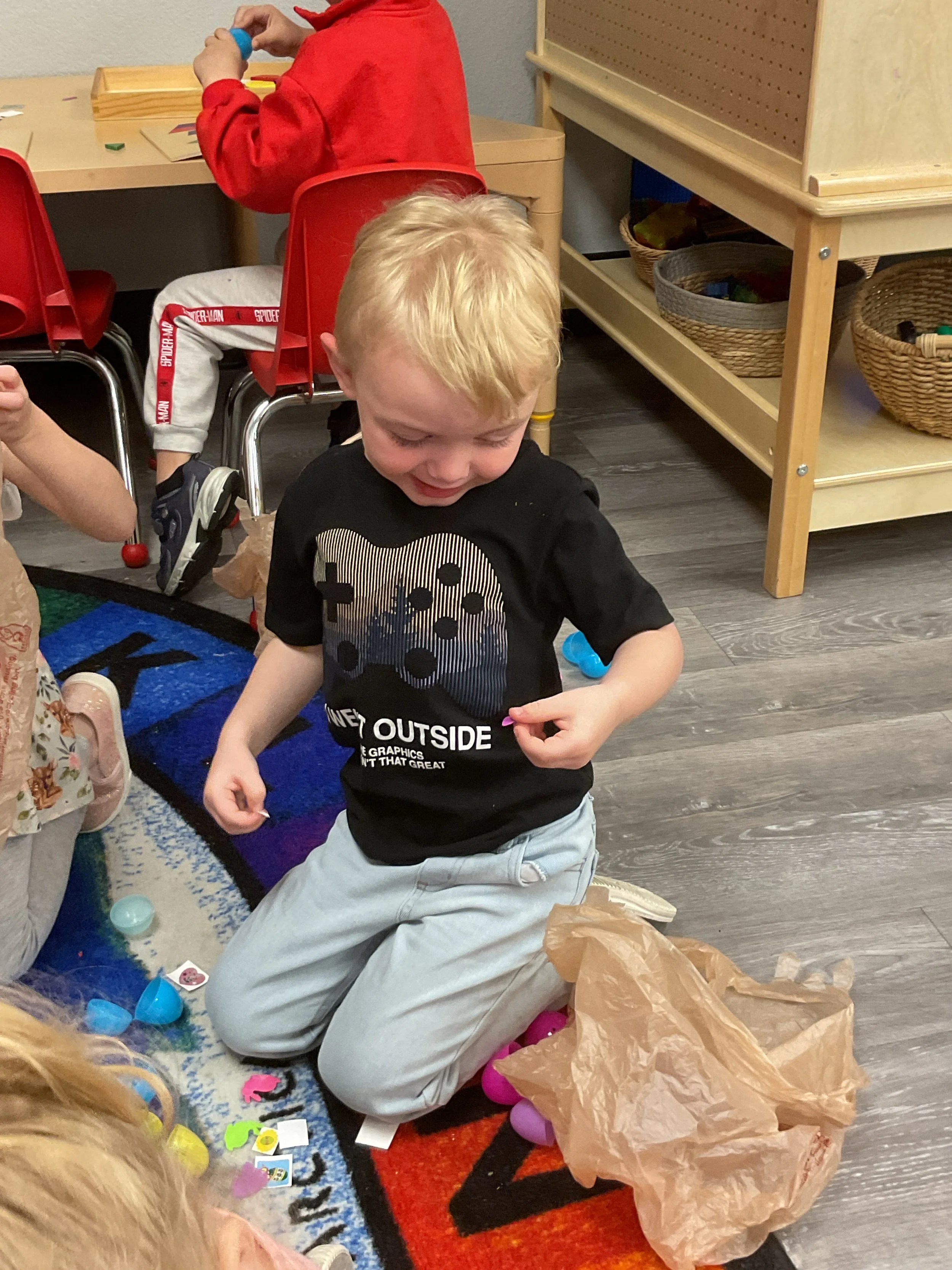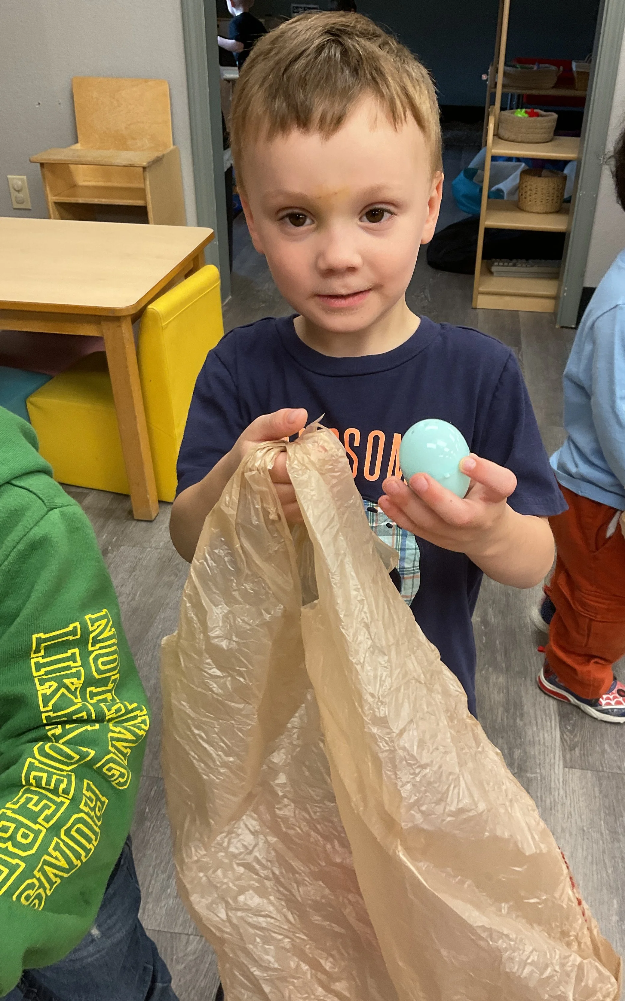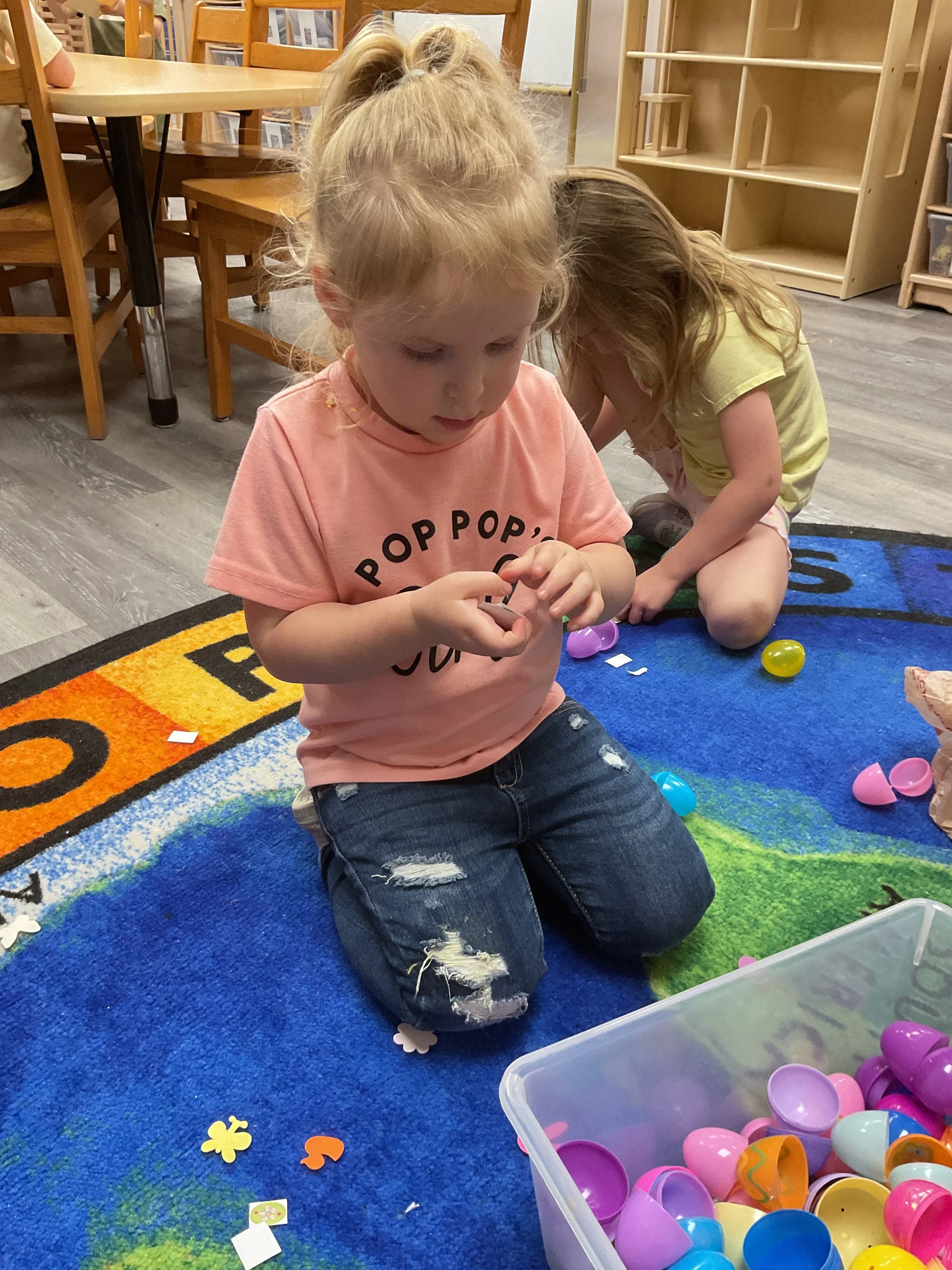 This morning, we read the book The Night Before Easter written by Natasha Wing and illustrated by Kathy Couri. During our music and movement time, we did yoga, some Danny Go, and the Roller Coaster song. Then, during our math and cognition lesson, we did paper weaving. Next, for our science and sensory lesson, we used playdough to make bunnies and eggs. Finally, for our literacy and fine motor lesson, we sharpened our cutting skills. The highlight of our day was our Easter Egg hunt!