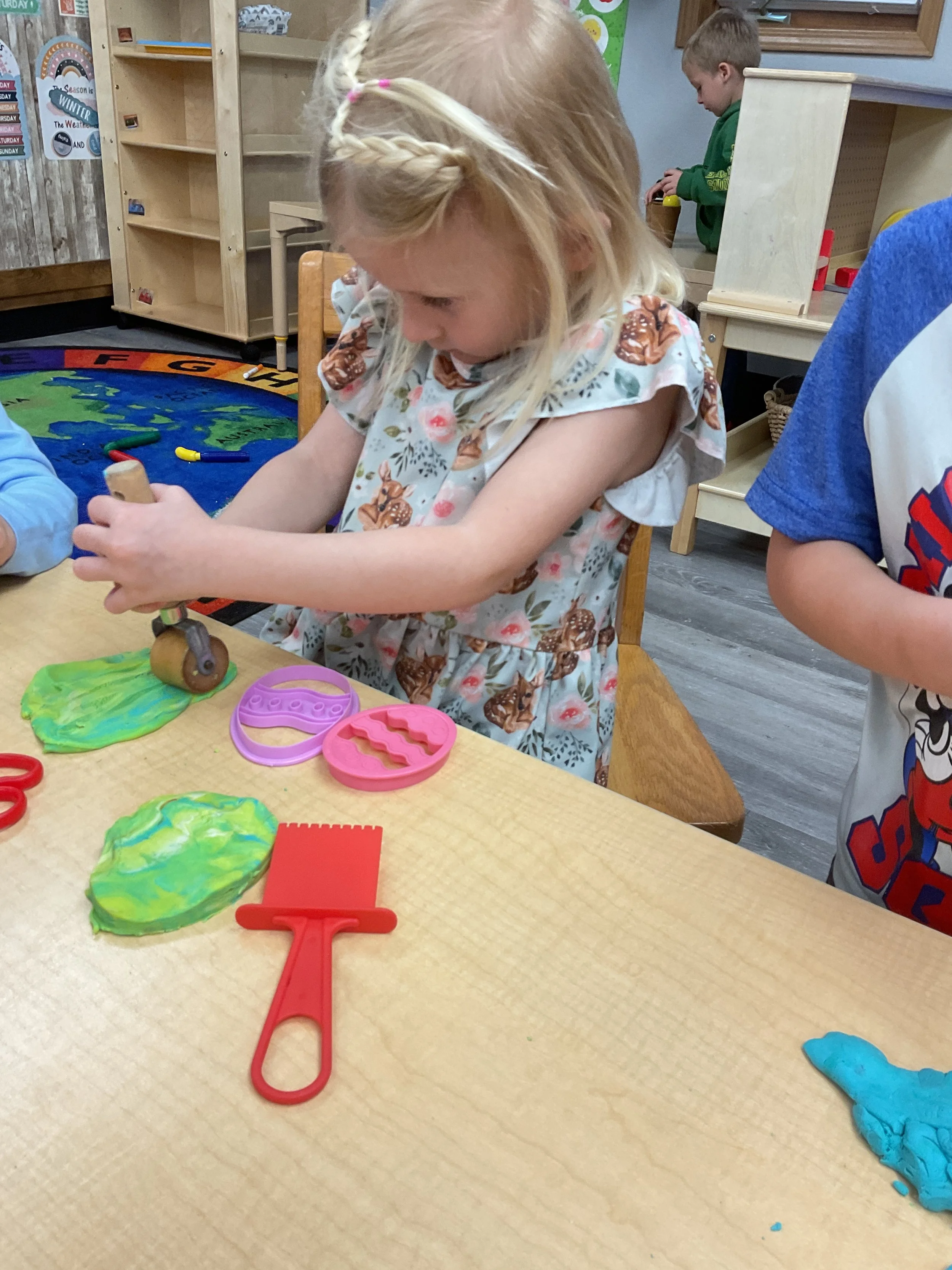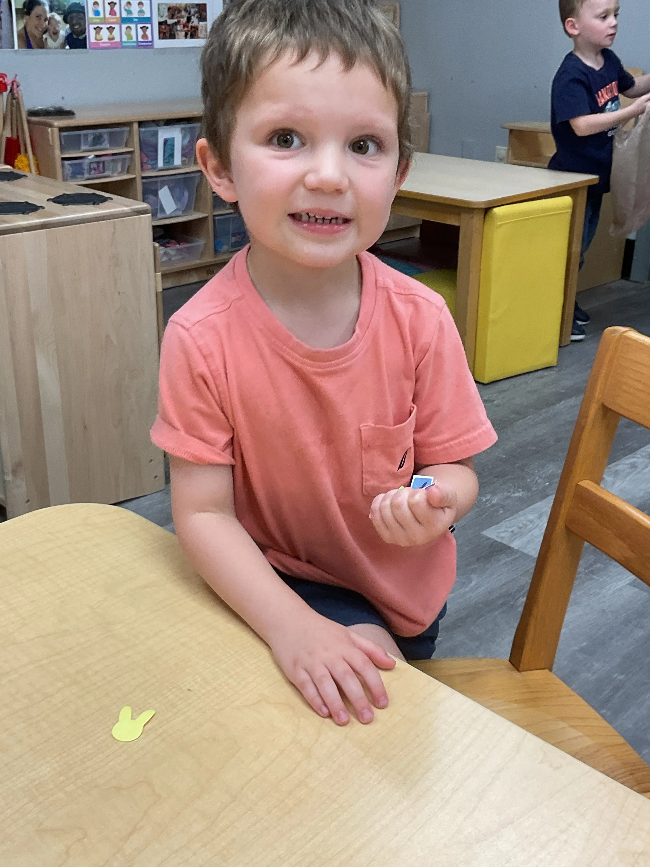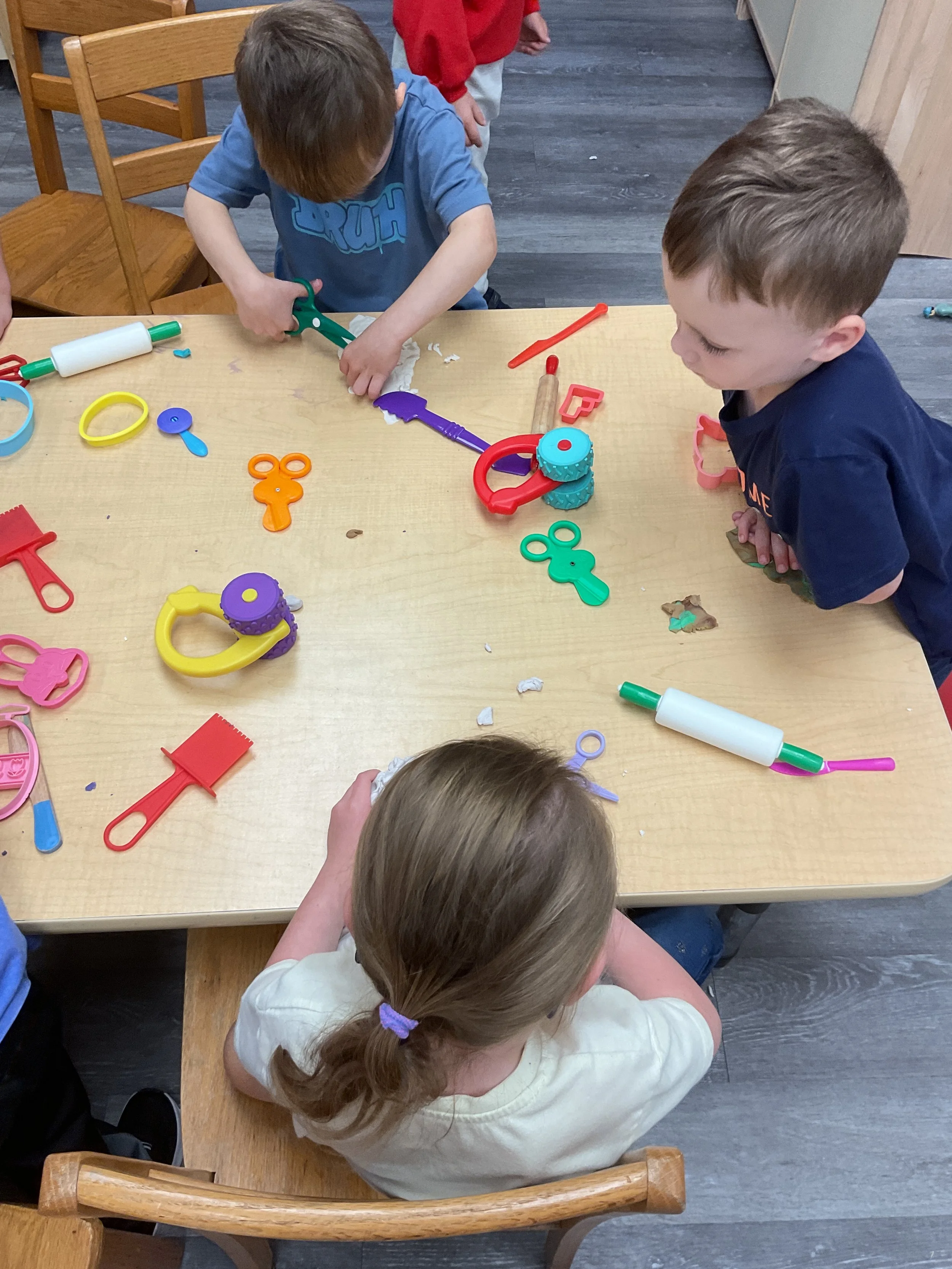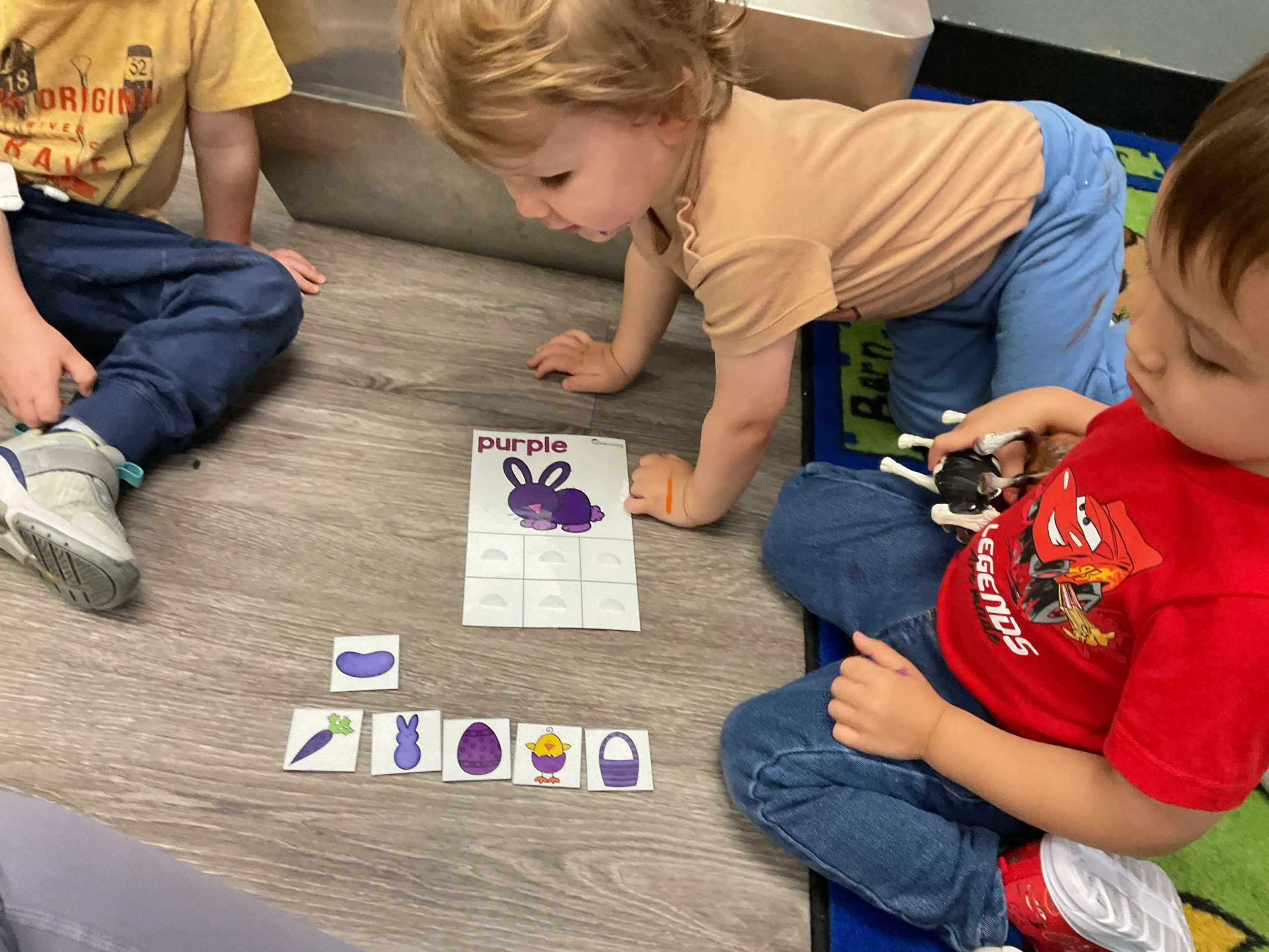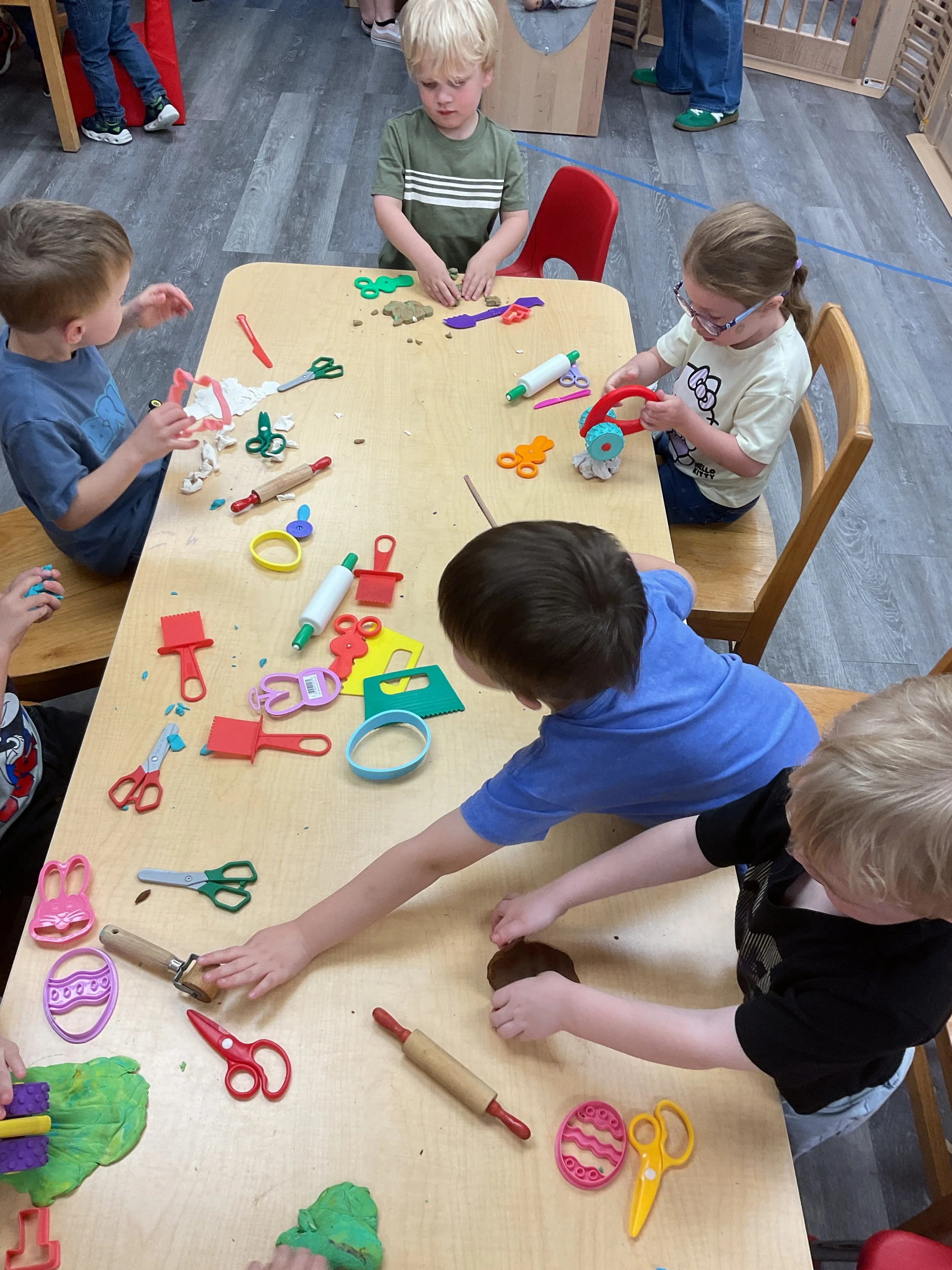 This morning, we read the book The Night Before Easter written by Natasha Wing and illustrated by Kathy Couri. During our music and movement time, we did yoga, some Danny Go, and the Roller Coaster song. Then, during our math and cognition lesson, we did paper weaving. Next, for our science and sensory lesson, we used playdough to make bunnies and eggs. Finally, for our literacy and fine motor lesson, we sharpened our cutting skills. The highlight of our day was our Easter Egg hunt!
