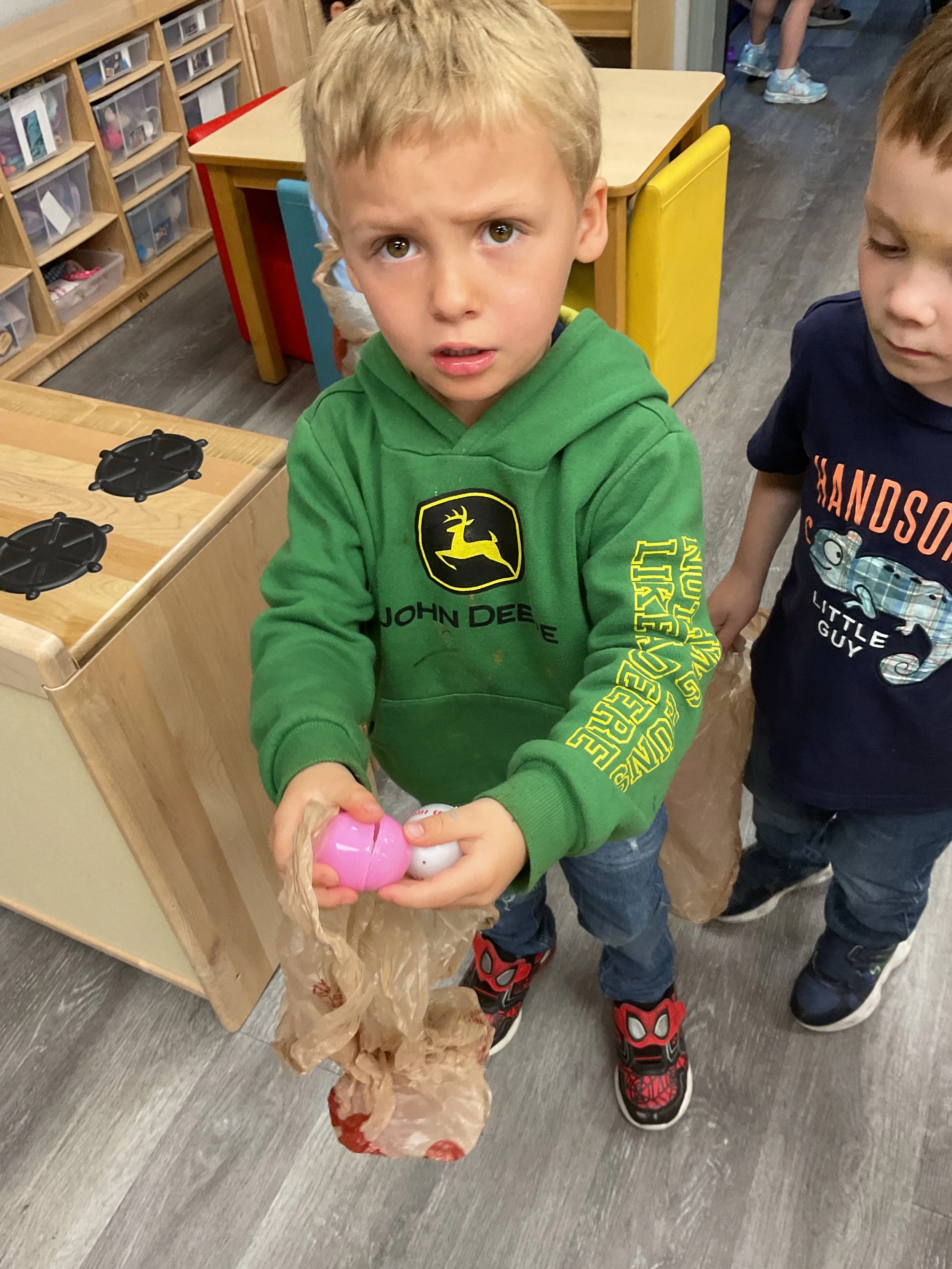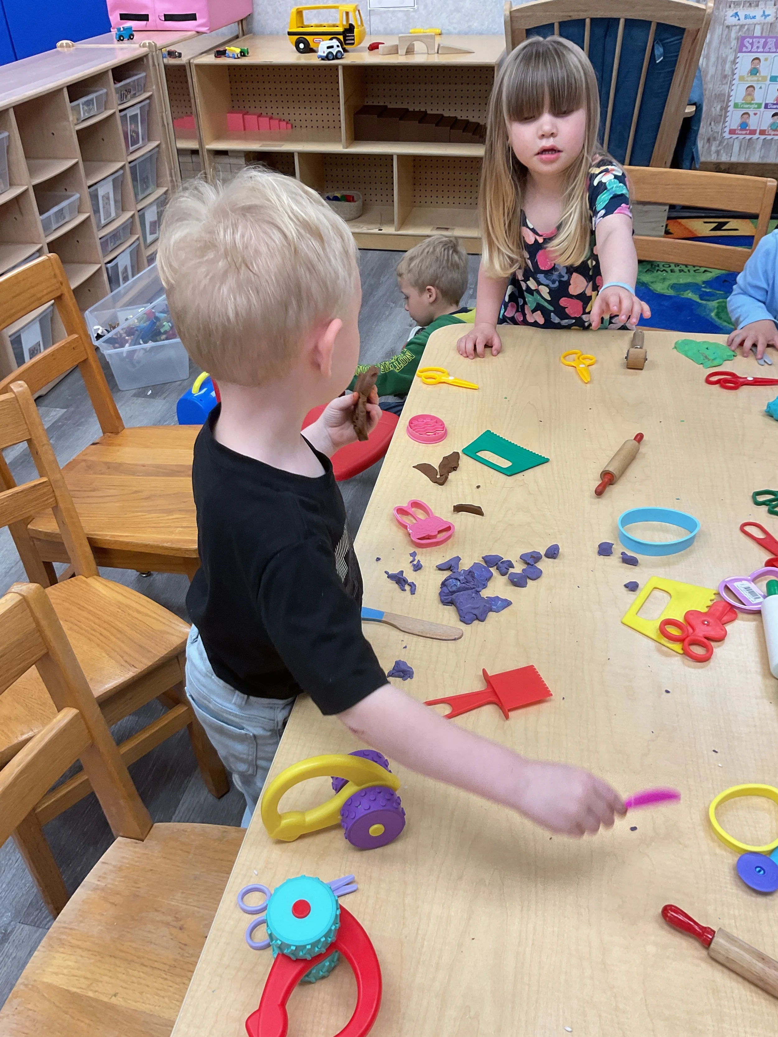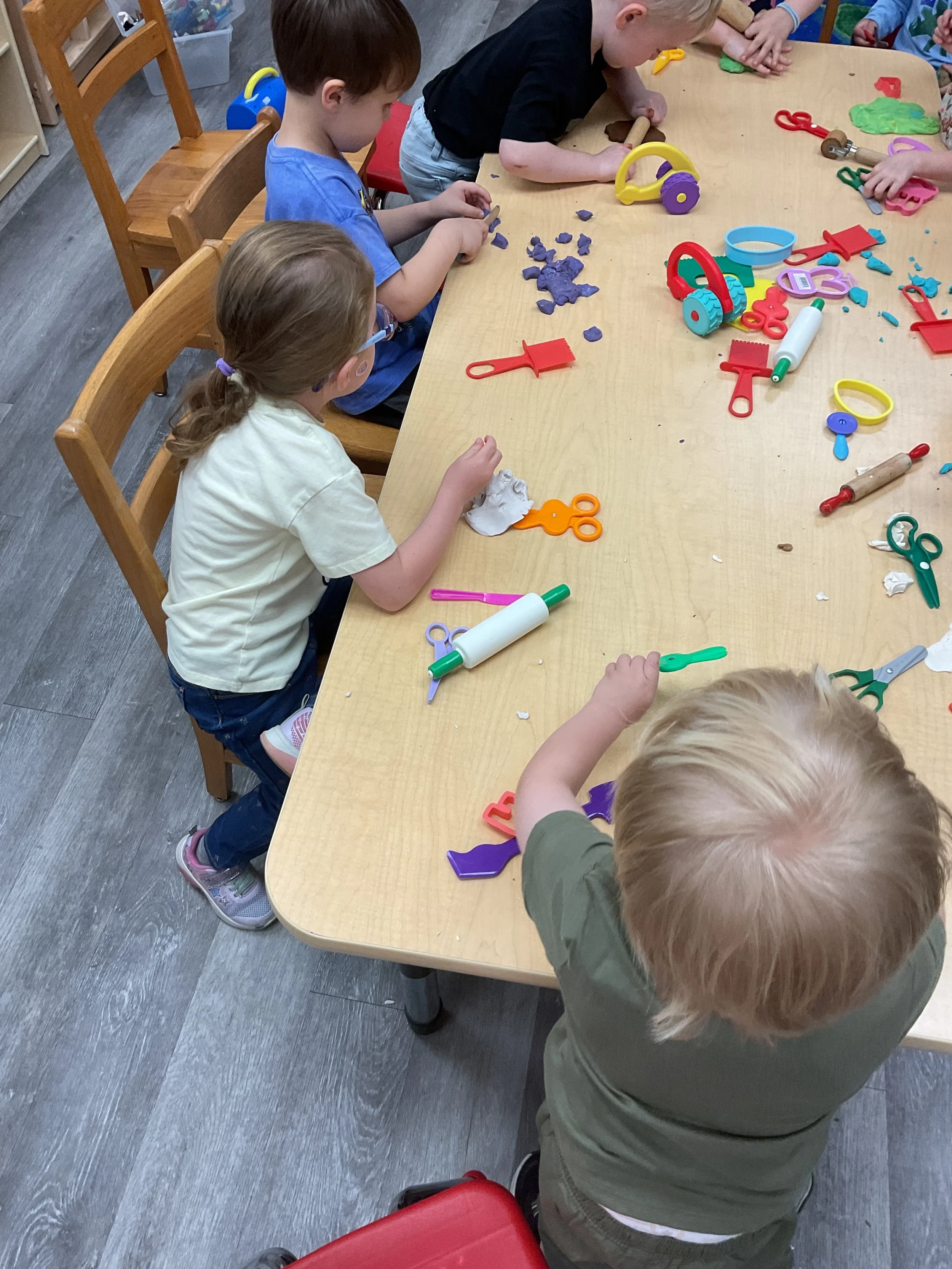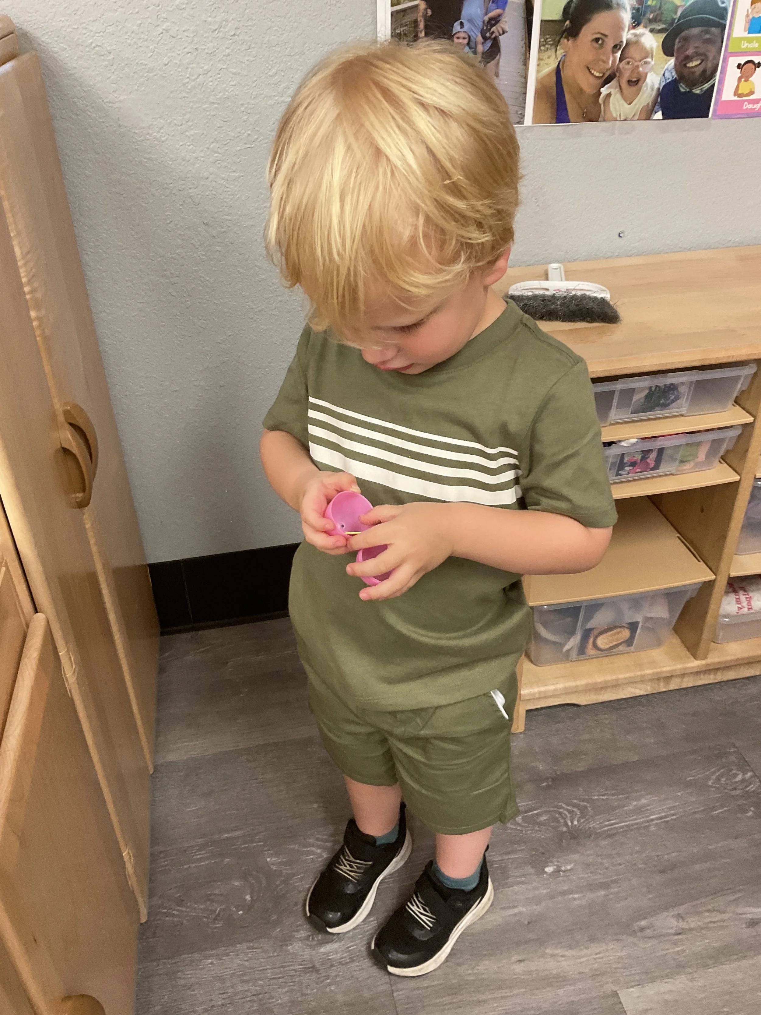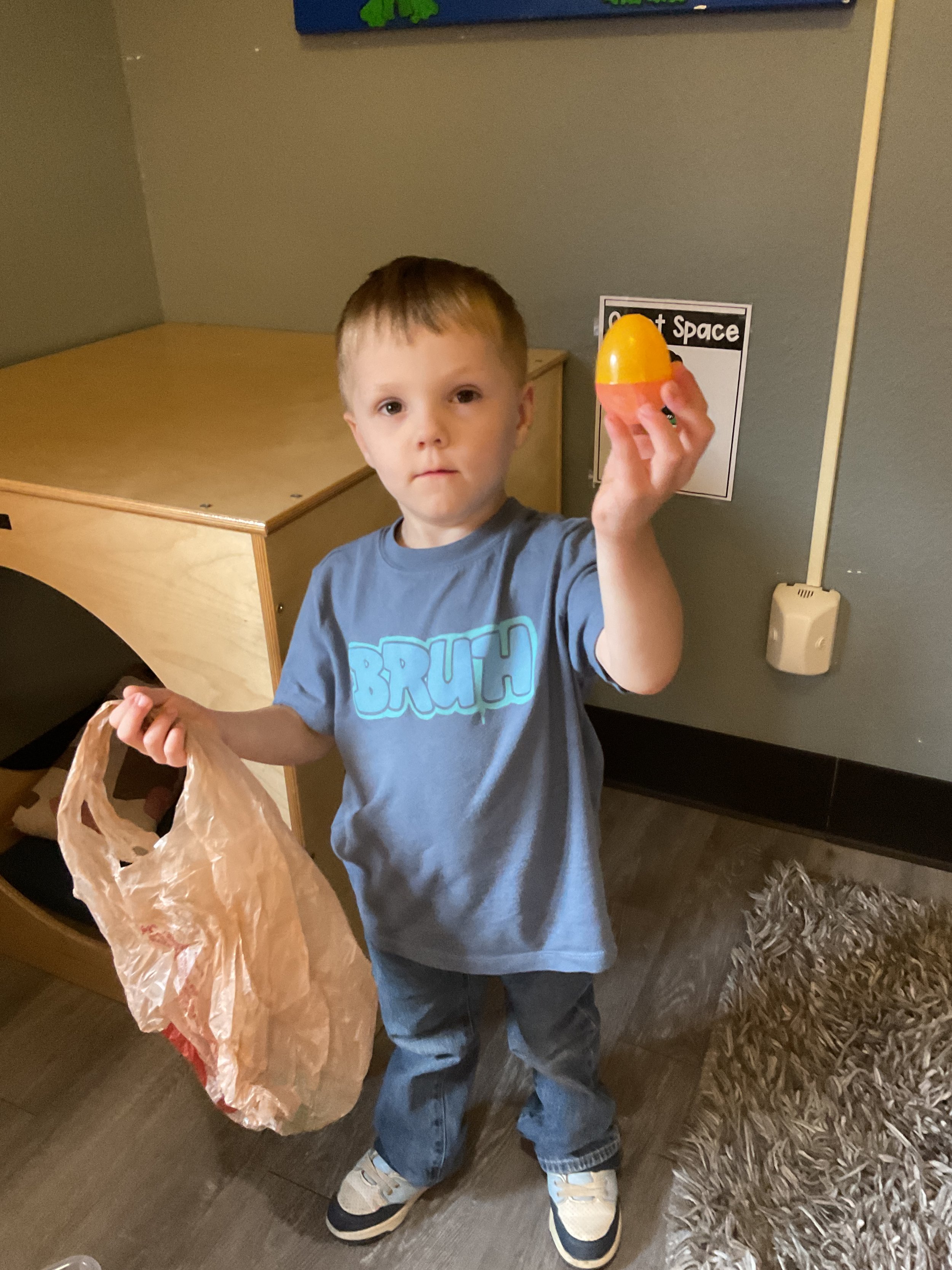 This morning, we read the book The Night Before Easter written by Natasha Wing and illustrated by Kathy Couri. During our music and movement time, we did yoga, some Danny Go, and the Roller Coaster song. Then, during our math and cognition lesson, we did paper weaving. Next, for our science and sensory lesson, we used playdough to make bunnies and eggs. Finally, for our literacy and fine motor lesson, we sharpened our cutting skills. The highlight of our day was our Easter Egg hunt!