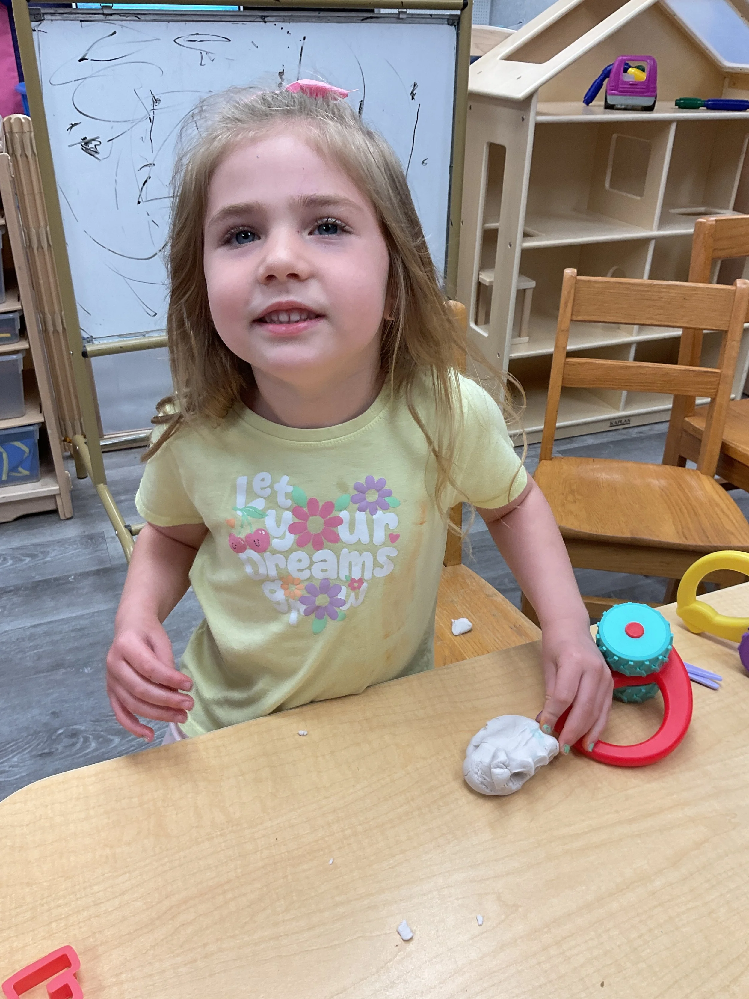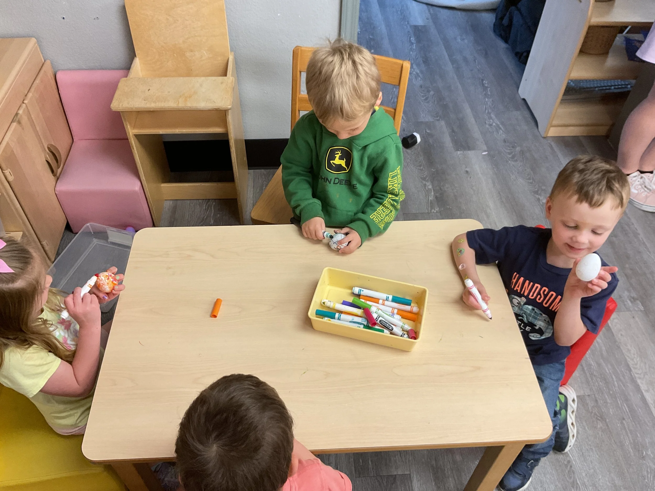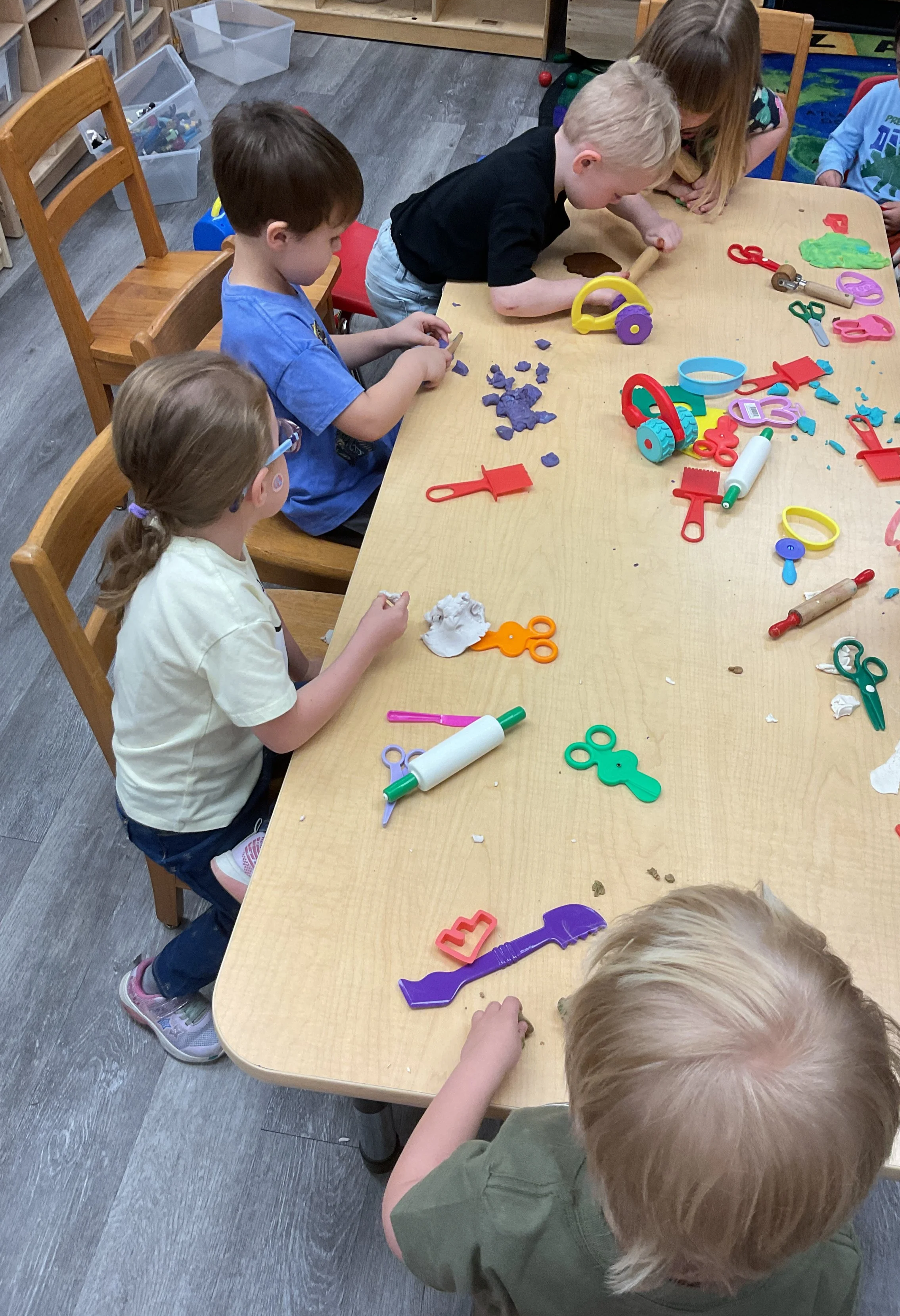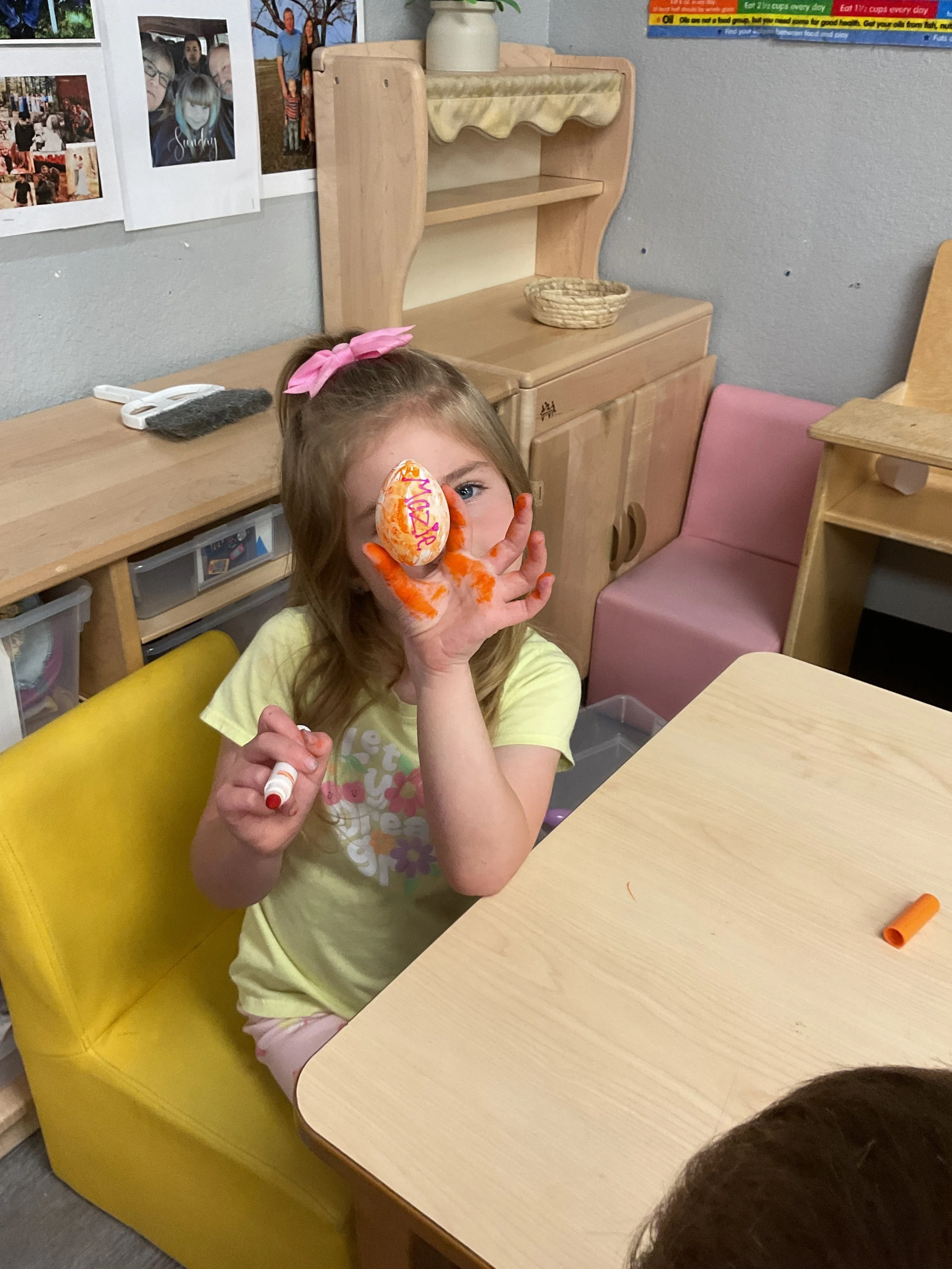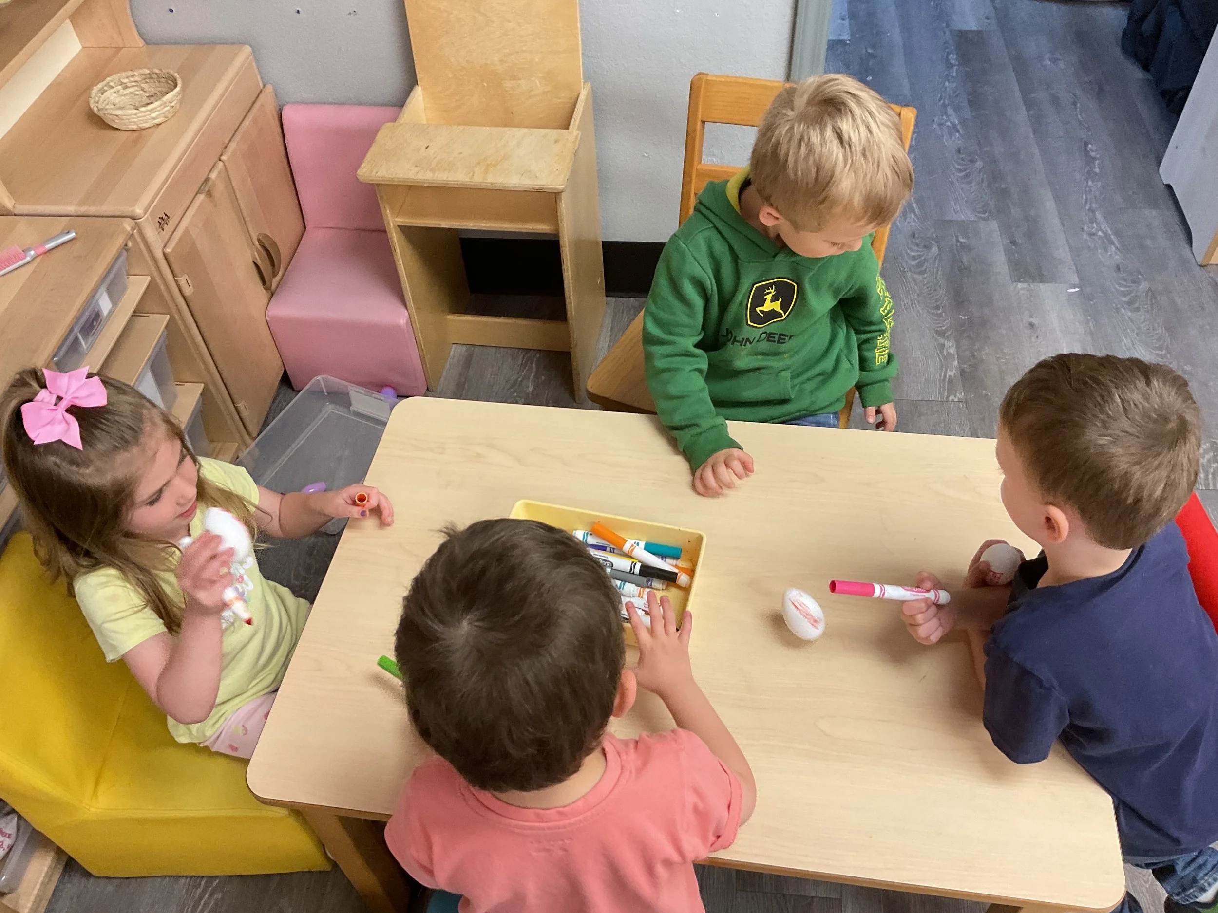 This morning, we read the book The Night Before Easter written by Natasha Wing and illustrated by Kathy Couri. During our music and movement time, we did yoga, some Danny Go, and the Roller Coaster song. Then, during our math and cognition lesson, we did paper weaving. Next, for our science and sensory lesson, we used playdough to make bunnies and eggs. Finally, for our literacy and fine motor lesson, we sharpened our cutting skills. The highlight of our day was our Easter Egg hunt!