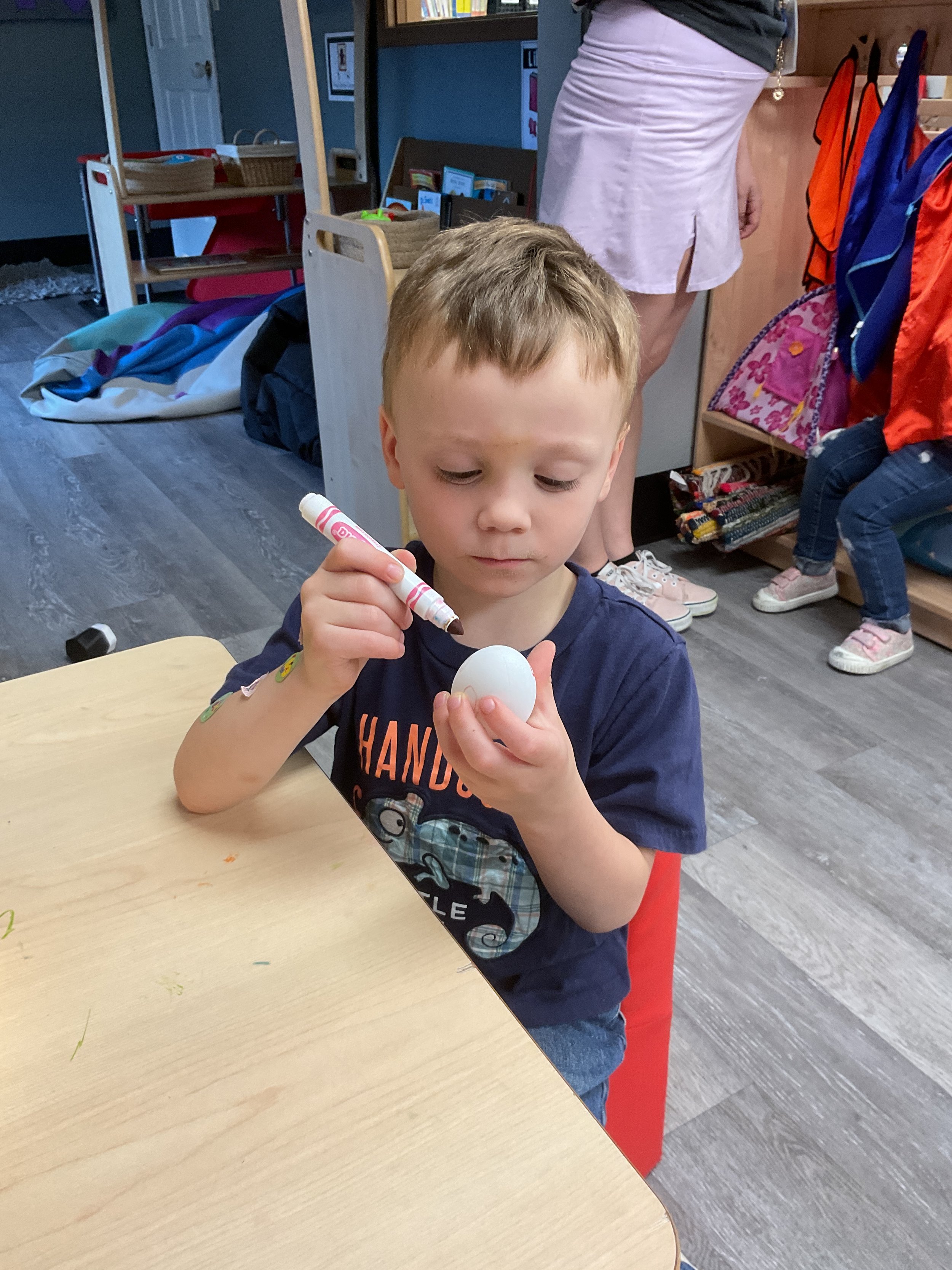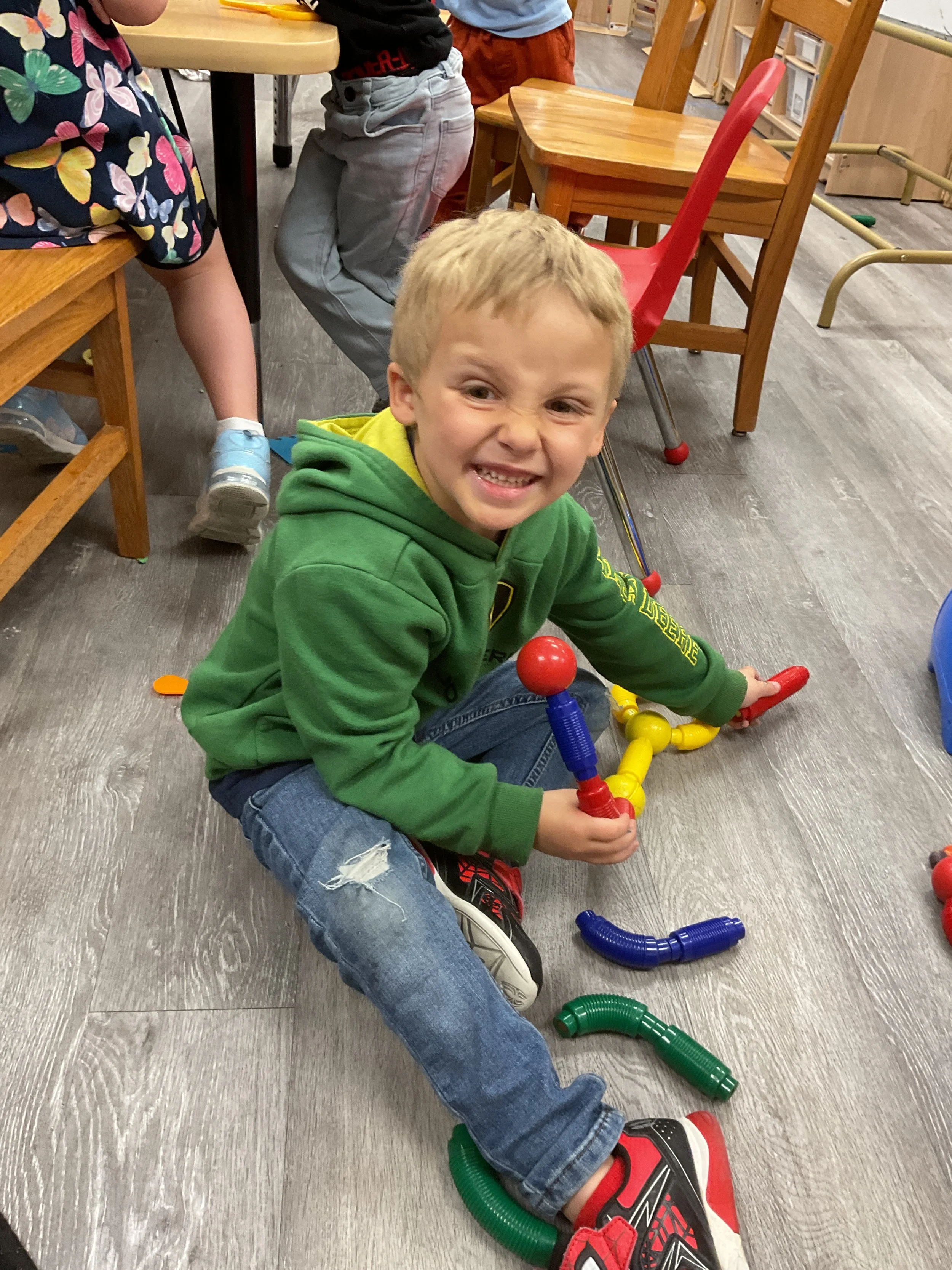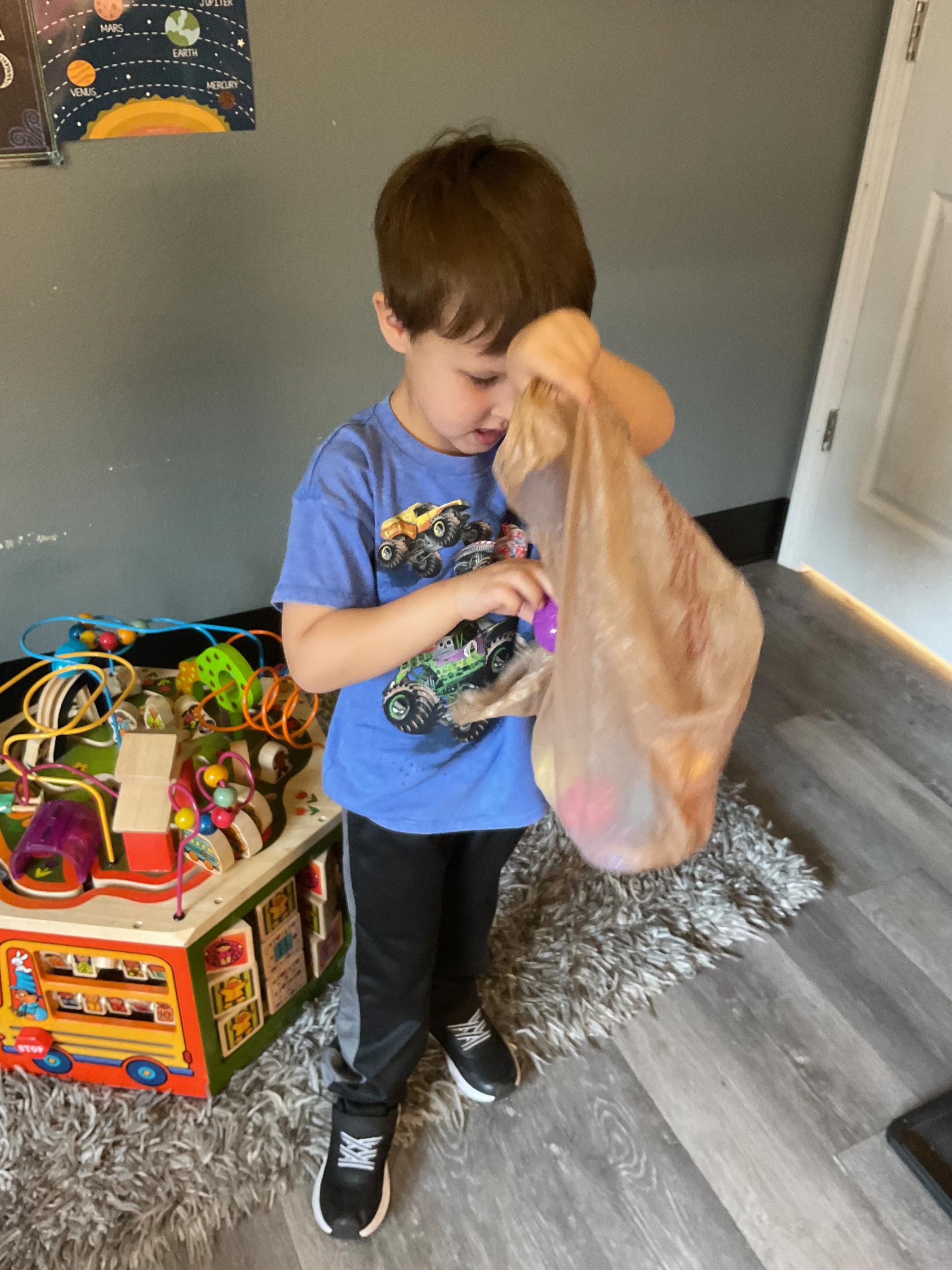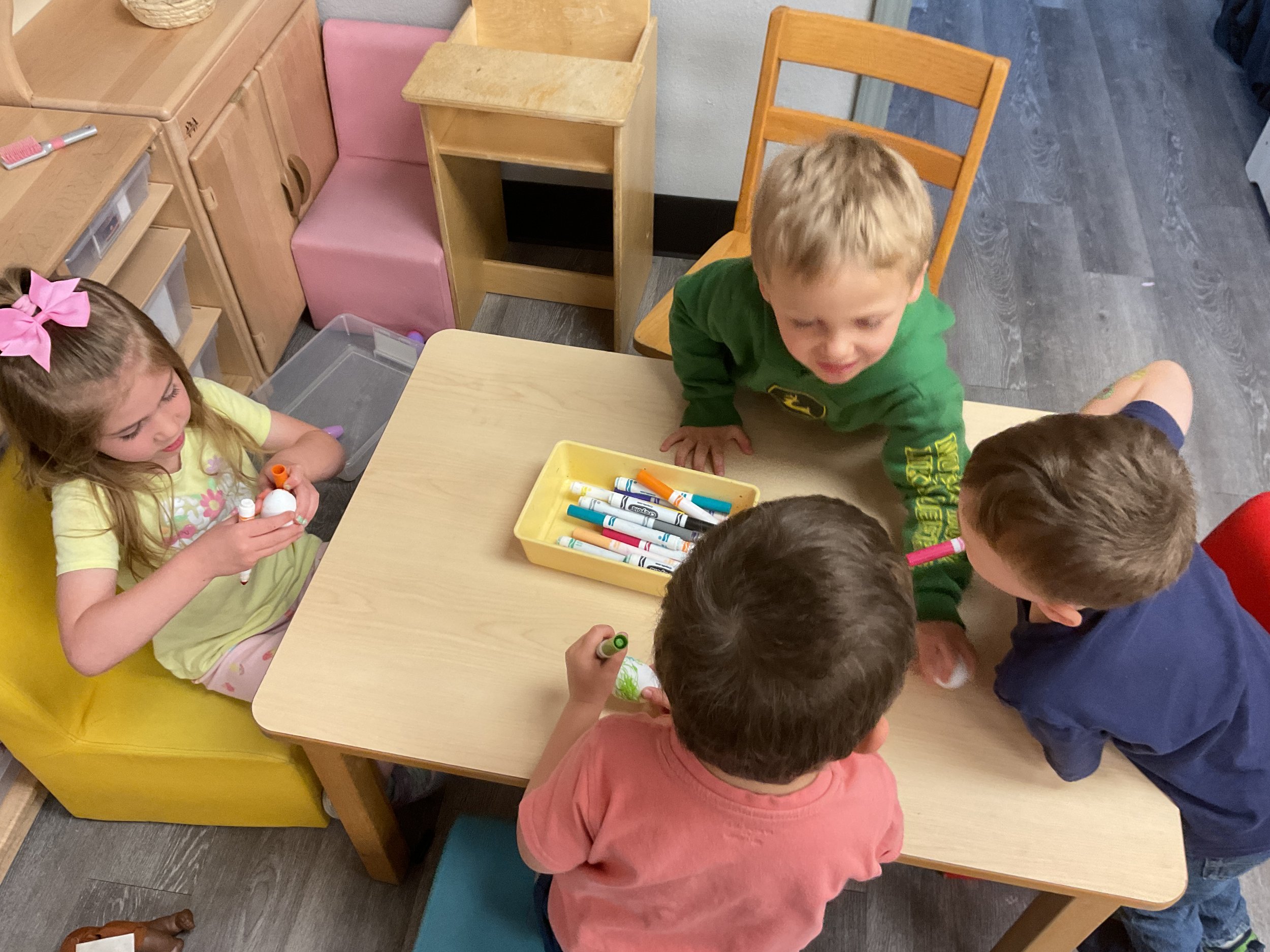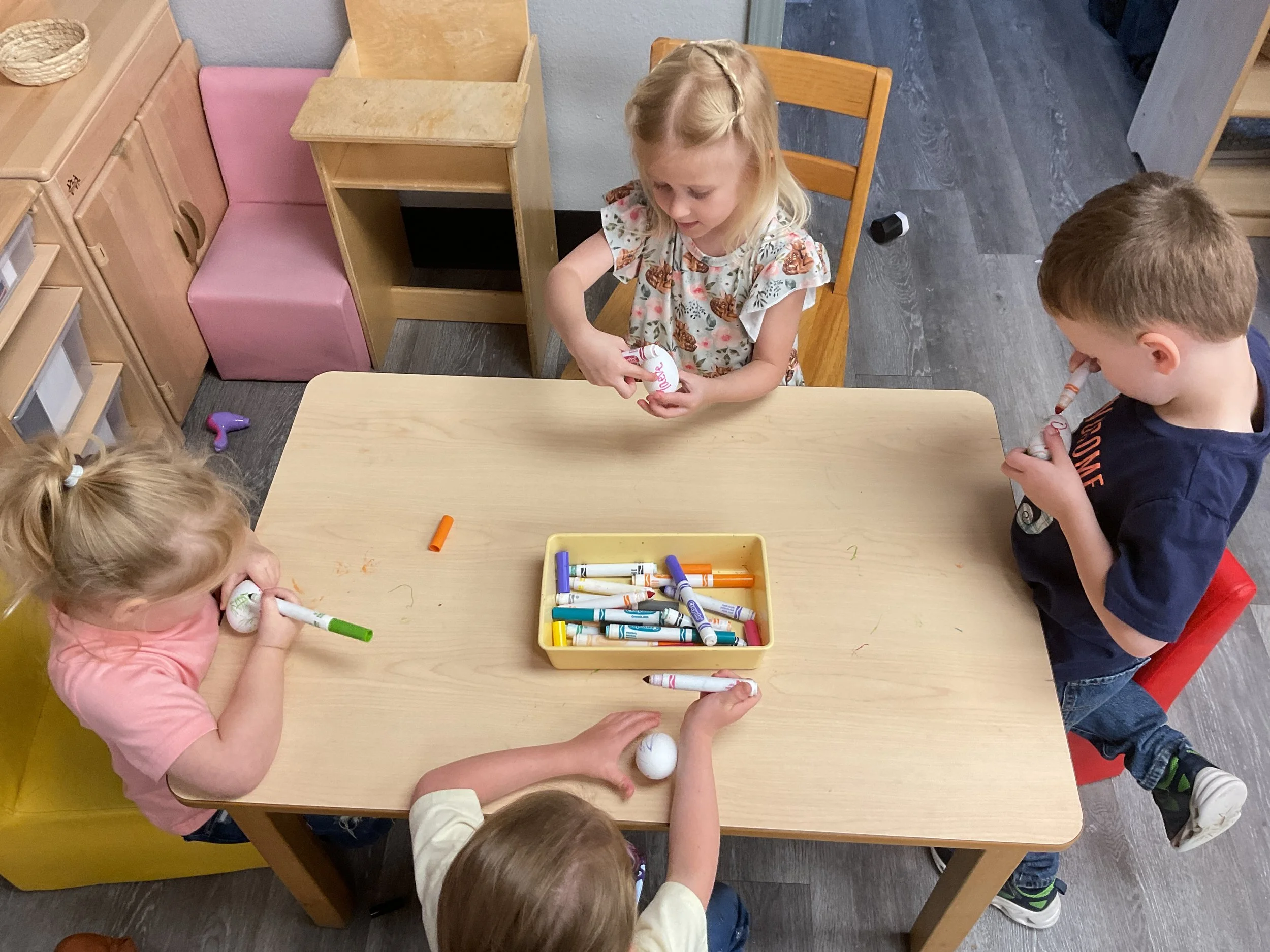 This morning, we read the book The Night Before Easter written by Natasha Wing and illustrated by Kathy Couri. During our music and movement time, we did yoga, some Danny Go, and the Roller Coaster song. Then, during our math and cognition lesson, we did paper weaving. Next, for our science and sensory lesson, we used playdough to make bunnies and eggs. Finally, for our literacy and fine motor lesson, we sharpened our cutting skills. The highlight of our day was our Easter Egg hunt!