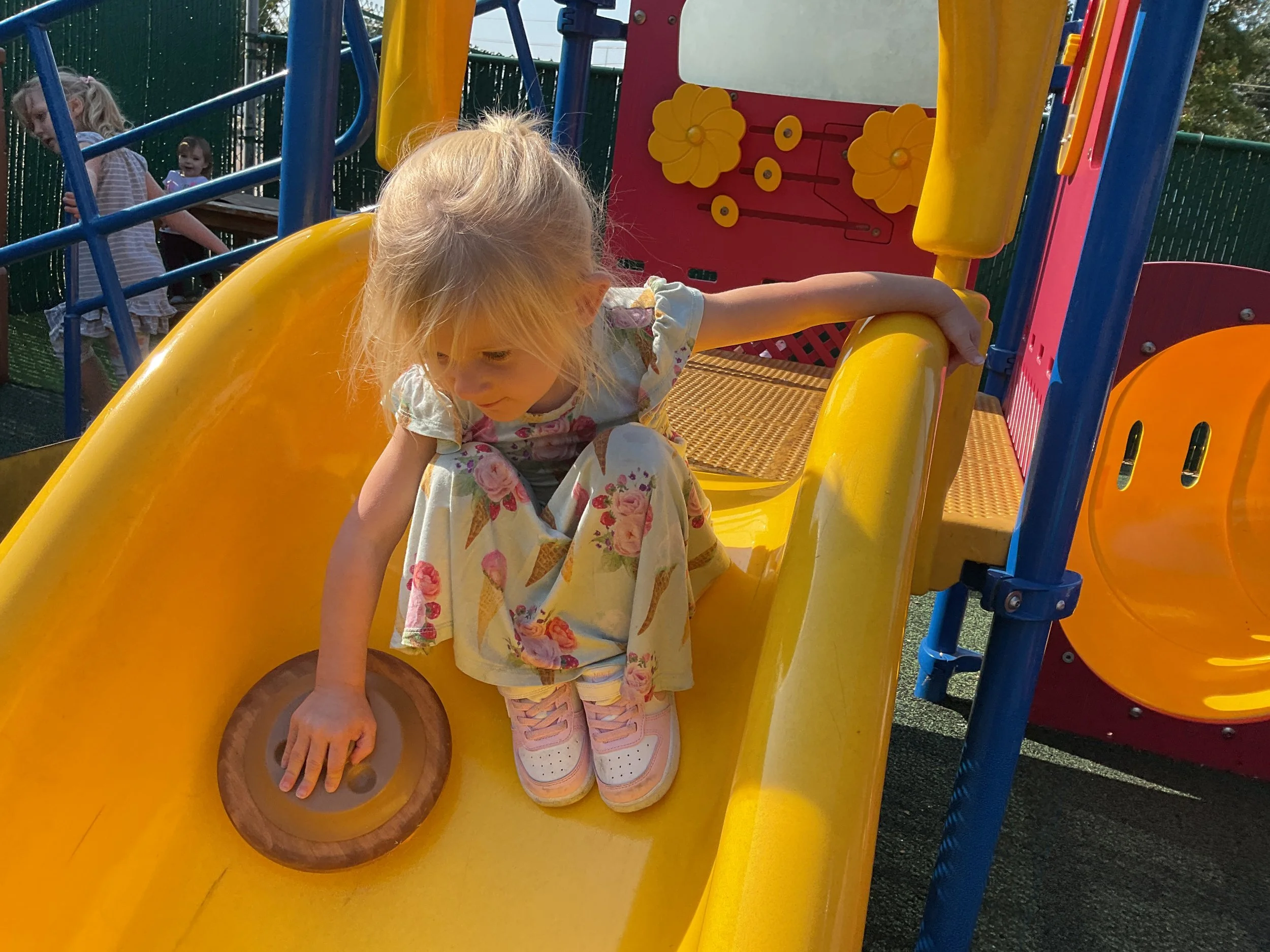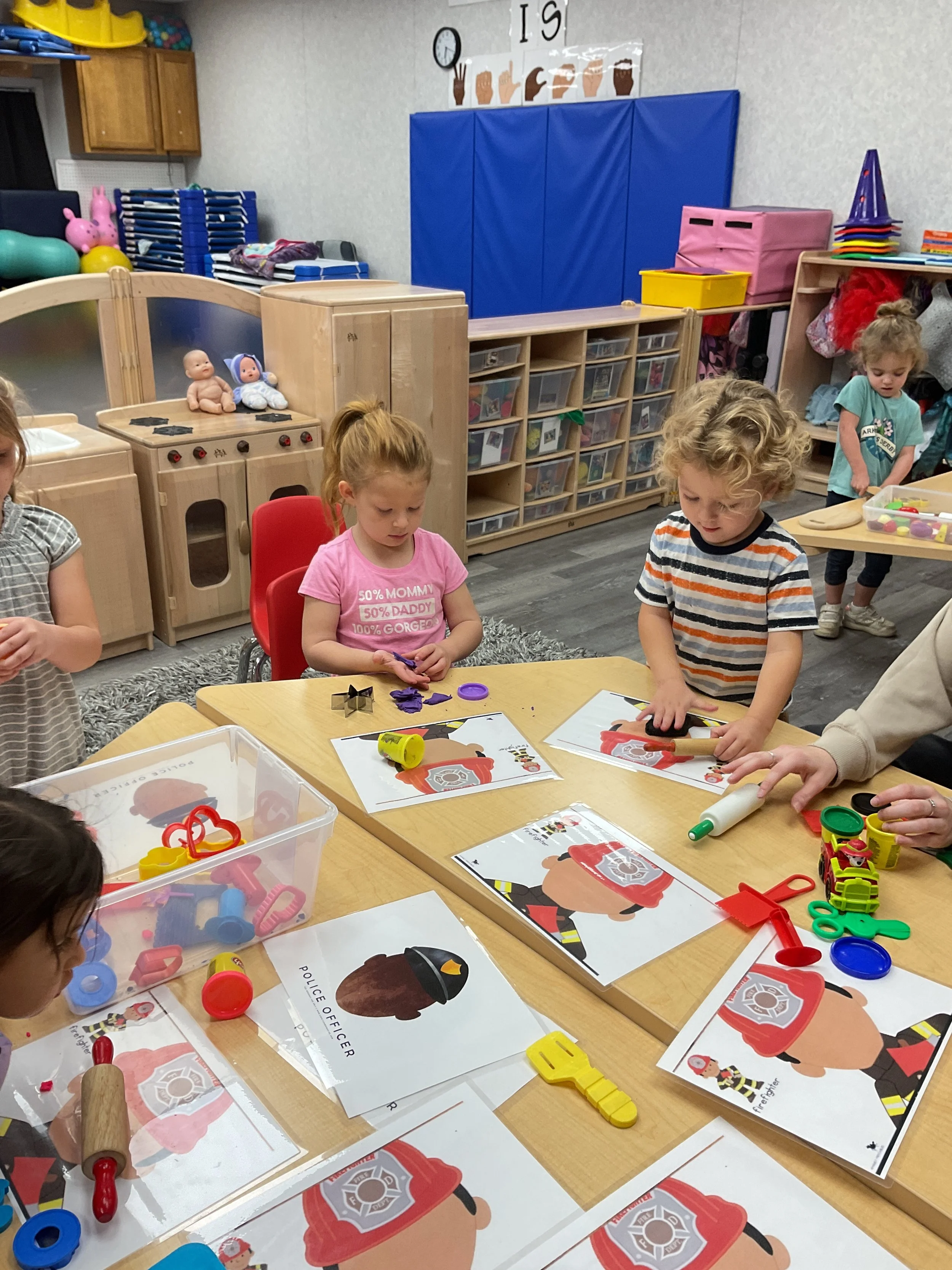 Today we read the book Career Day by Anne Rockwell and illustrated by Lizzy Rockwell. This morning, during our math and cognition lesson, we made community helper patterns. Then, during our science and sensory lesson, we used play dough to make a face for a policeman and a firefighter! Finally, for our literacy and fine motor lesson, we practiced our cutting skills!