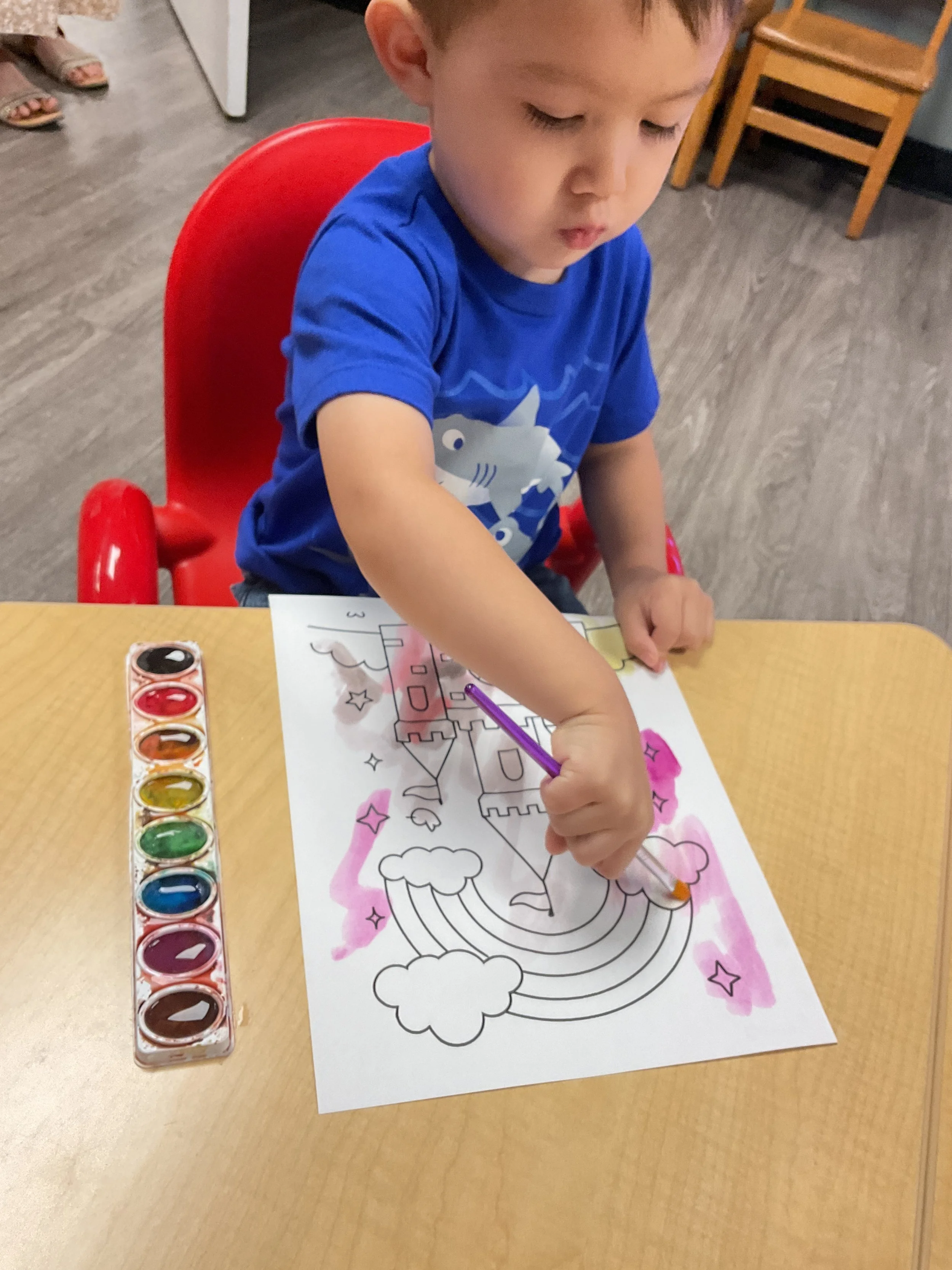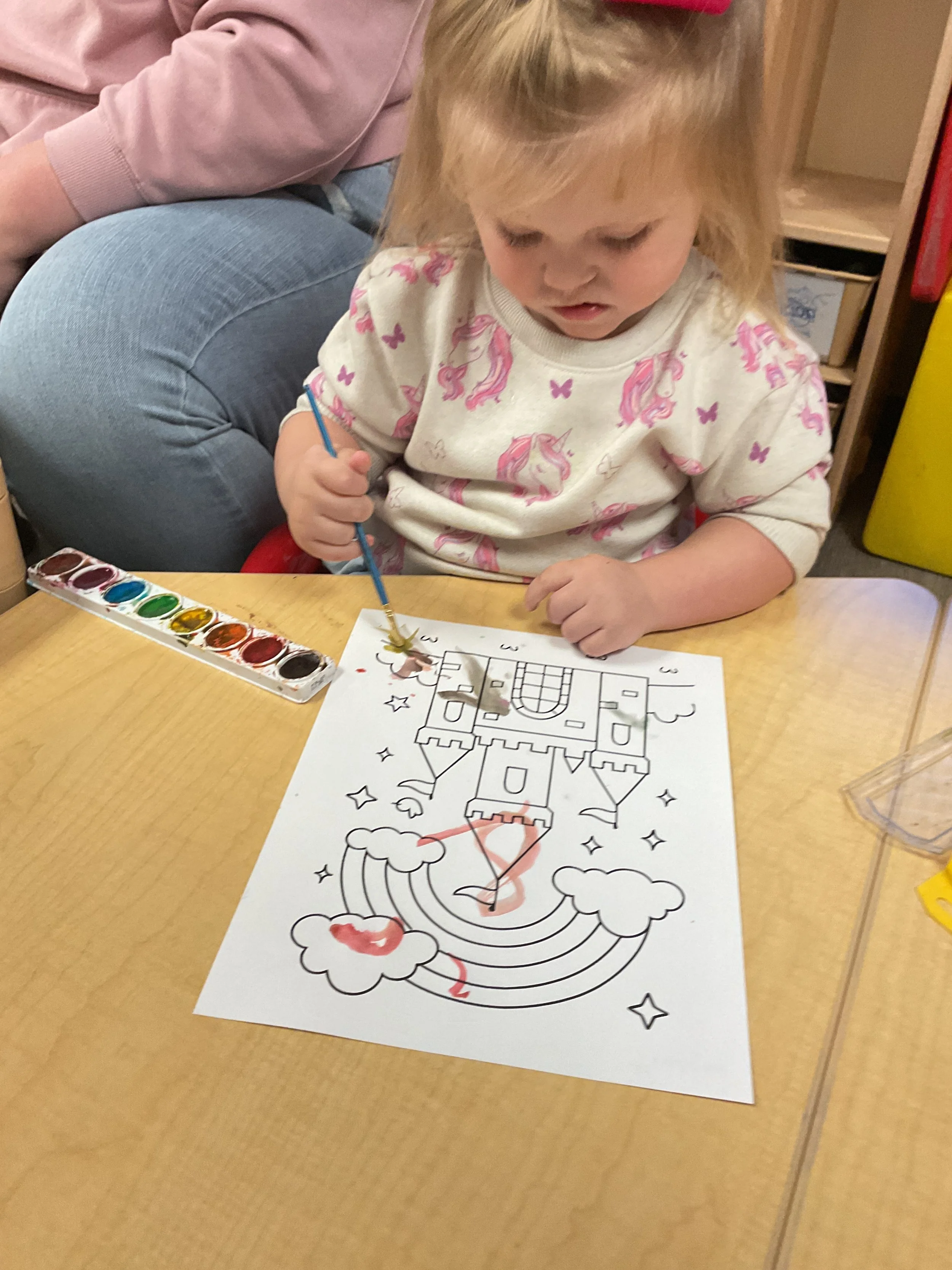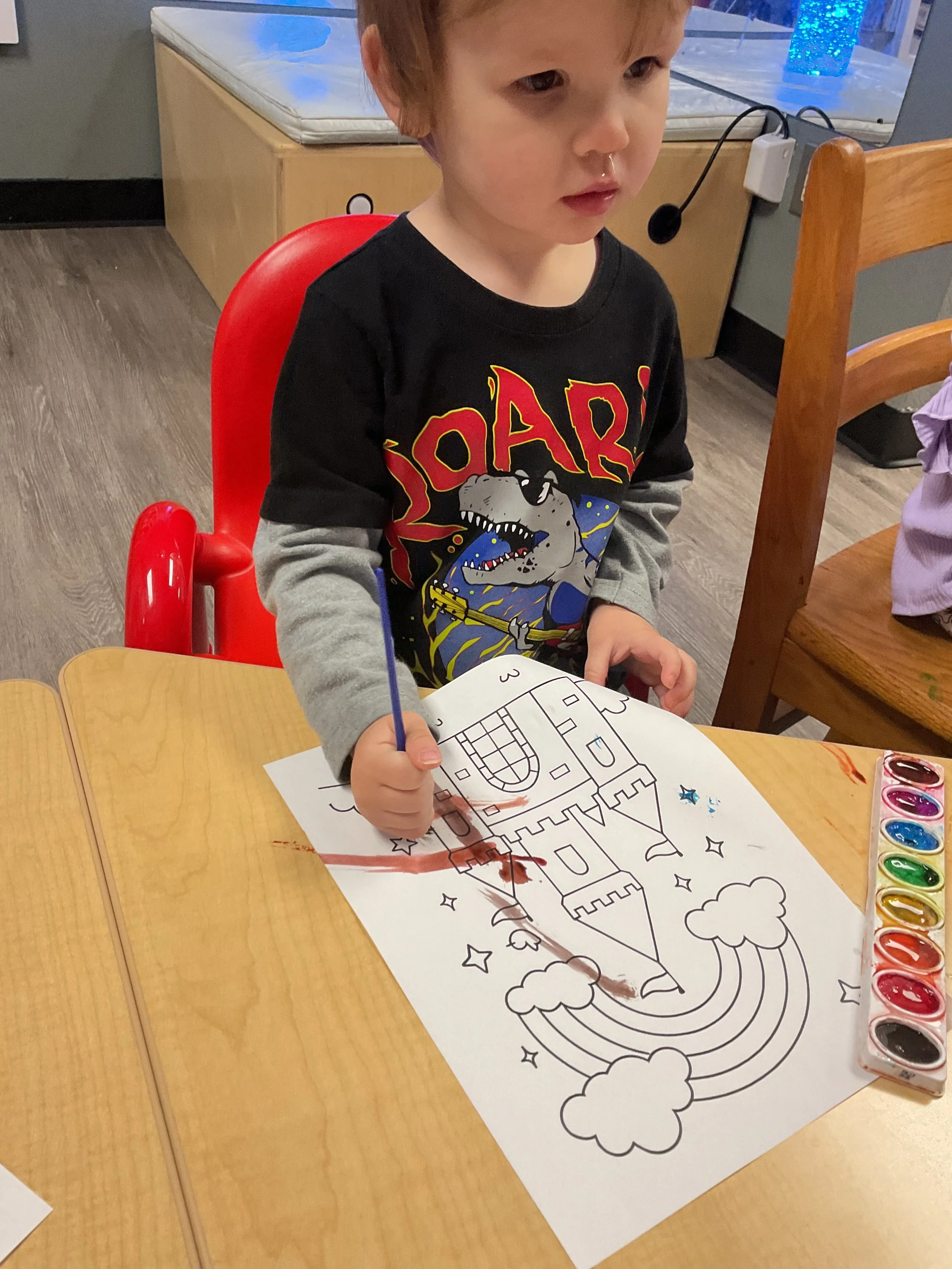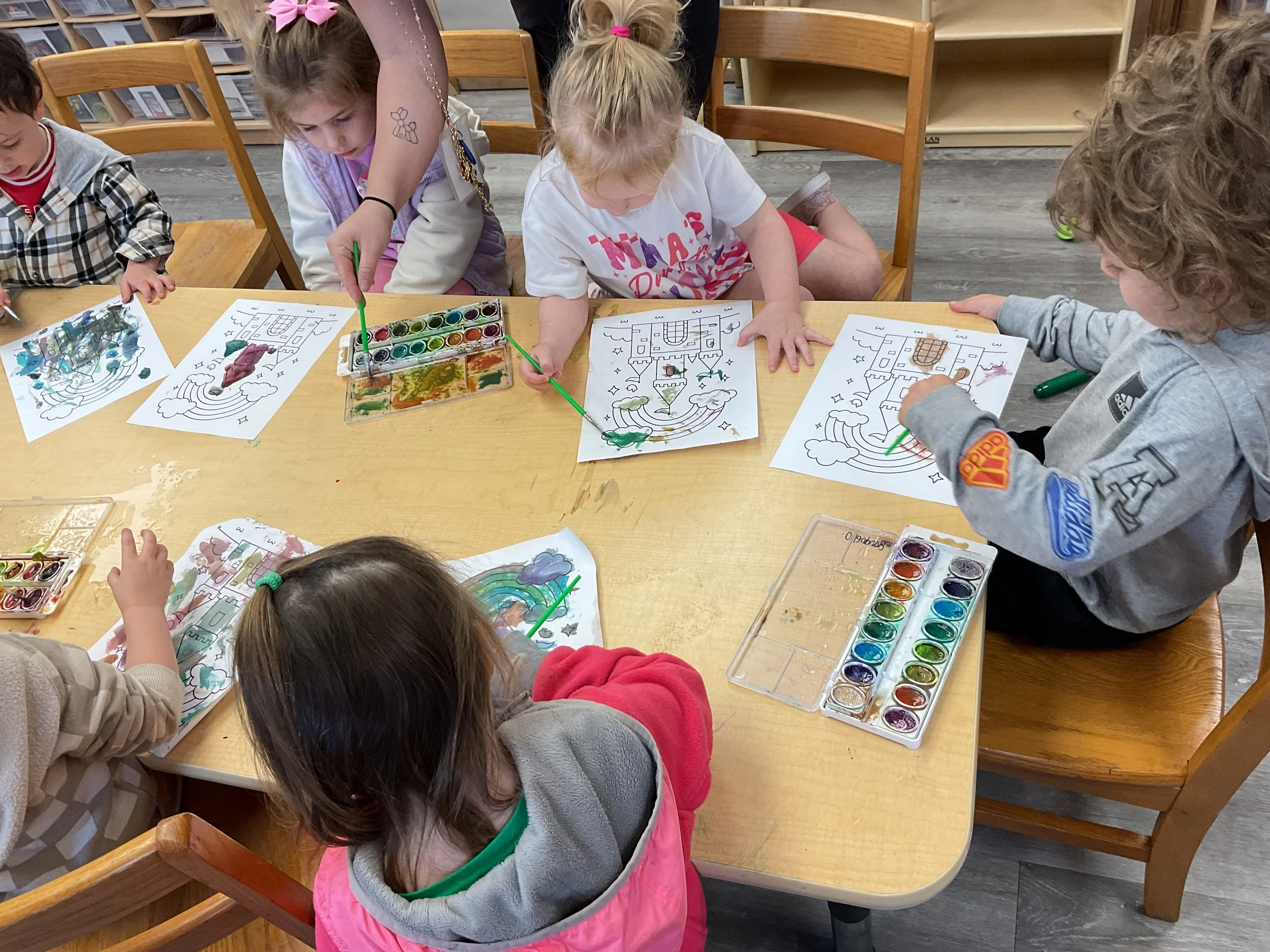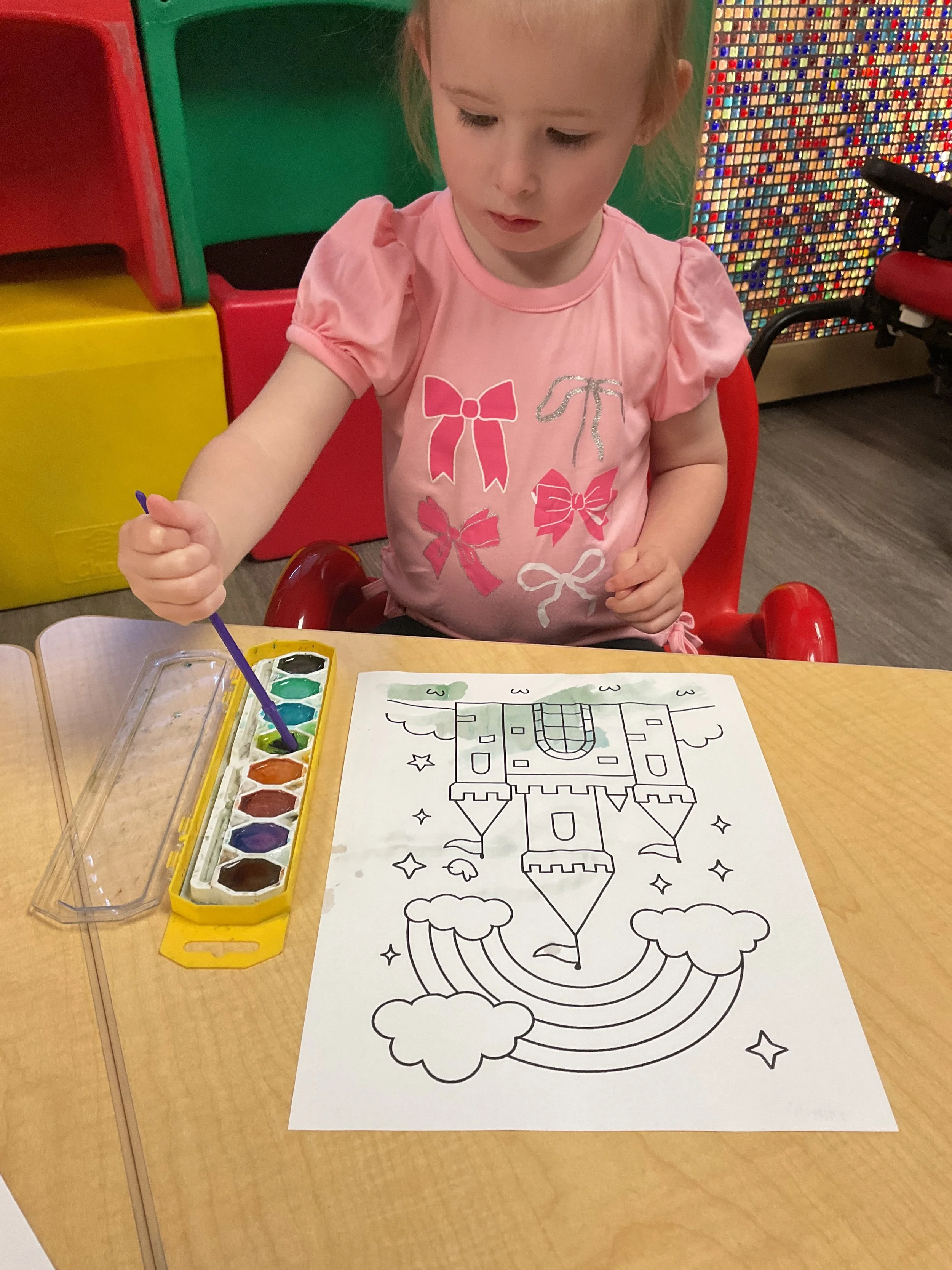 This morning, we read Walt Dinsey’s the Little Mermaid. We had a special visitor during our music and movement time! Nurse Katie from the health department came to talk to us about the importance of exercise. We played with a parachute and playground balls! Then, during our math and cognition lesson, we worked on simple addition using our fairytale little people. Next, for our science and sensory lesson, we watercolored a picture of a castle. Finally, for our literacy and fine motor lesson, we listened to a book on tape and practiced tracing and writing our names.