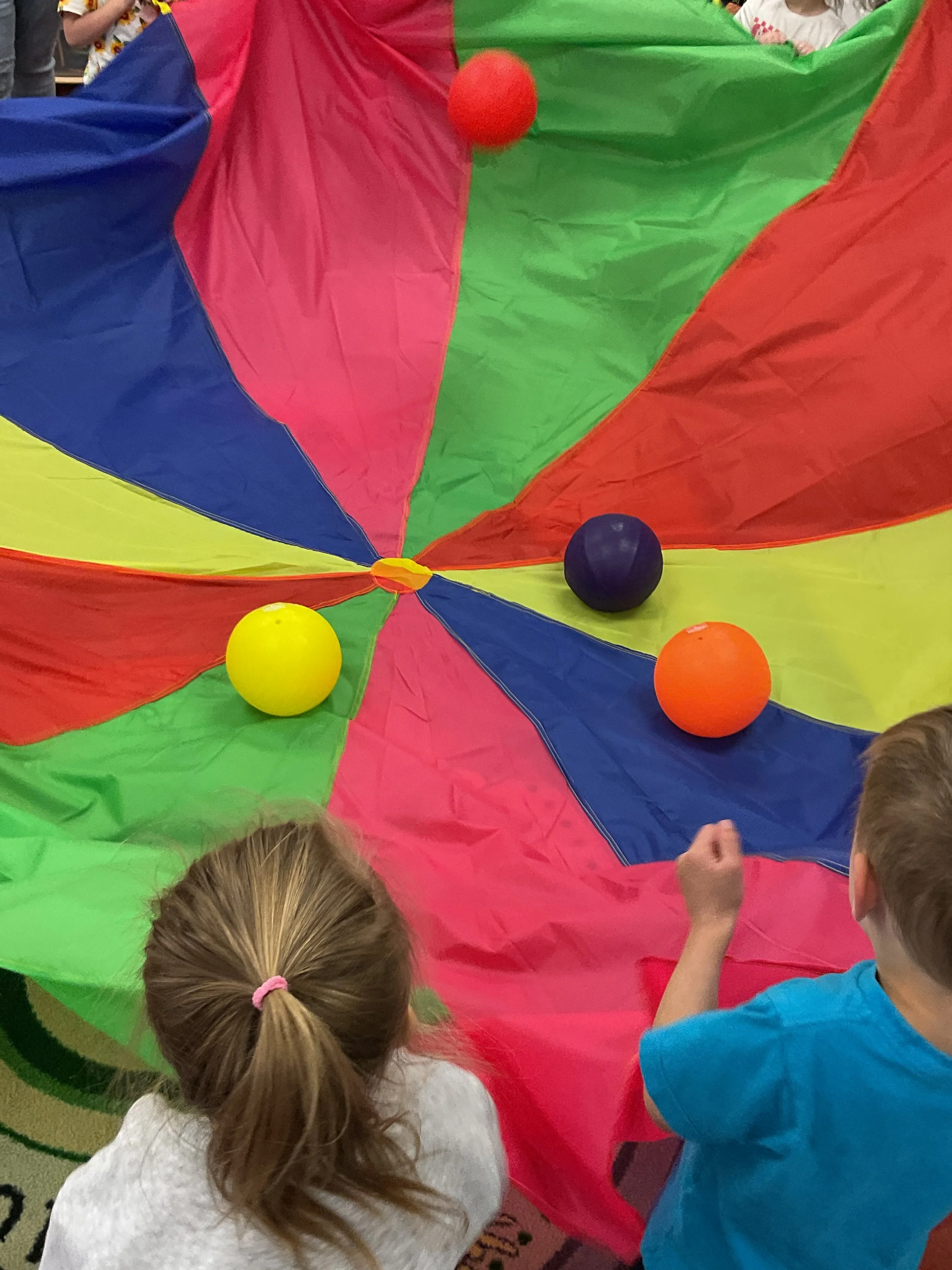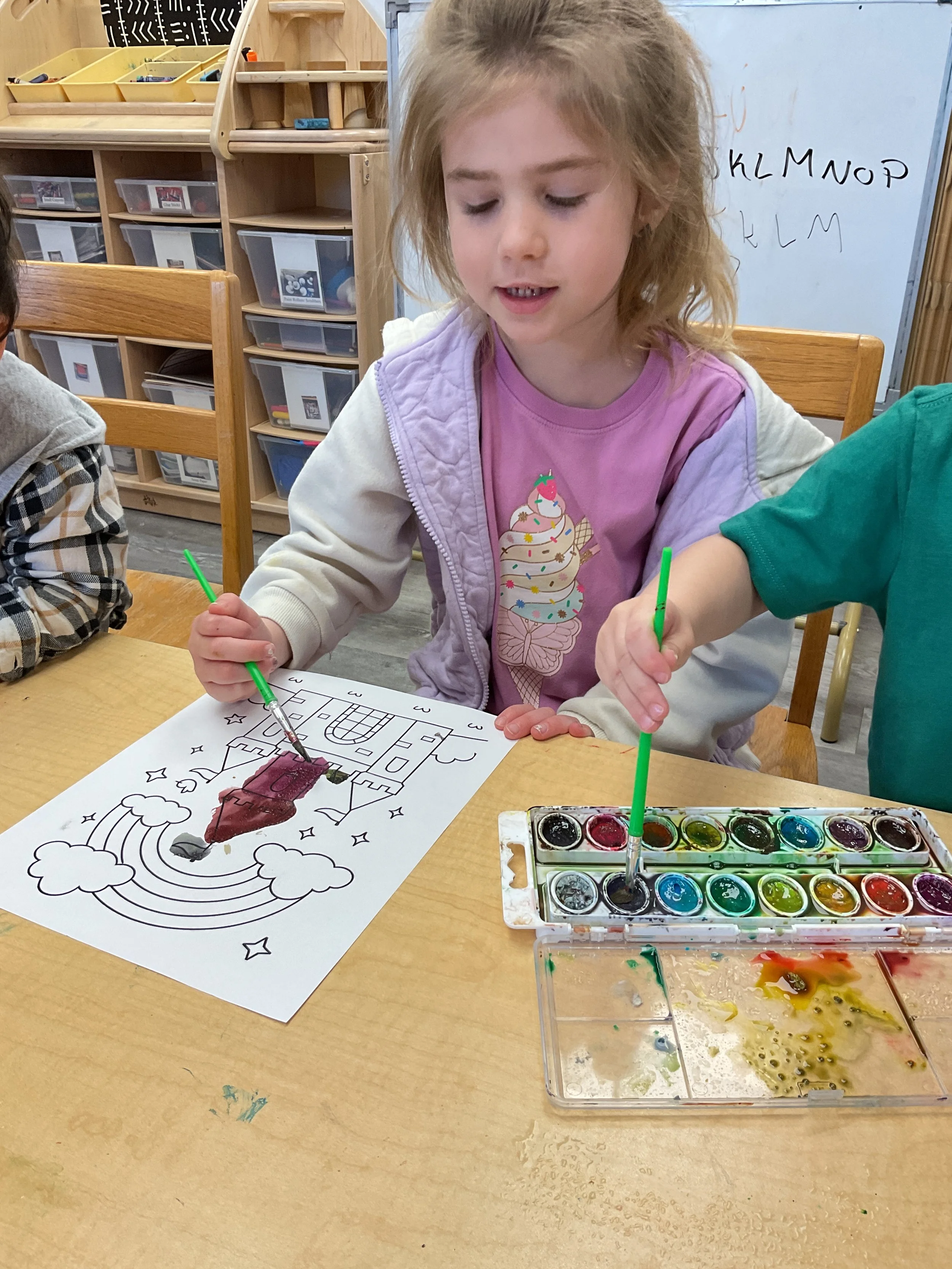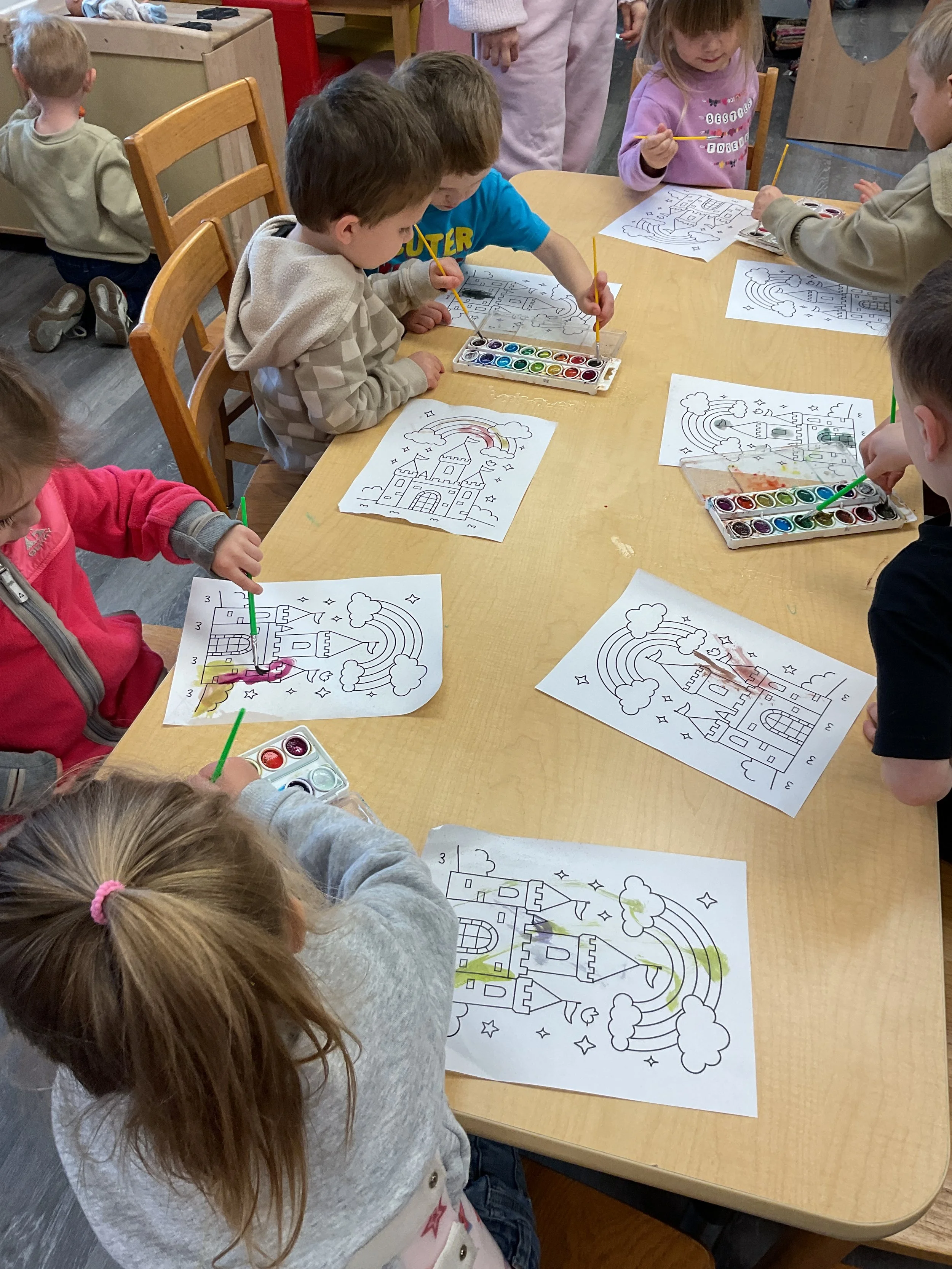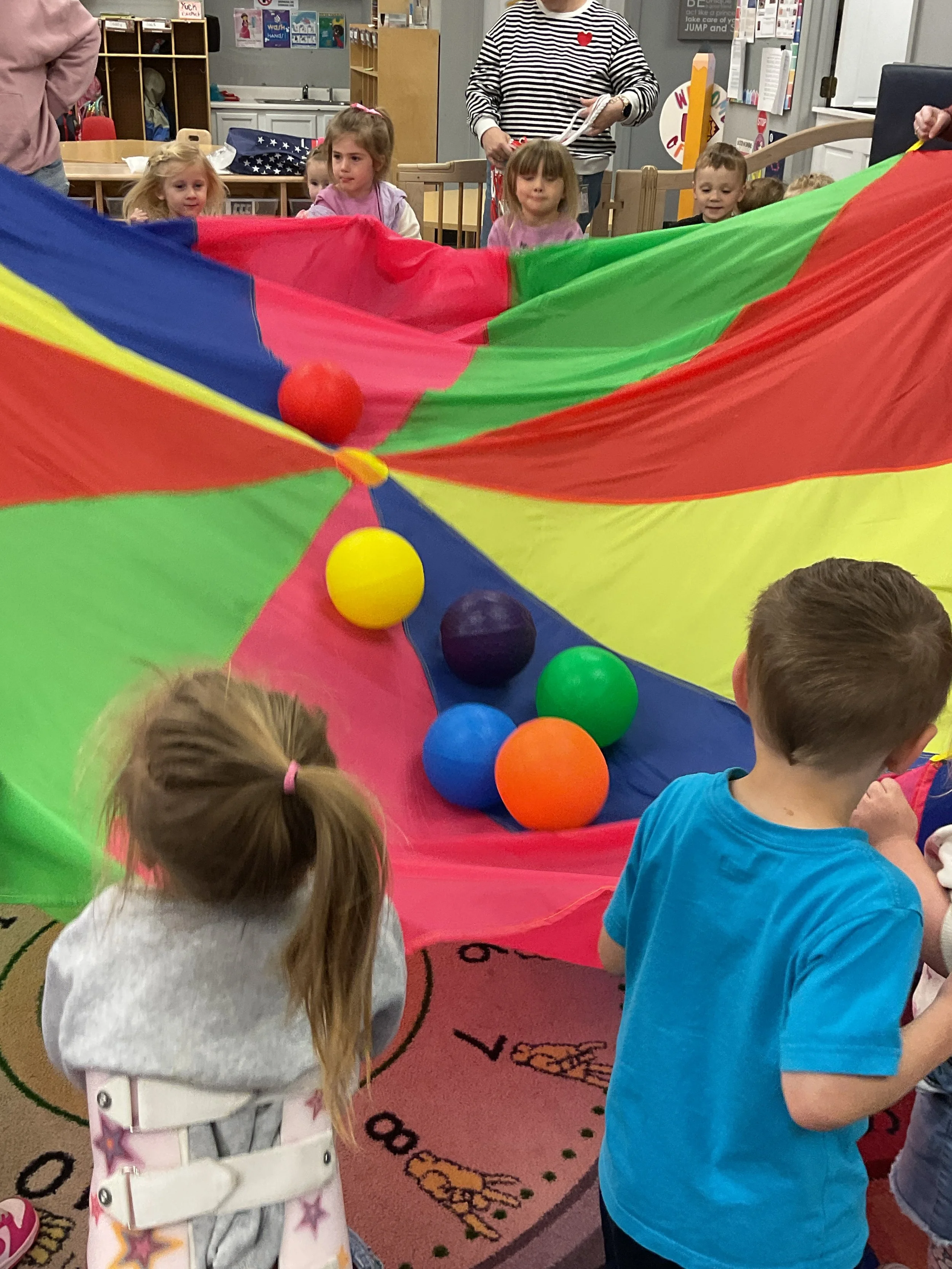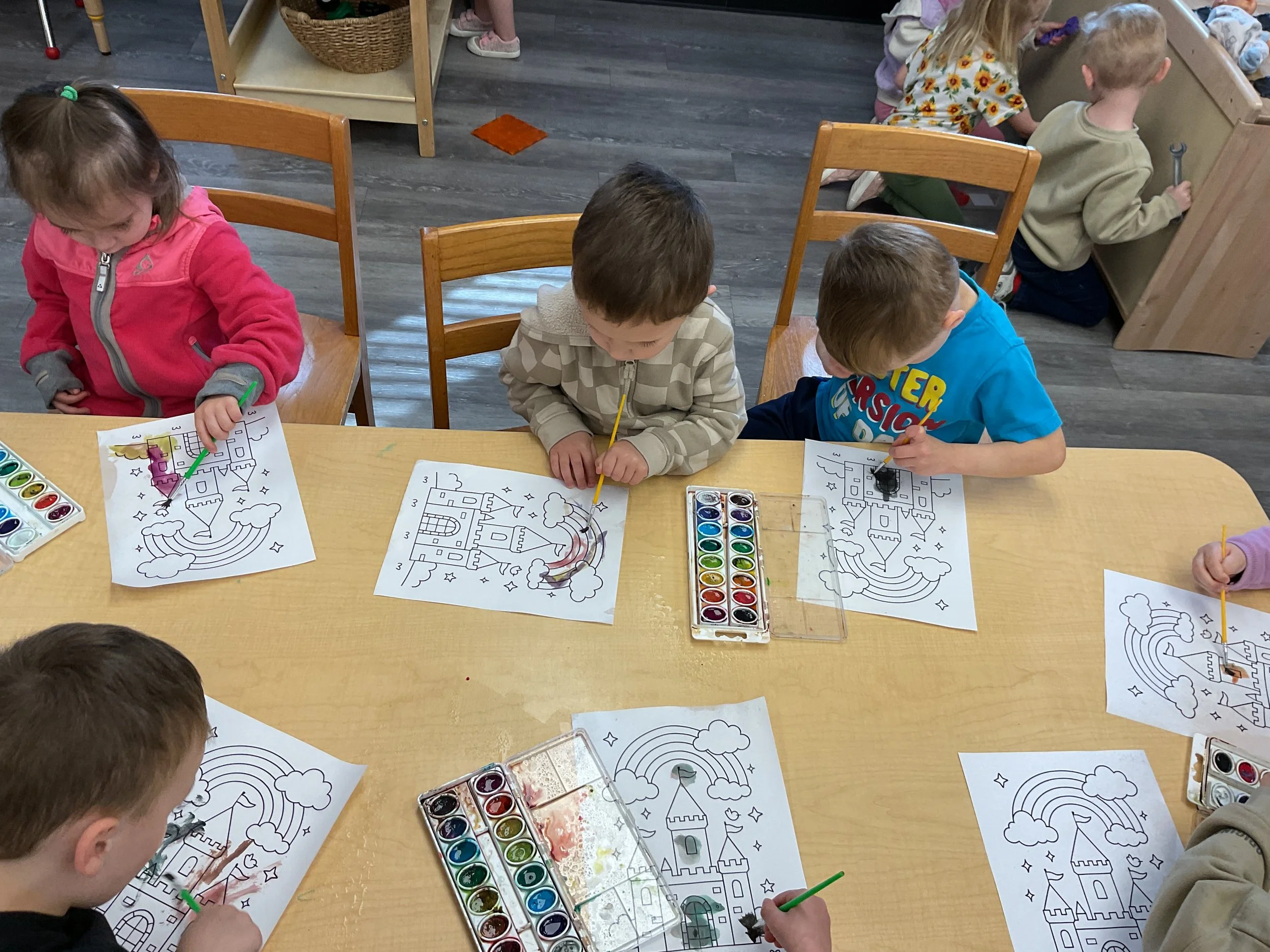 This morning, we read Walt Dinsey’s the Little Mermaid. We had a special visitor during our music and movement time! Nurse Katie from the health department came to talk to us about the importance of exercise. We played with a parachute and playground balls! Then, during our math and cognition lesson, we worked on simple addition using our fairytale little people. Next, for our science and sensory lesson, we watercolored a picture of a castle. Finally, for our literacy and fine motor lesson, we listened to a book on tape and practiced tracing and writing our names.