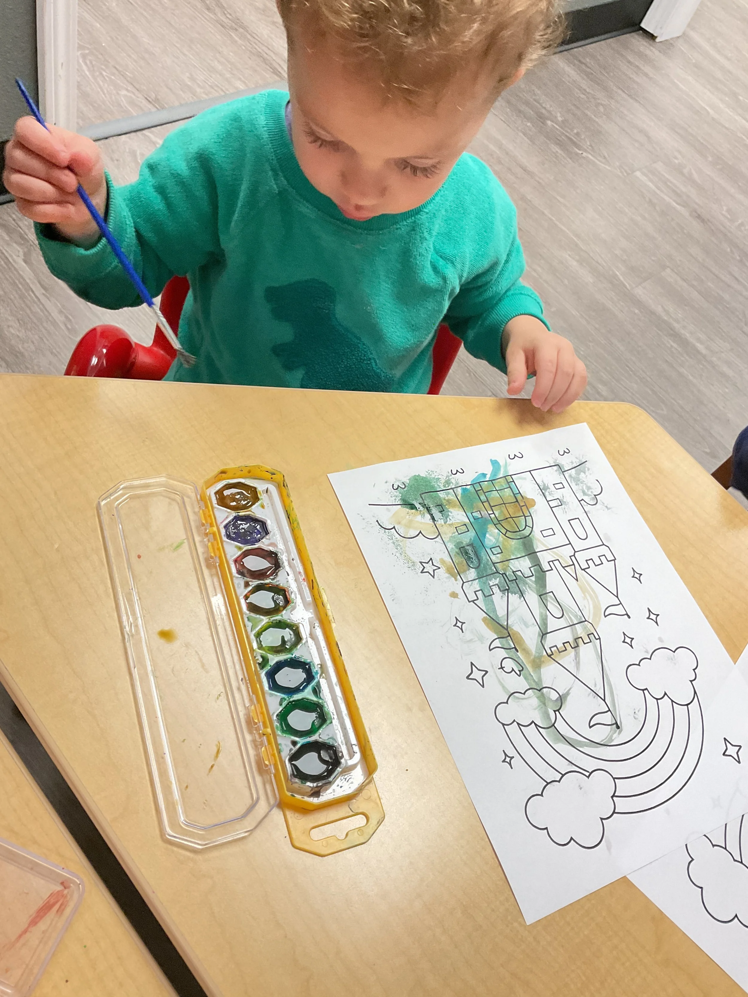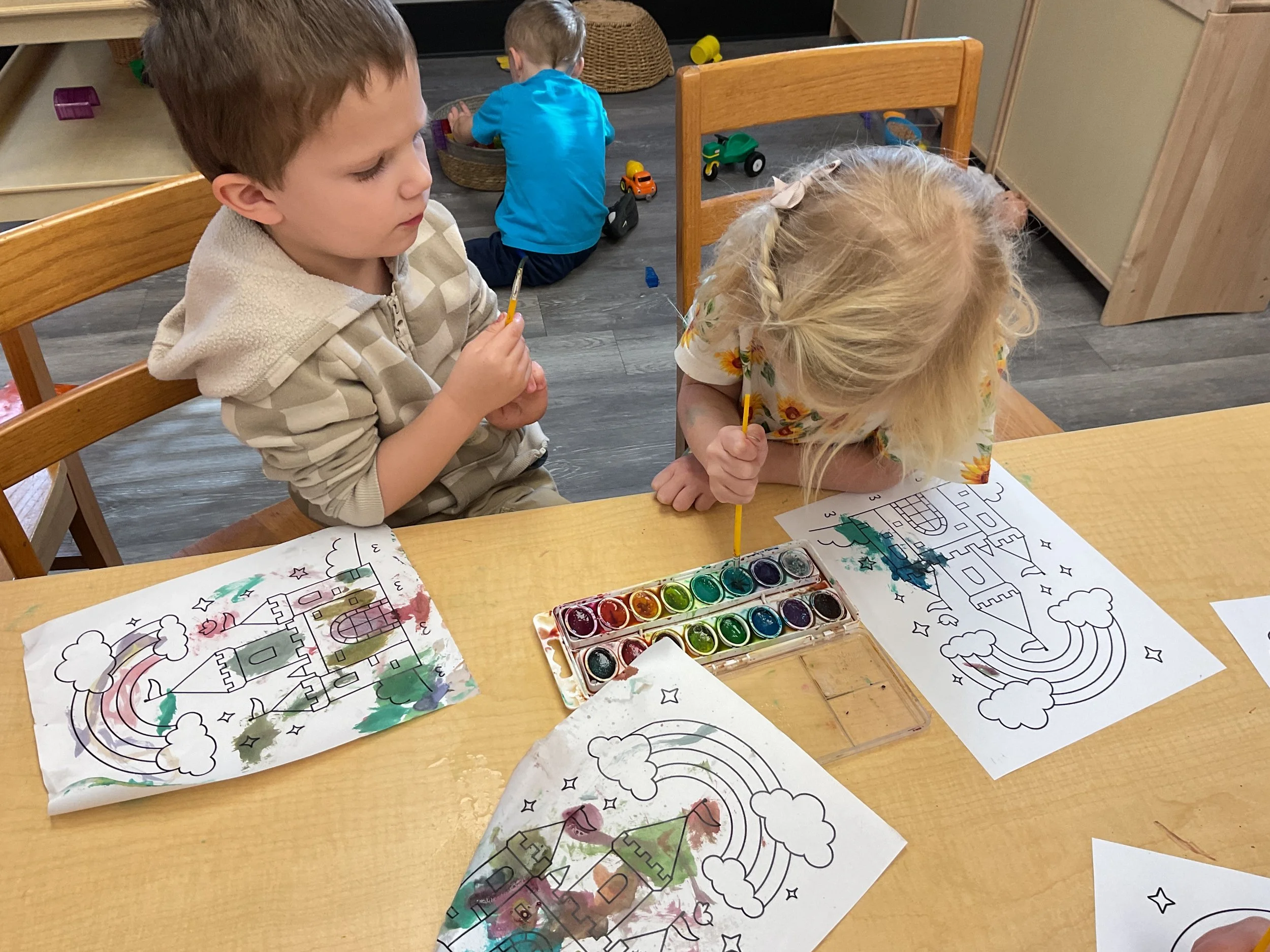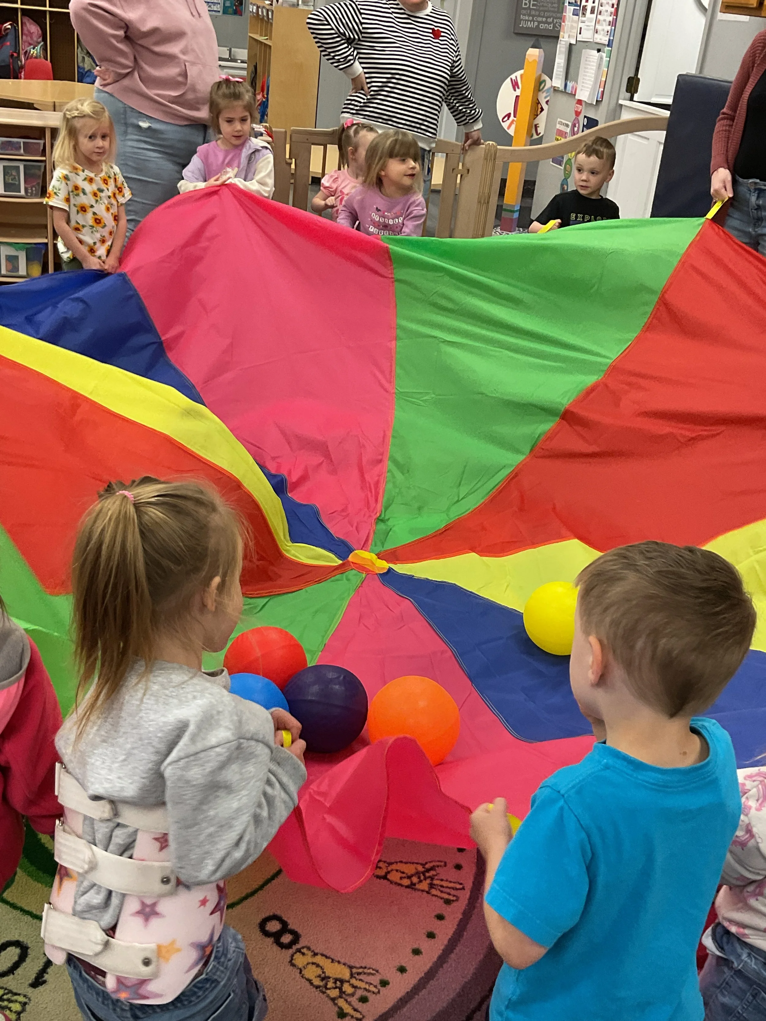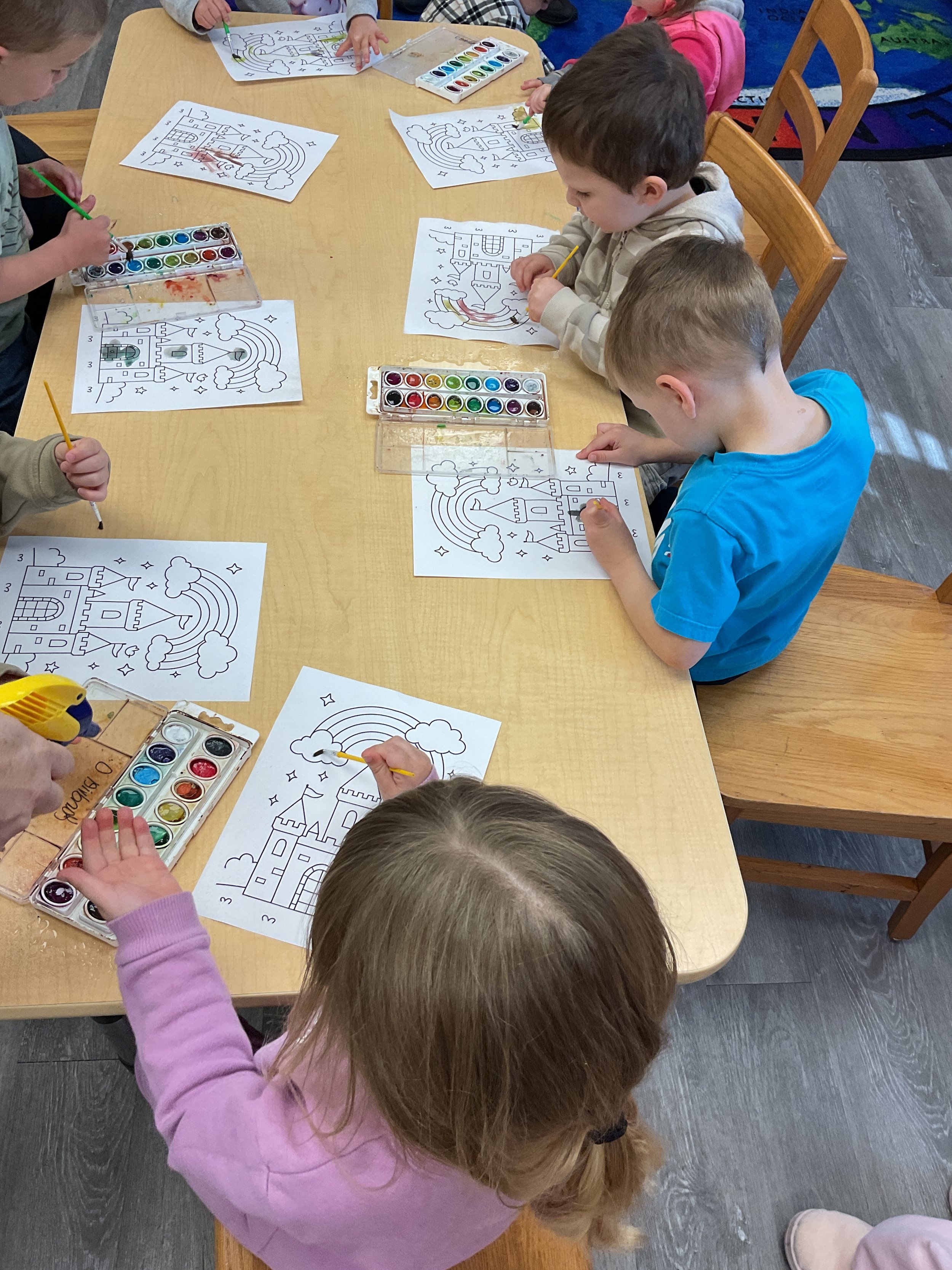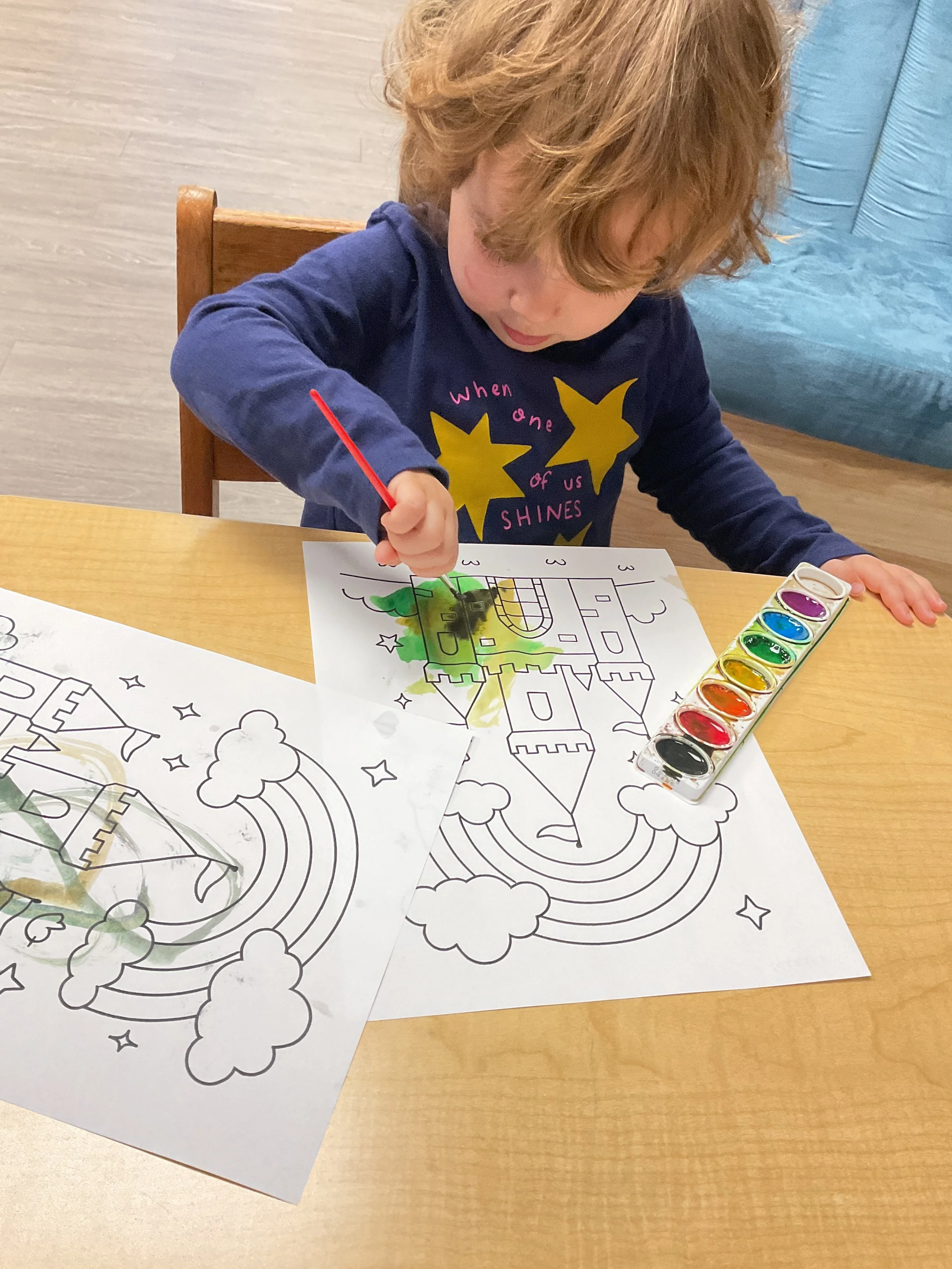 This morning, we read Walt Dinsey’s the Little Mermaid. We had a special visitor during our music and movement time! Nurse Katie from the health department came to talk to us about the importance of exercise. We played with a parachute and playground balls! Then, during our math and cognition lesson, we worked on simple addition using our fairytale little people. Next, for our science and sensory lesson, we watercolored a picture of a castle. Finally, for our literacy and fine motor lesson, we listened to a book on tape and practiced tracing and writing our names.
