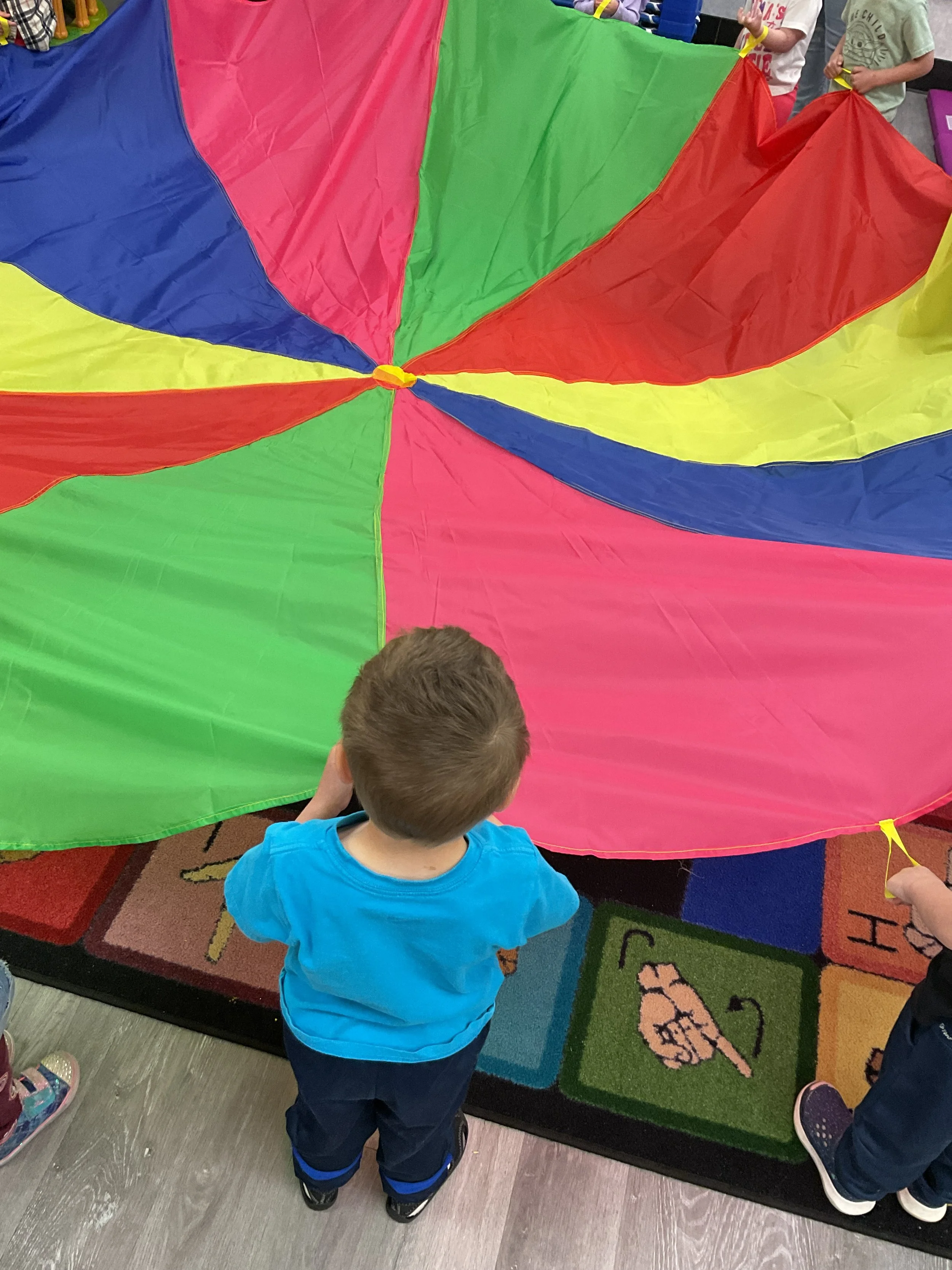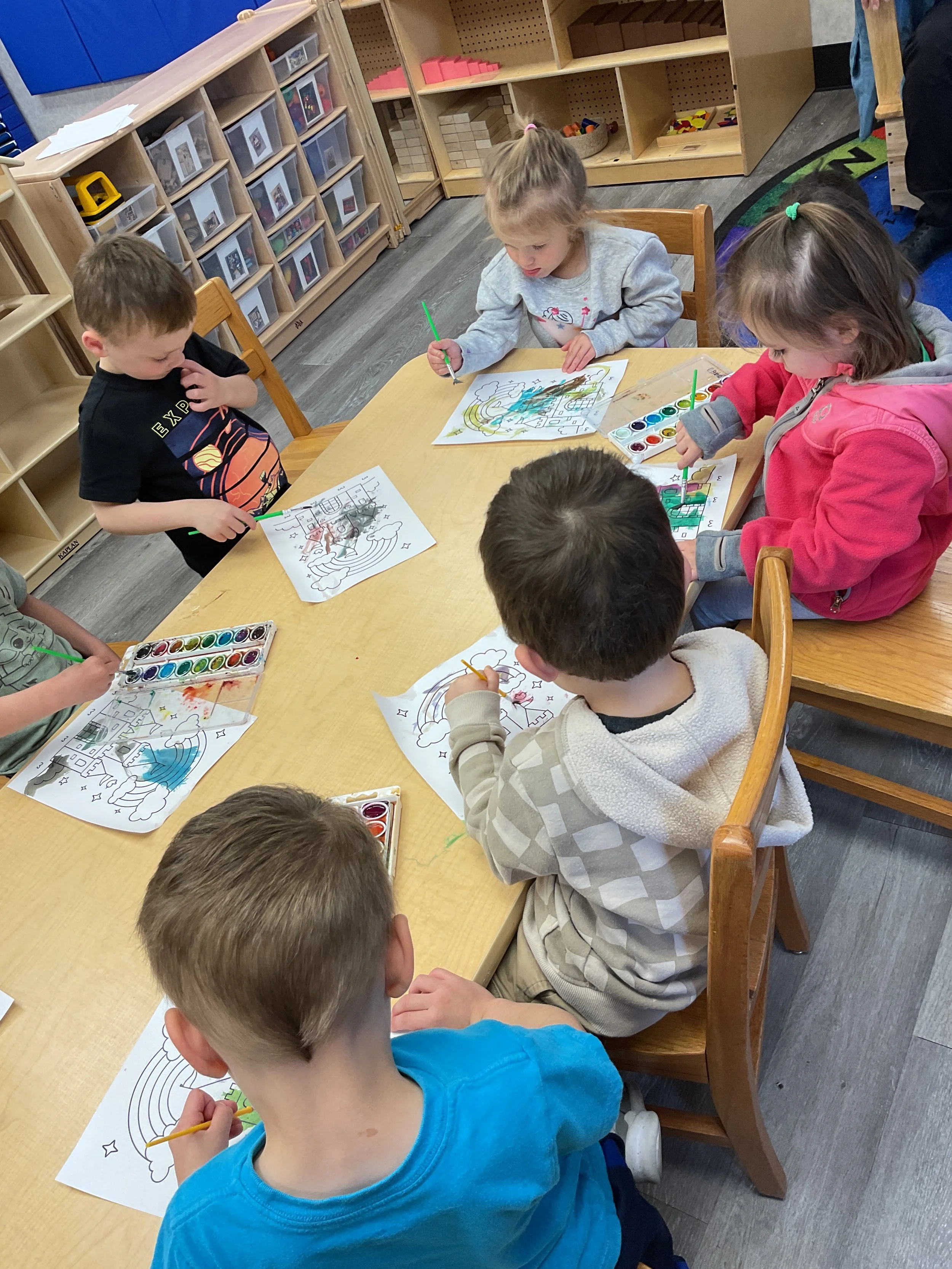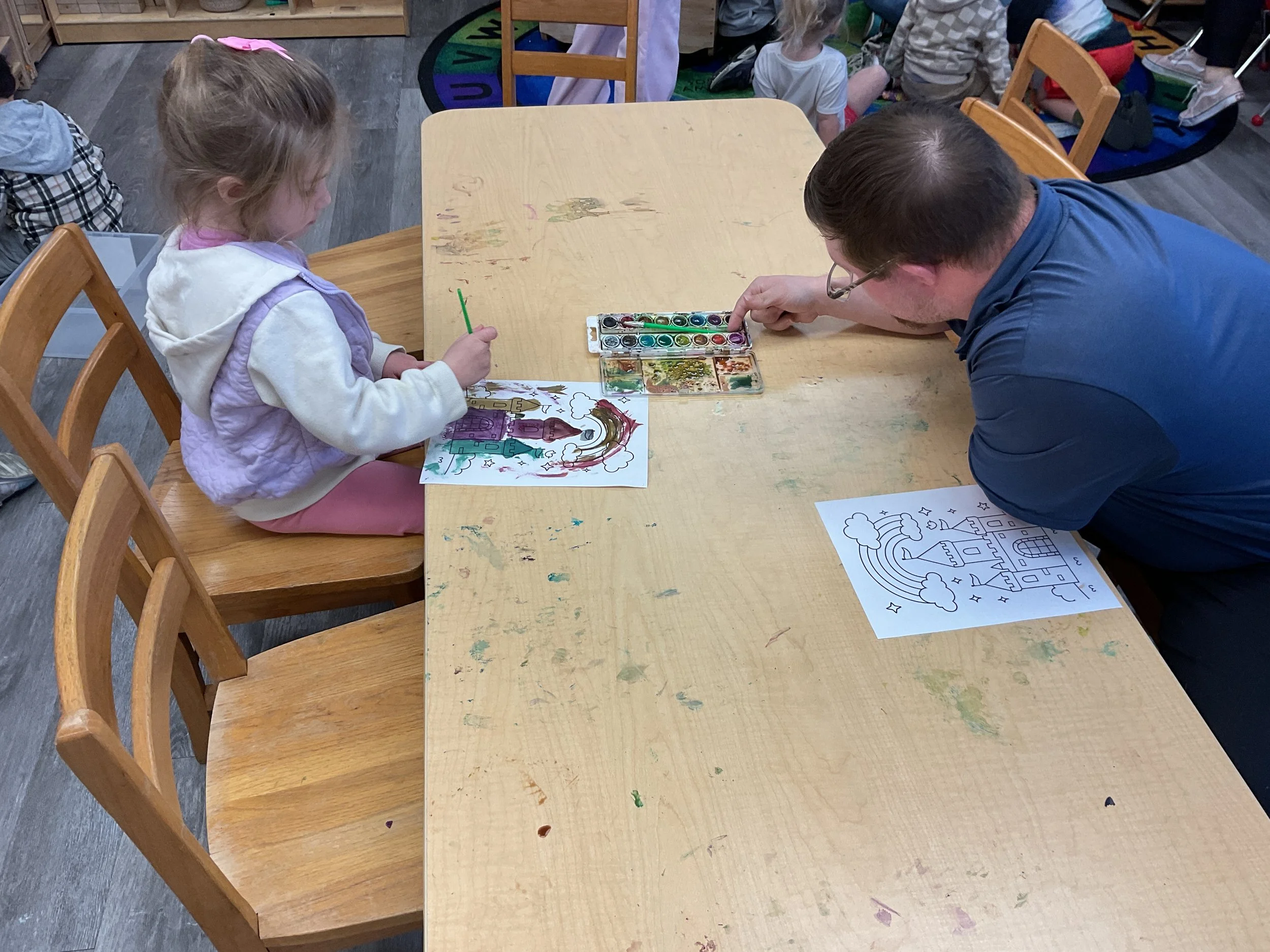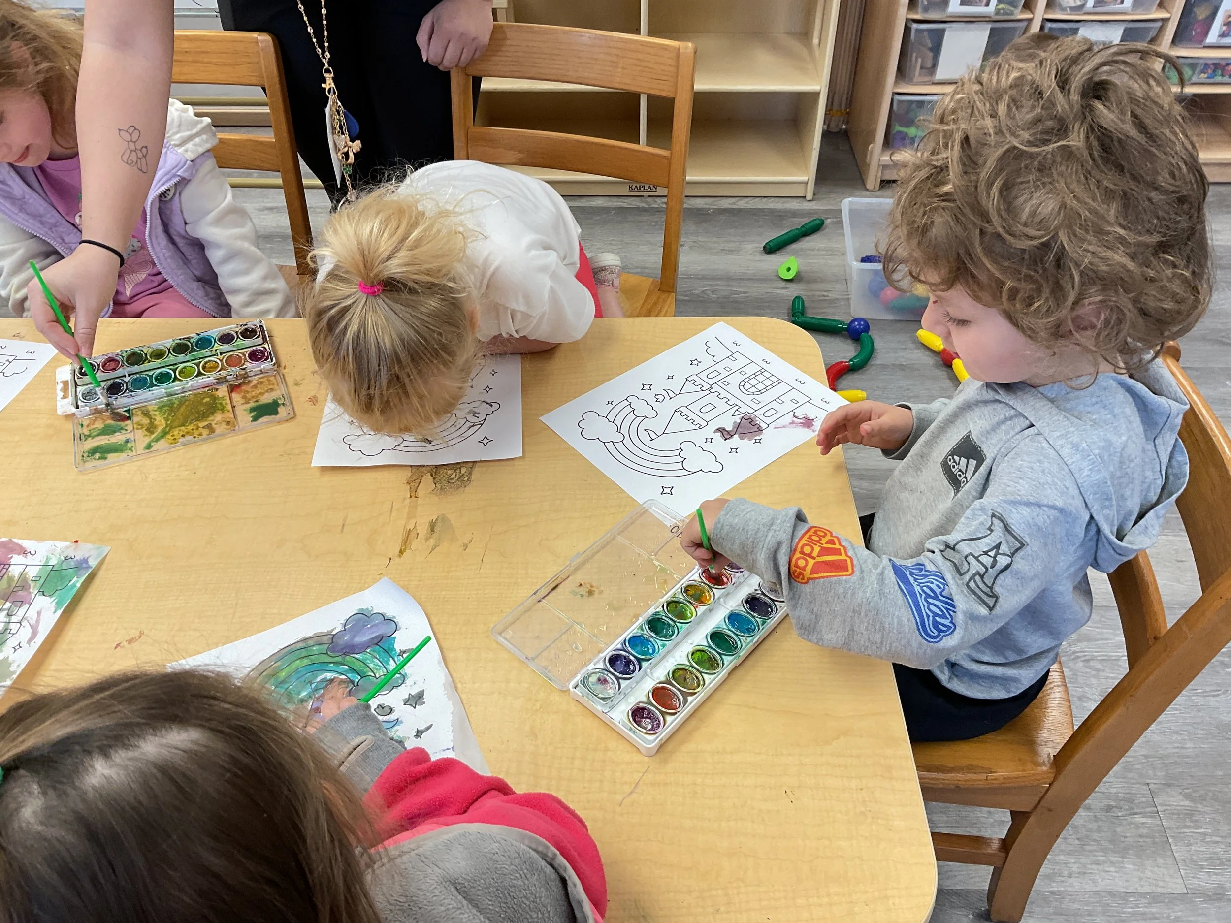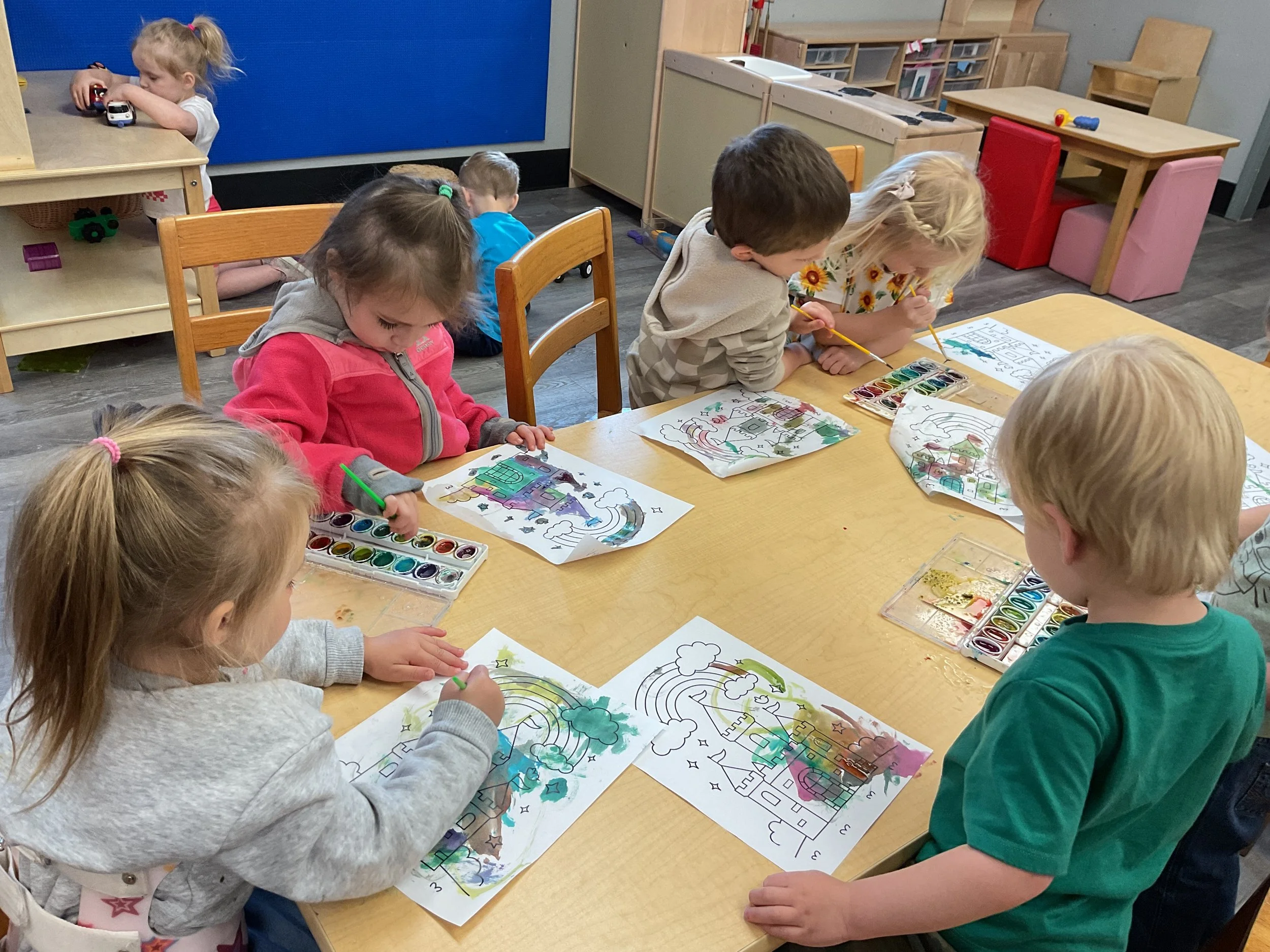 This morning, we read Walt Dinsey’s the Little Mermaid. We had a special visitor during our music and movement time! Nurse Katie from the health department came to talk to us about the importance of exercise. We played with a parachute and playground balls! Then, during our math and cognition lesson, we worked on simple addition using our fairytale little people. Next, for our science and sensory lesson, we watercolored a picture of a castle. Finally, for our literacy and fine motor lesson, we listened to a book on tape and practiced tracing and writing our names.