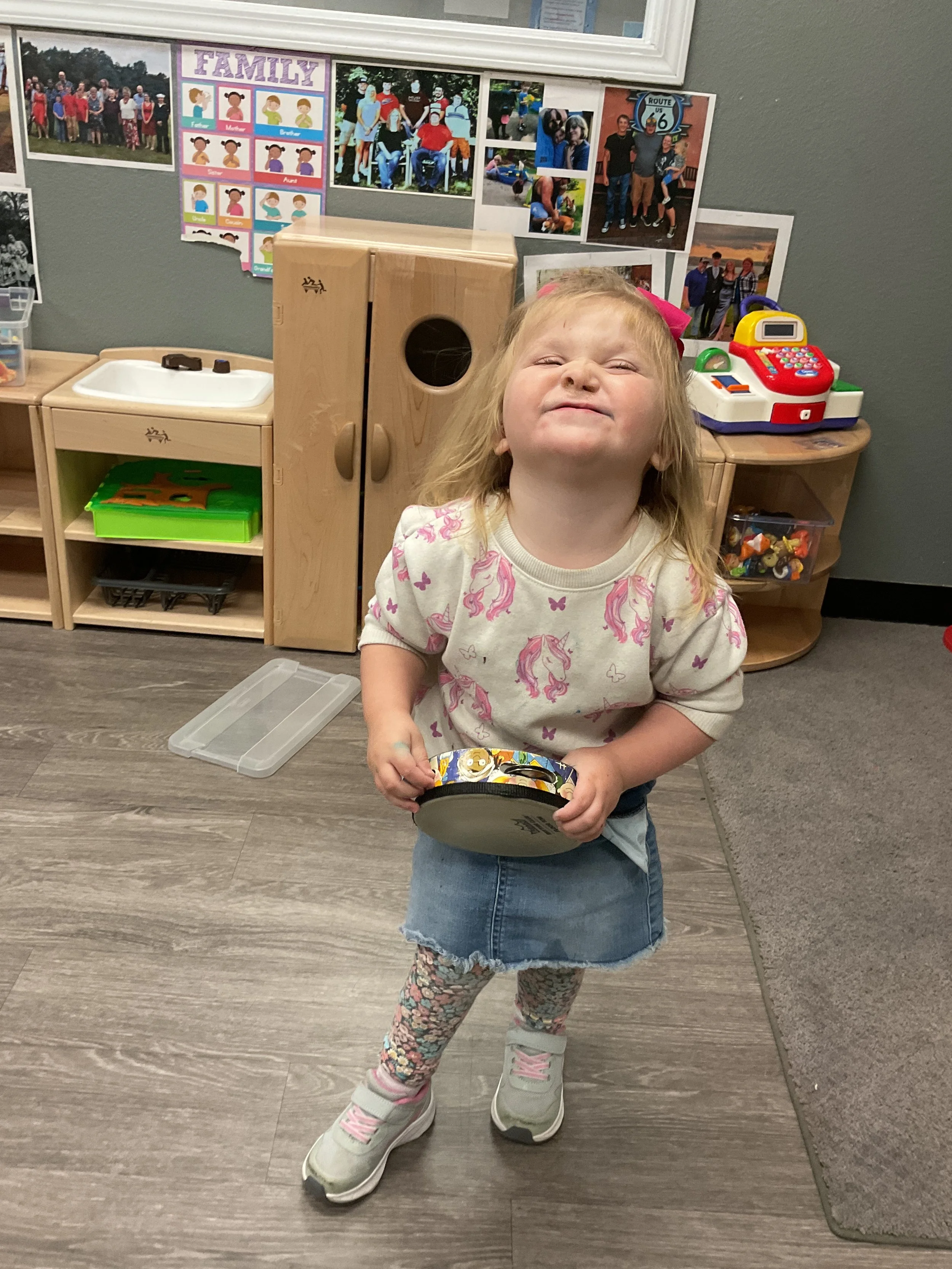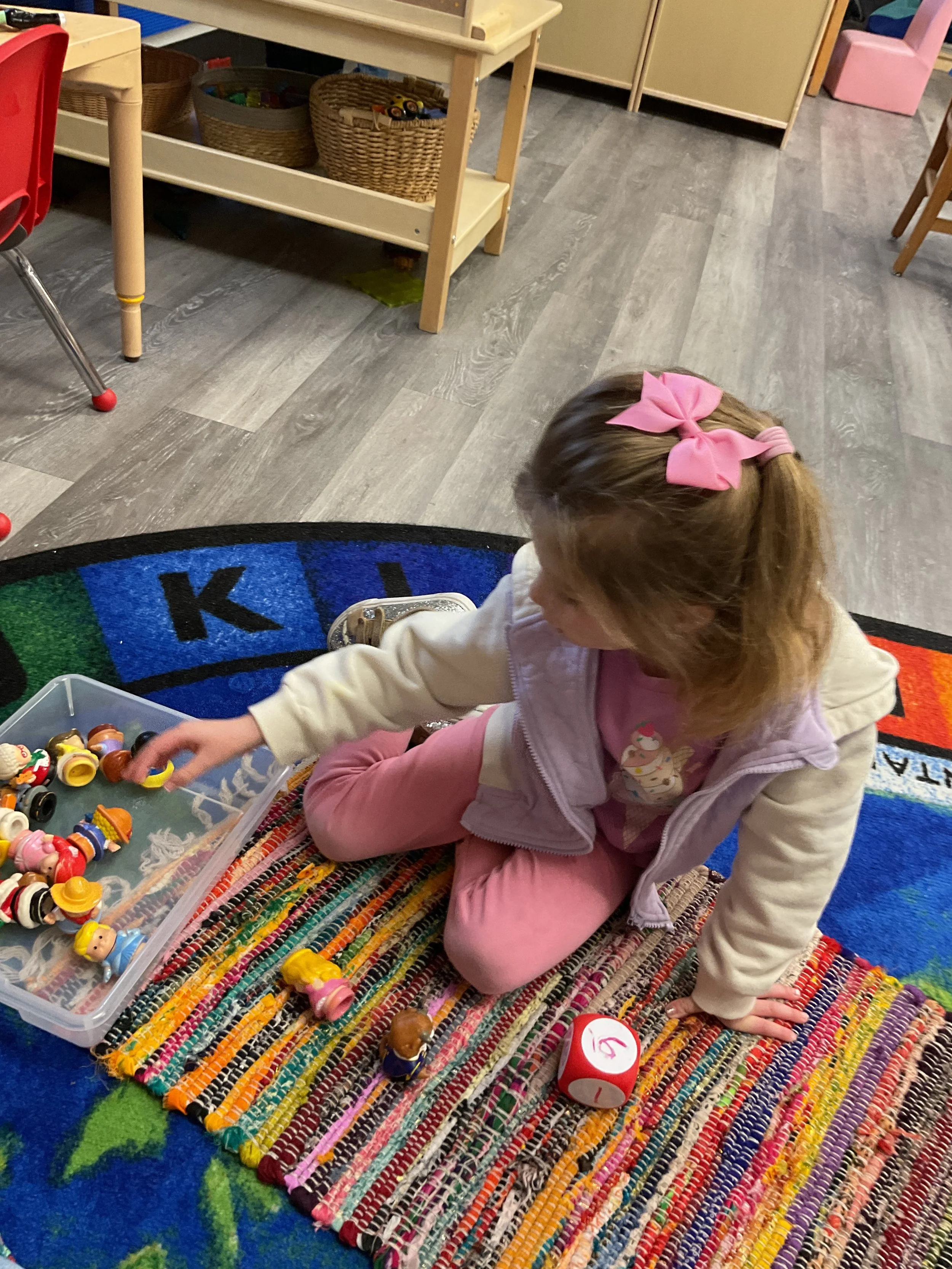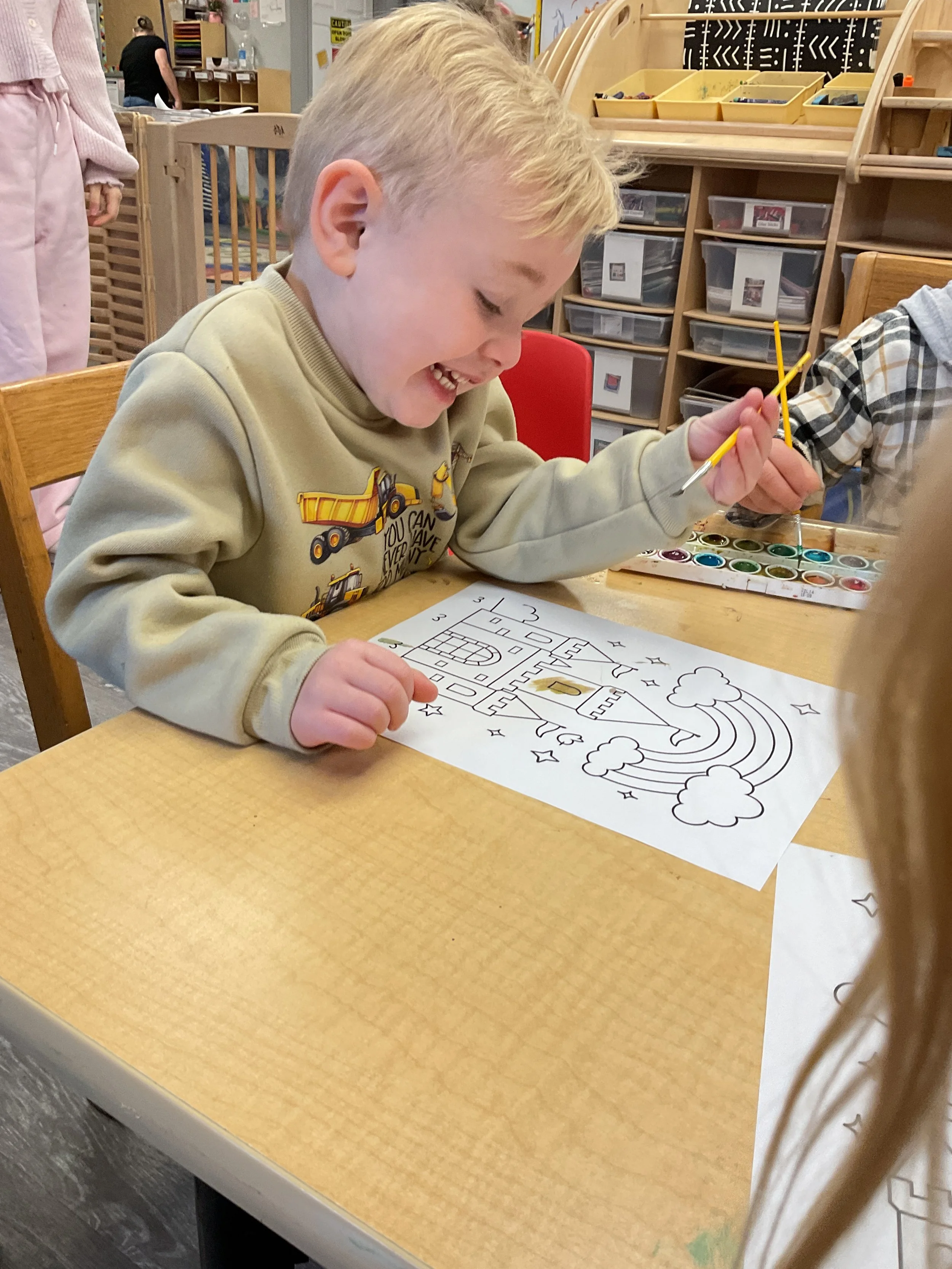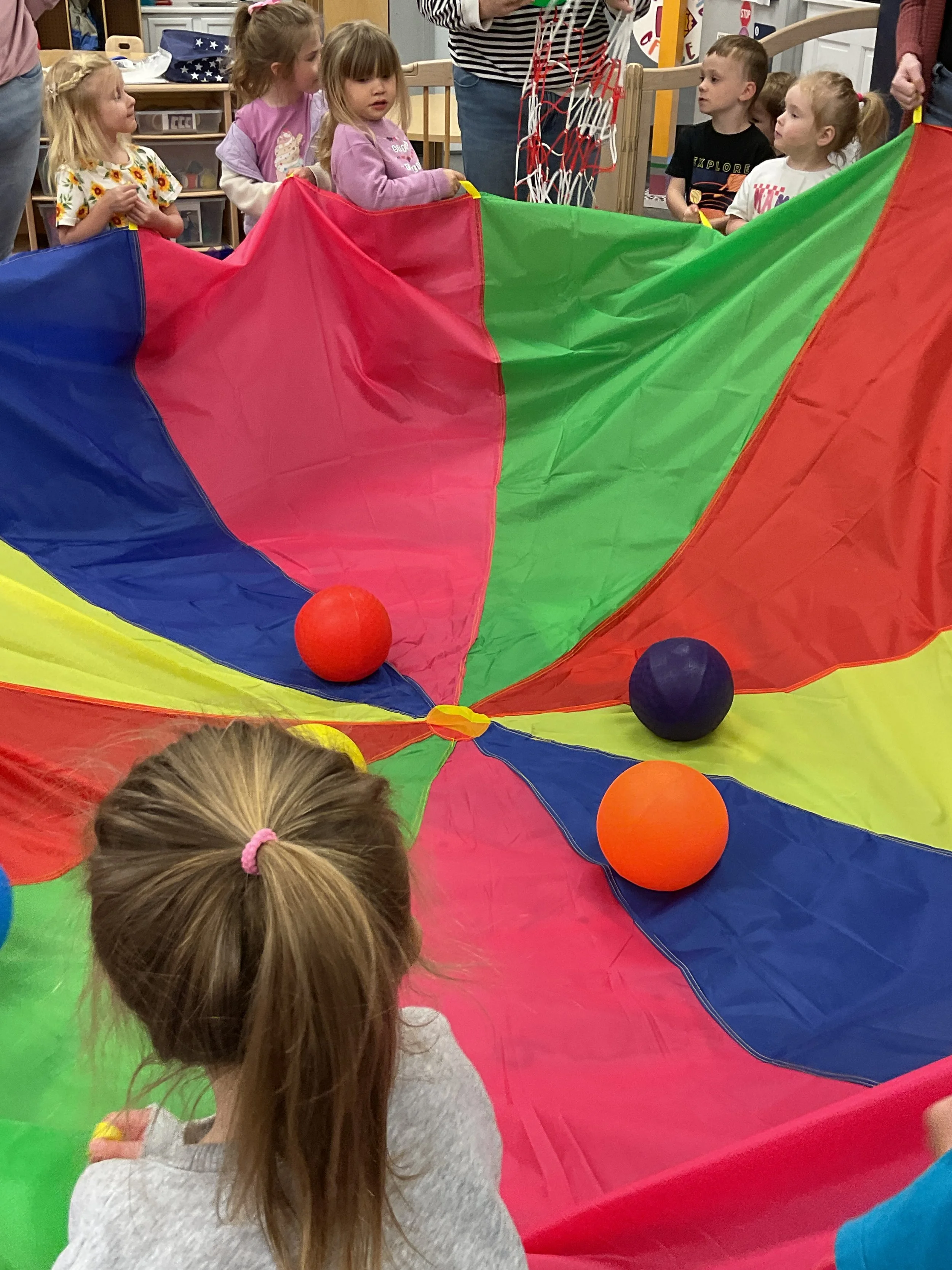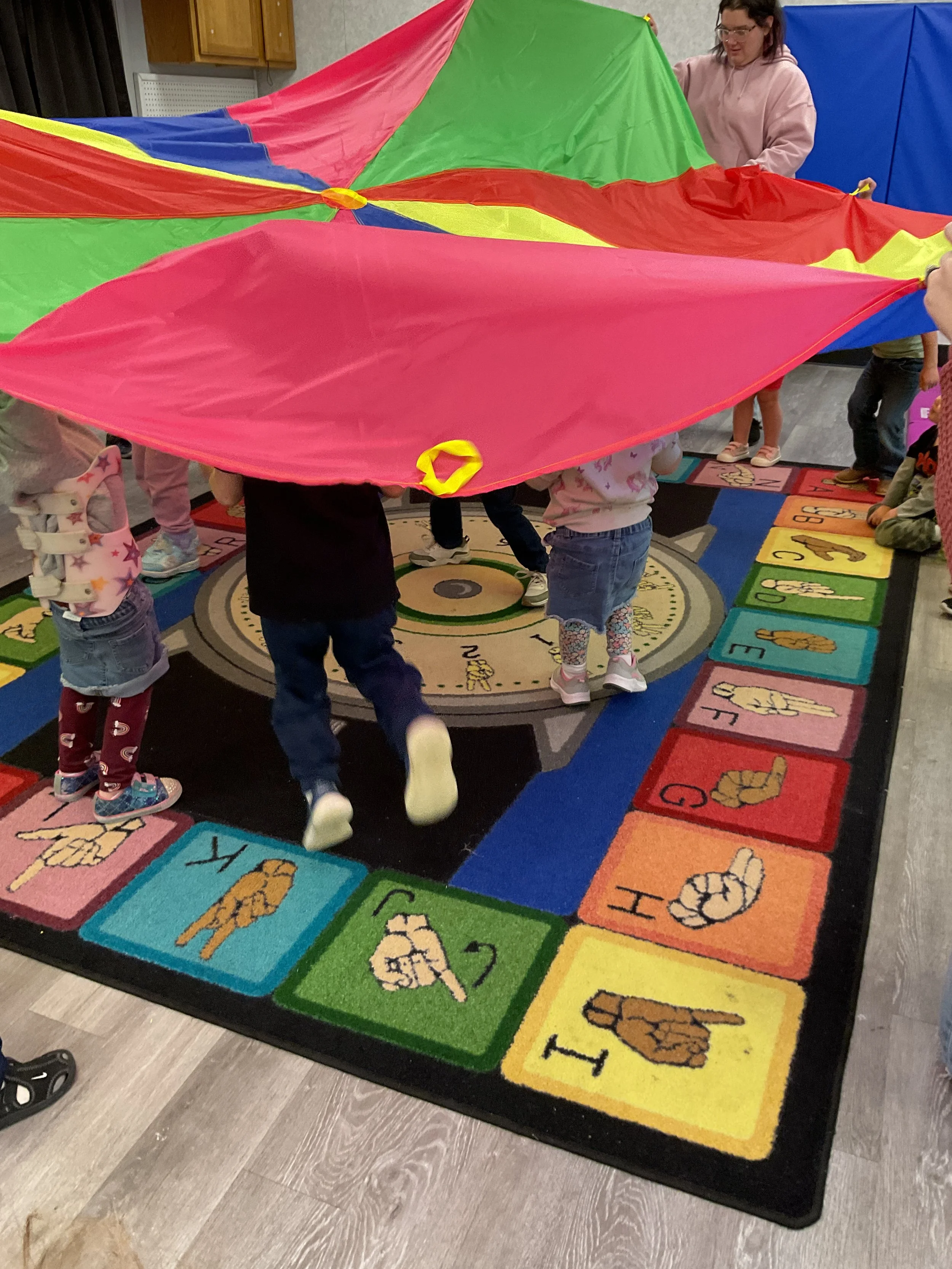This morning, we read Walt Dinsey’s the Little Mermaid. We had a special visitor during our music and movement time! Nurse Katie from the health department came to talk to us about the importance of exercise. We played with a parachute and playground balls! Then, during our math and cognition lesson, we worked on simple addition using our fairytale little people. Next, for our science and sensory lesson, we watercolored a picture of a castle. Finally, for our literacy and fine motor lesson, we listened to a book on tape and practiced tracing and writing our names.