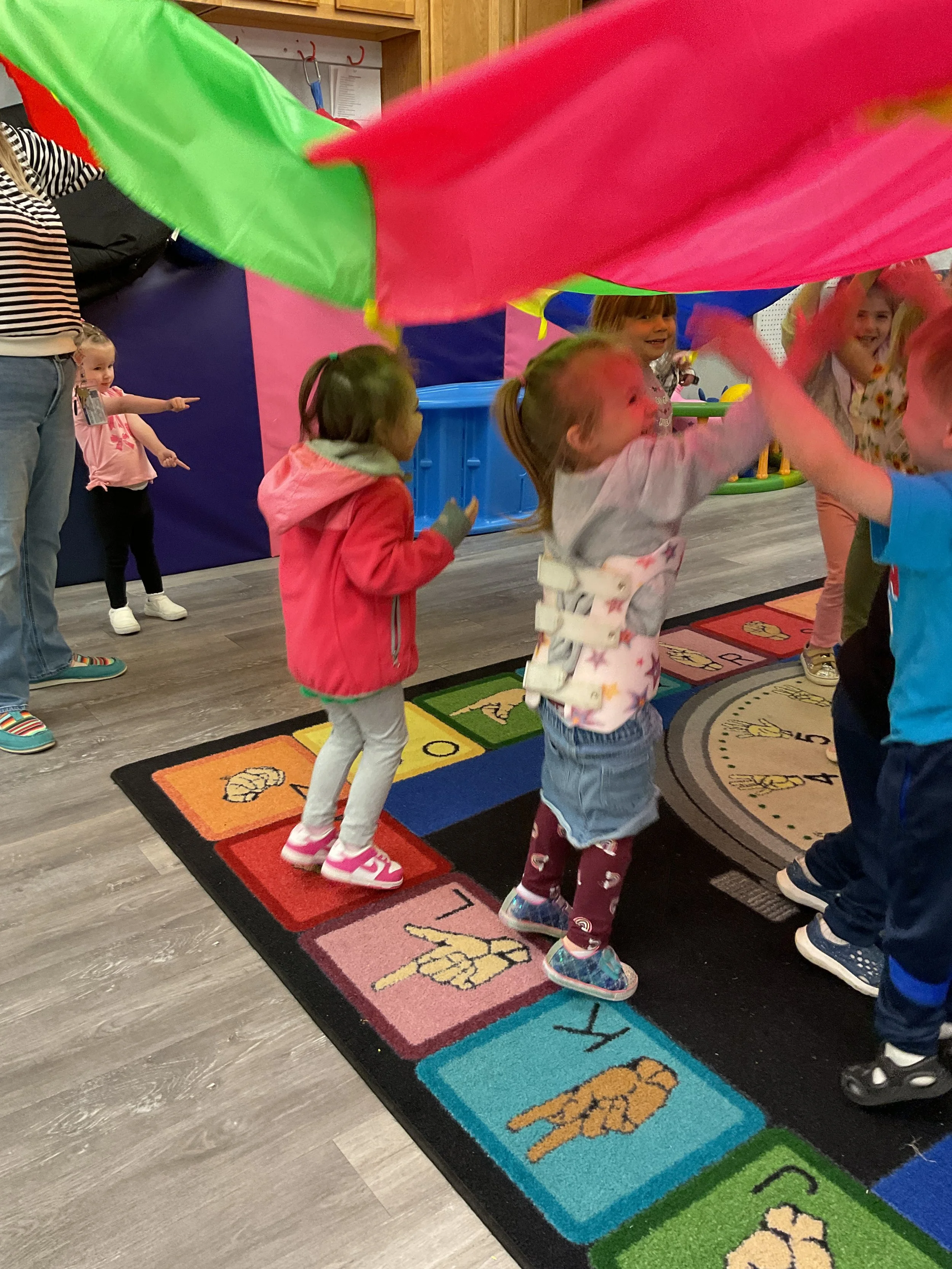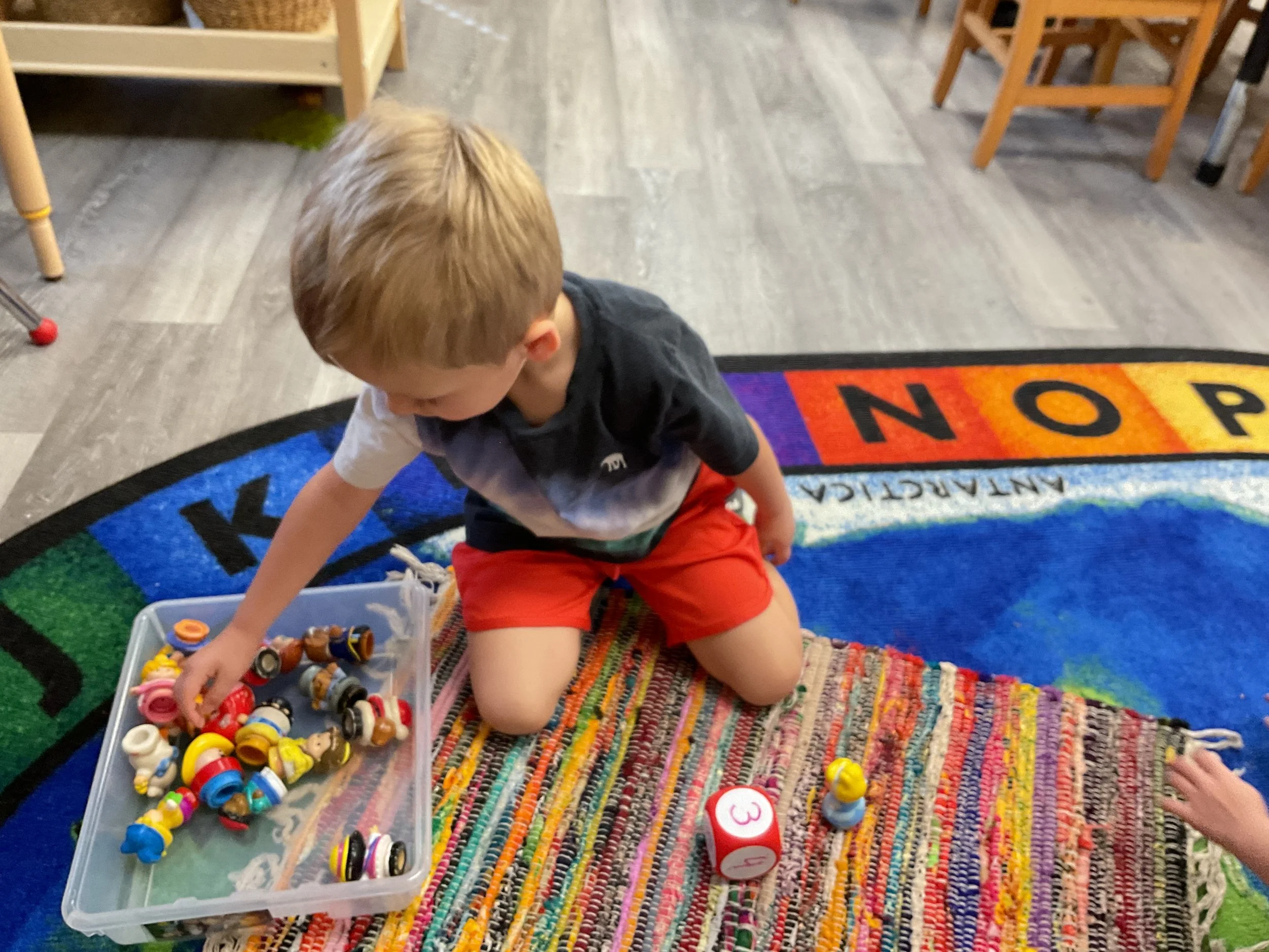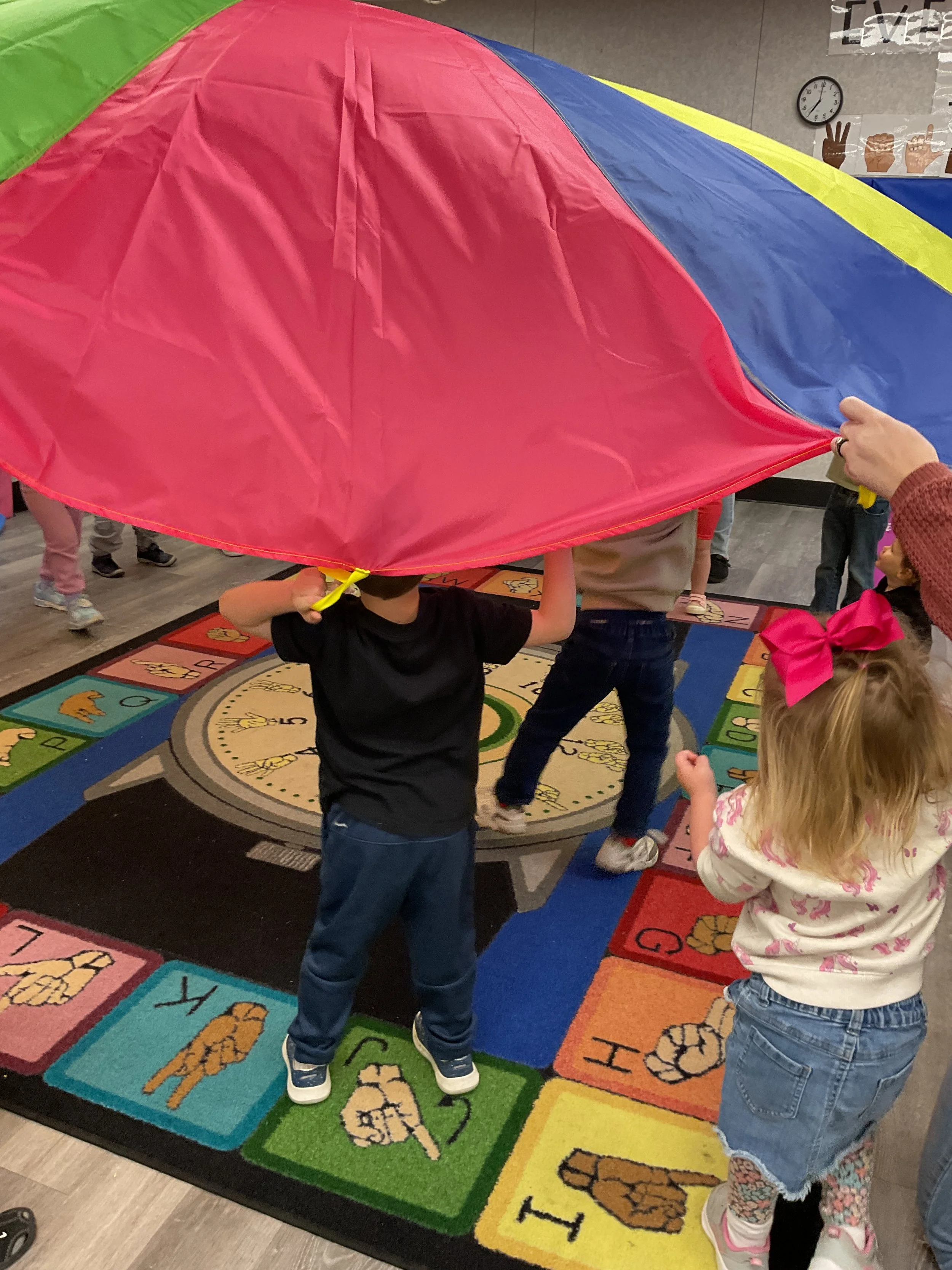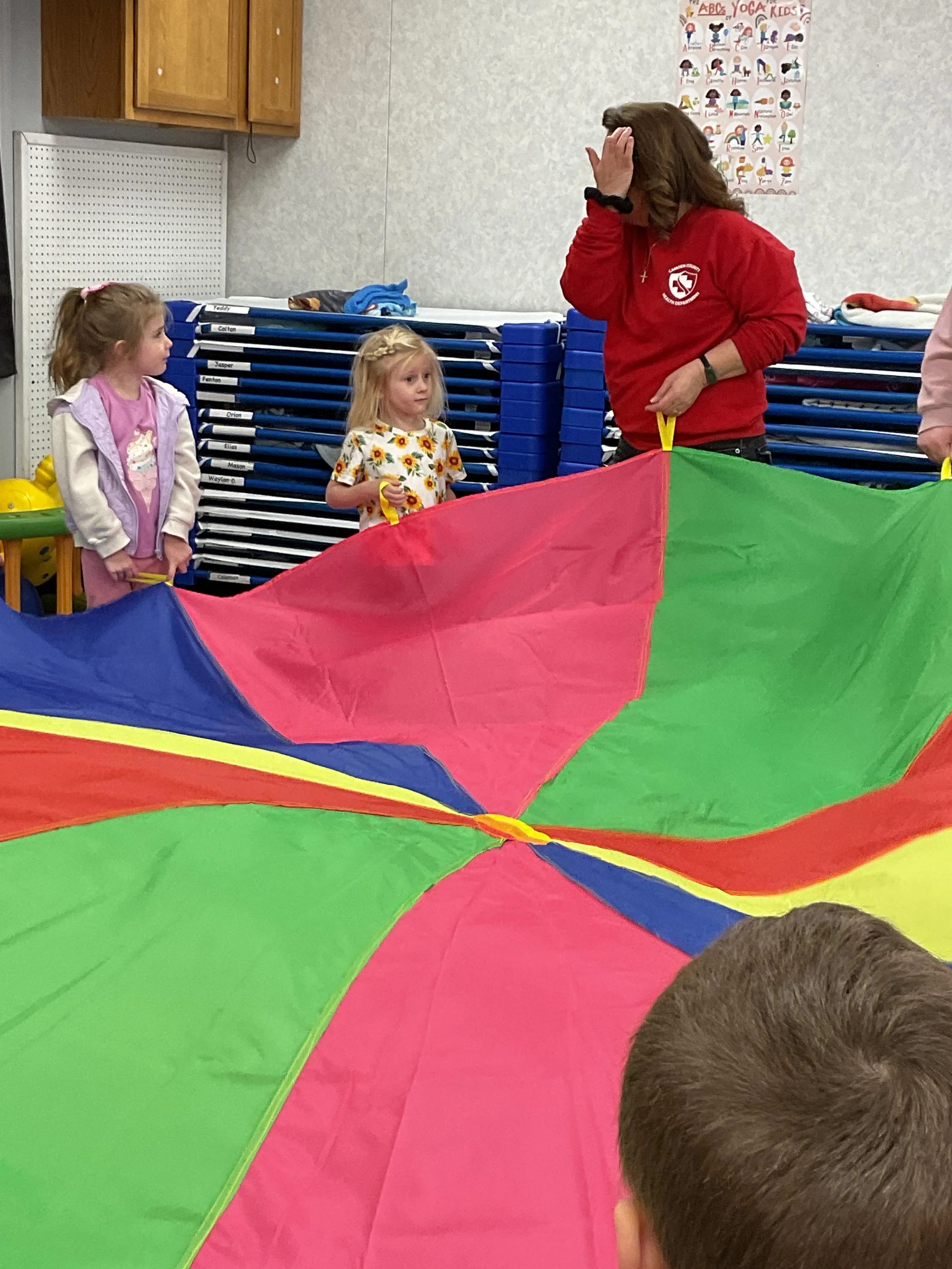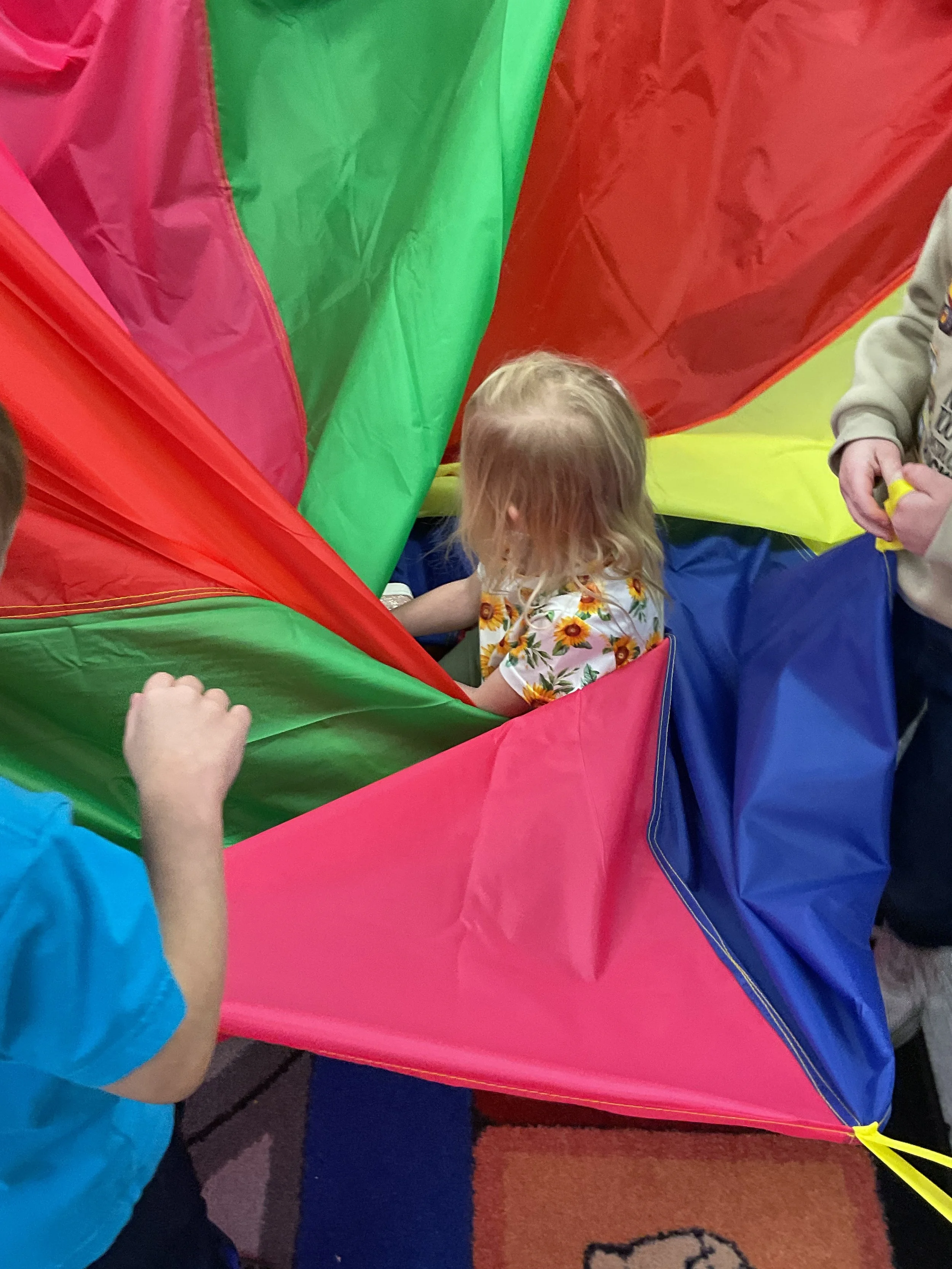 This morning, we read Walt Dinsey’s the Little Mermaid. We had a special visitor during our music and movement time! Nurse Katie from the health department came to talk to us about the importance of exercise. We played with a parachute and playground balls! Then, during our math and cognition lesson, we worked on simple addition using our fairytale little people. Next, for our science and sensory lesson, we watercolored a picture of a castle. Finally, for our literacy and fine motor lesson, we listened to a book on tape and practiced tracing and writing our names.