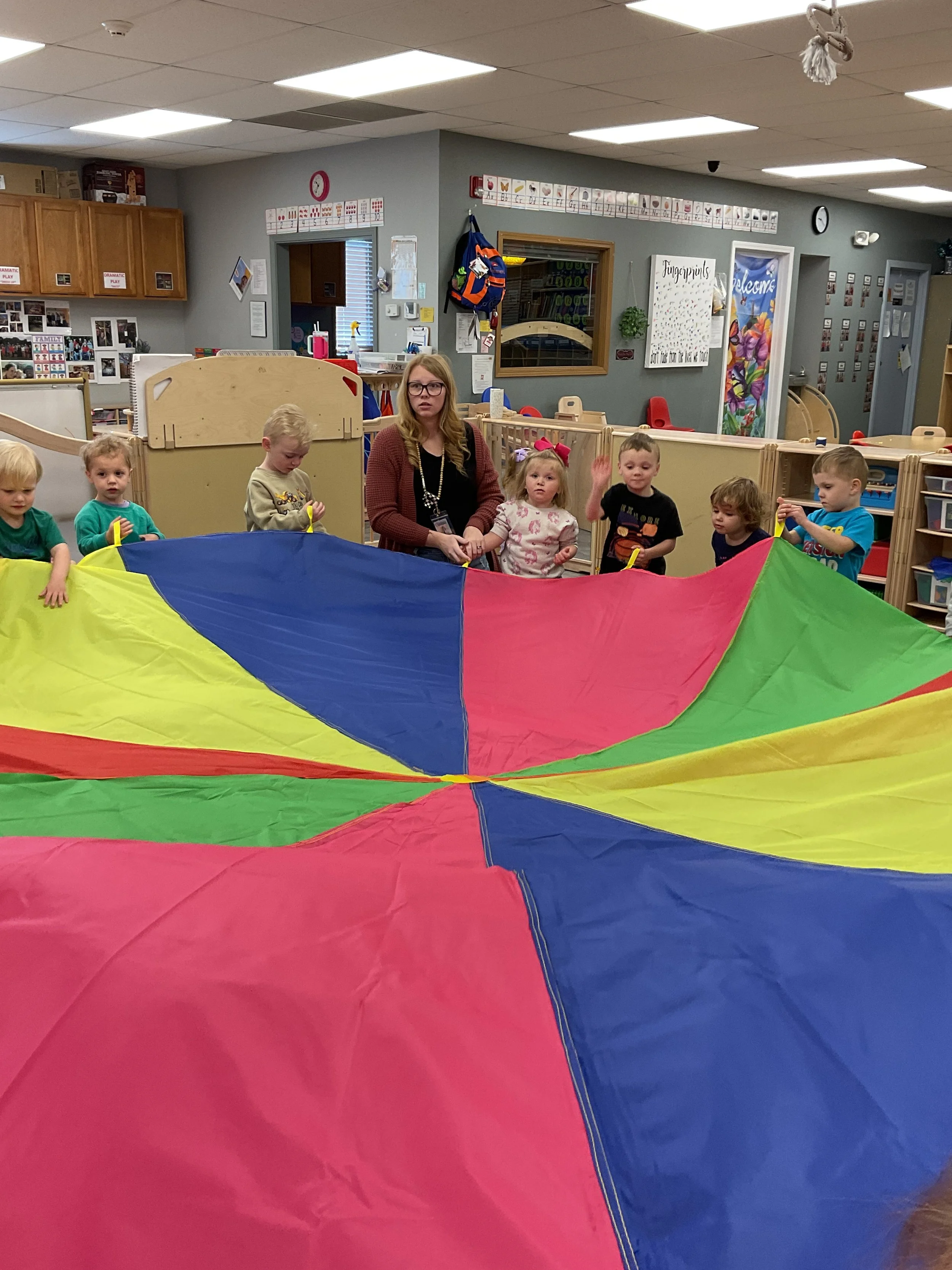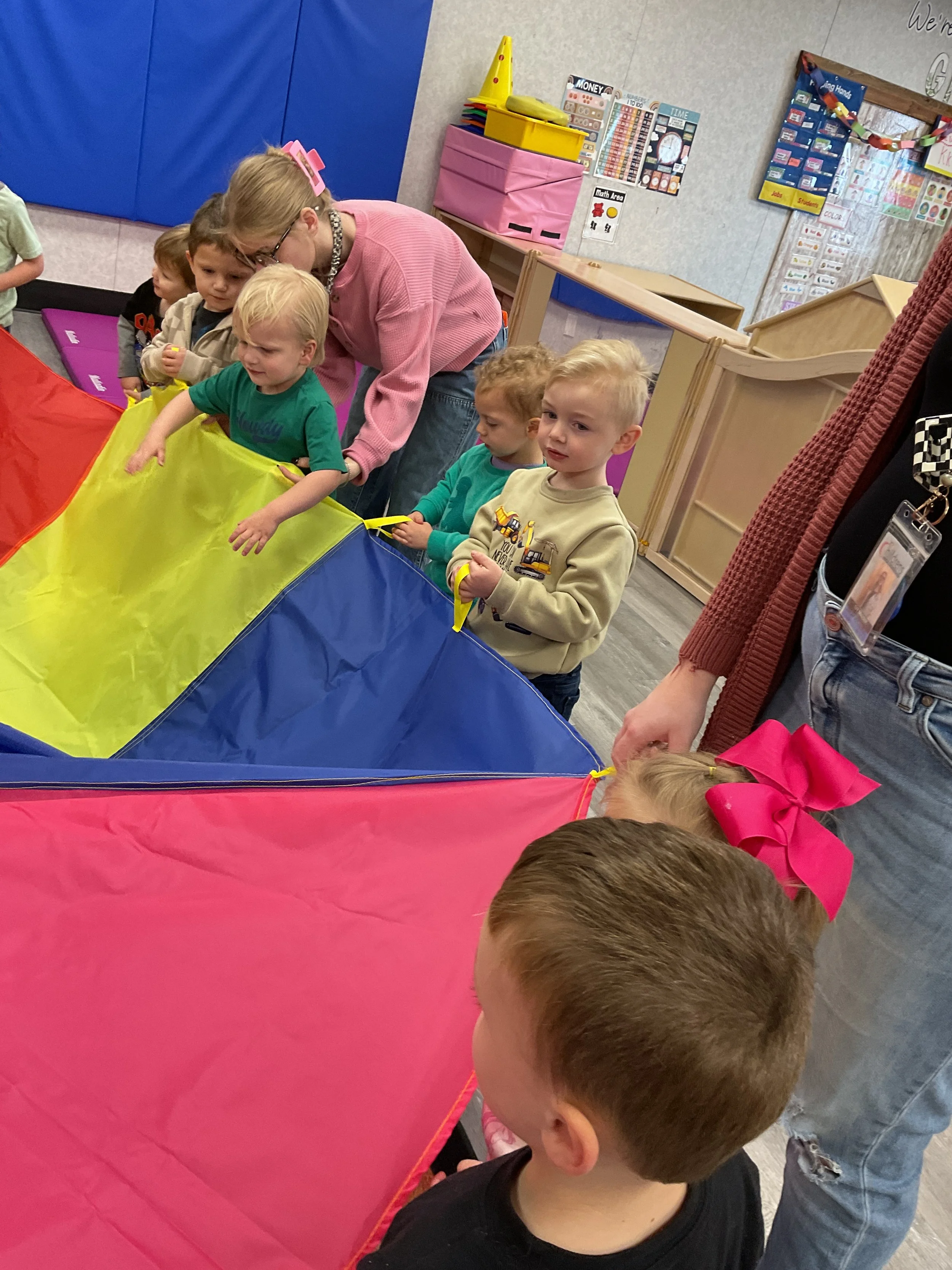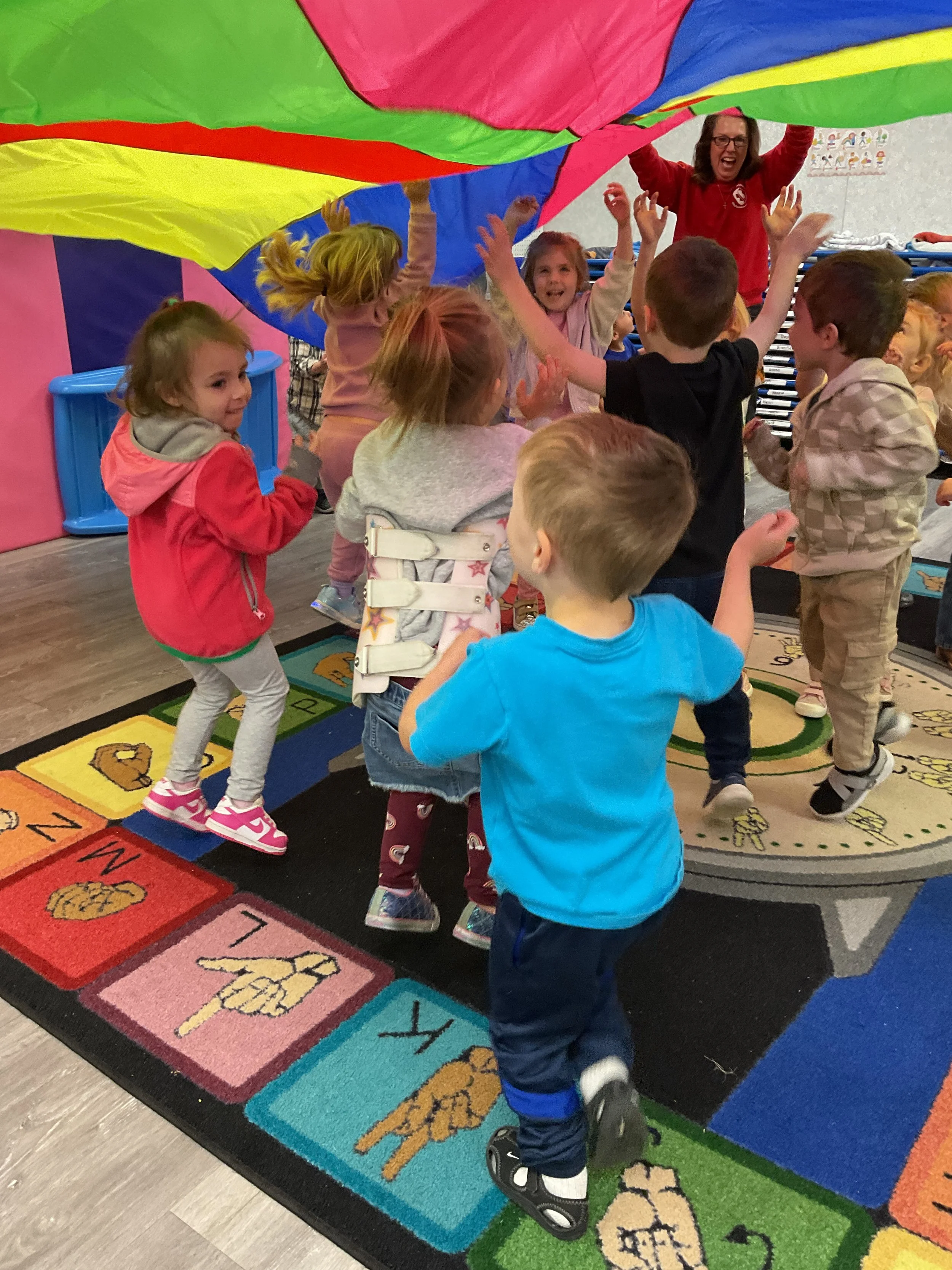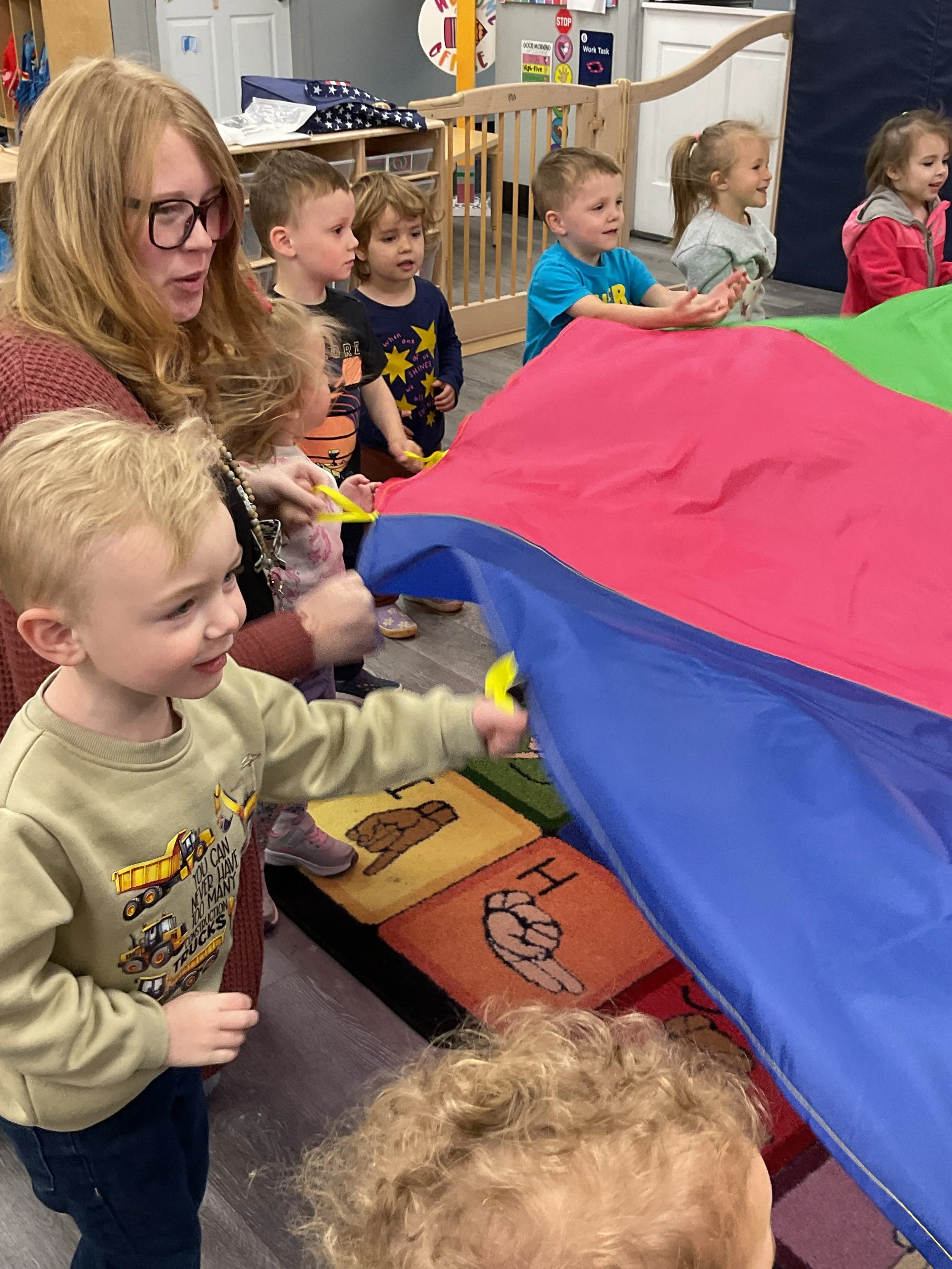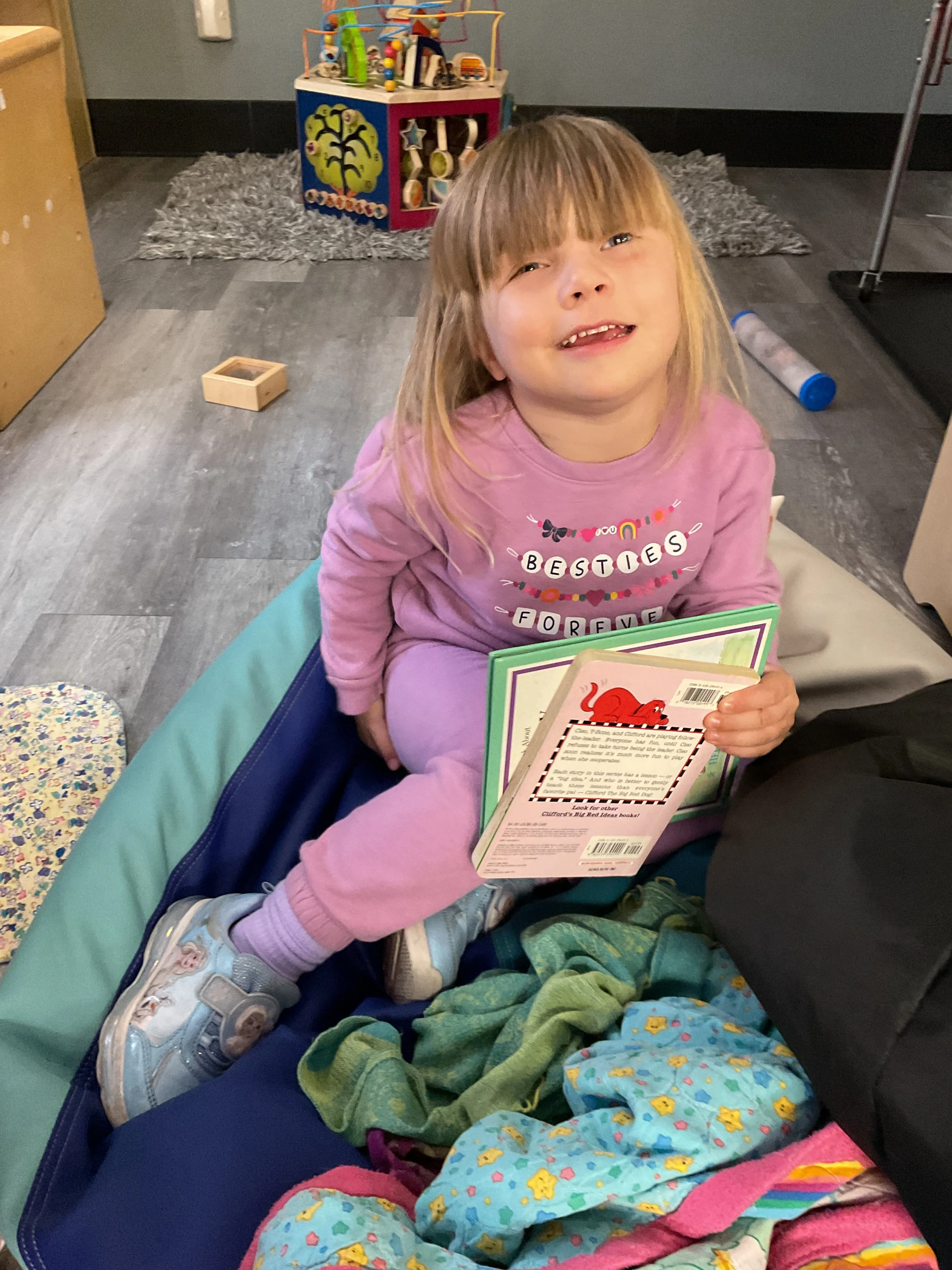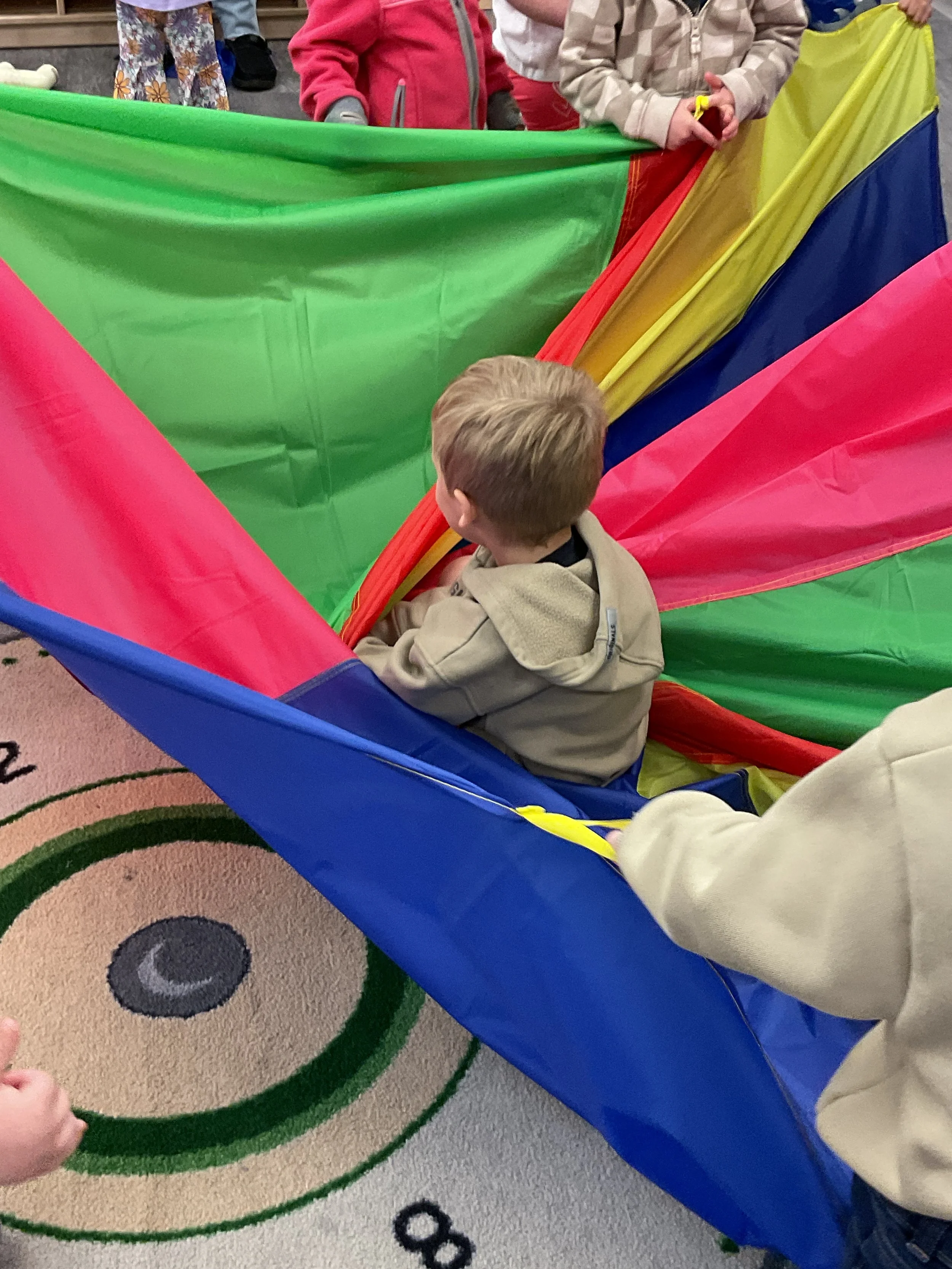 This morning, we read Walt Dinsey’s the Little Mermaid. We had a special visitor during our music and movement time! Nurse Katie from the health department came to talk to us about the importance of exercise. We played with a parachute and playground balls! Then, during our math and cognition lesson, we worked on simple addition using our fairytale little people. Next, for our science and sensory lesson, we watercolored a picture of a castle. Finally, for our literacy and fine motor lesson, we listened to a book on tape and practiced tracing and writing our names.