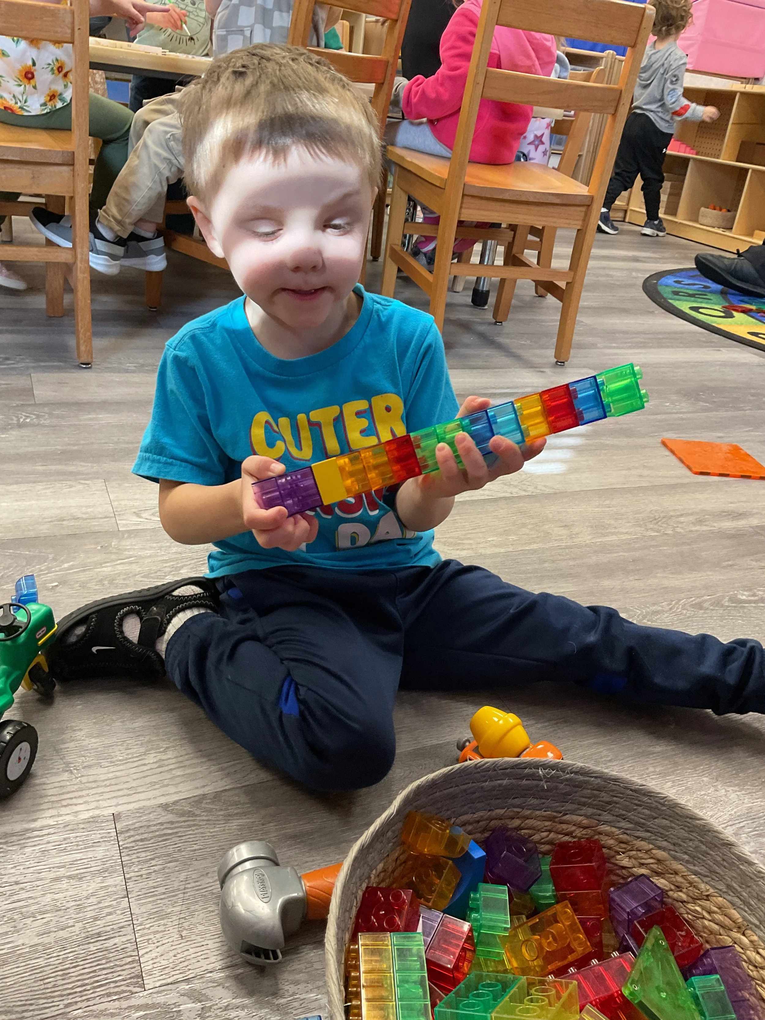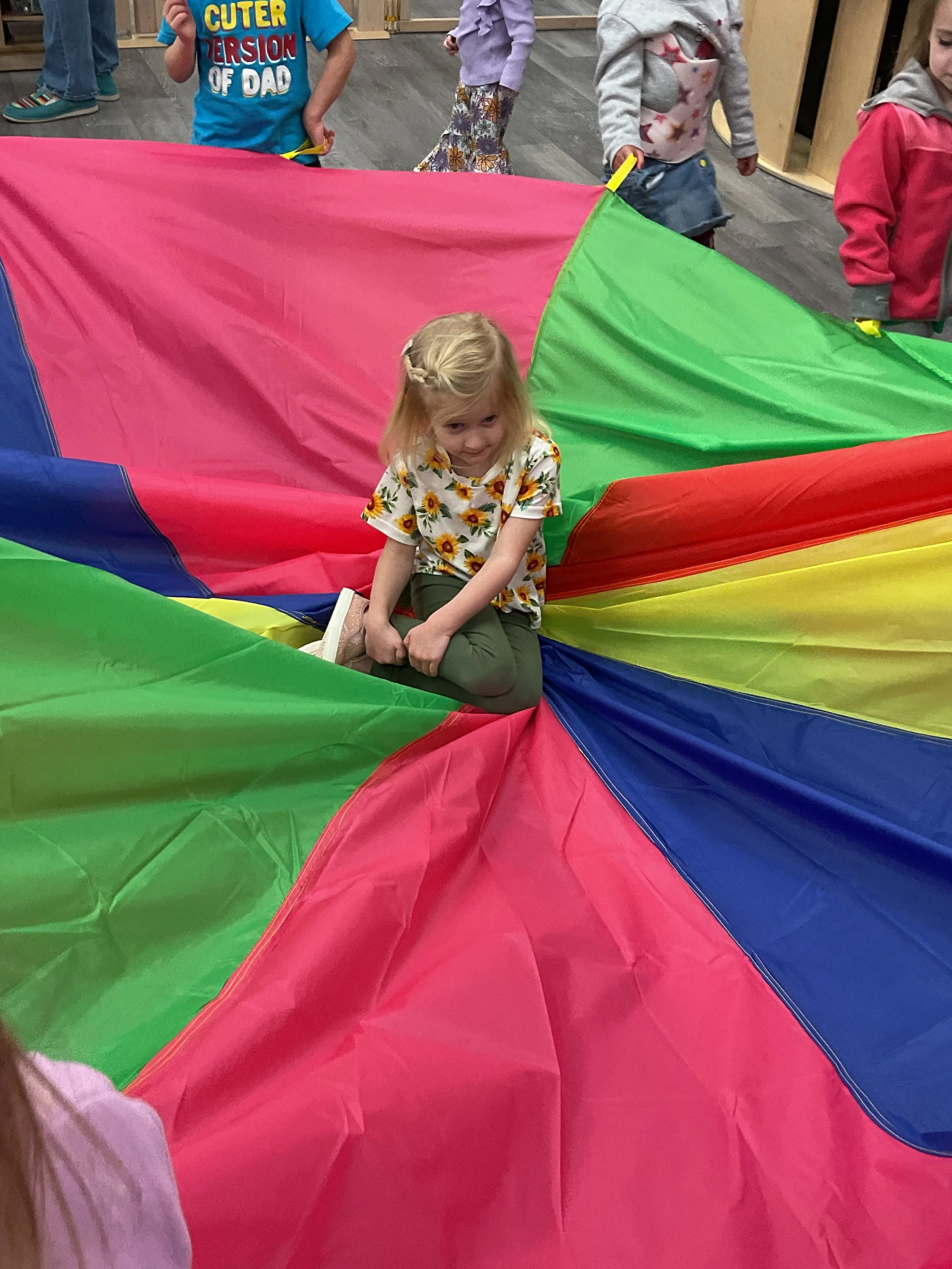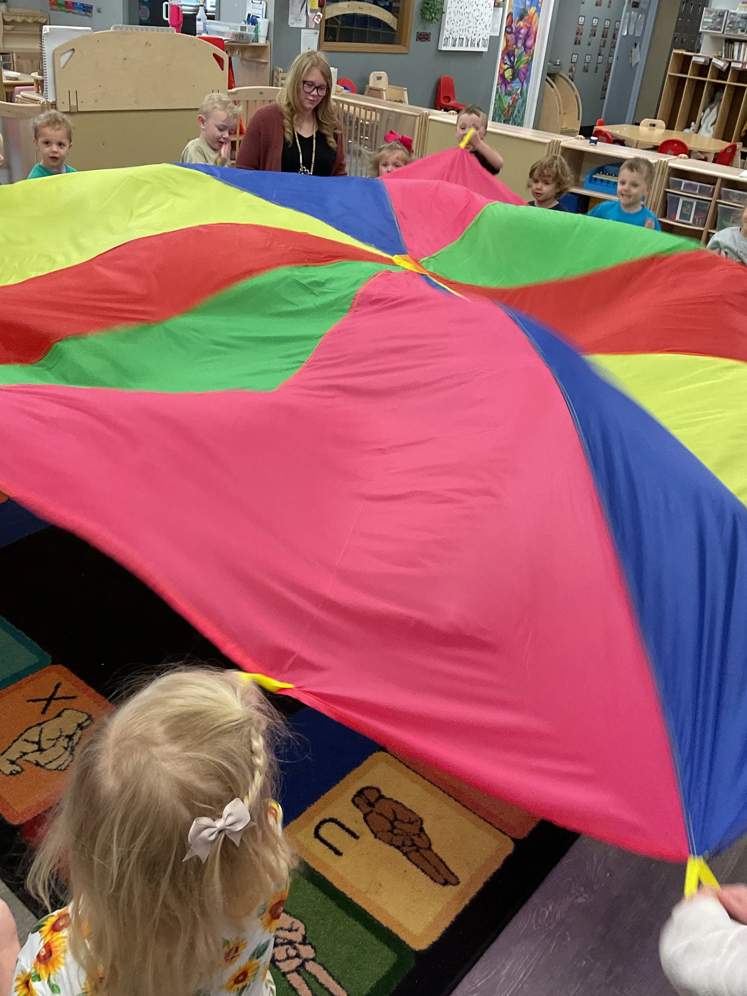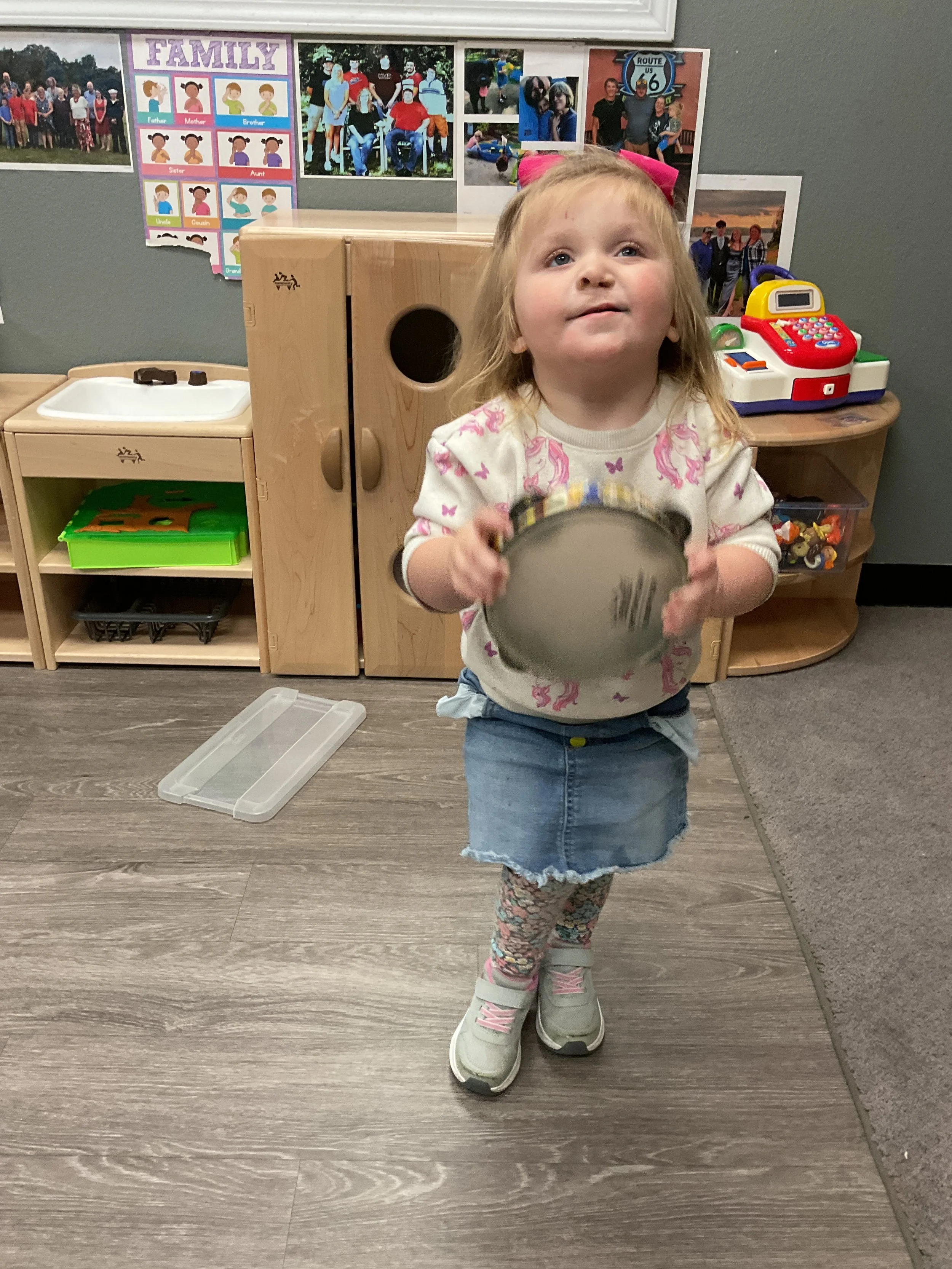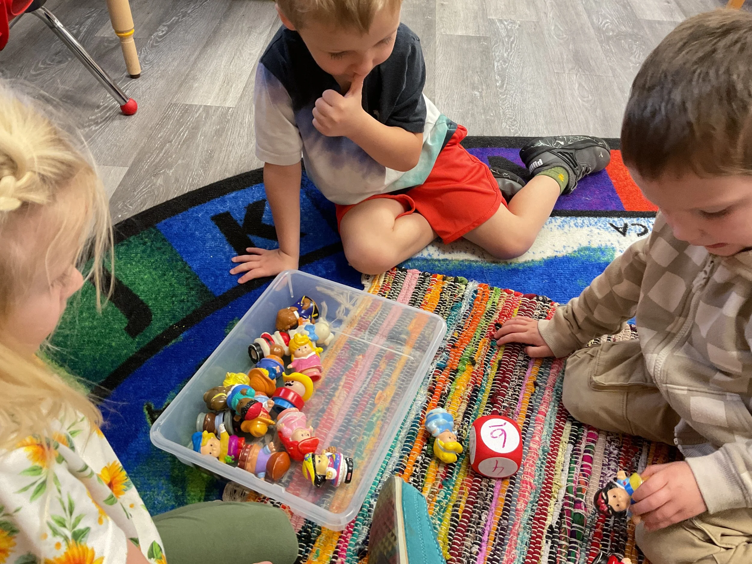 This morning, we read Walt Dinsey’s the Little Mermaid. We had a special visitor during our music and movement time! Nurse Katie from the health department came to talk to us about the importance of exercise. We played with a parachute and playground balls! Then, during our math and cognition lesson, we worked on simple addition using our fairytale little people. Next, for our science and sensory lesson, we watercolored a picture of a castle. Finally, for our literacy and fine motor lesson, we listened to a book on tape and practiced tracing and writing our names.