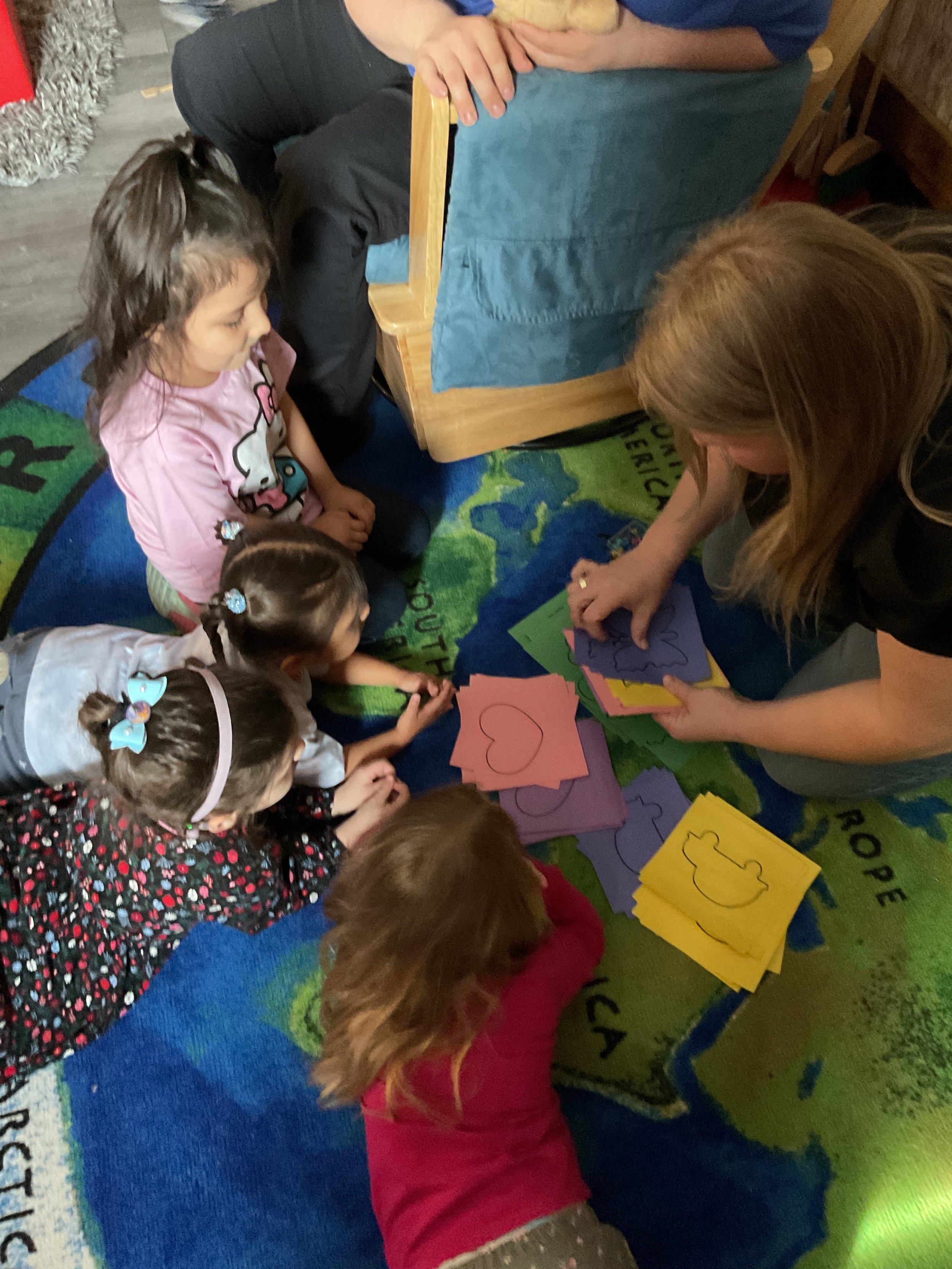 Today we read the book The Littlest Leprechaun by Brandi Dougherty and illustrated by Michelle Lisa Todd. We had a great time stretching our bodies during yoga this morning! During our math and cognition activity, we matched different shapes on pots of gold. Next, during our science and sensory lesson, we filled our sensory bin with all the green things we could find! Finally, during our fine motor and cognition lesson, we practiced tracing our names!