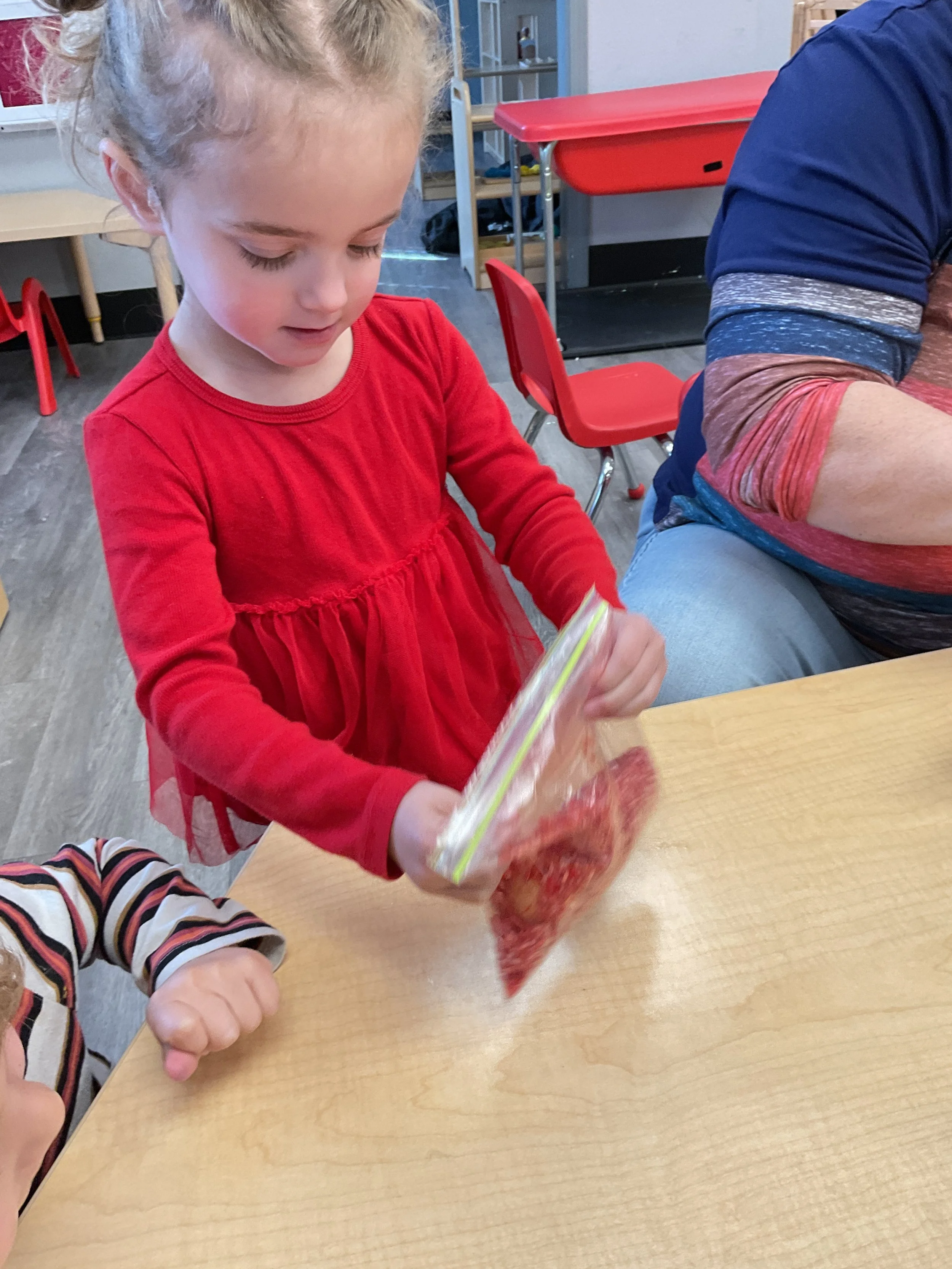 Today we read the book Little Quack’s New Friend written by Lauren Thompson and illustrated by Derek Anderson. During our music and movement time, we had a dance party! For our math and cognition lesson, we counted eggs in a nest and marked the number with a clothespin. Next, during our science and sensory lesson, we dyed easter eggs by using rice and a few drops of food coloring! Finally, for our fine motor and literacy lesson, we made a jar full of jellybeans made from our fingerprints!
