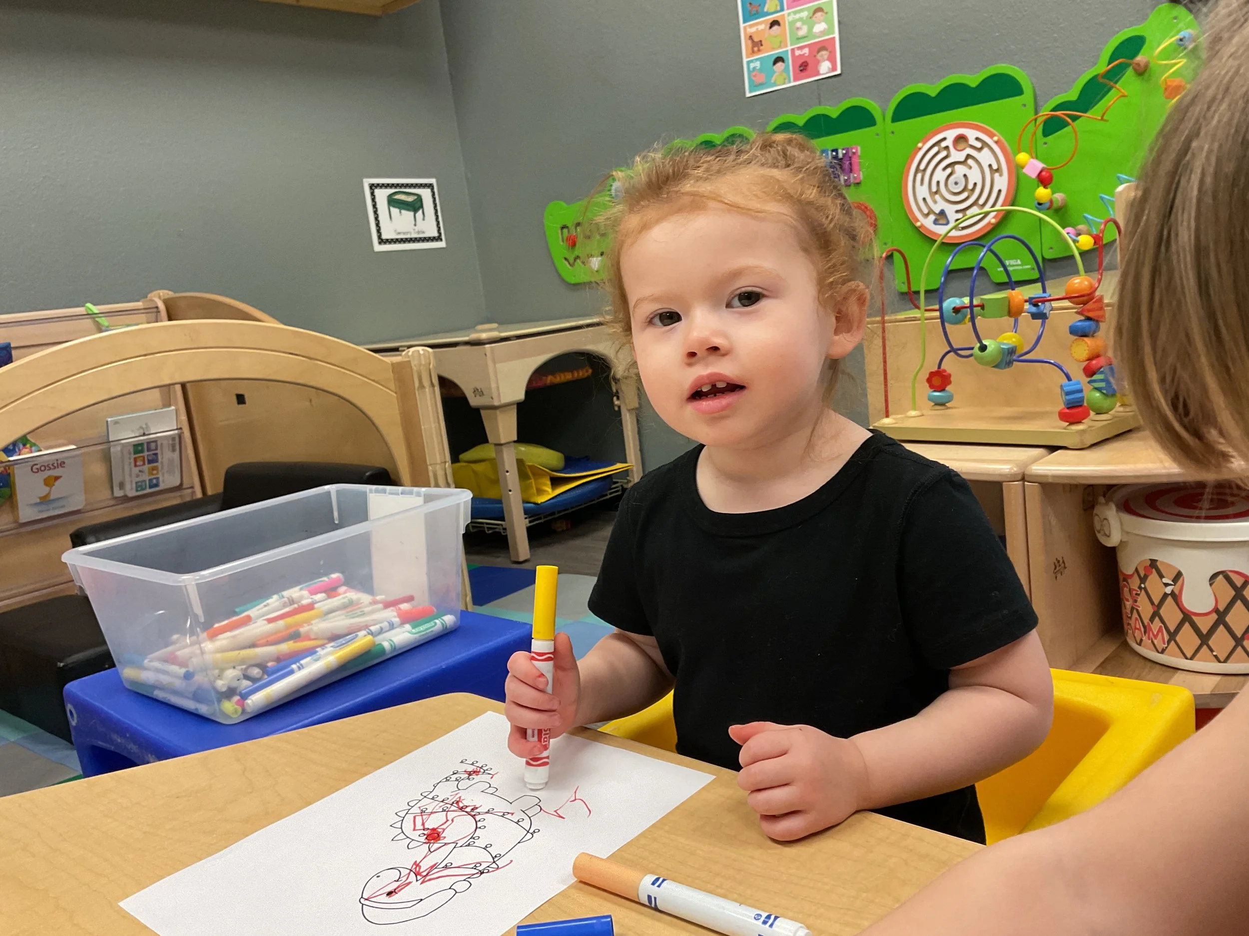 Today we read the book The Gingerbread Bear by Robert Dennis and illustrated by Tammie Lyon. This morning, during our music and movement time, we went on a color scavenger hunt by filling colored baskets with colored items from the classroom and motor room! Next, during math and cognition lesson, we sorted stockings by color. Then, for our science and sensory lesson, we colored a Christmas dinosaur! Finally, for our fine motor and literacy lesson, we practiced tracing and writing our names! Chippy the Elf found a comfy spot in our Christmas tree today!