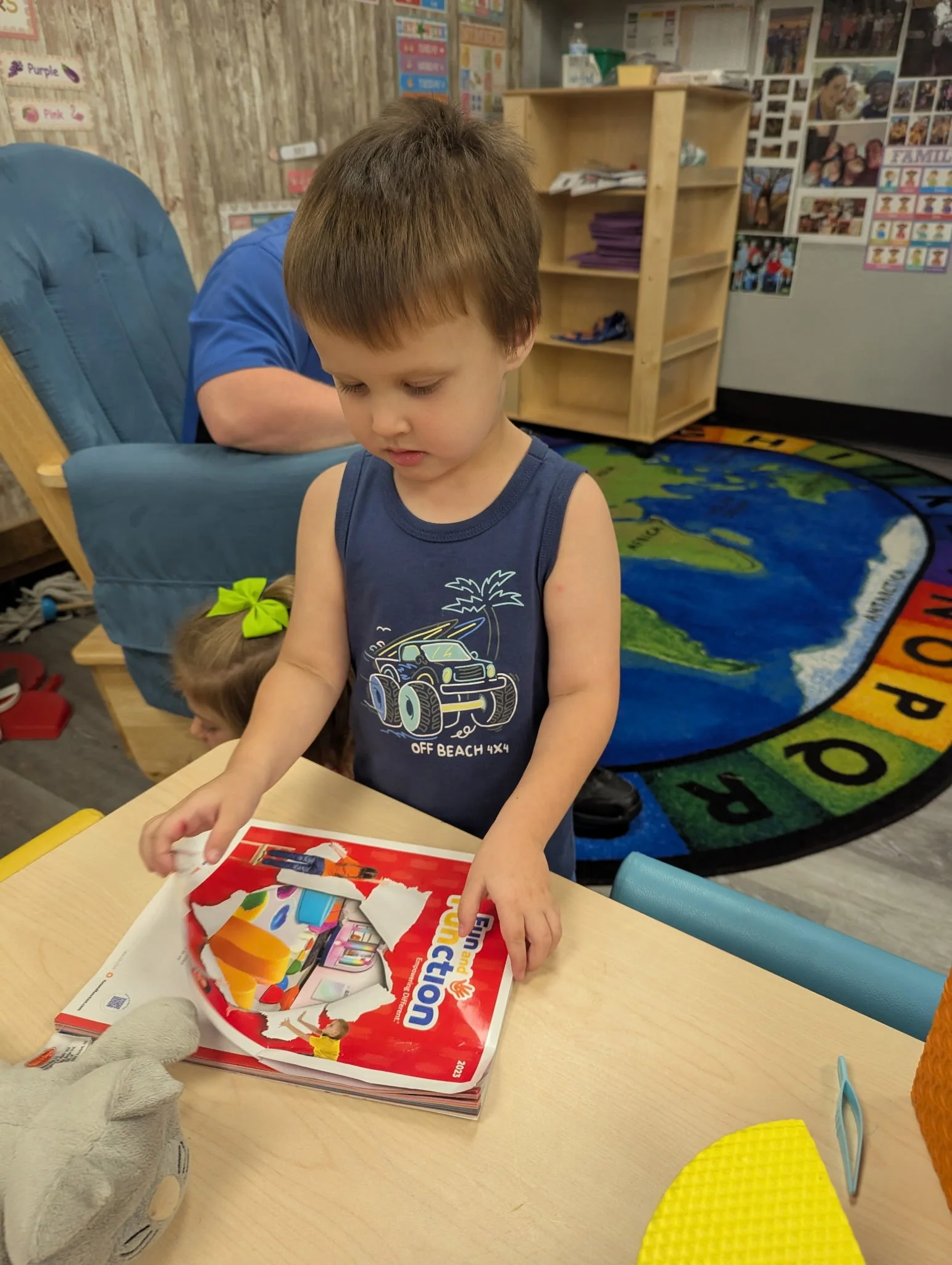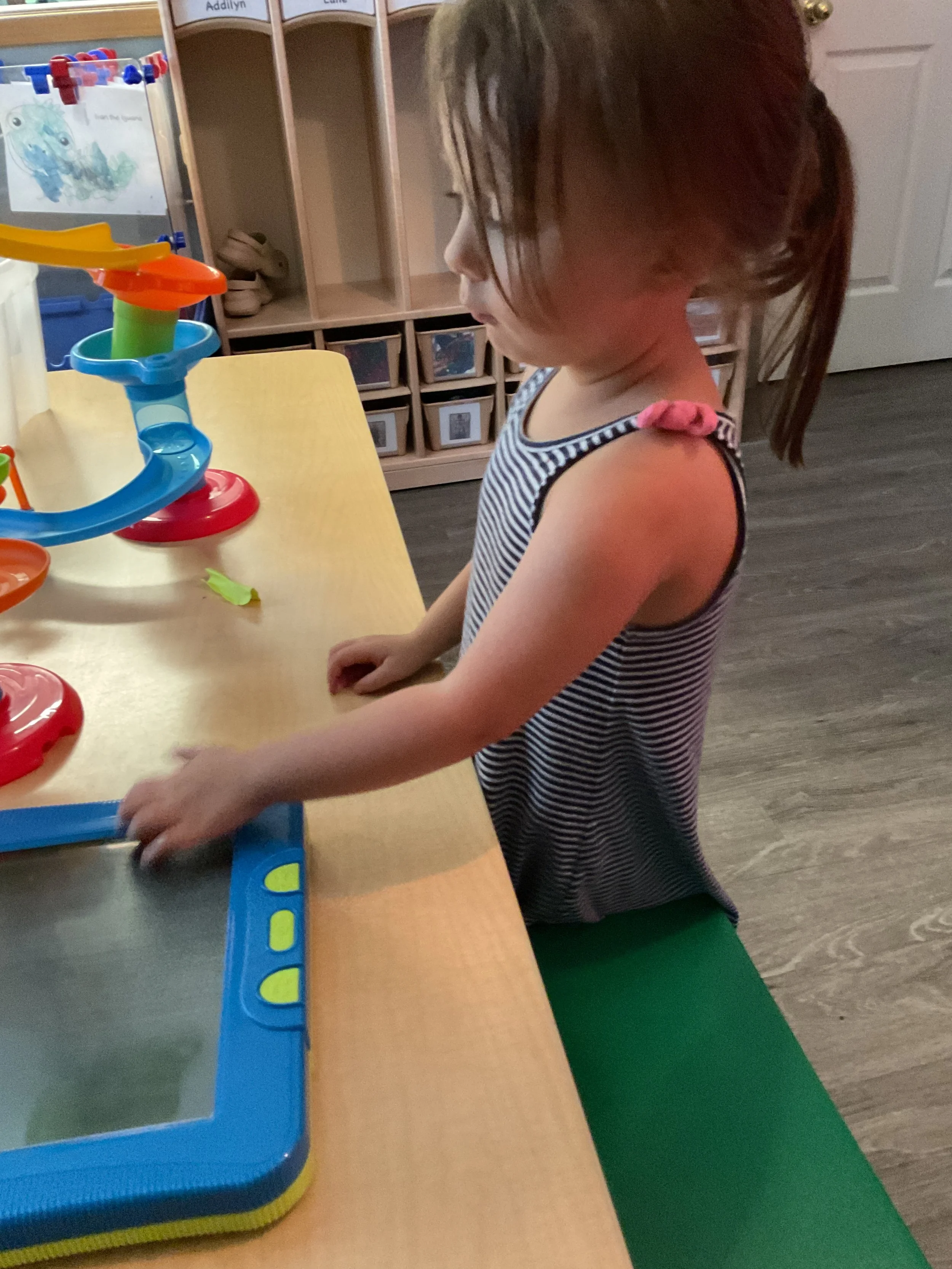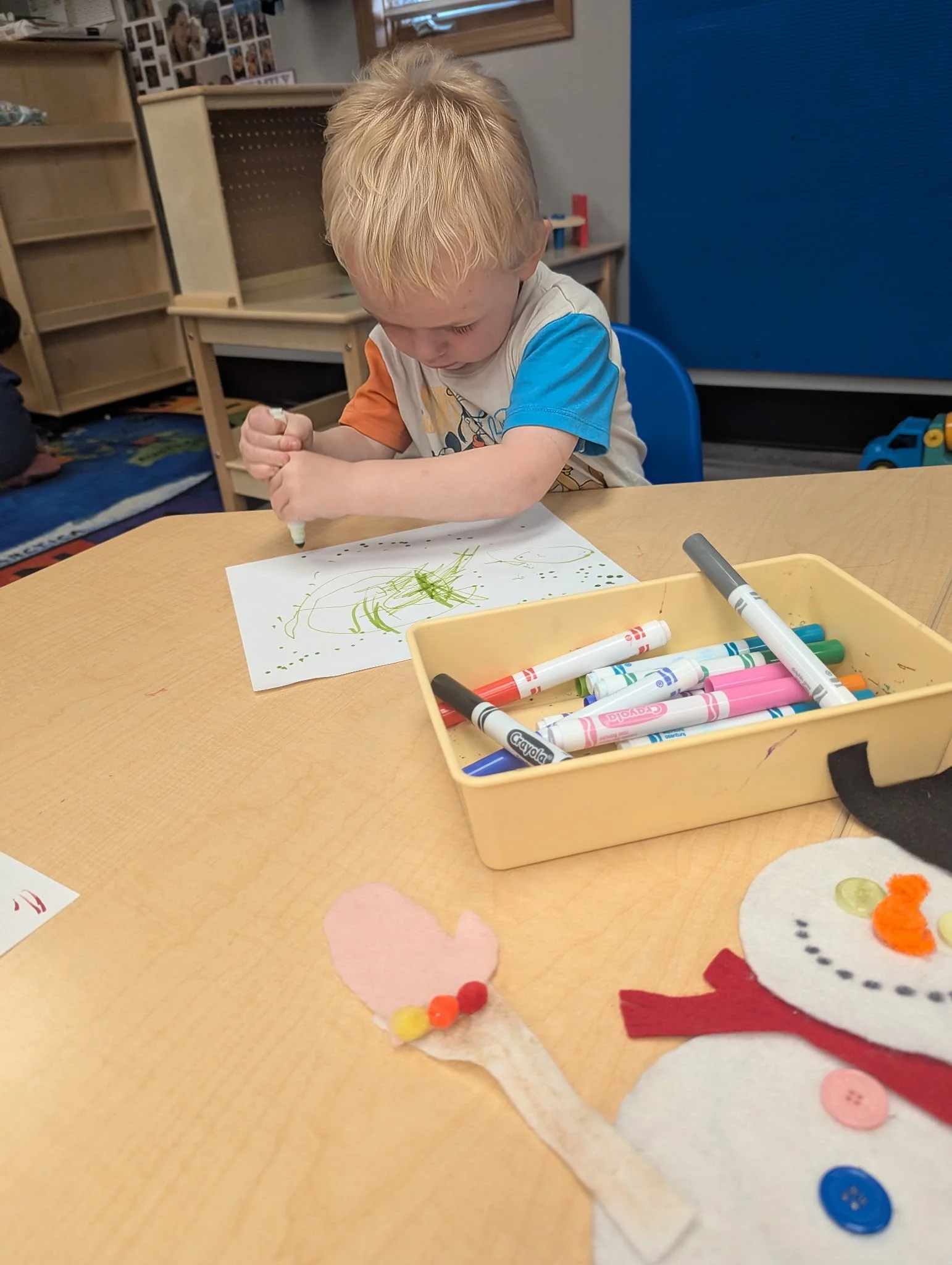 This morning, we read the book One Mitten written by Kristine O’Connell George and illustrated by Maggie Smith. During music and movement time, we sang Christmas carols and pretended to go ice skating. During our math and cognition lesson, we used Christmas lights to work on number recognition 1 through 10. For our science and sensory lesson, we drew snowmen! Finally, during our fine motor and literacy lesson, we practiced tracing and writing our names.