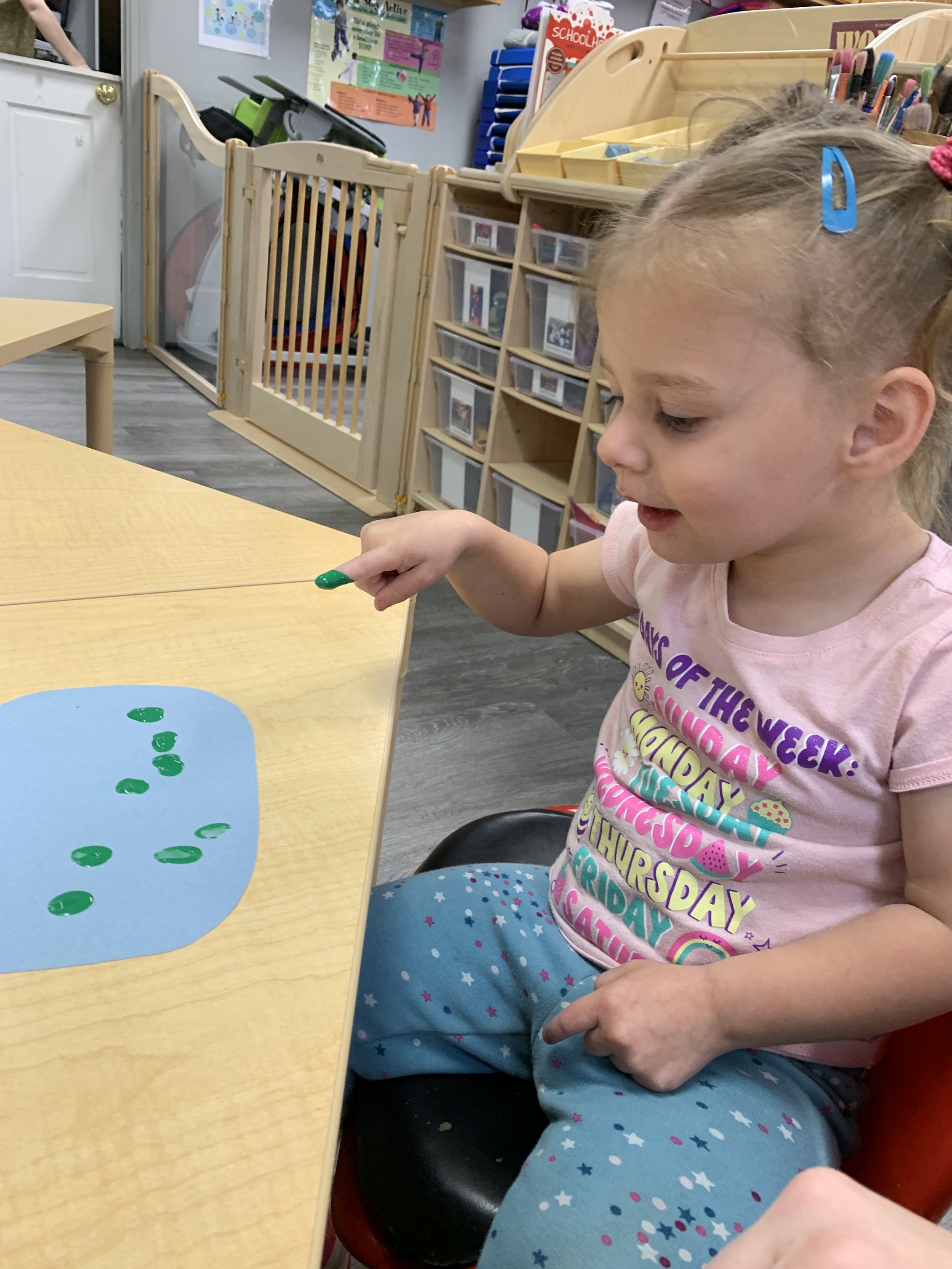 Happy Tuesday! Today we read the book In the Tall, Tall Grass by Denise Fleming. In this book we learned about all the different creatures that live in tall grass and around ponds. During our math and cognition activity we counted frogs. In our science and sensory skills we painted lily pads in our ponds. Then during our fine motor and literacy we listened to a book on tape.